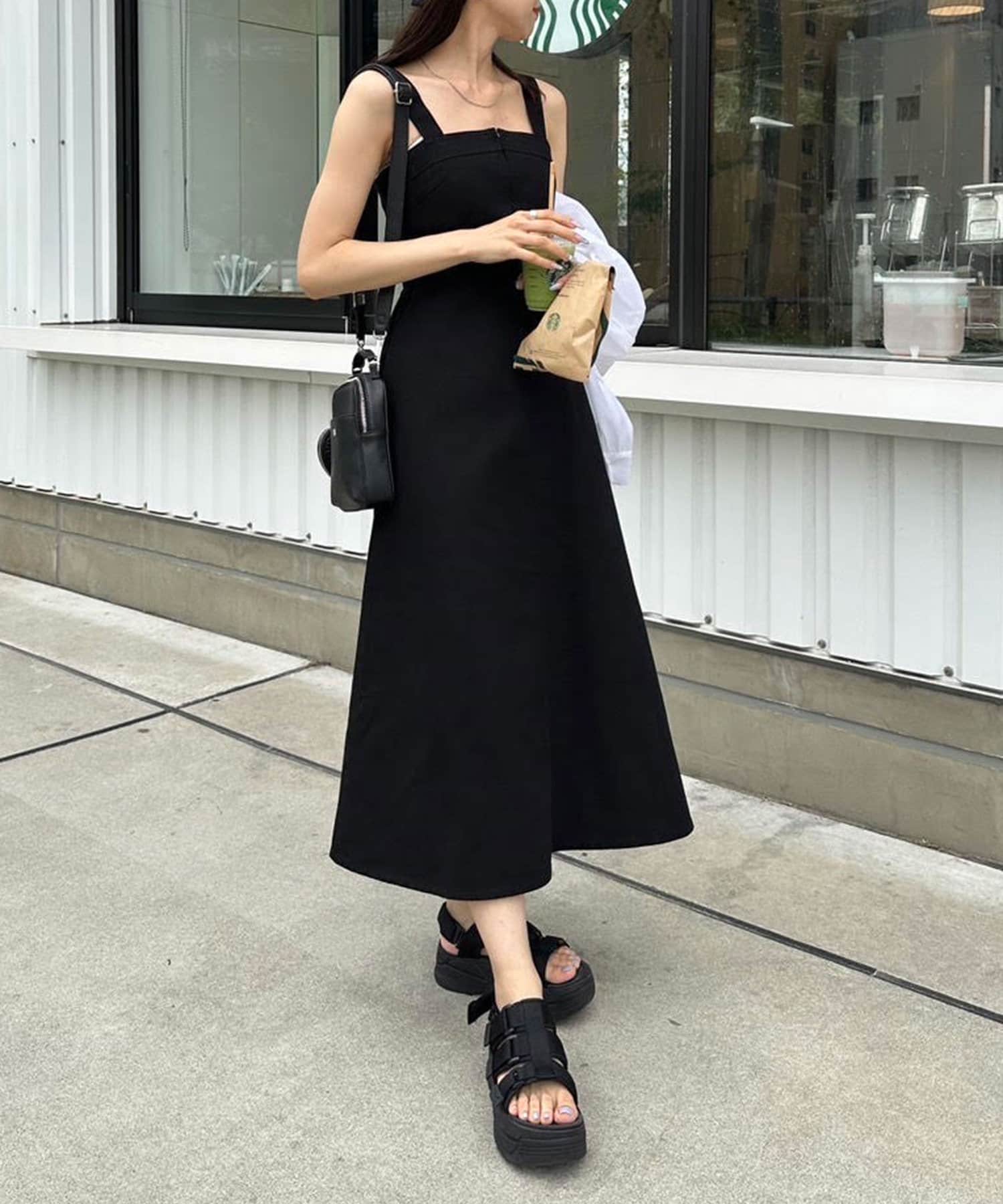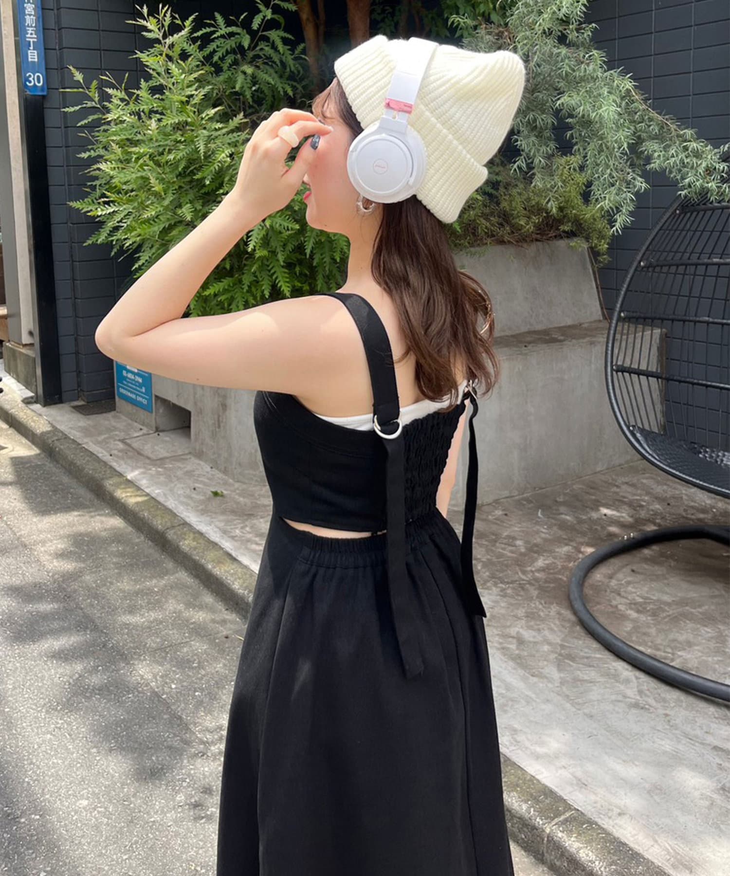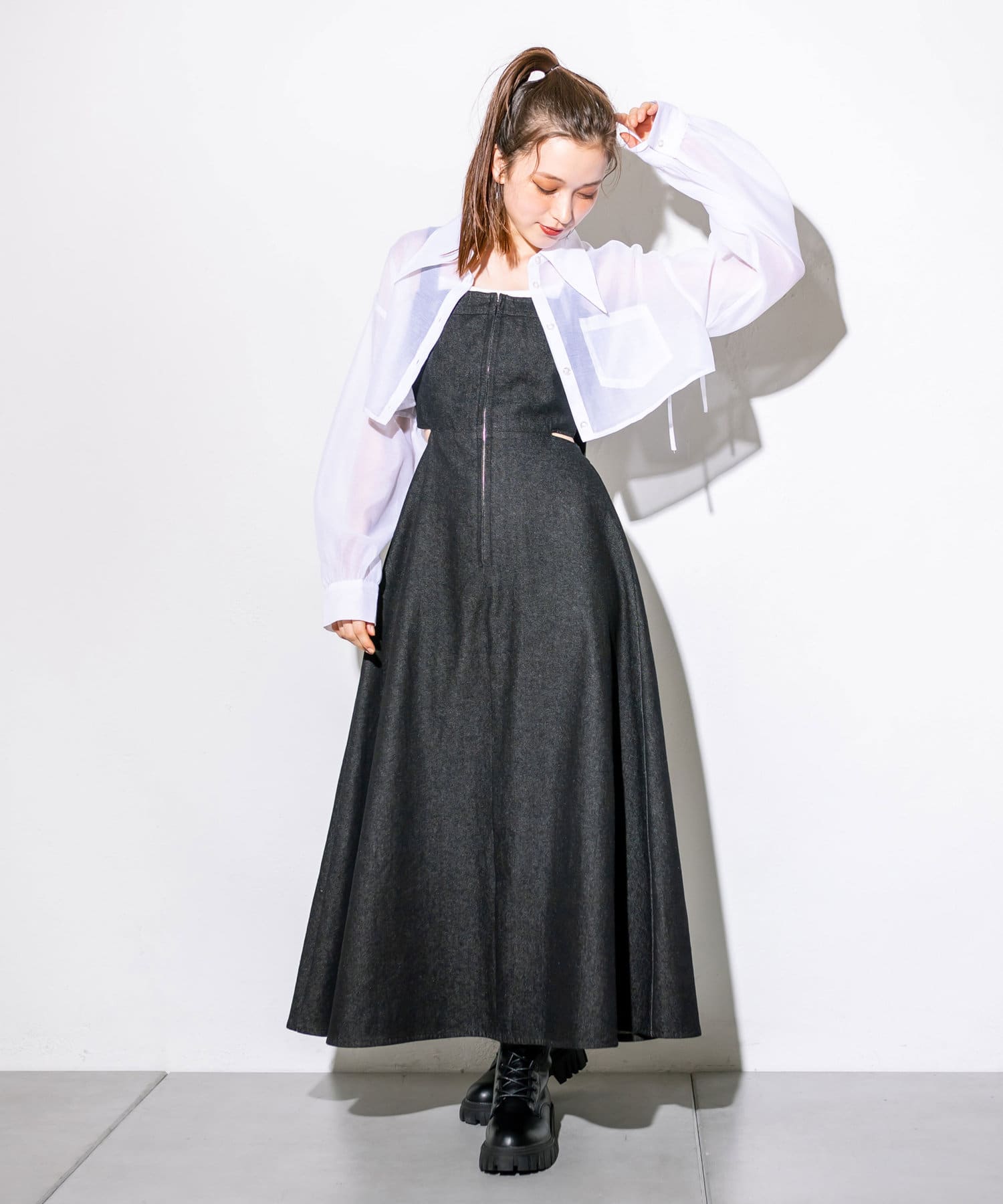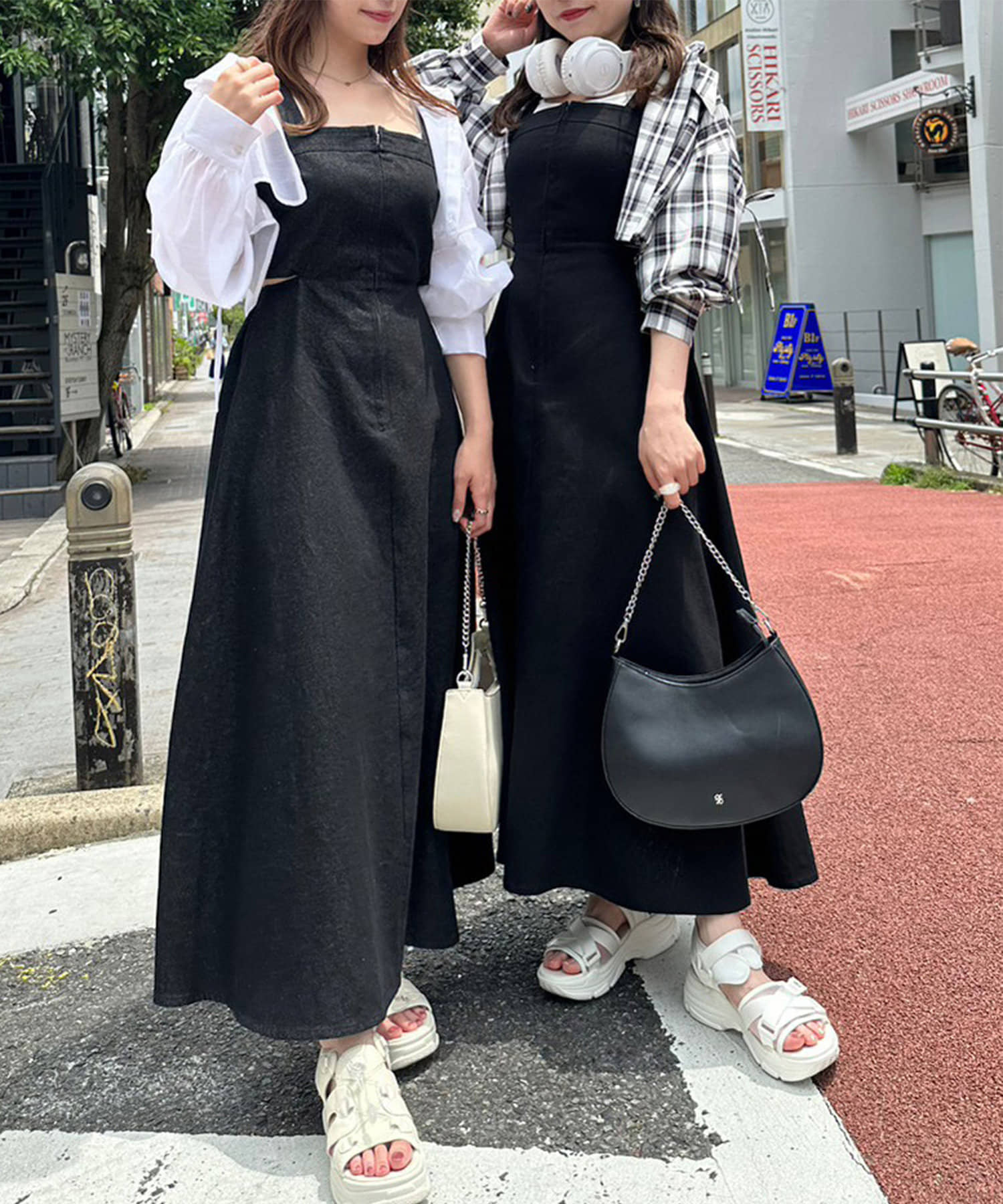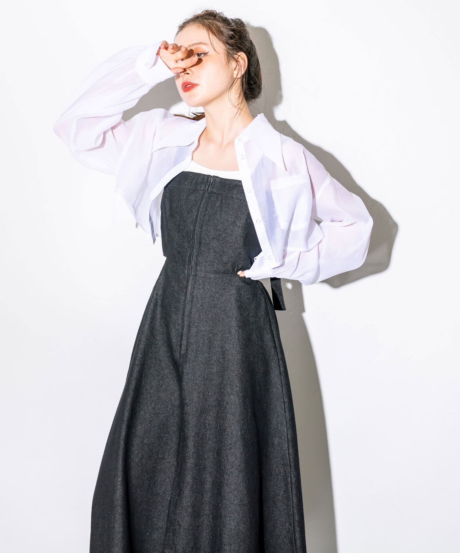 ・中にカップ付きインナーやベアトップを着れば1枚で主役に。