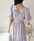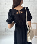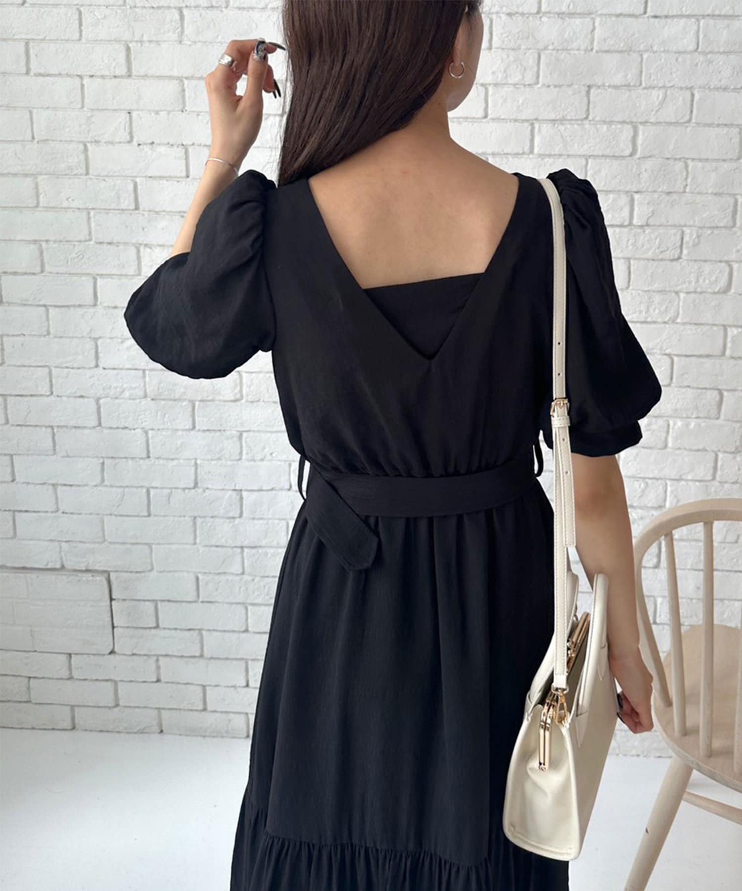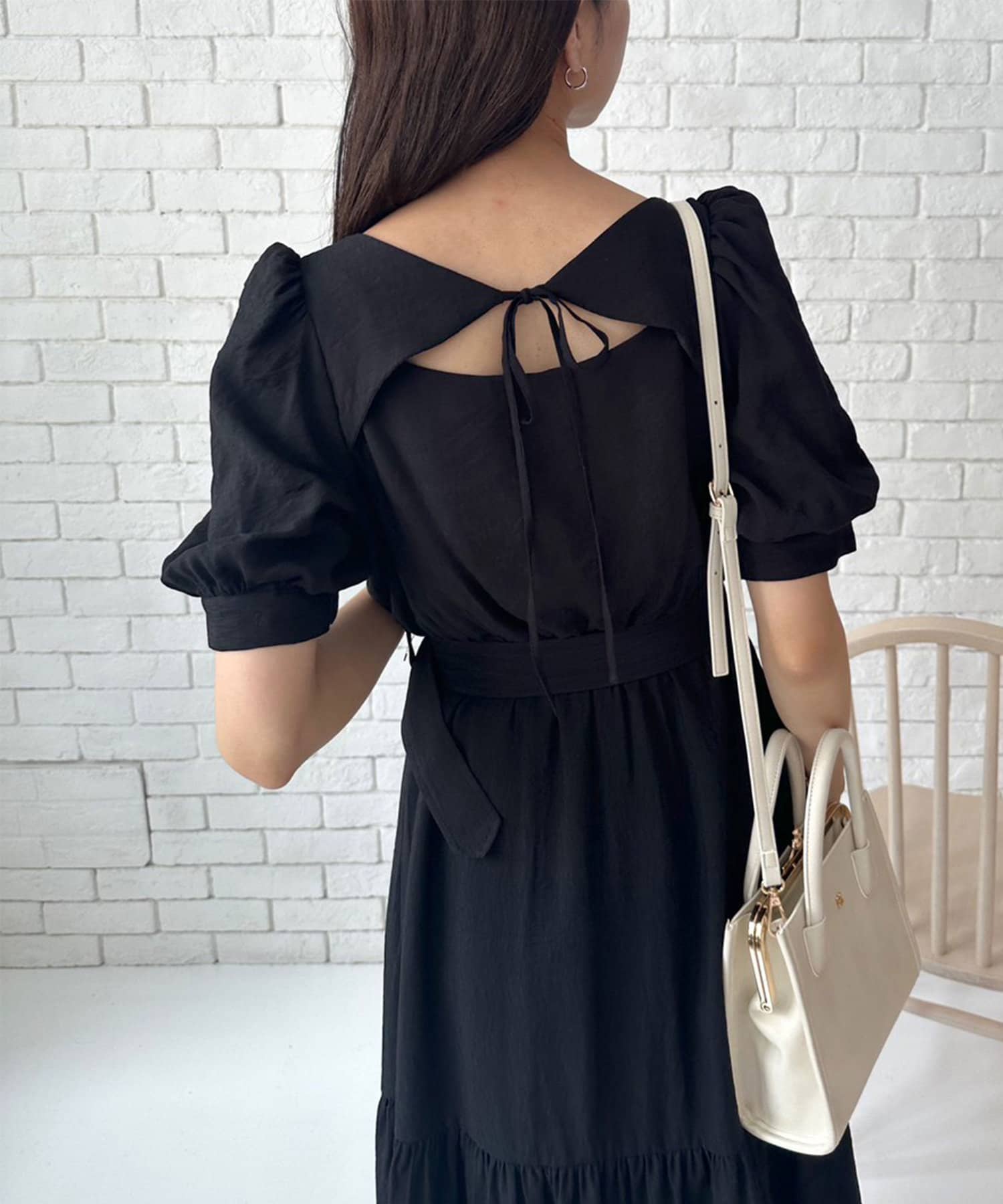 ・リボンを前に着るとガーリーに。Vネックを前にすると大人っぽい印象に。