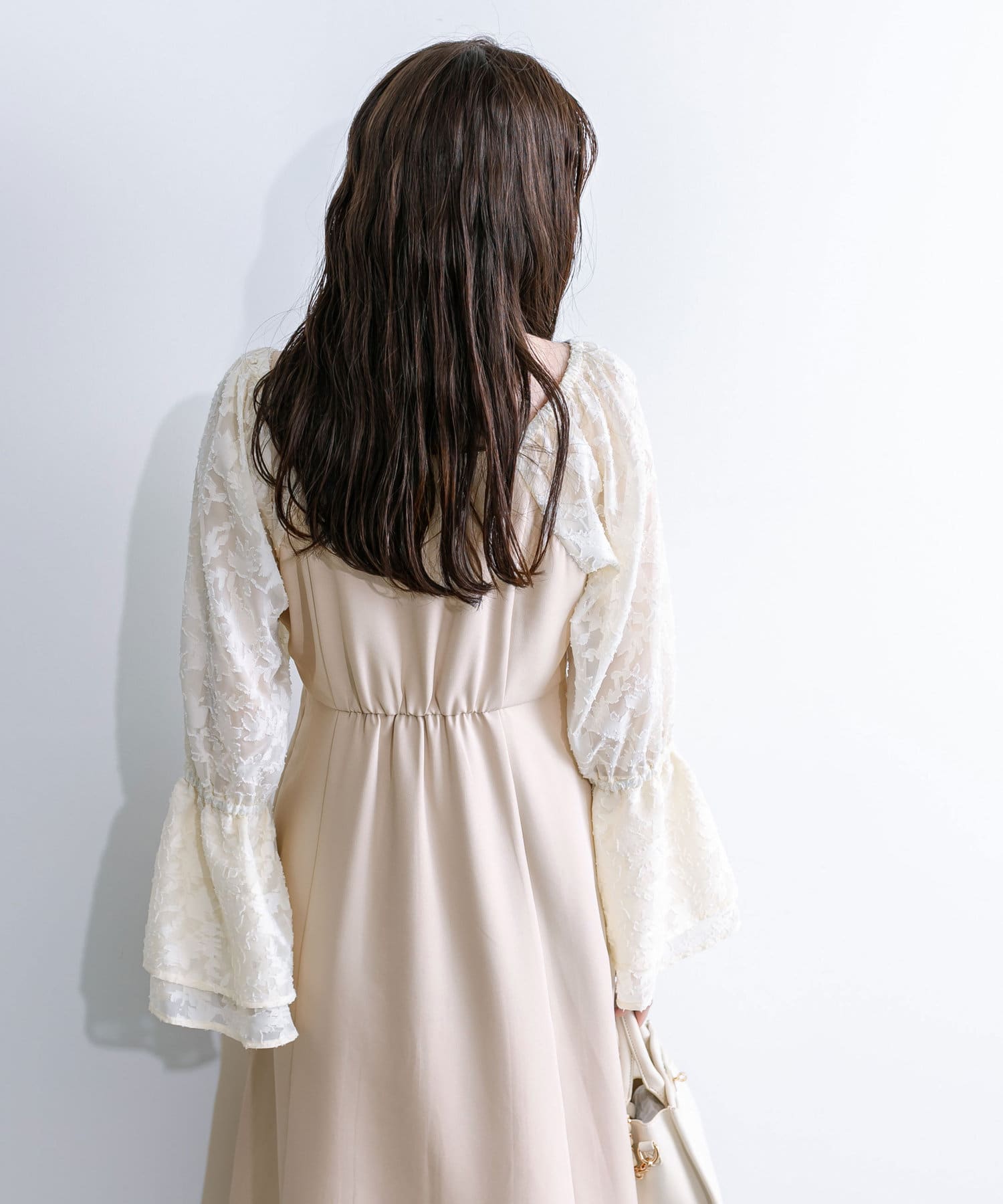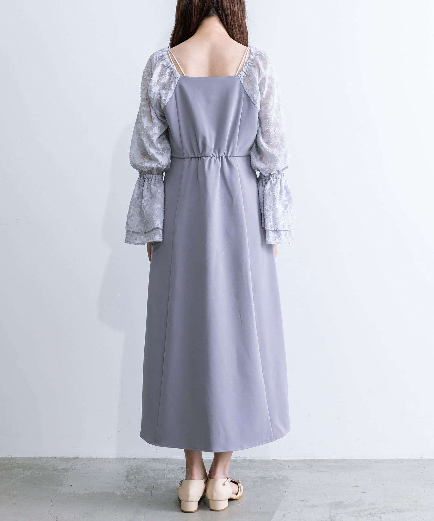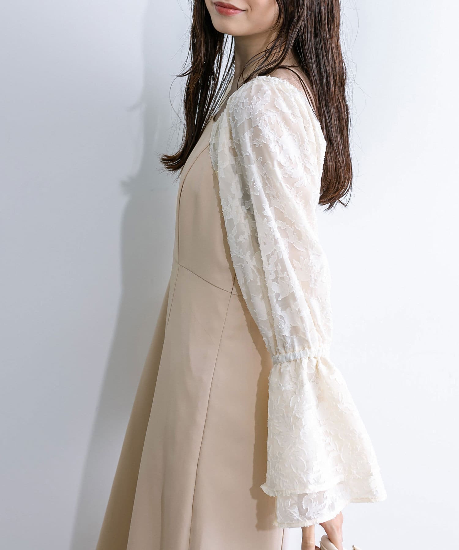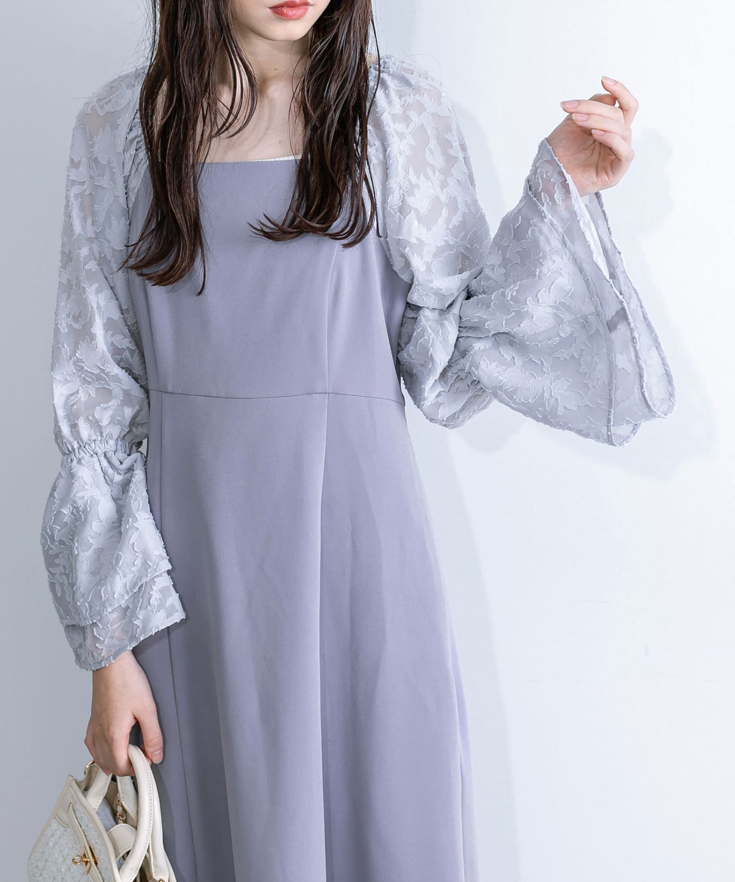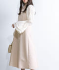 ・着やすいボリューム感のフレアスリーブとシンプルなワンピースをドッキングしたような、レイヤード感のあるデザインです。