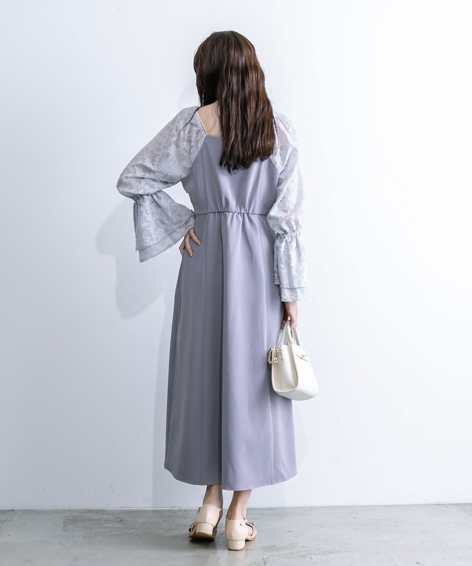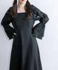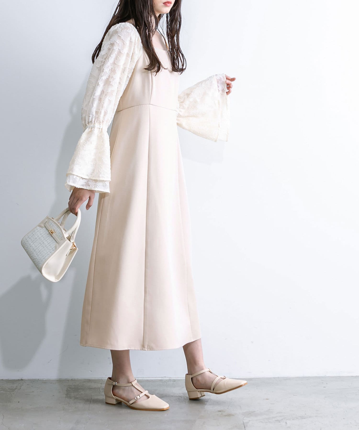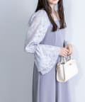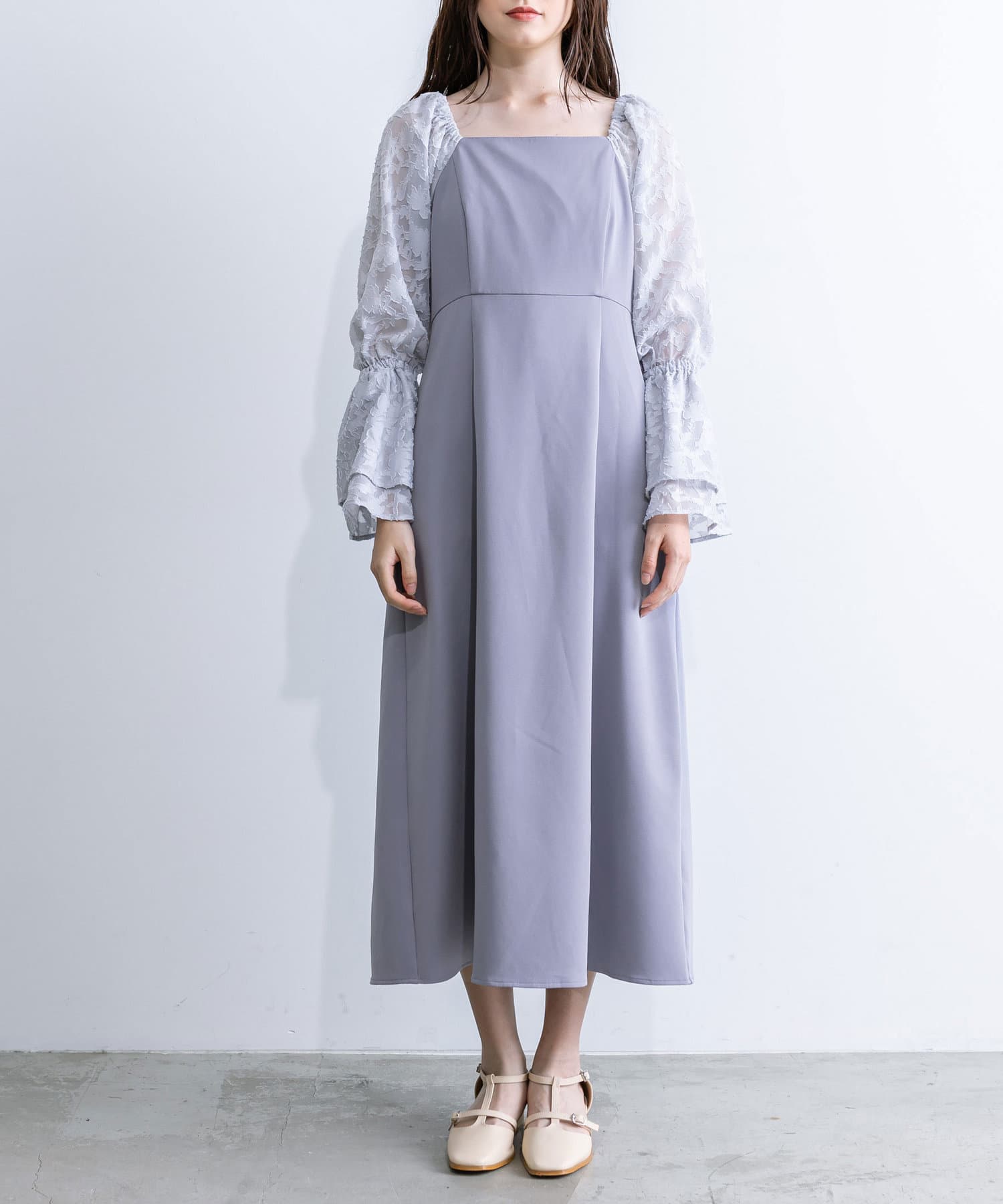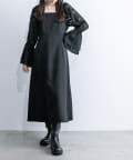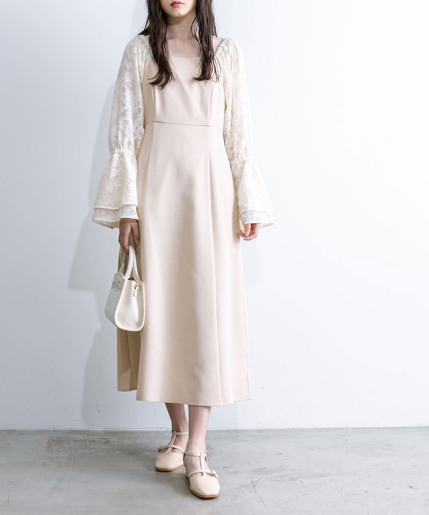 ・着やすいボリューム感のフレアスリーブとシンプルなワンピースをドッキングしたような、レイヤード感のあるデザインです。