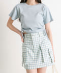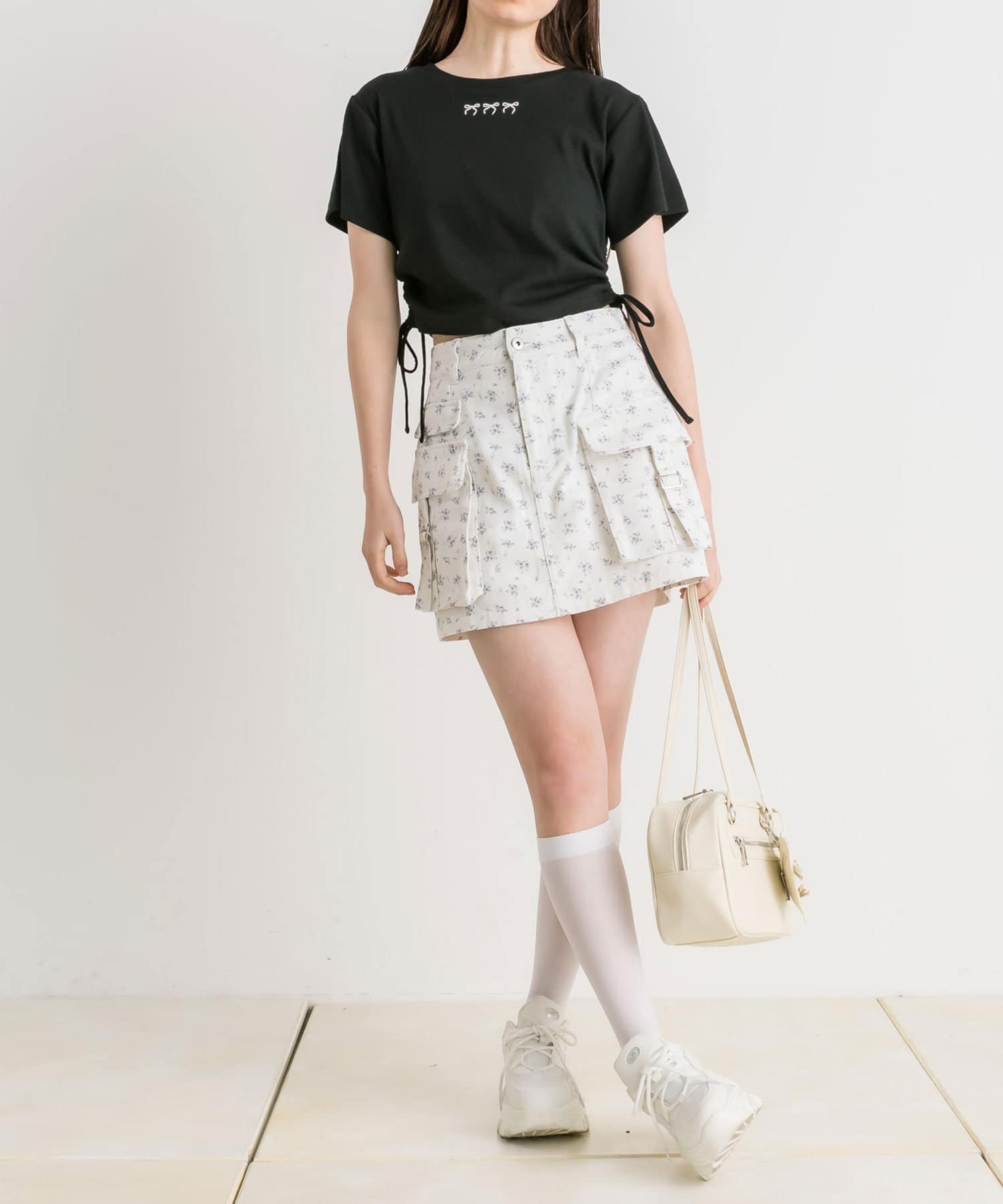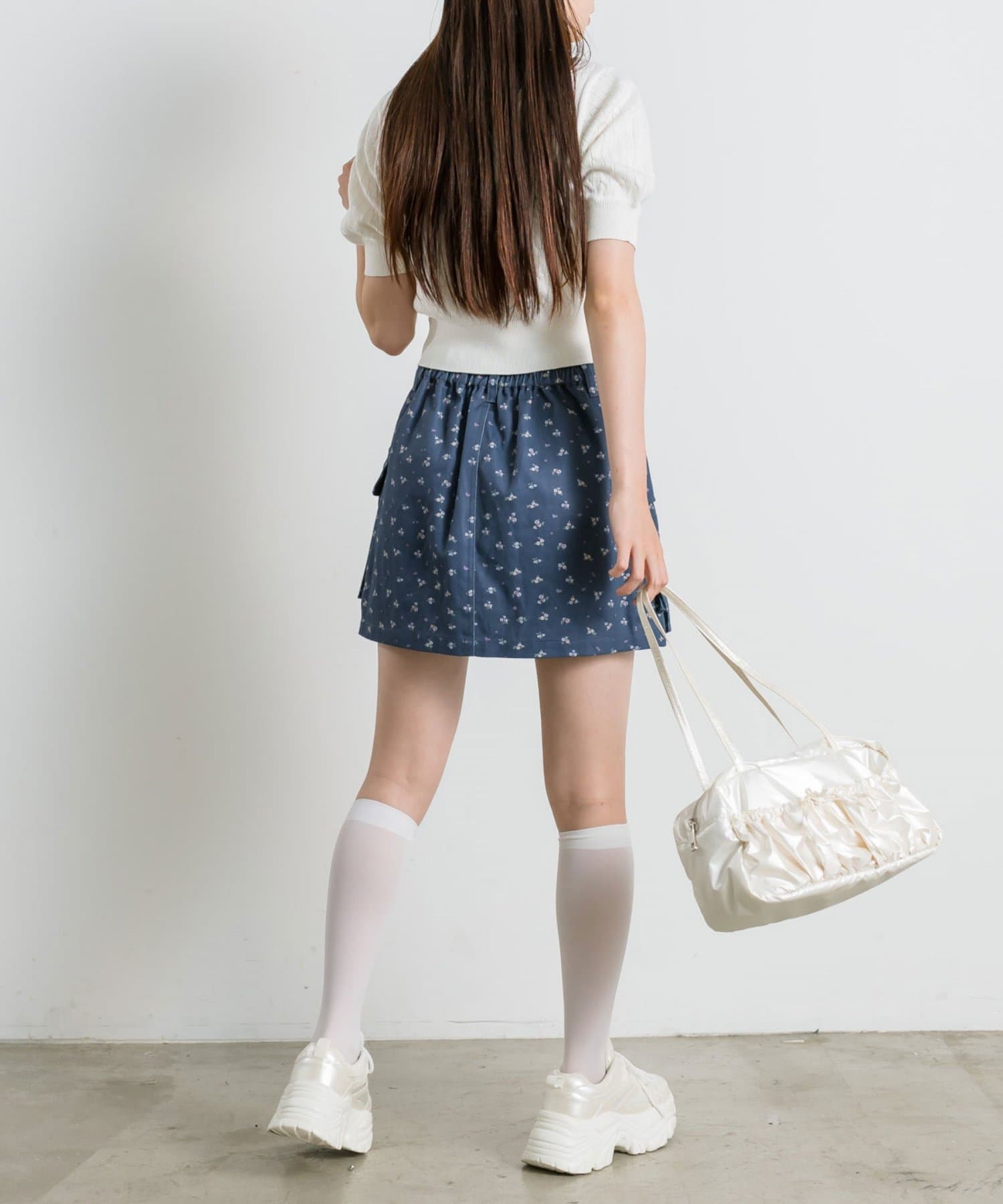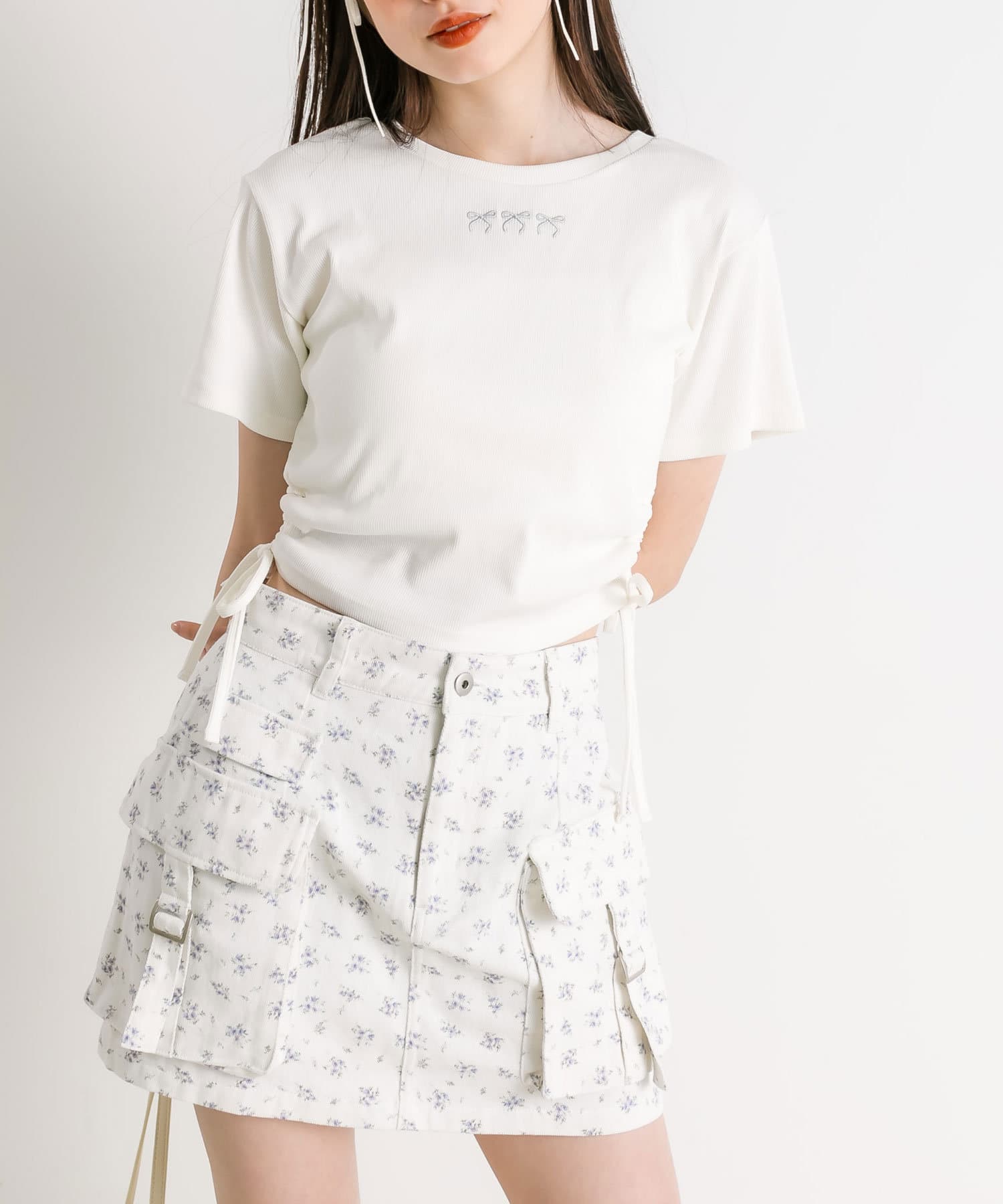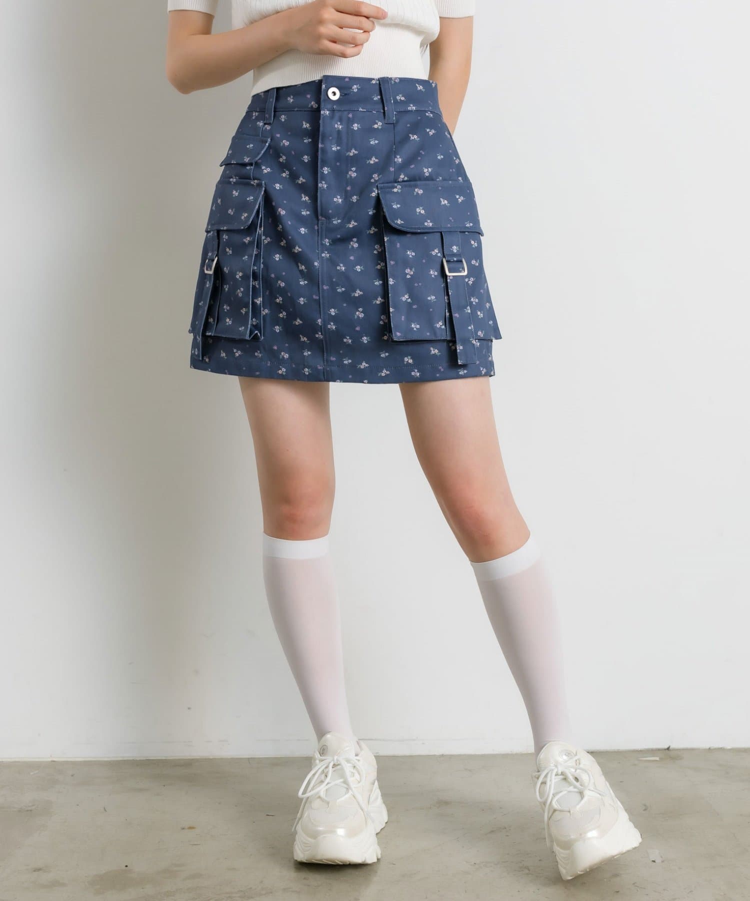 ・カジュアルな印象のカーゴスカートですが、花柄やチェックはカジュアルすぎずガーリーに着ていただけます。