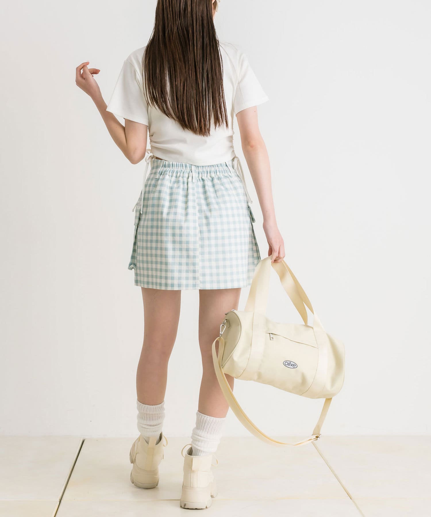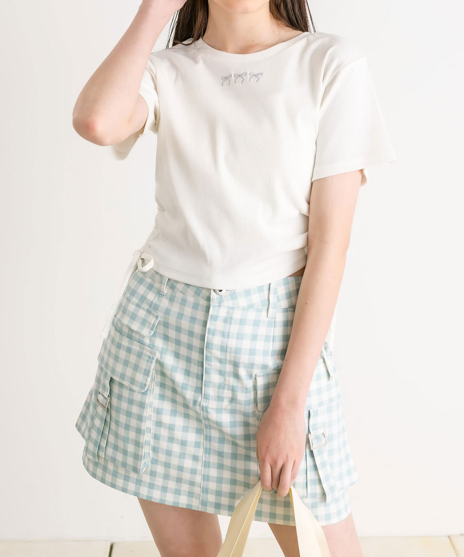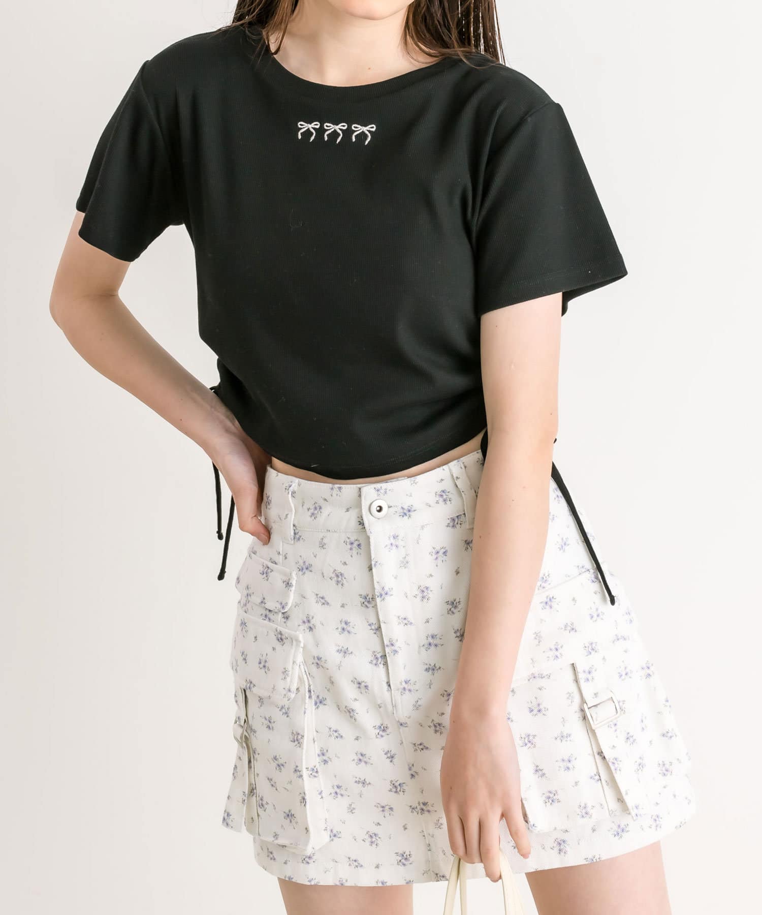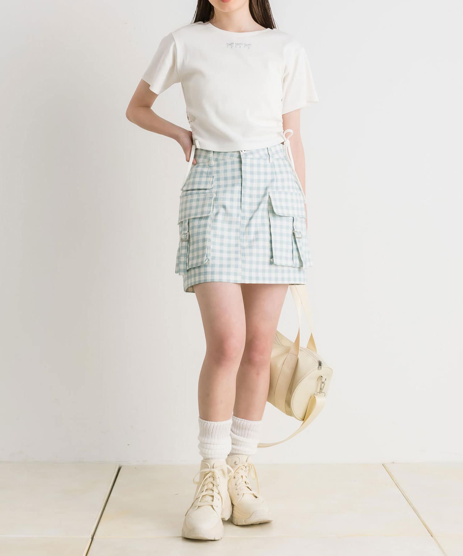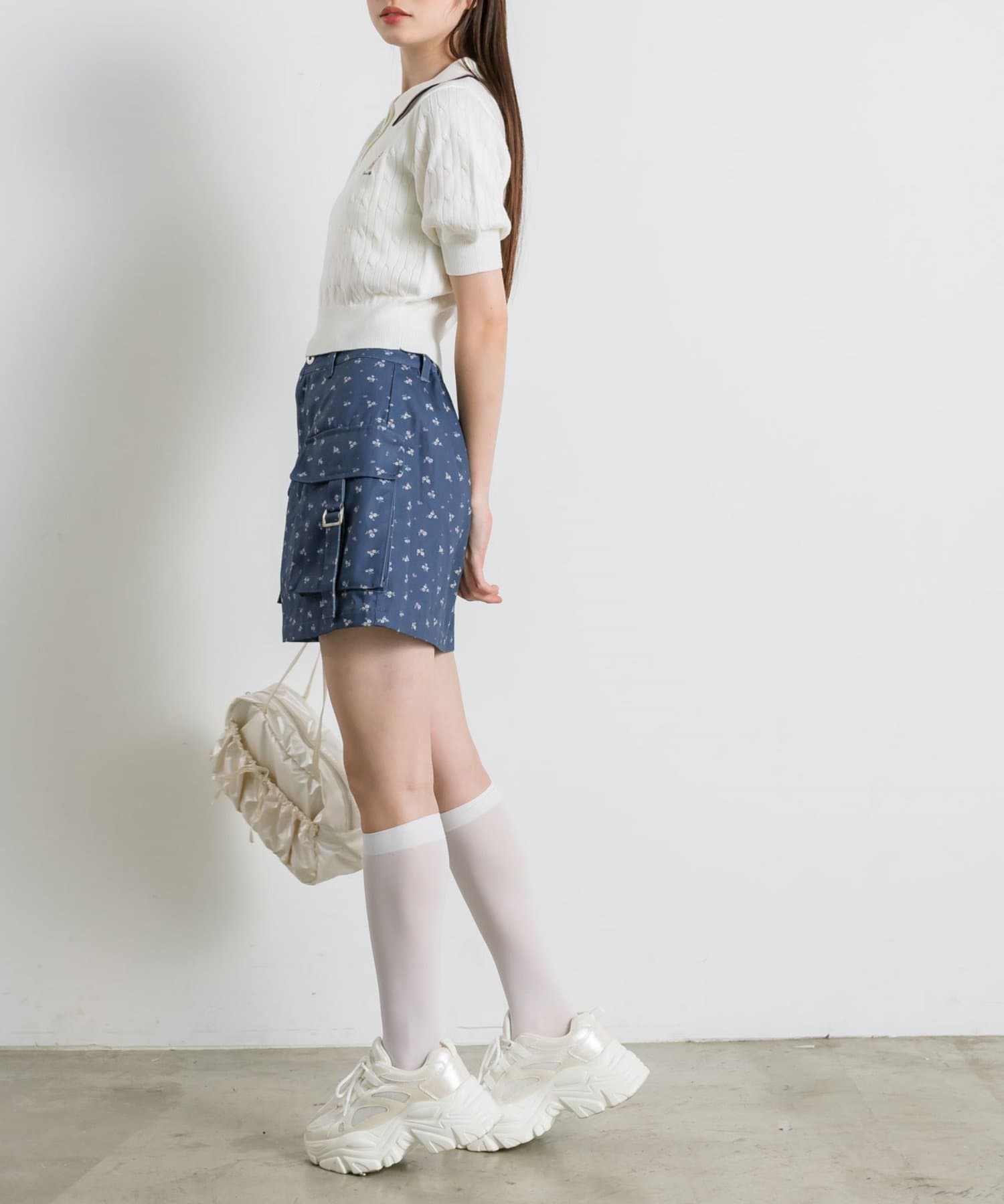 ・カジュアルな印象のカーゴスカートですが、花柄やチェックはカジュアルすぎずガーリーに着ていただけます。