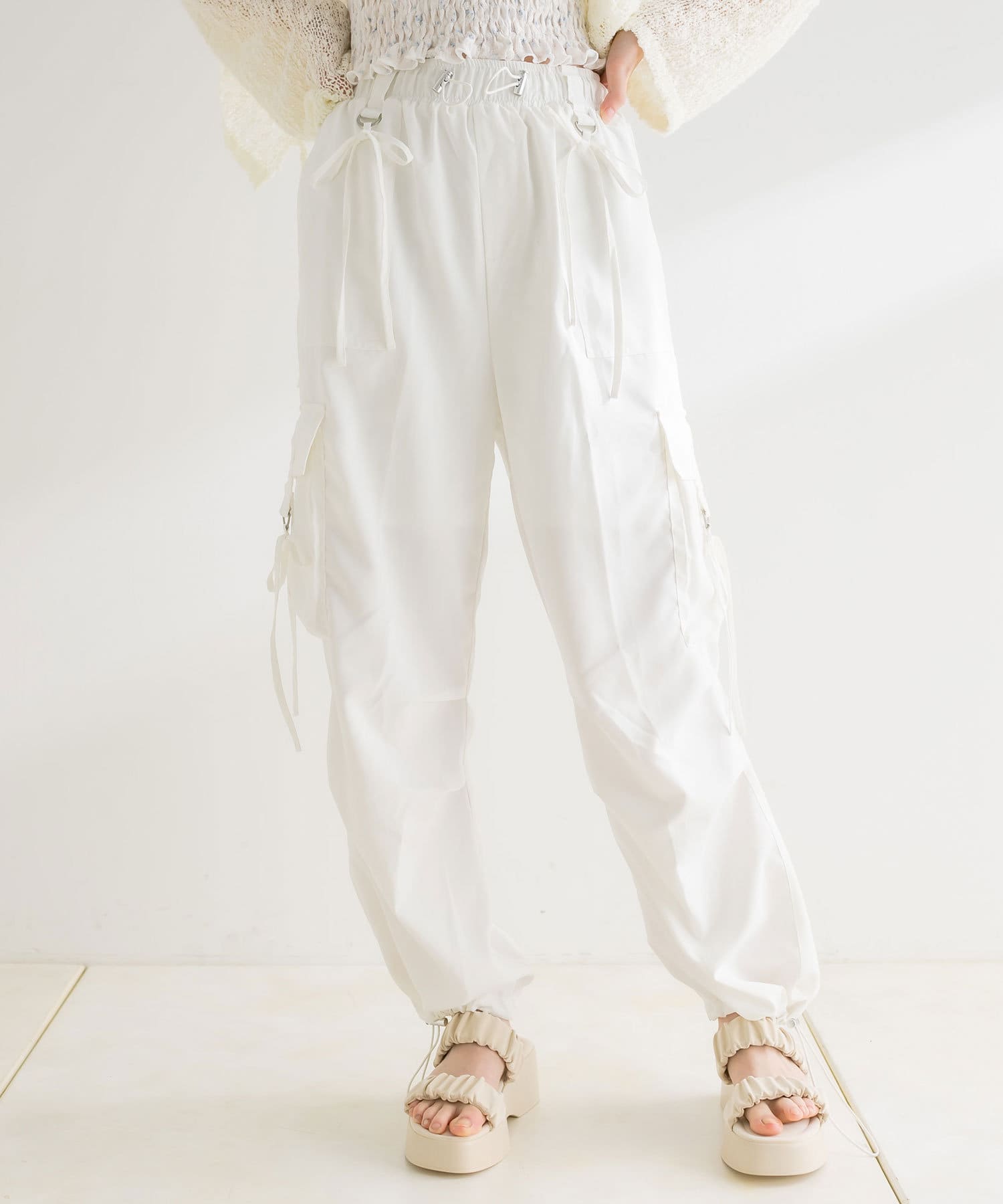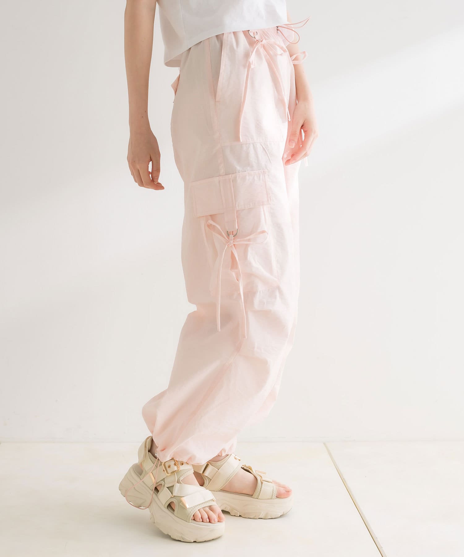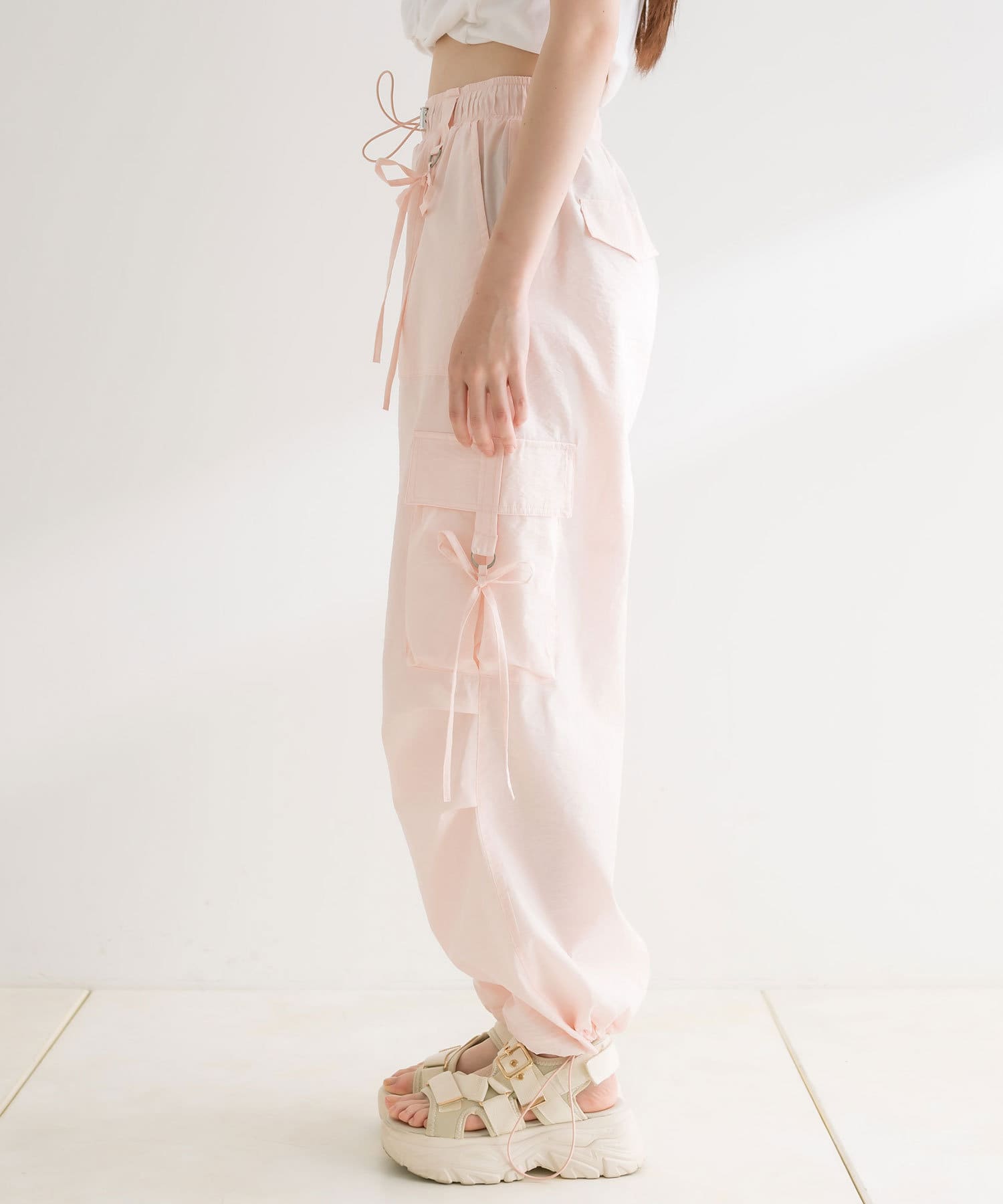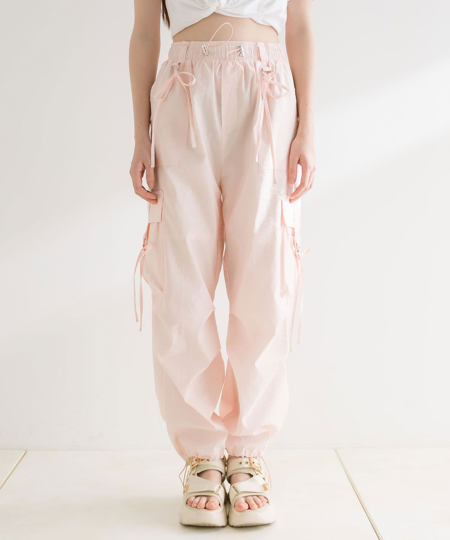 ・リボンチャームがポイントの女みデザインなカーゴパンツ。
