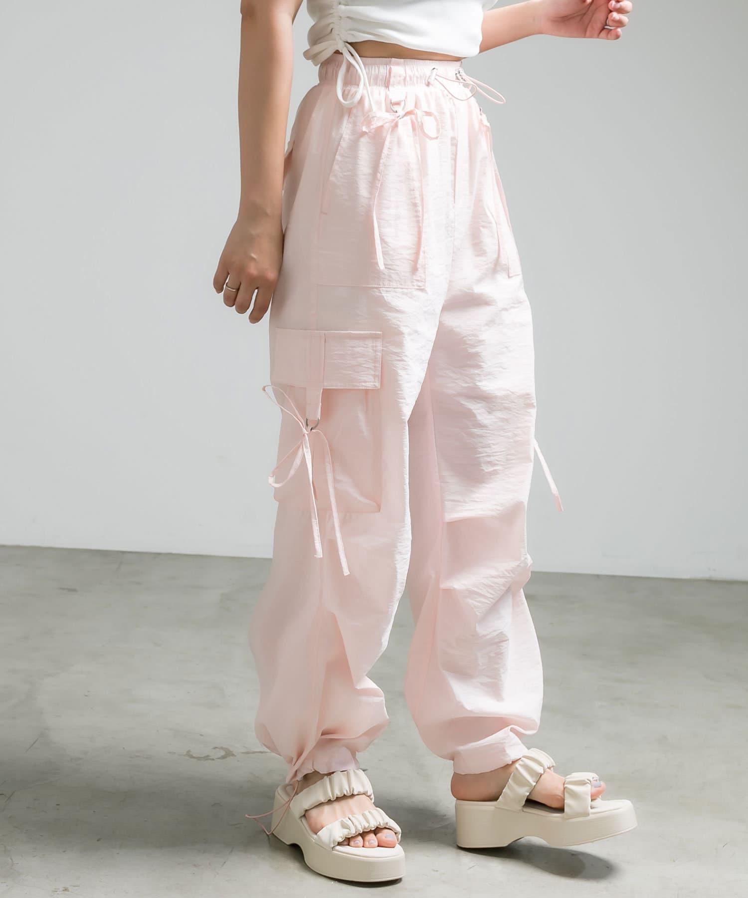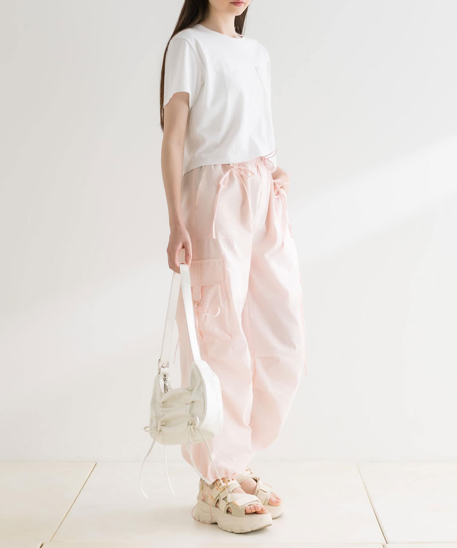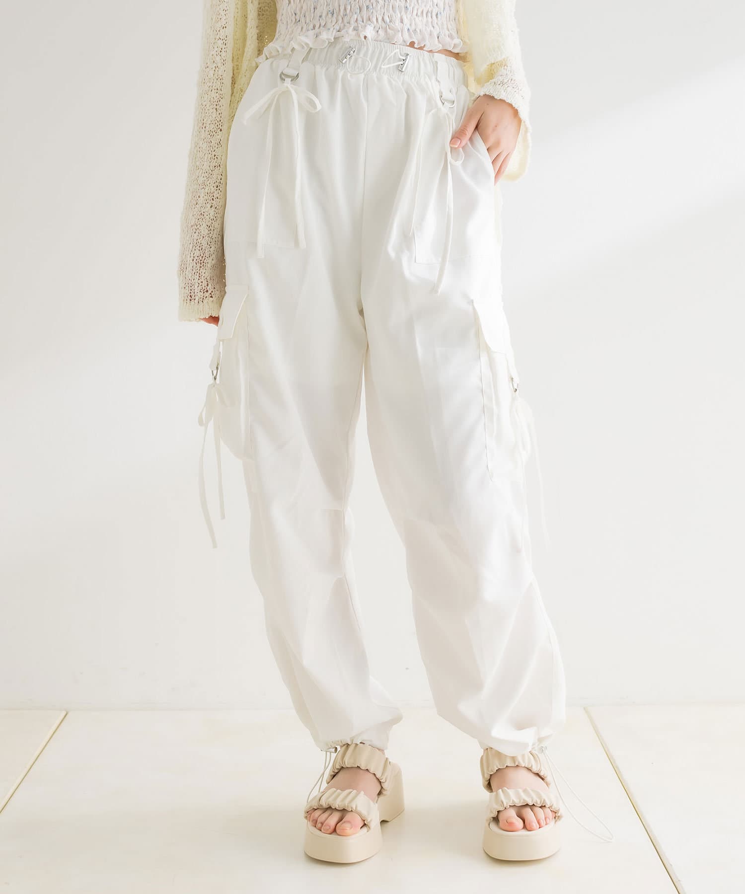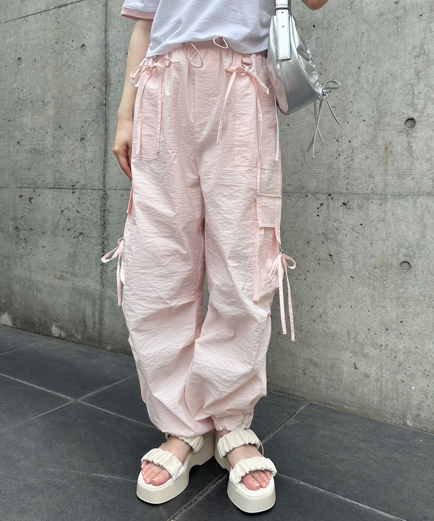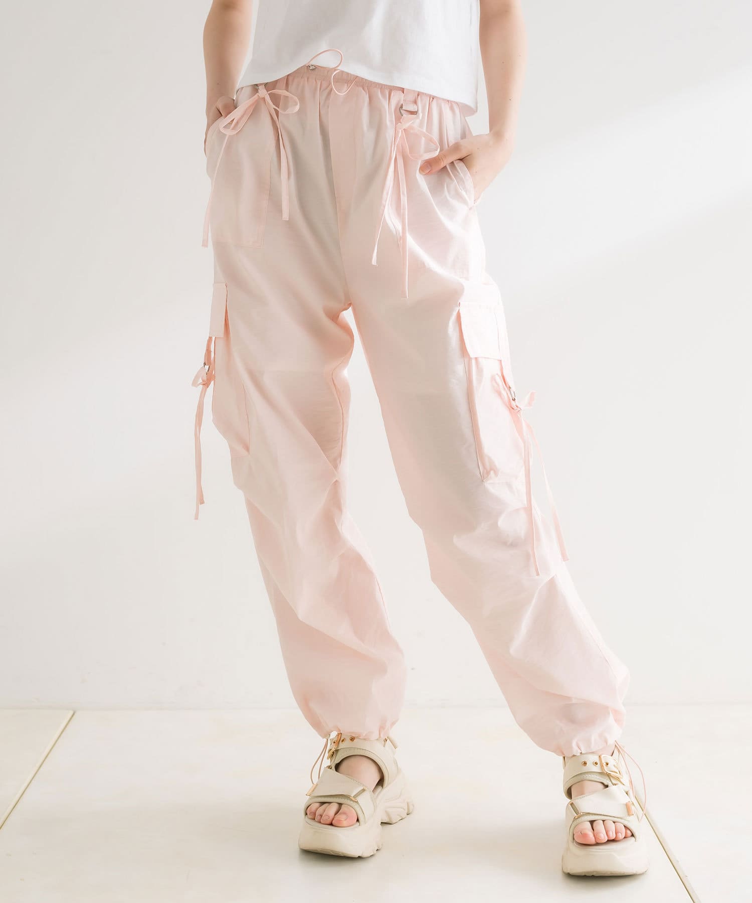 ・リボンチャームがポイントの女みデザインなカーゴパンツ。
