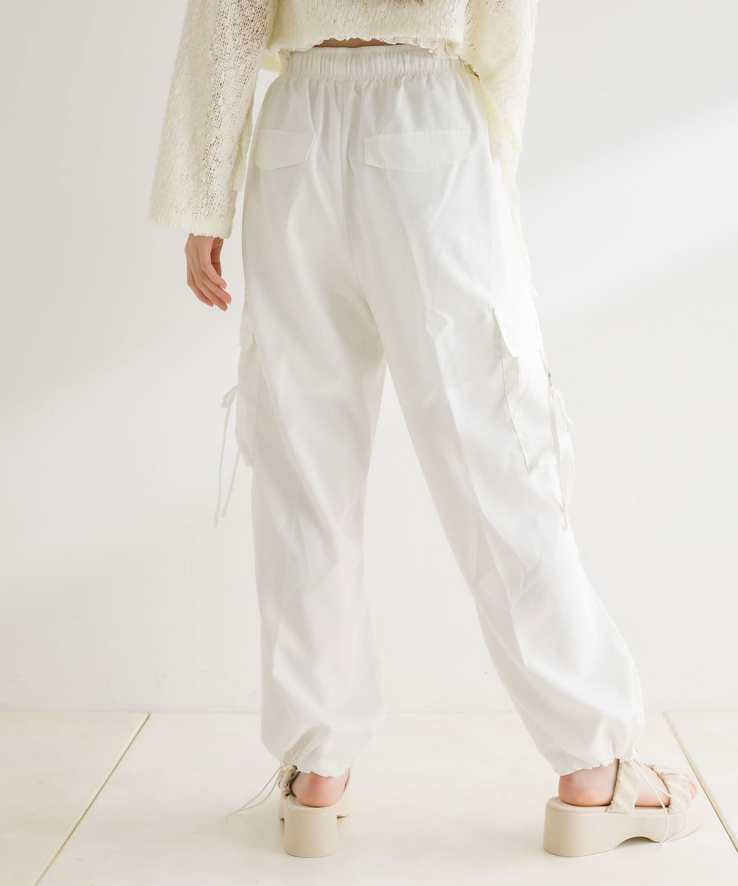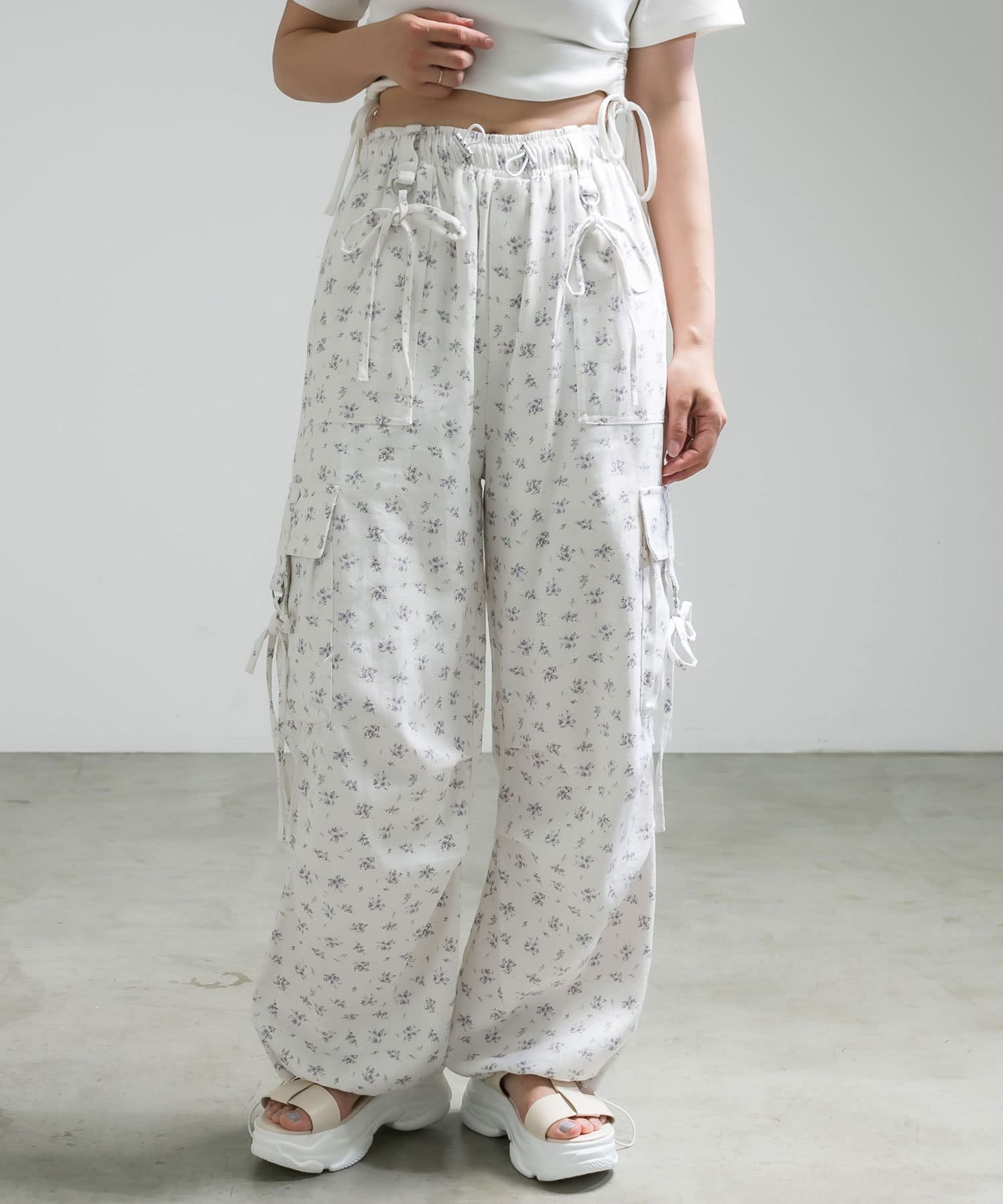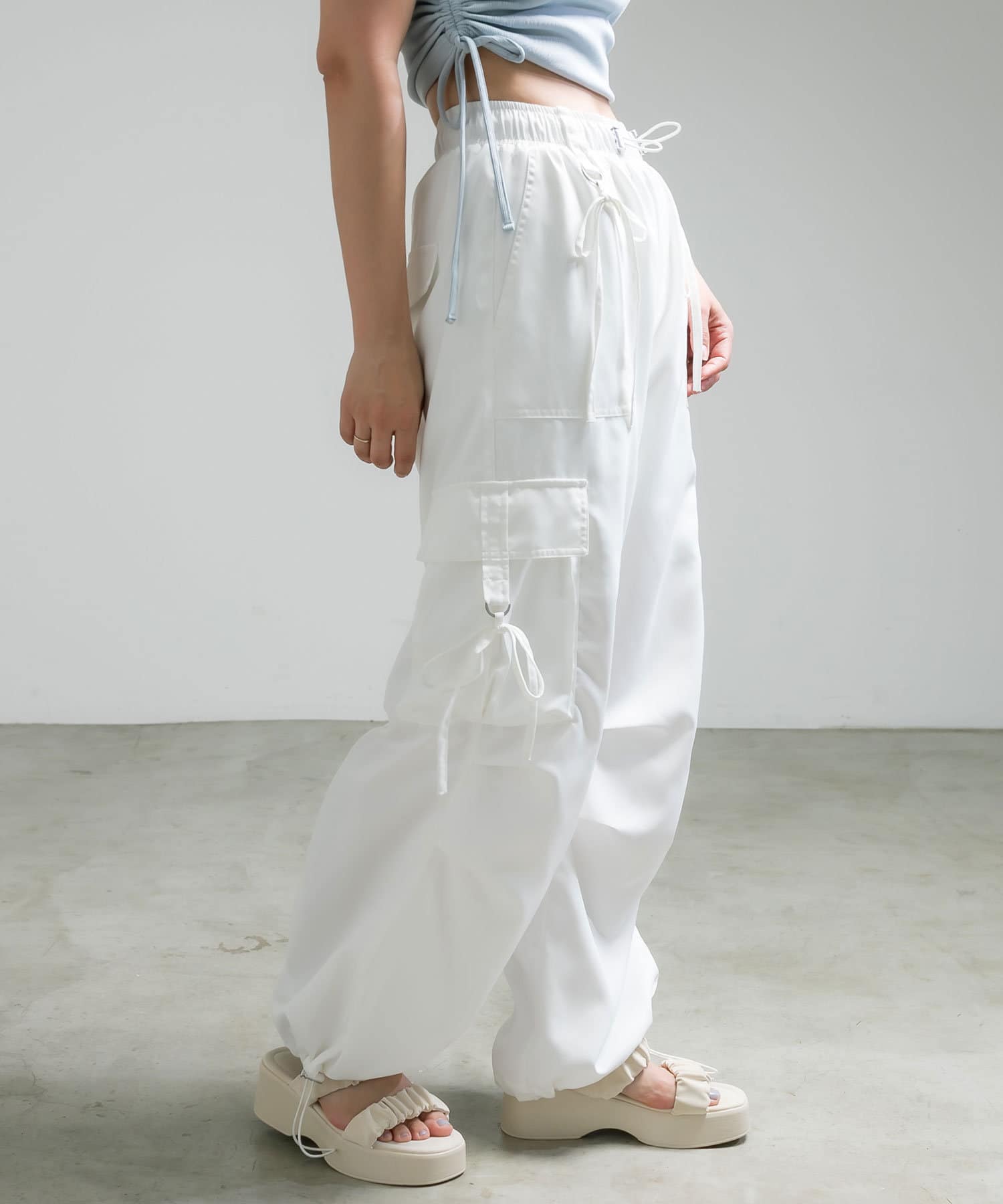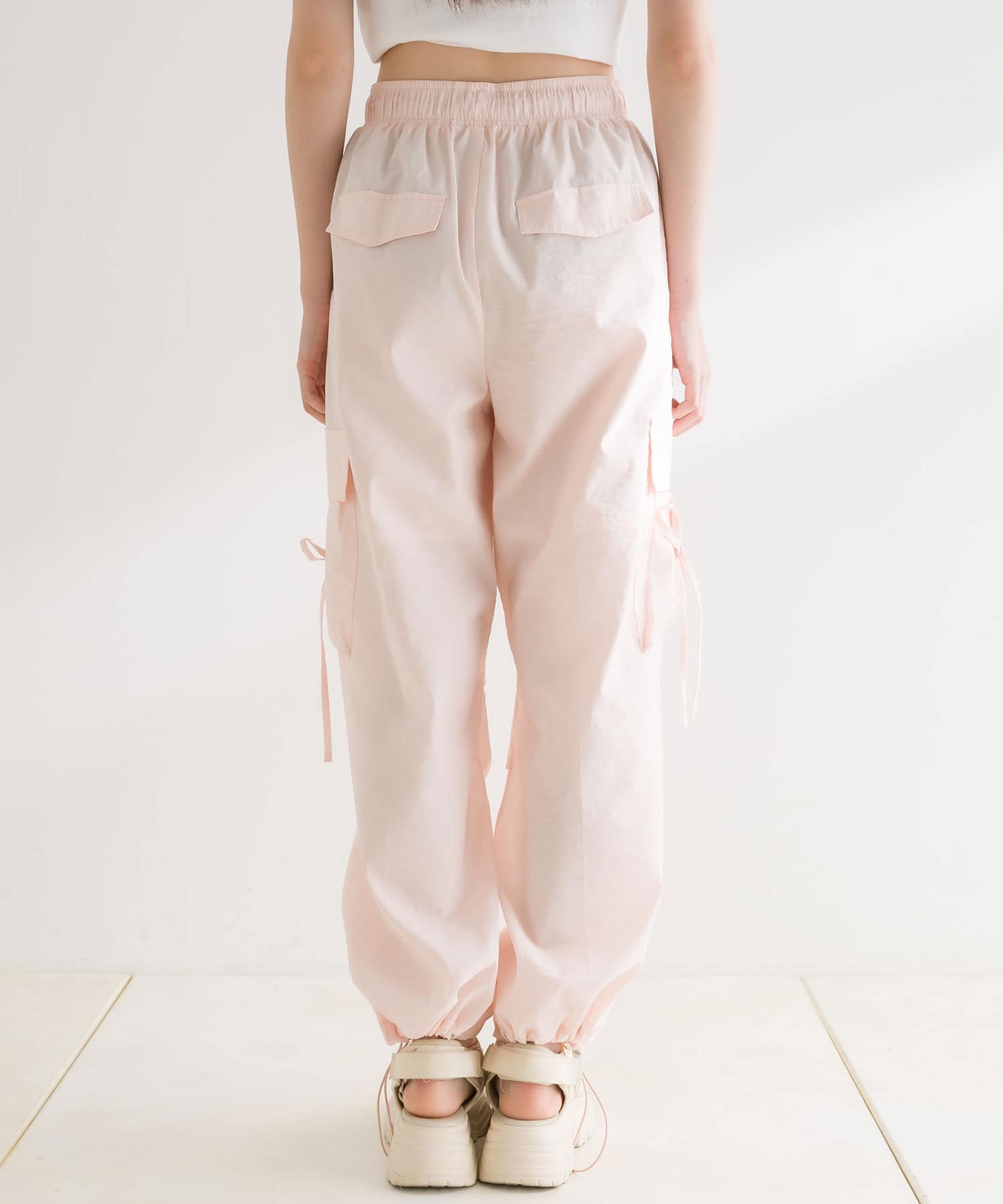 ・リボンチャームがポイントの女みデザインなカーゴパンツ。