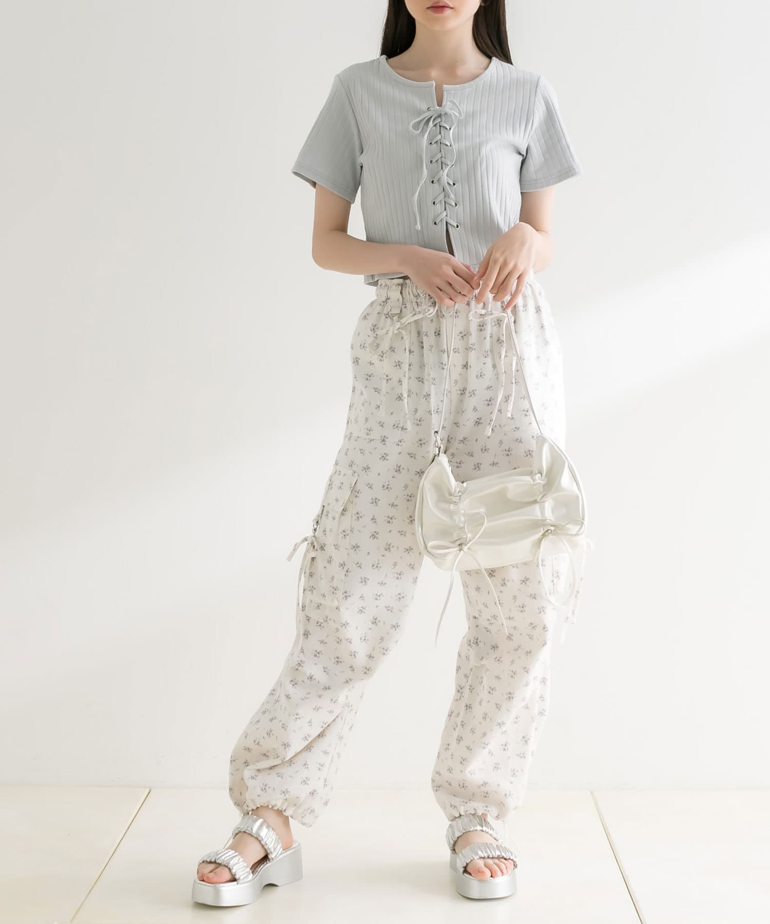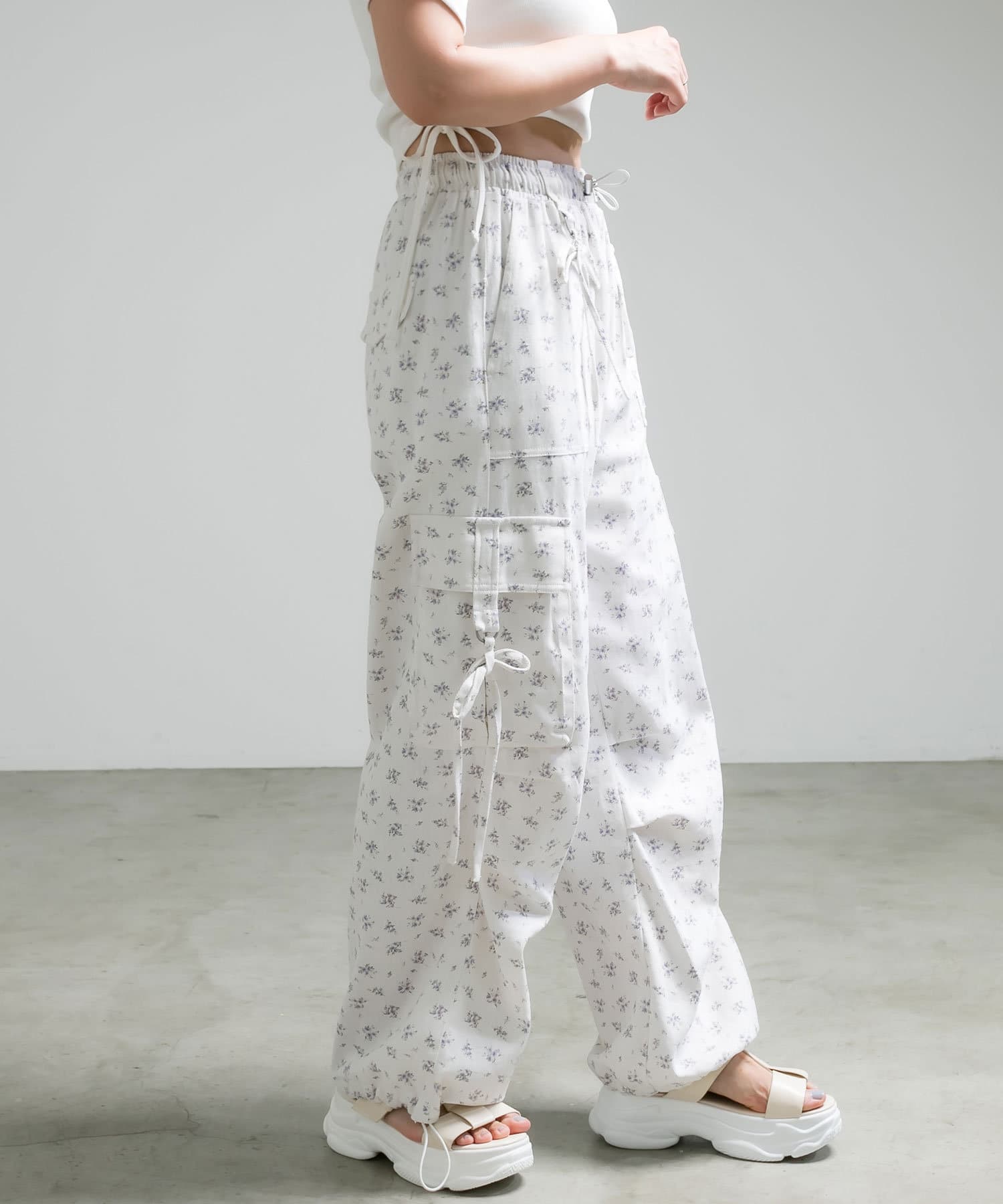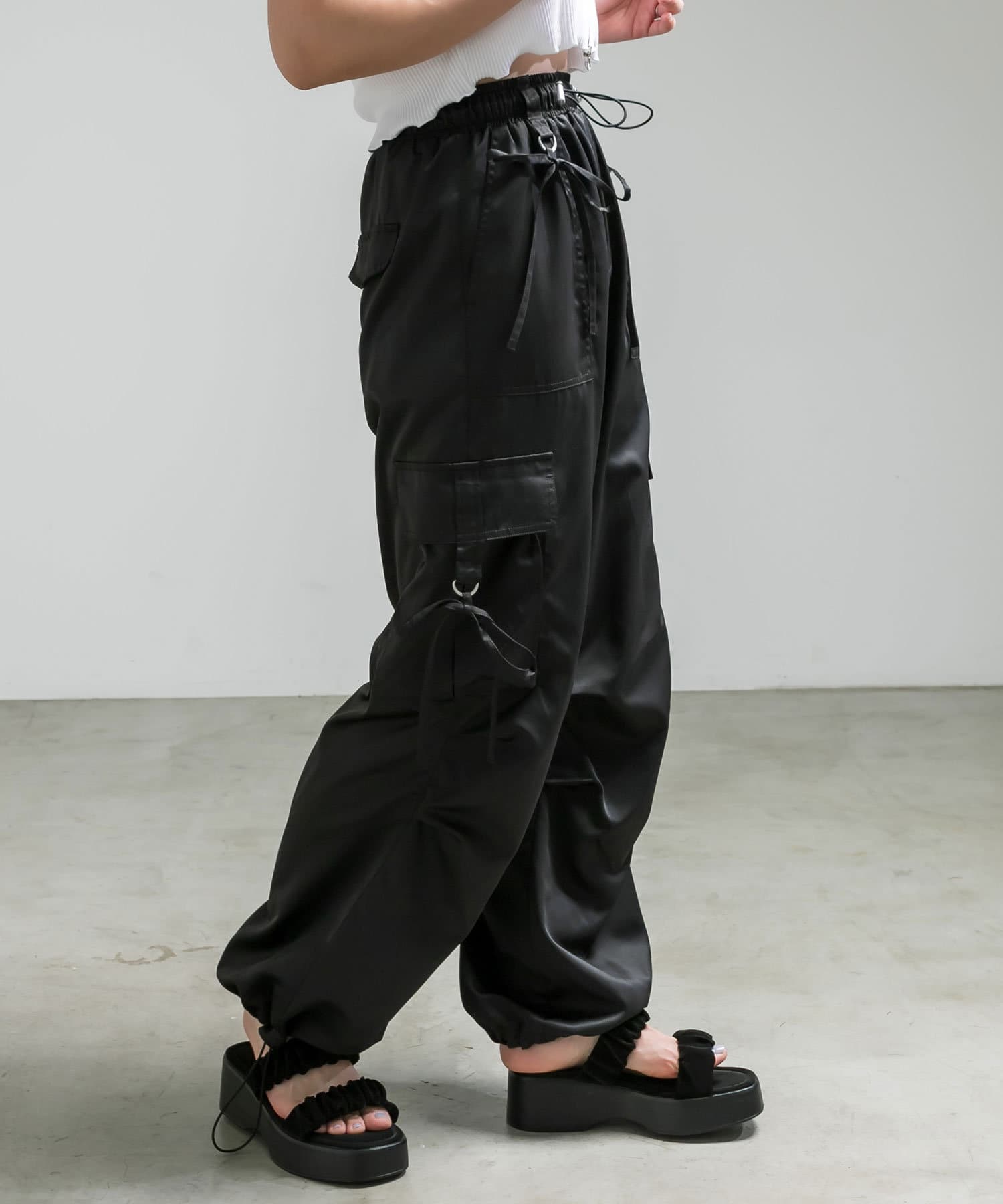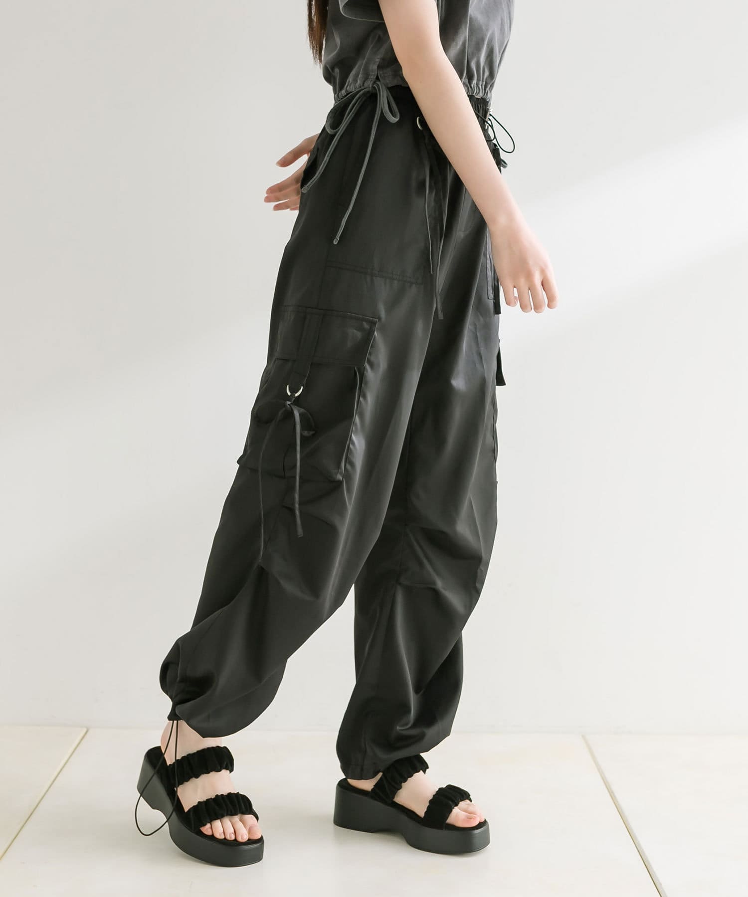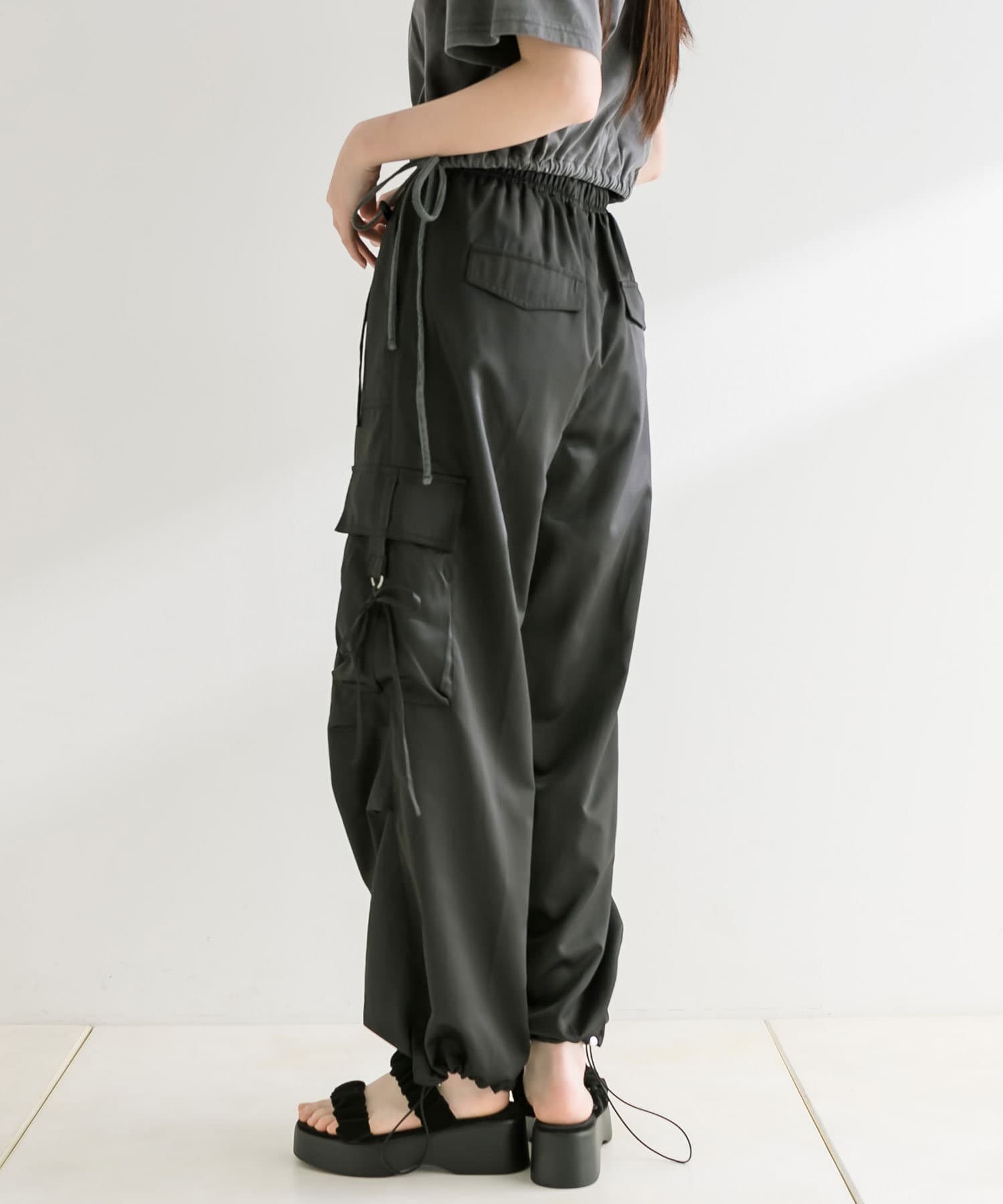 ・リボンチャームがポイントの女みデザインなカーゴパンツ。