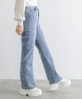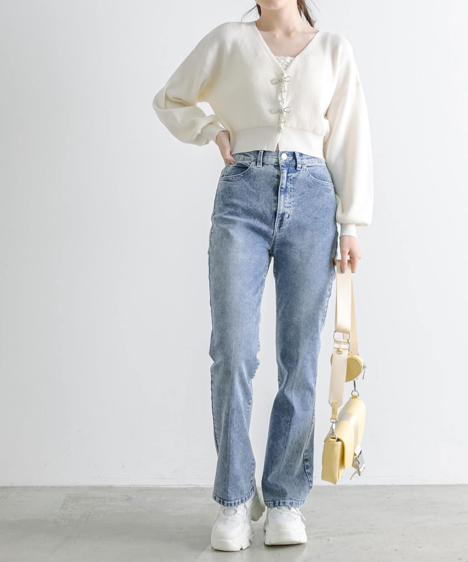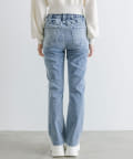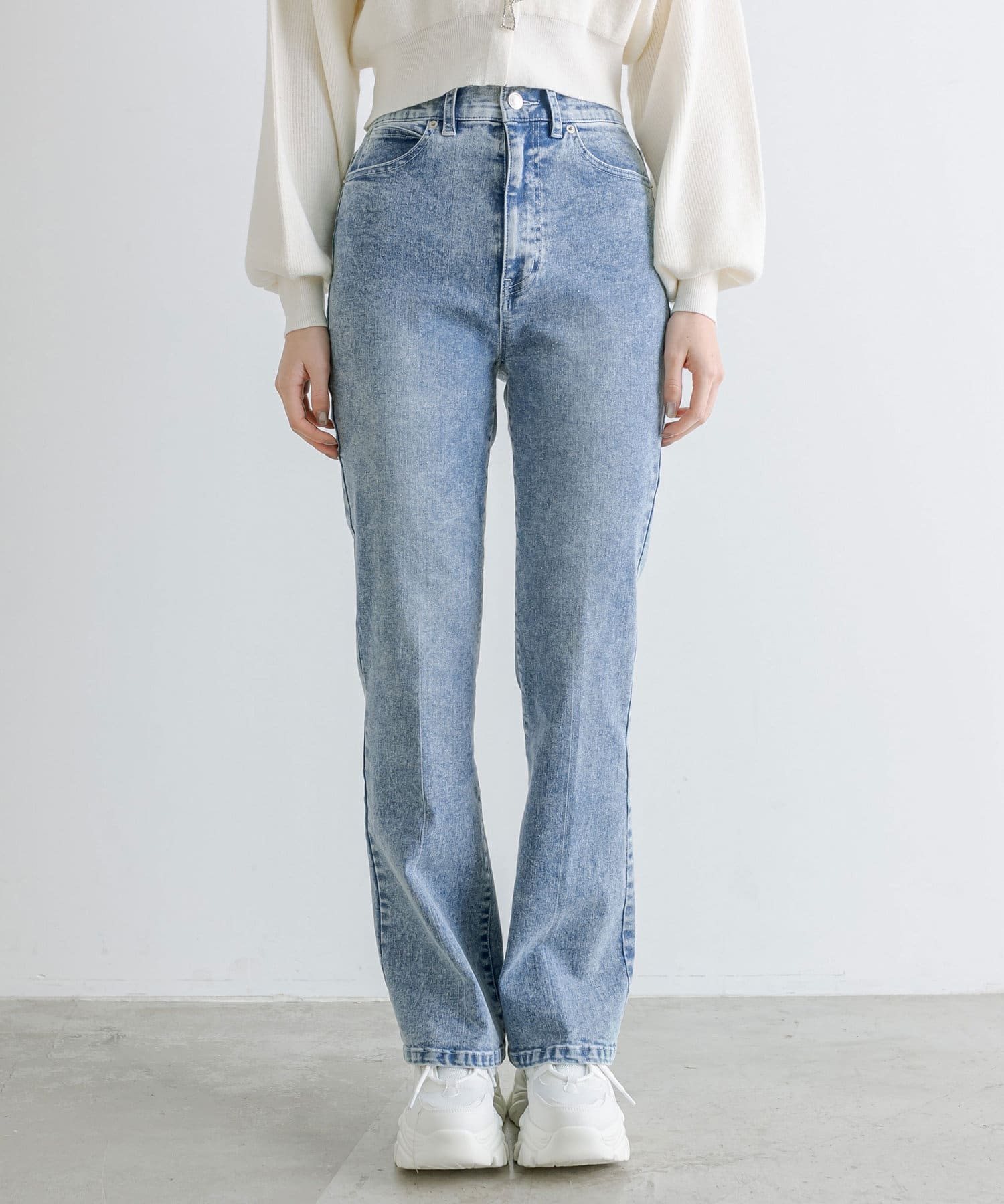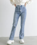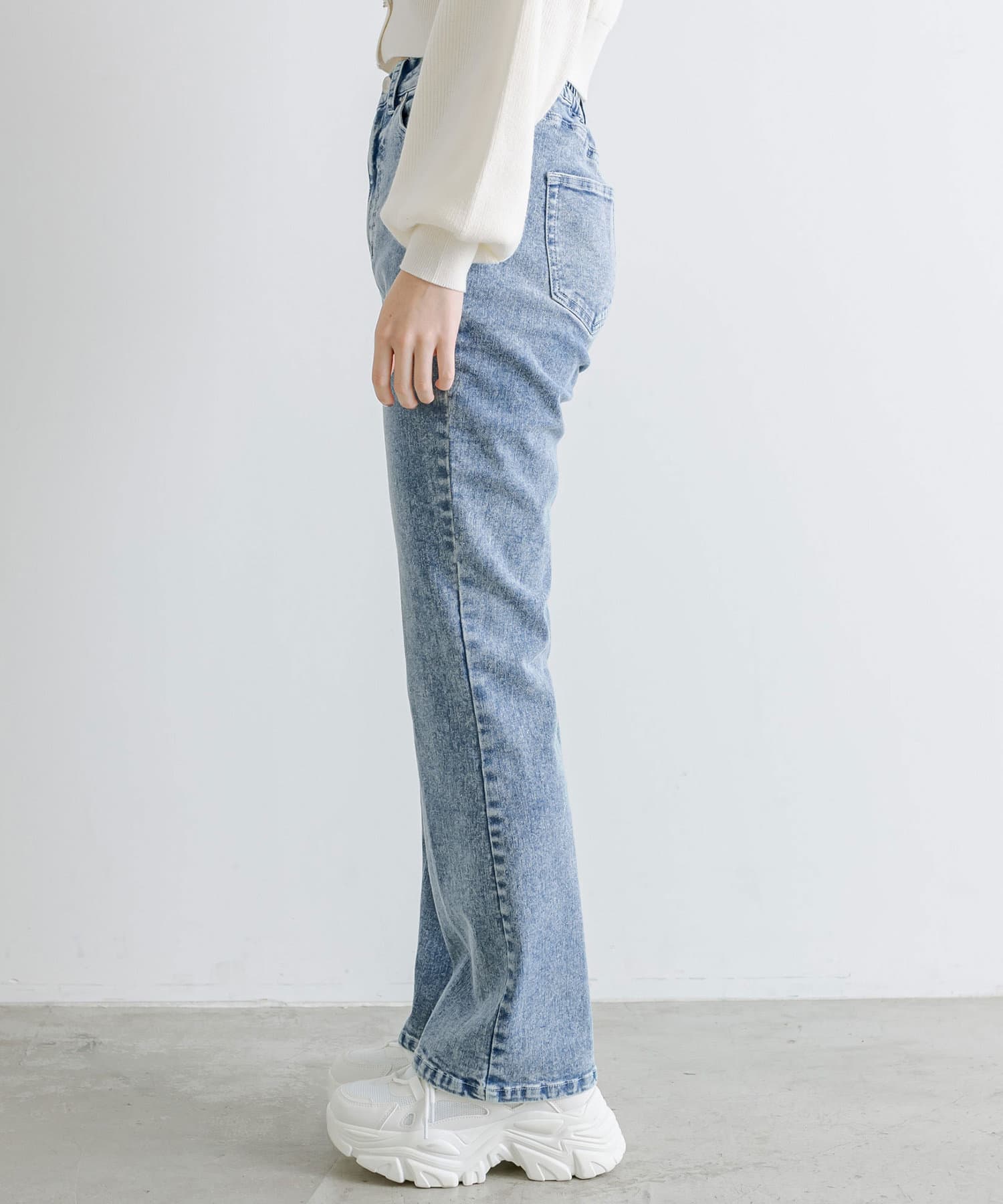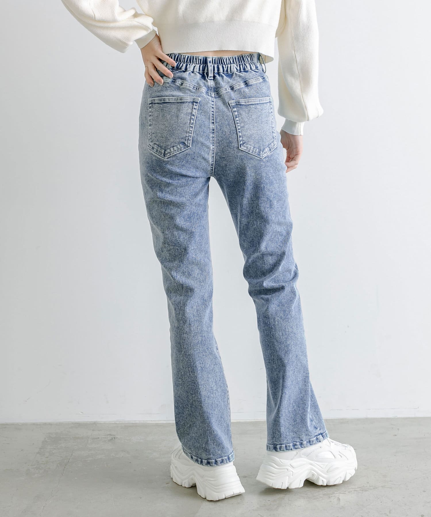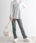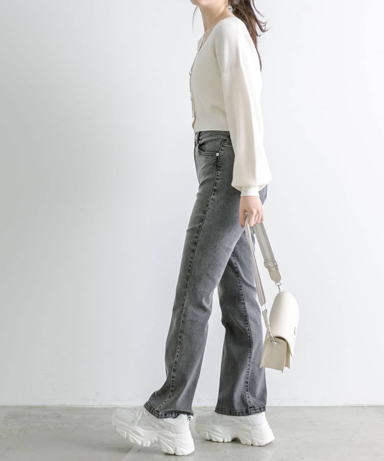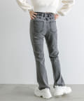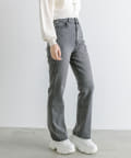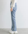 ・センタープレスと、程よく膝を絞ったフレアパンツなので脚長効果があります。