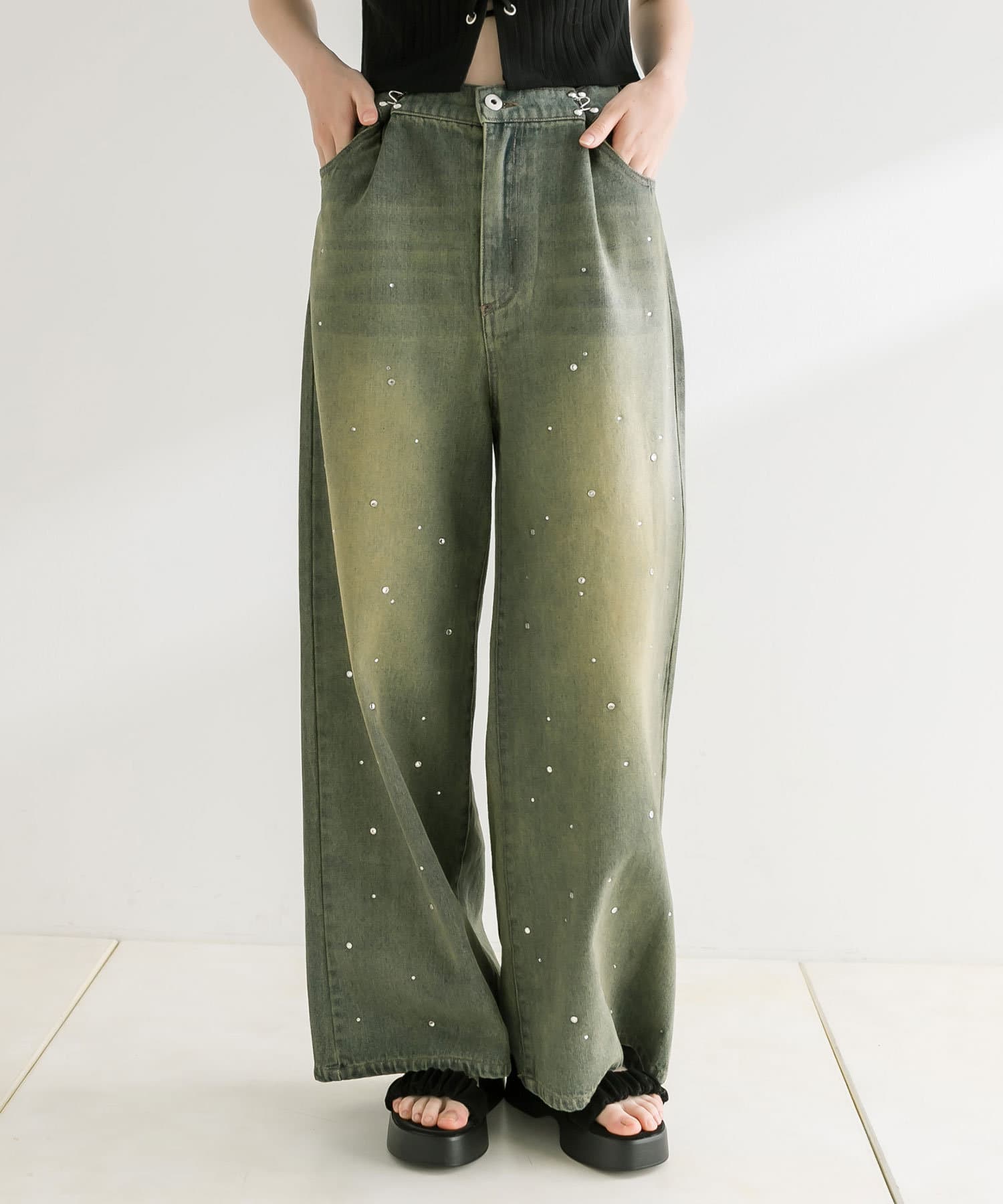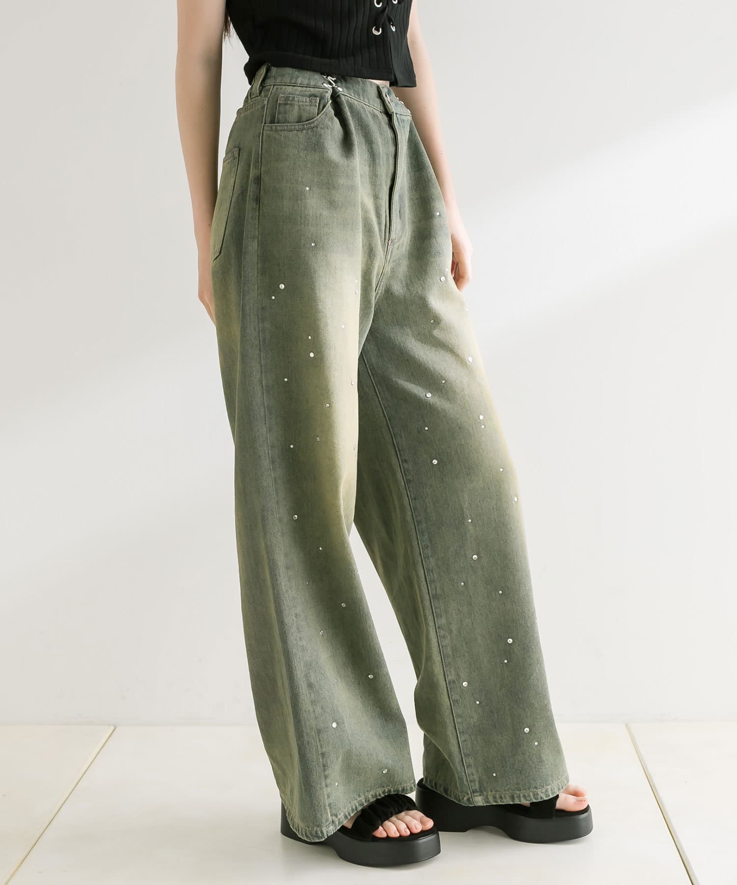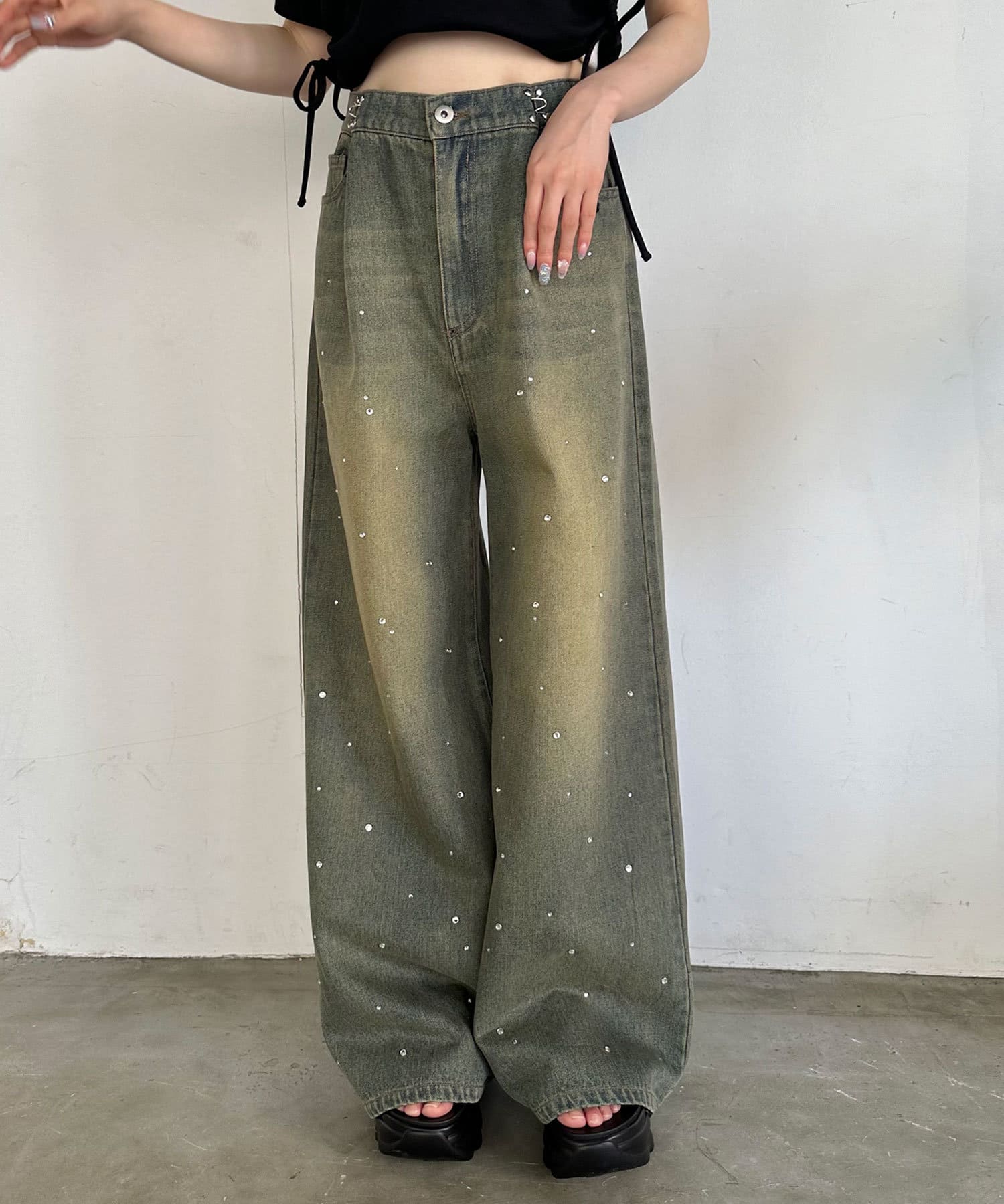 トレンドのオーバーダイ加工を施したワイドパンツ
