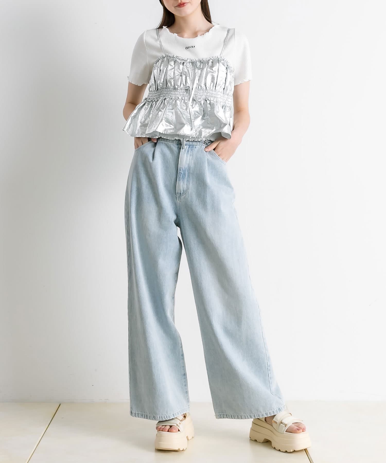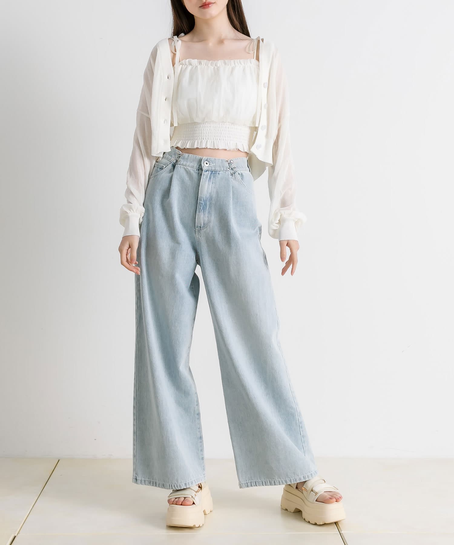 ・トップスはクロップド丈のTシャツやニットなどコンパクトなものがおすすめ。