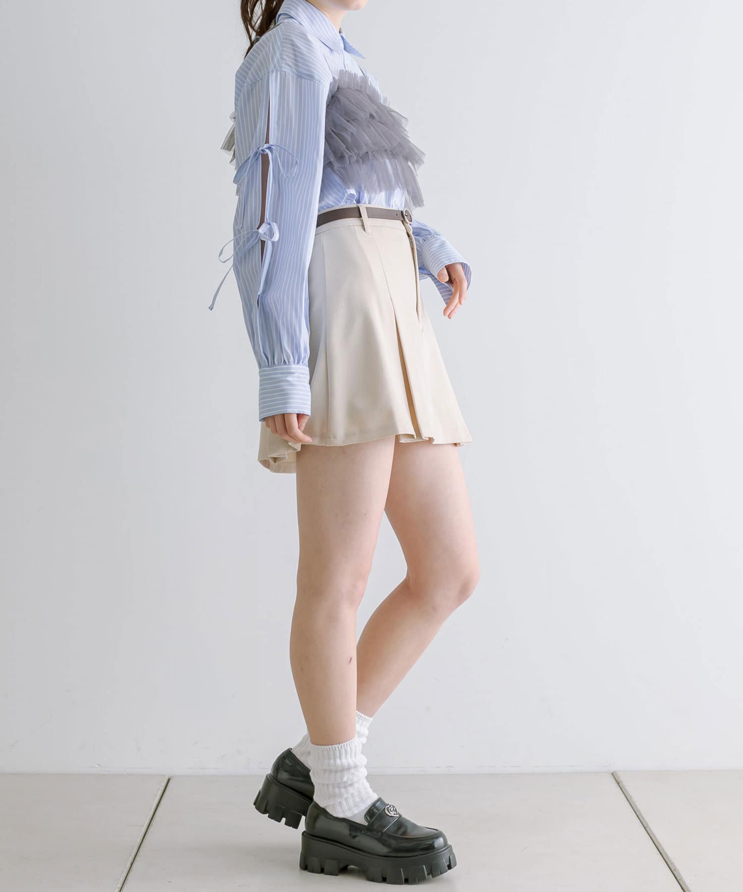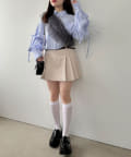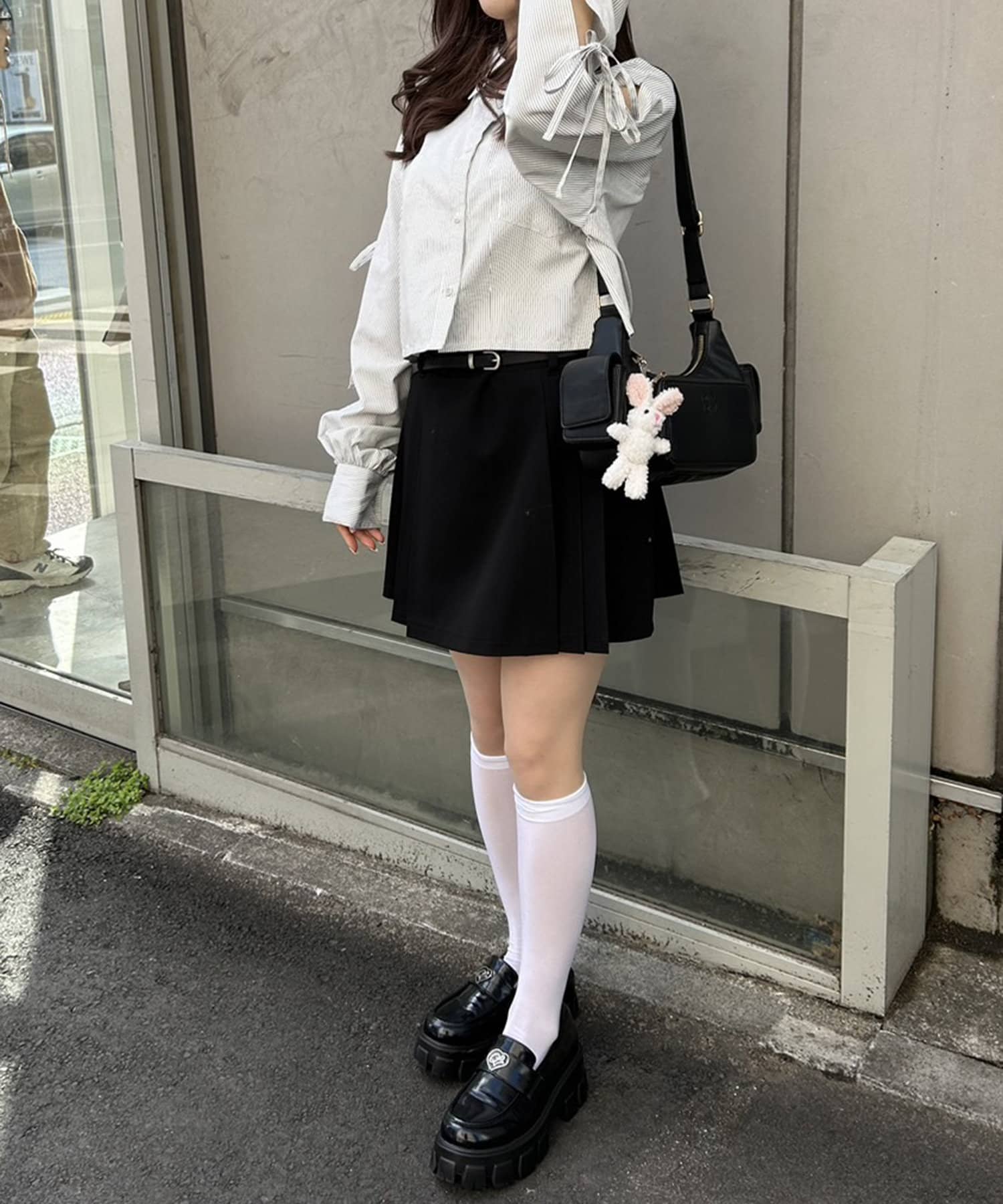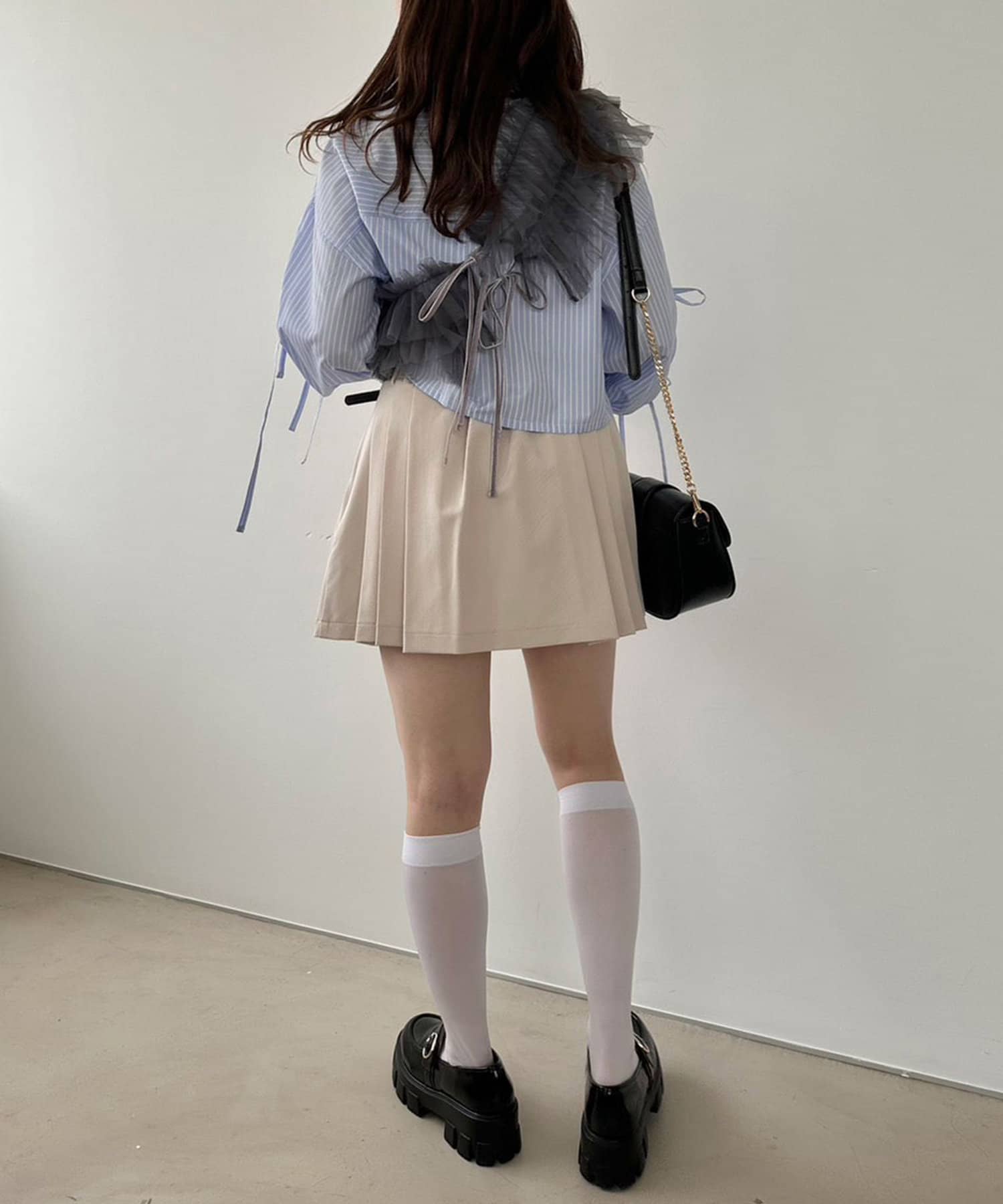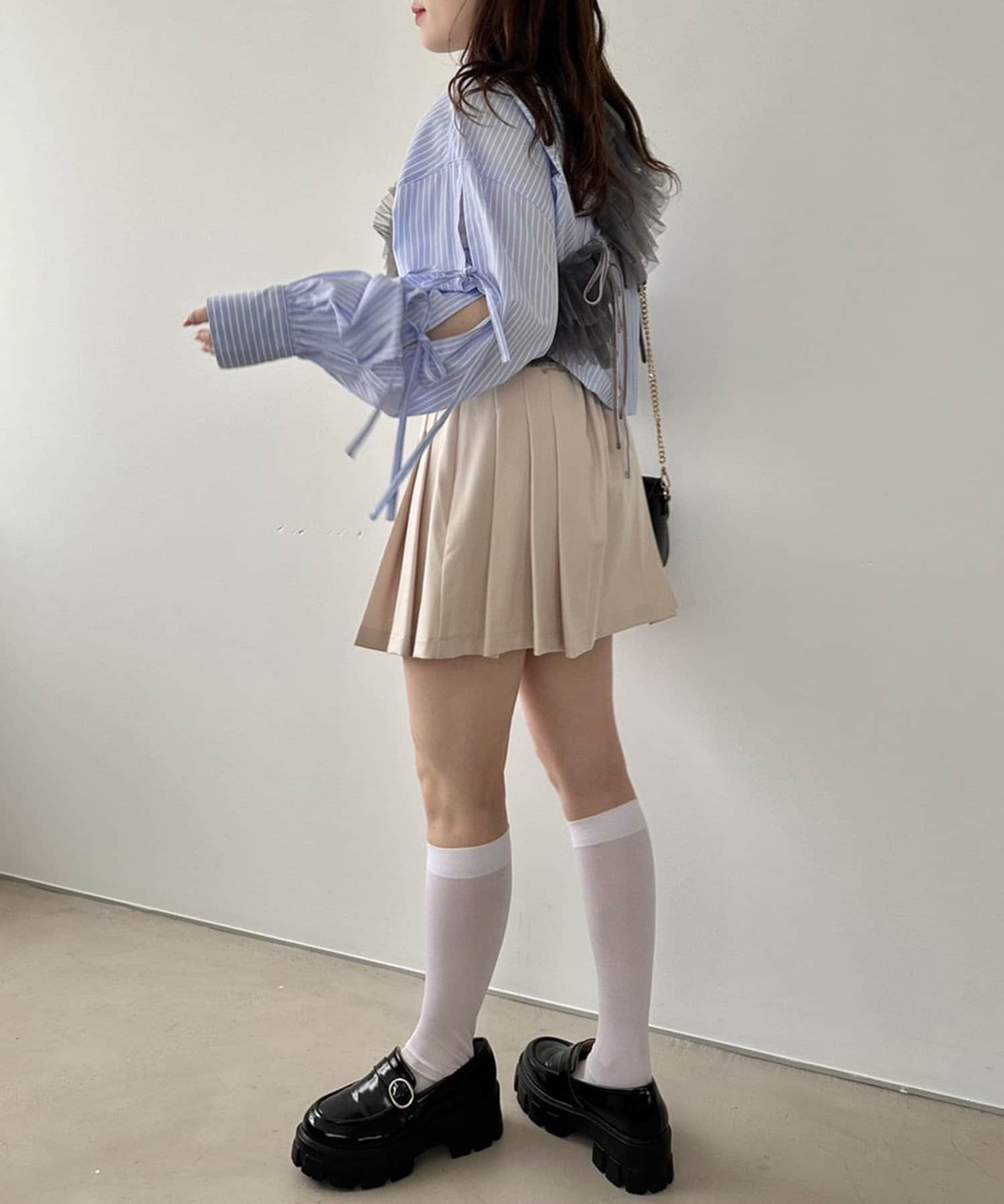 ・プリーツミニスカートで合わせればプレッピースタイルに。