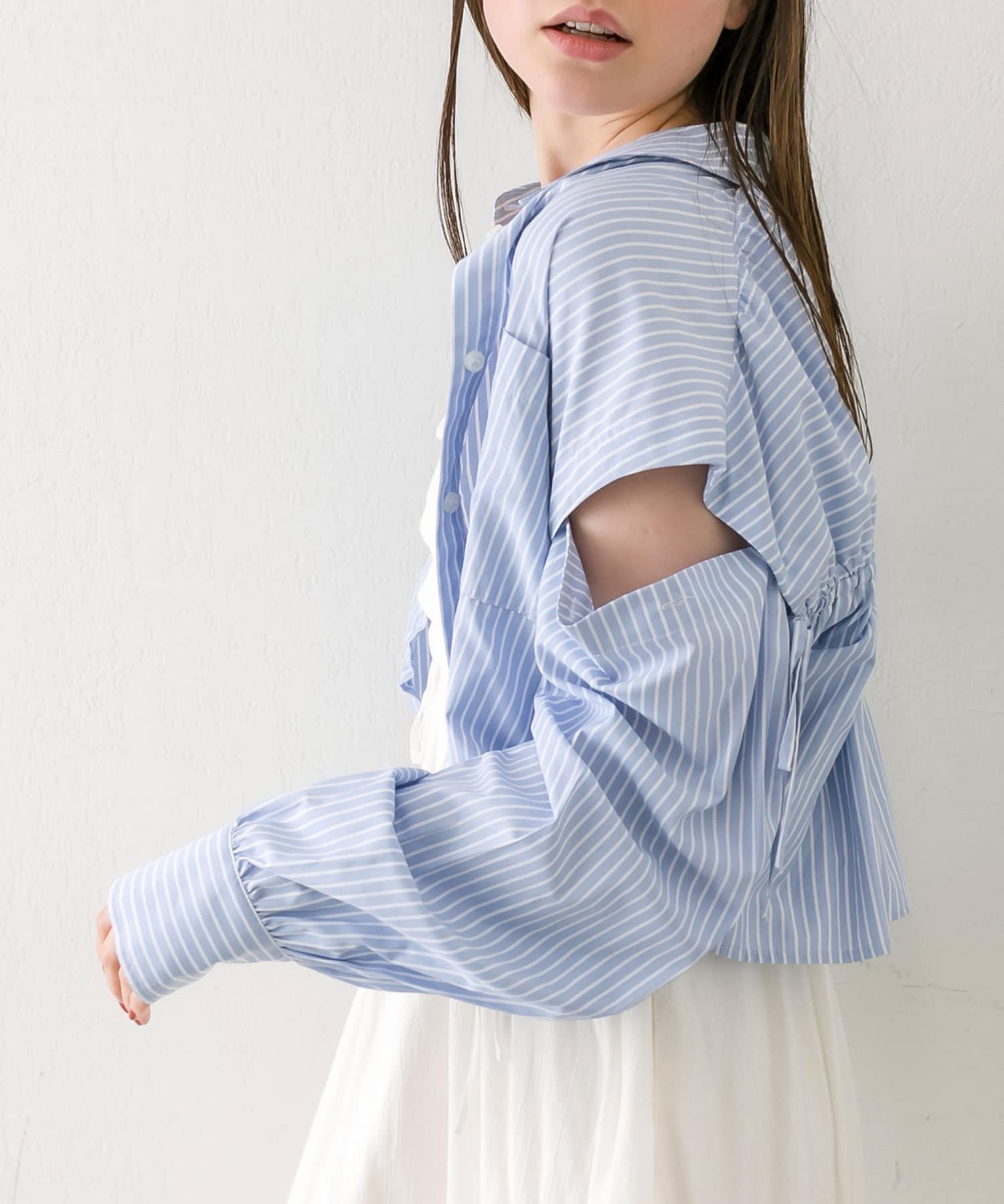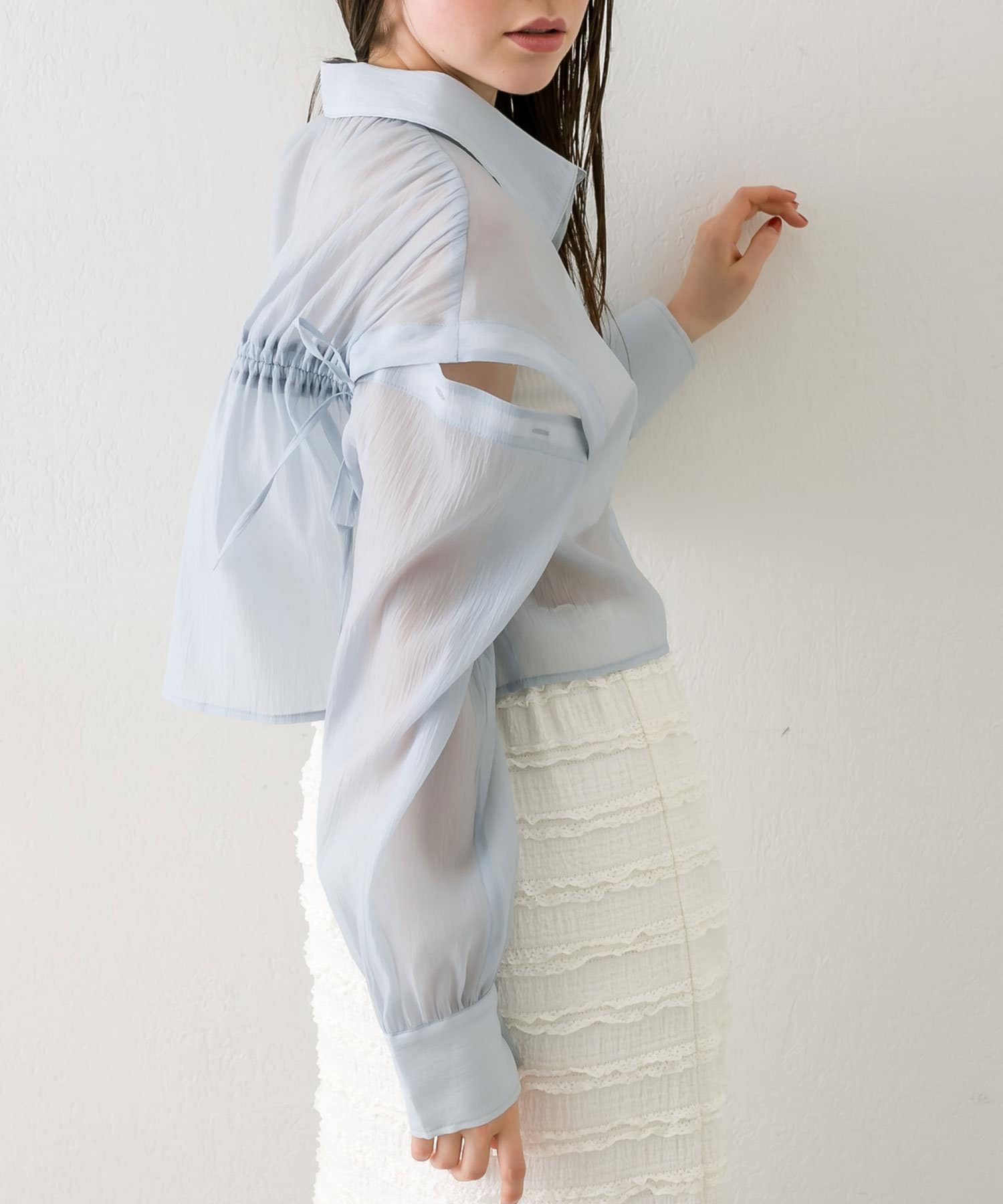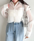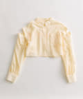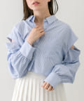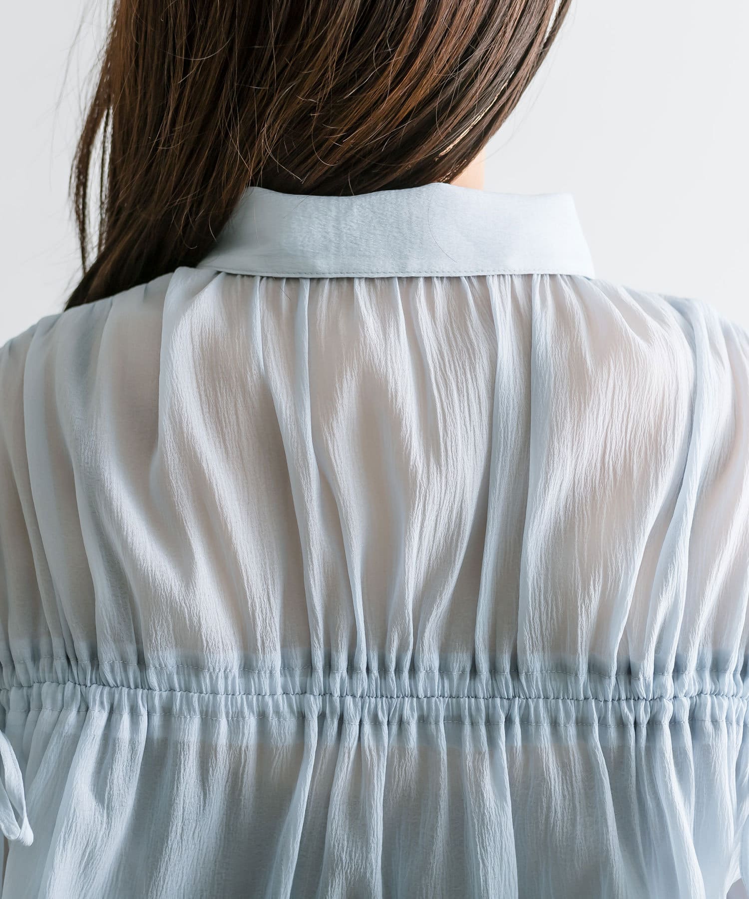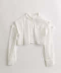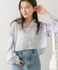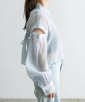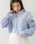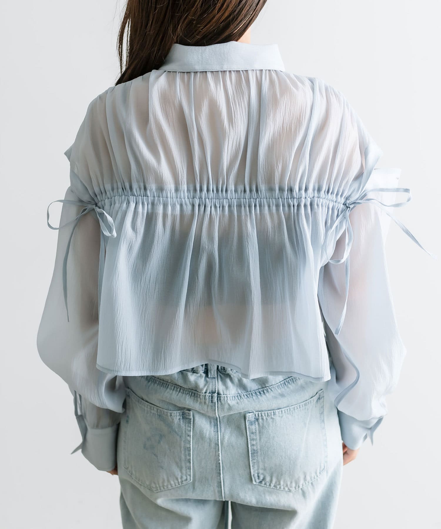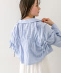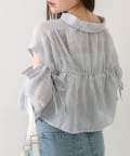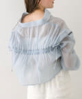 ・後ろにギャザーをたっぷりよせ、リボンが女性らしさをプラスされたクロップドシャツ。