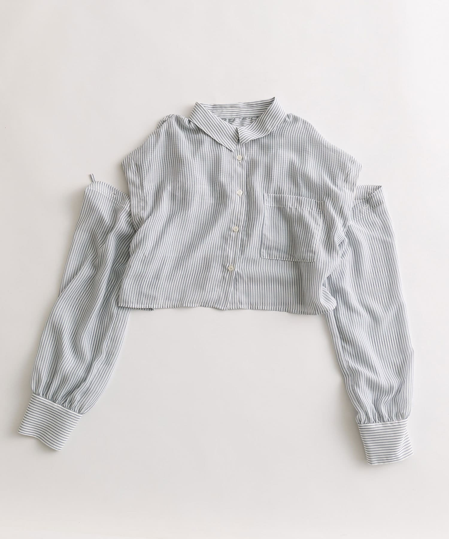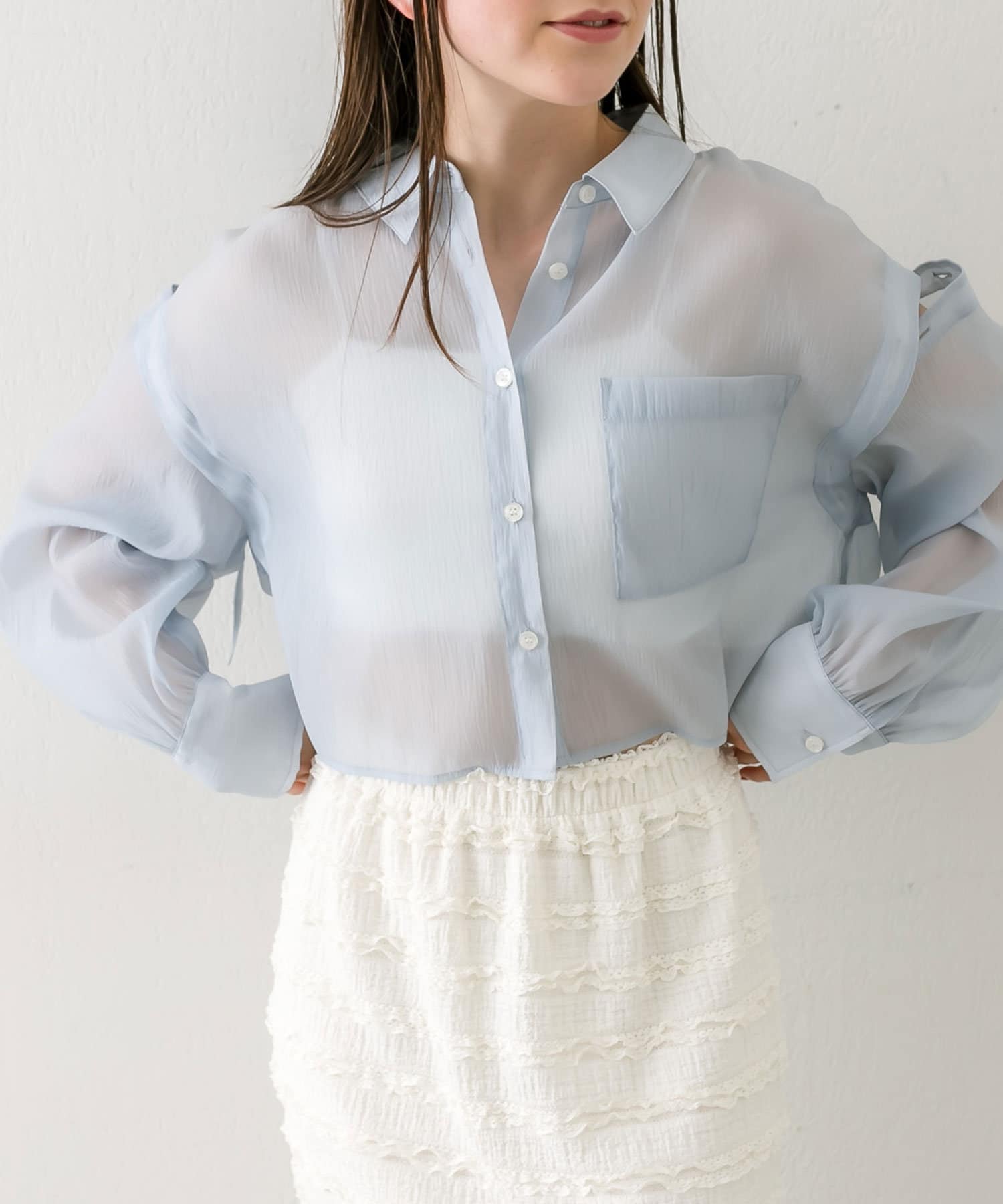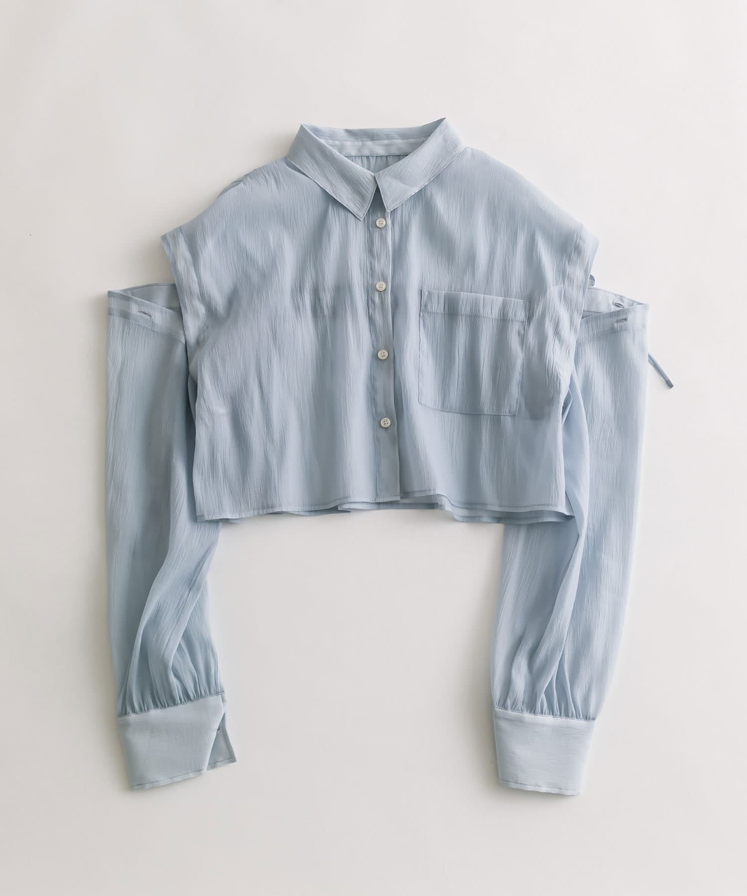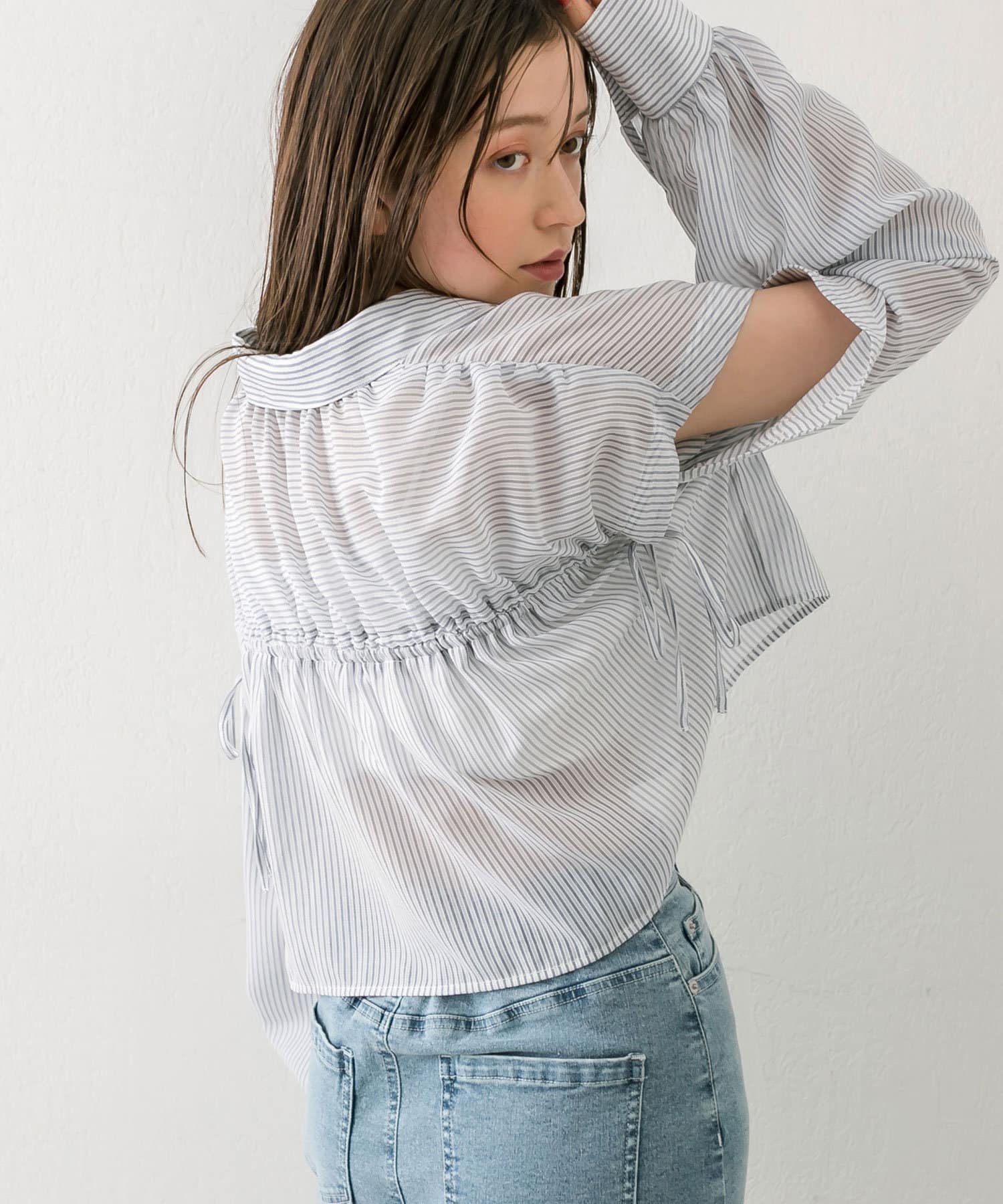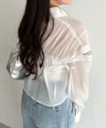 ・後ろにギャザーをたっぷりよせ、リボンが女性らしさをプラスされたクロップドシャツ。