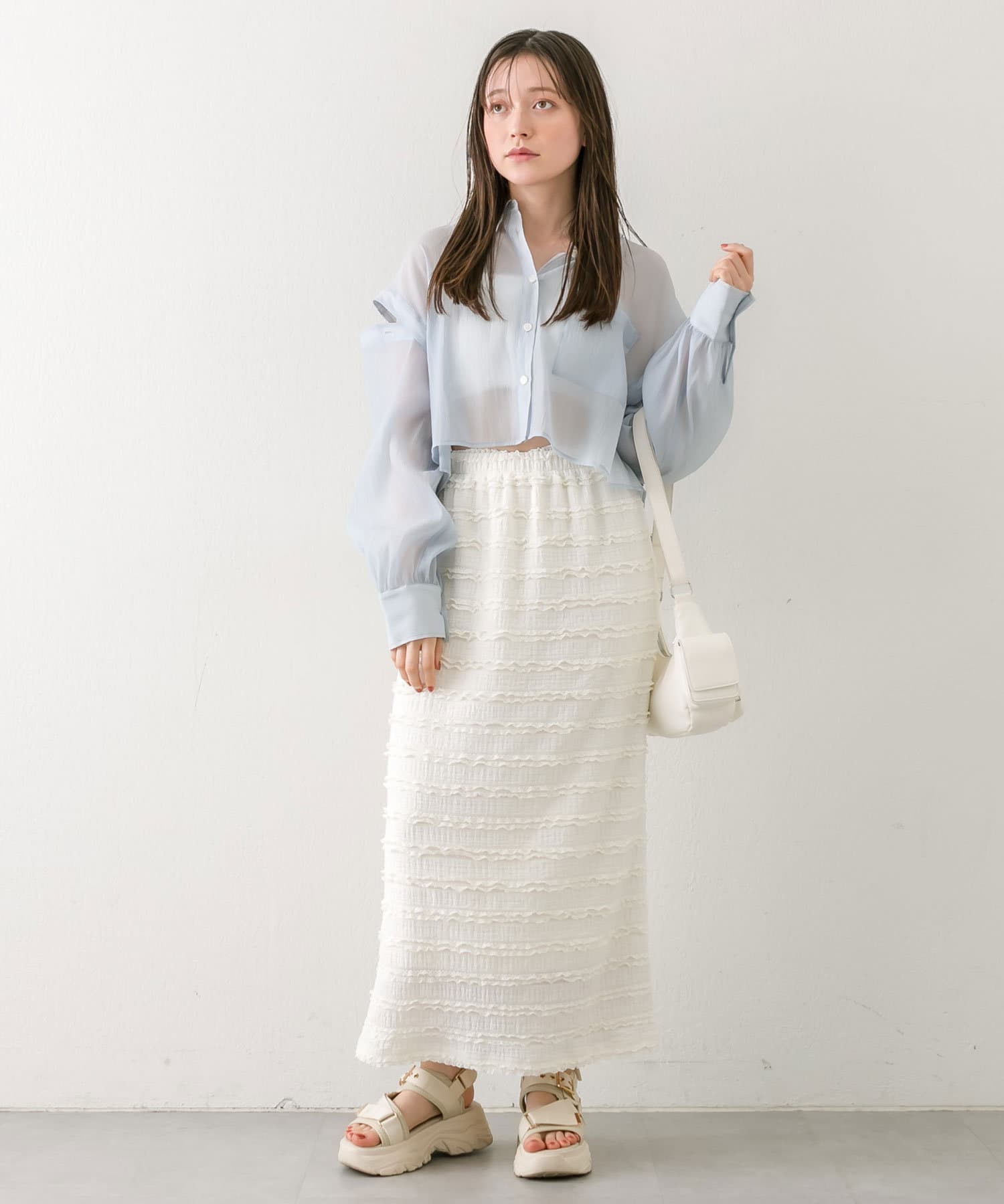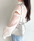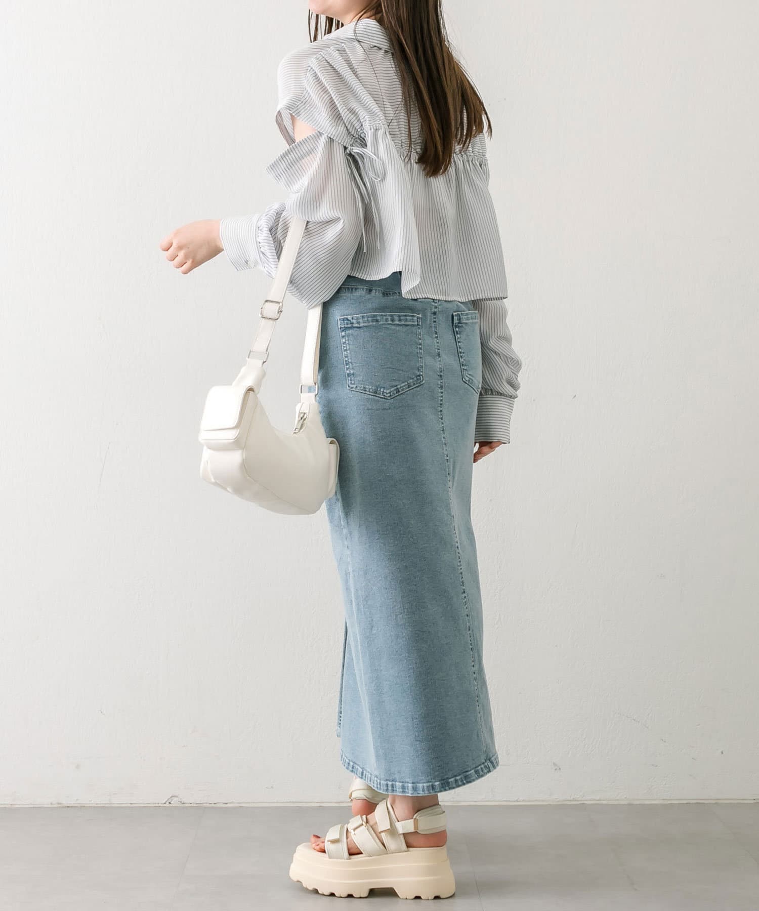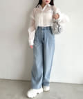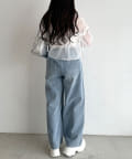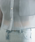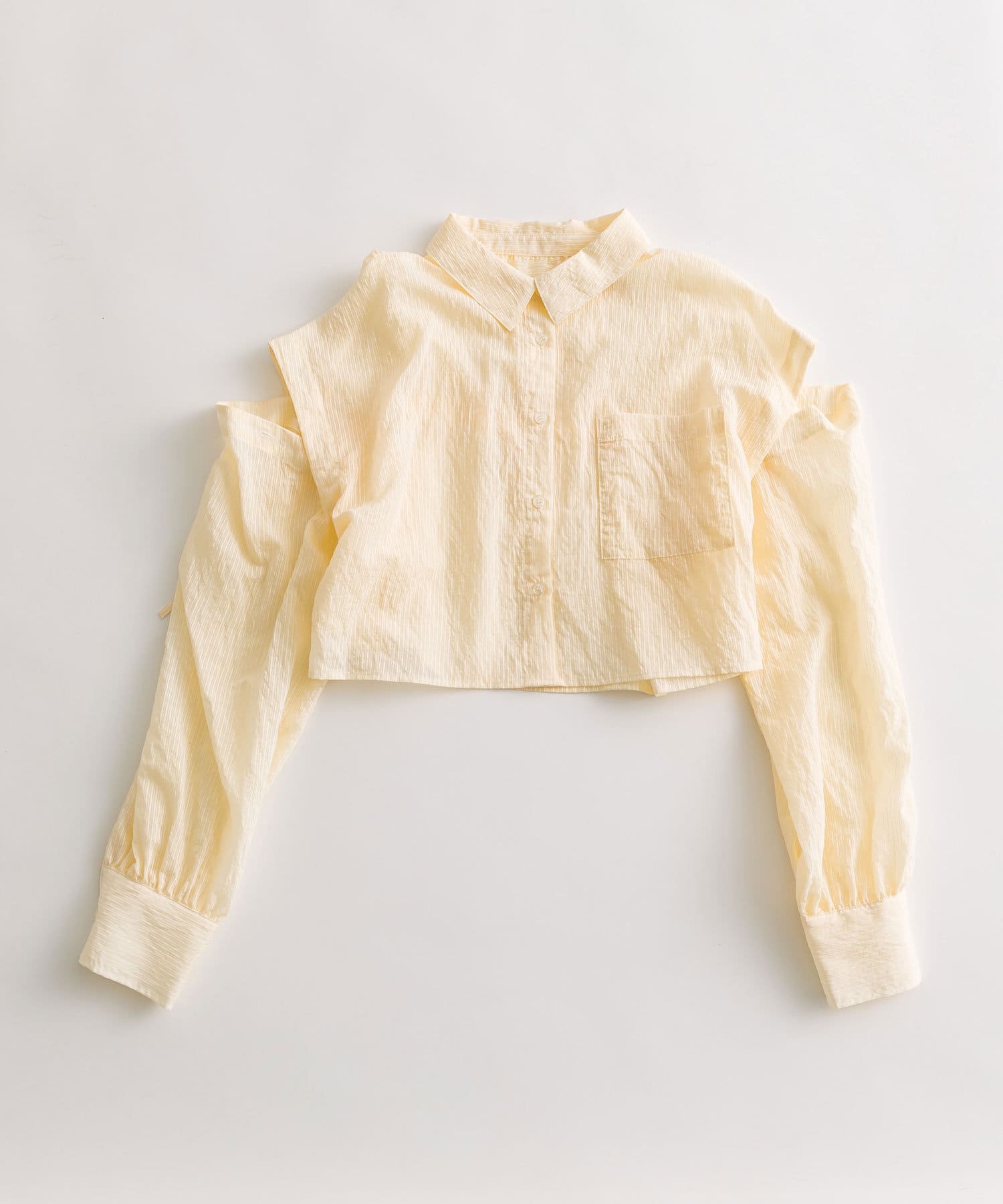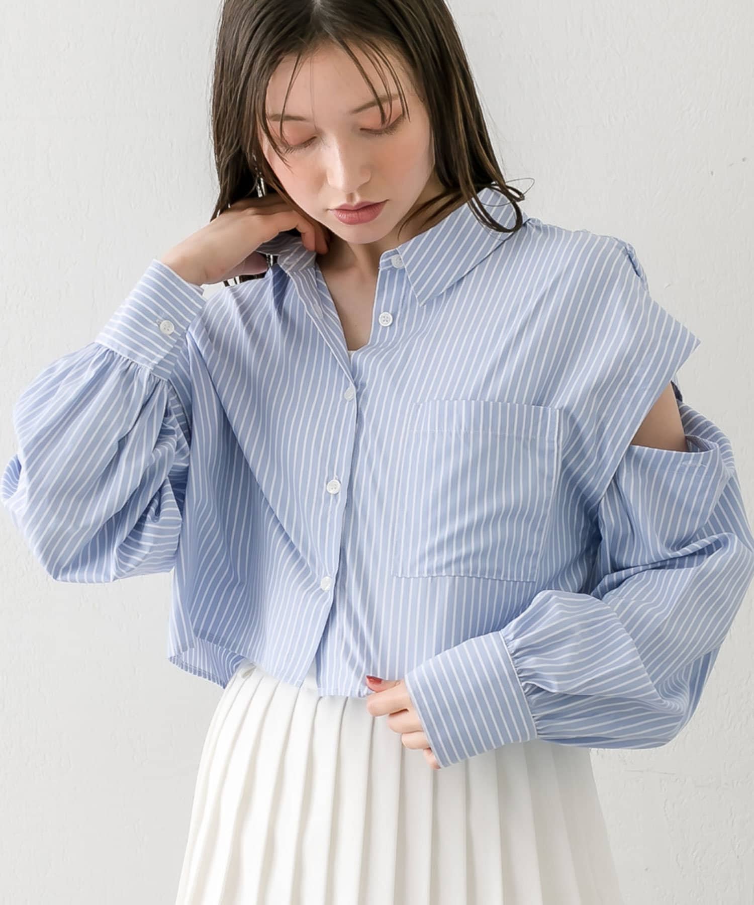 ・後ろにギャザーをたっぷりよせ、リボンが女性らしさをプラスされたクロップドシャツ。