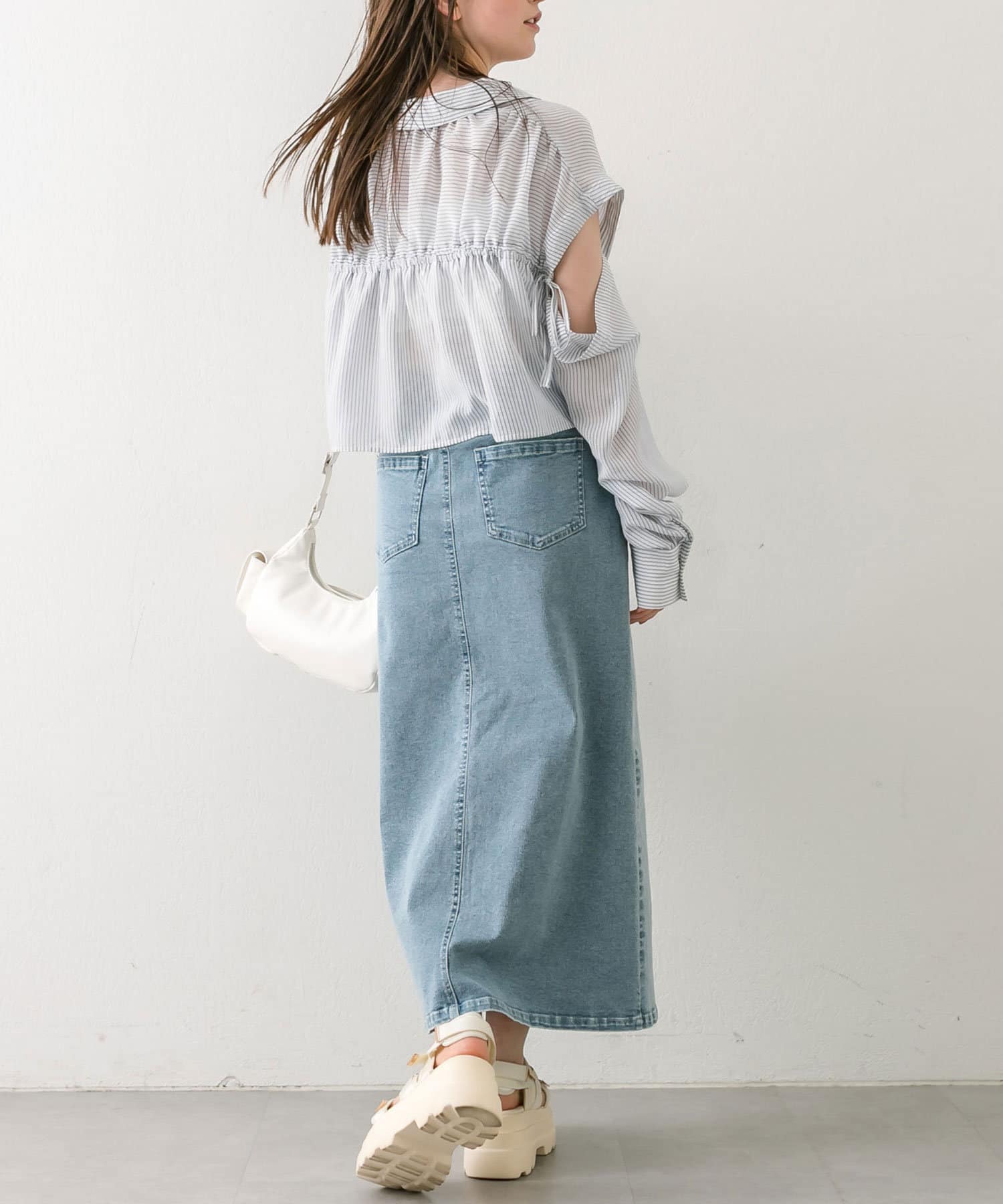 ・後ろにギャザーをたっぷりよせ、リボンが女性らしさをプラスされたクロップドシャツ。