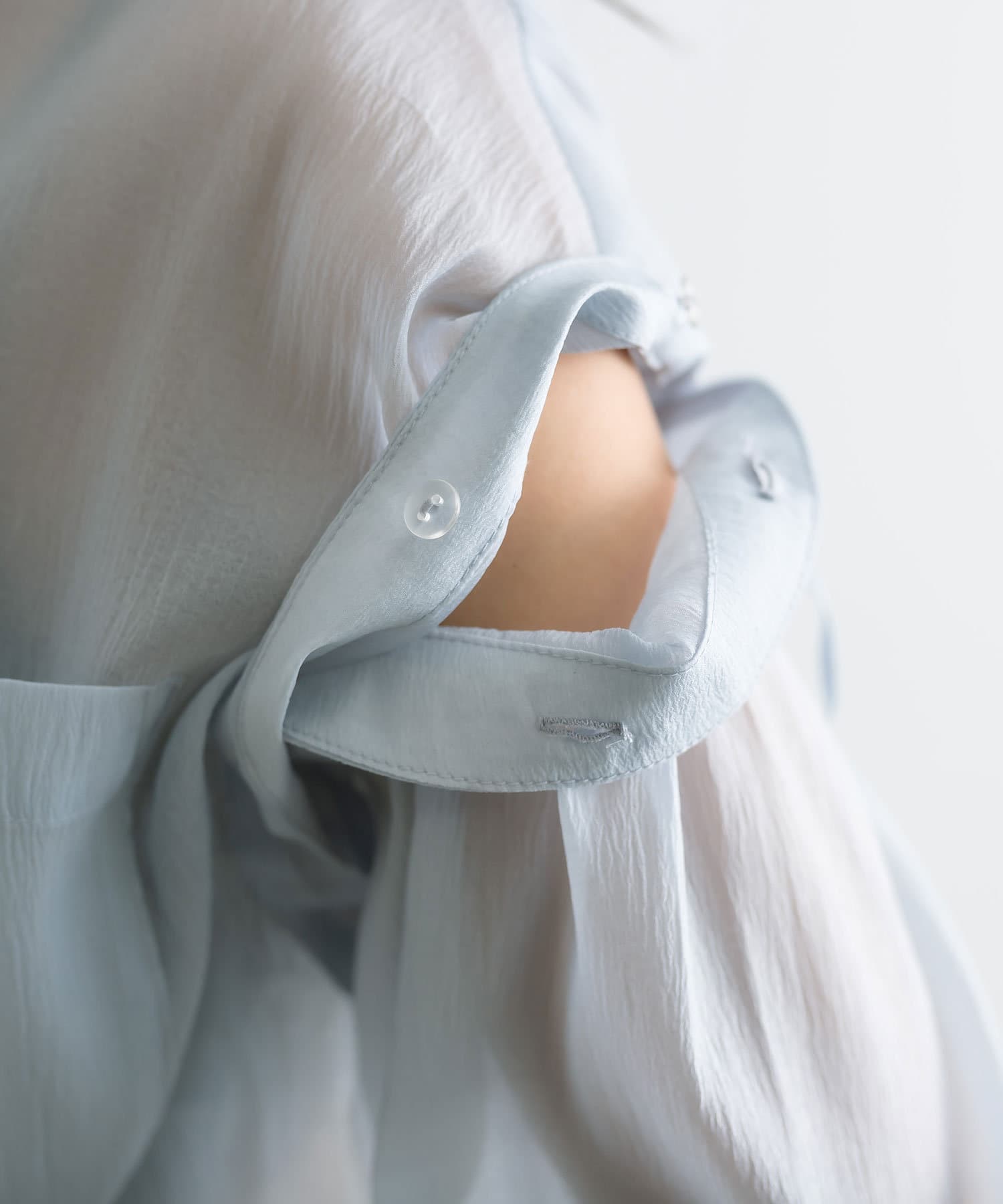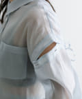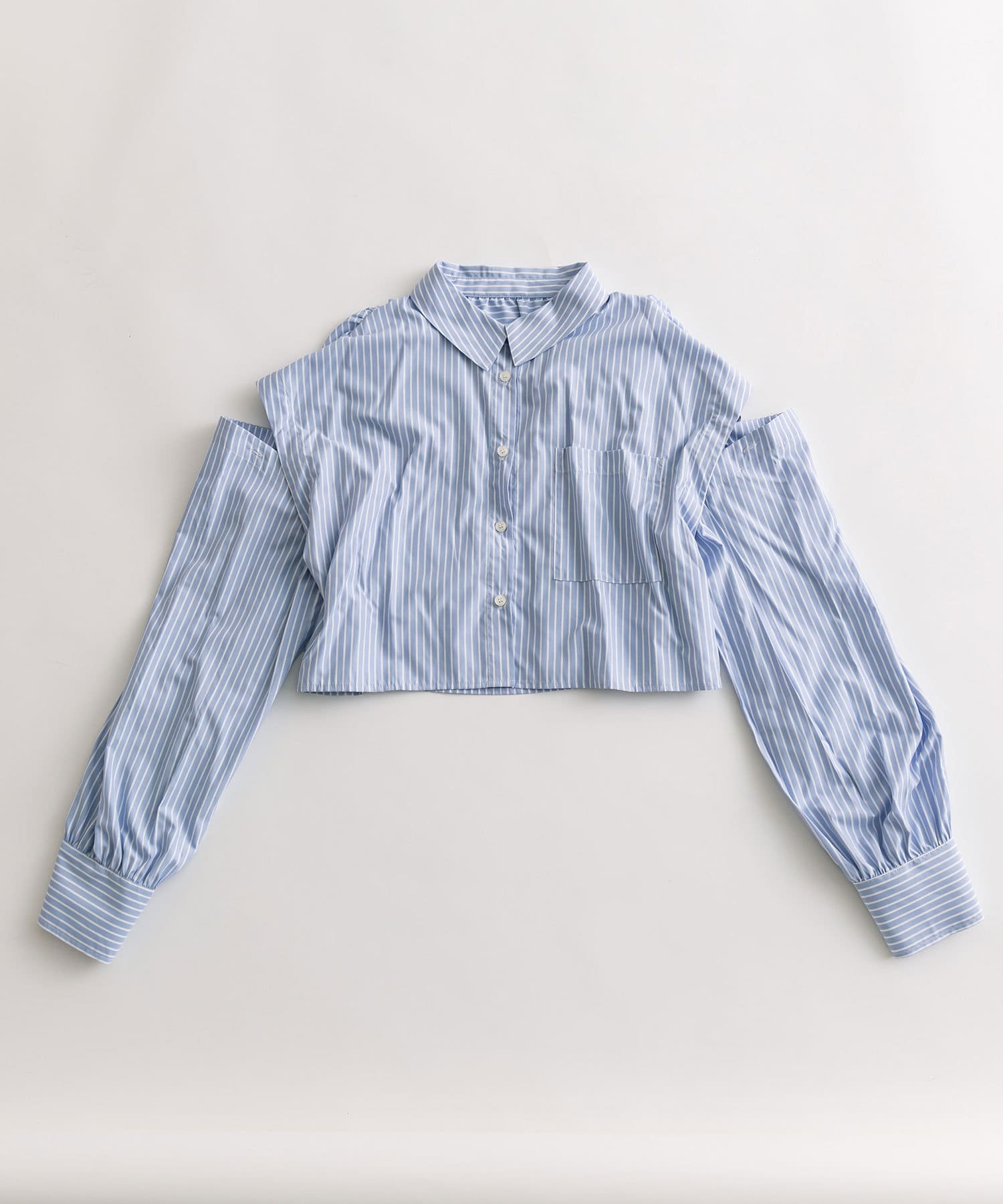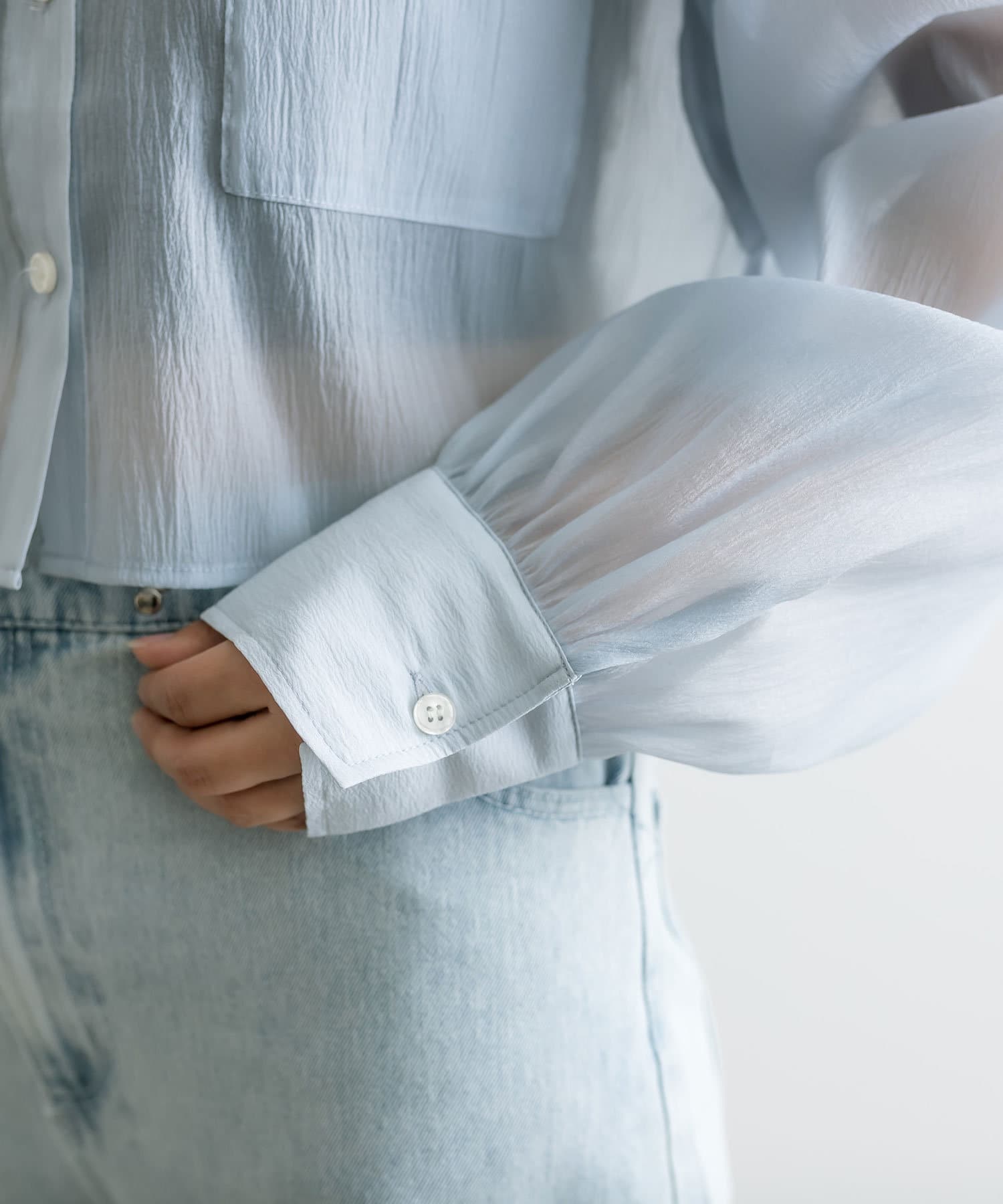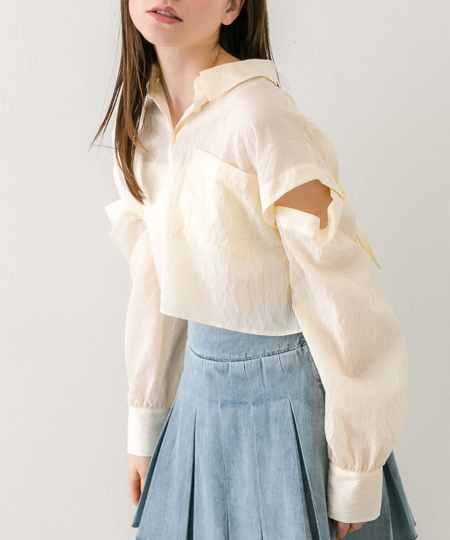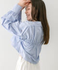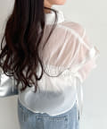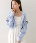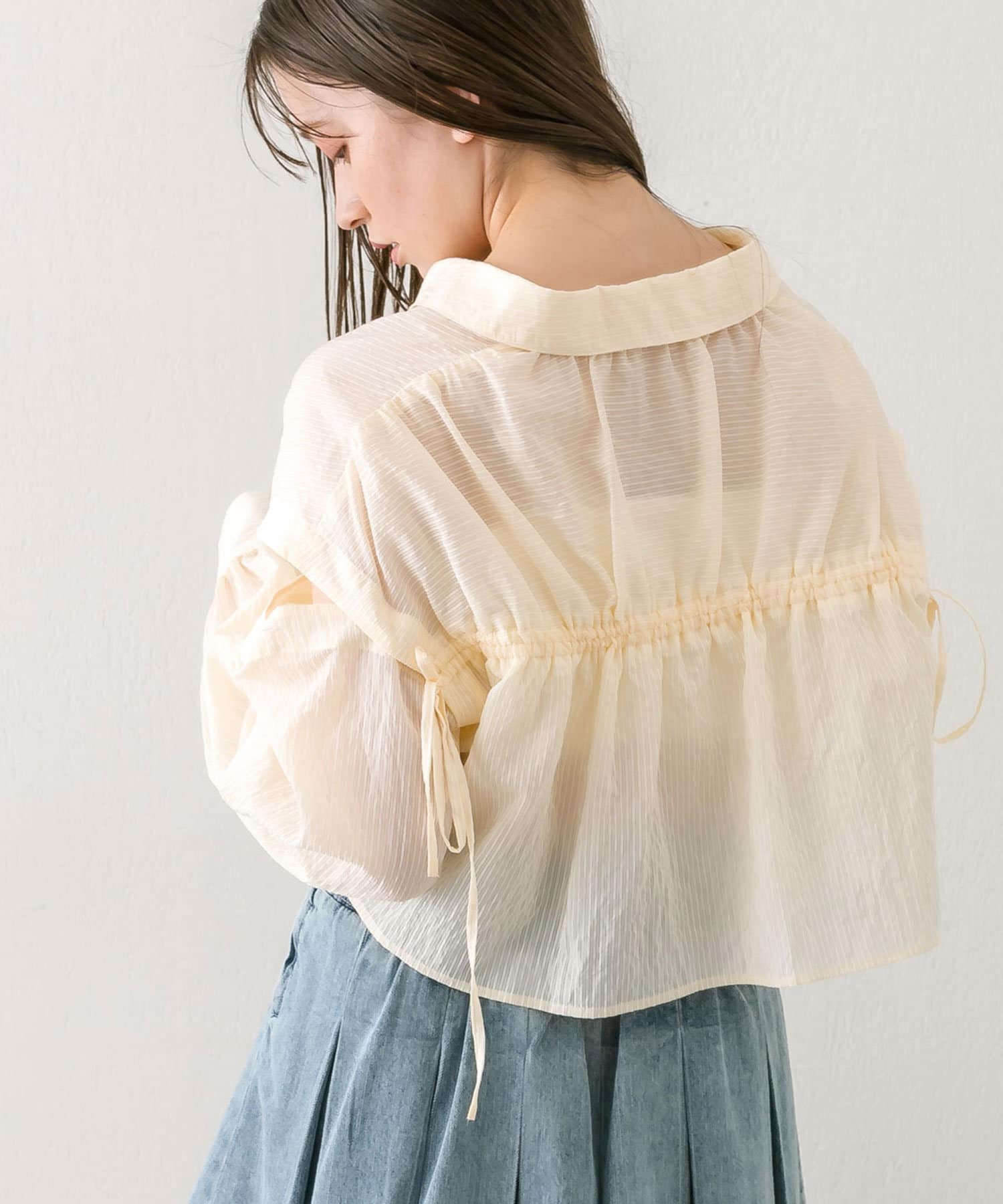 ・後ろにギャザーをたっぷりよせ、リボンが女性らしさをプラスされたクロップドシャツ。