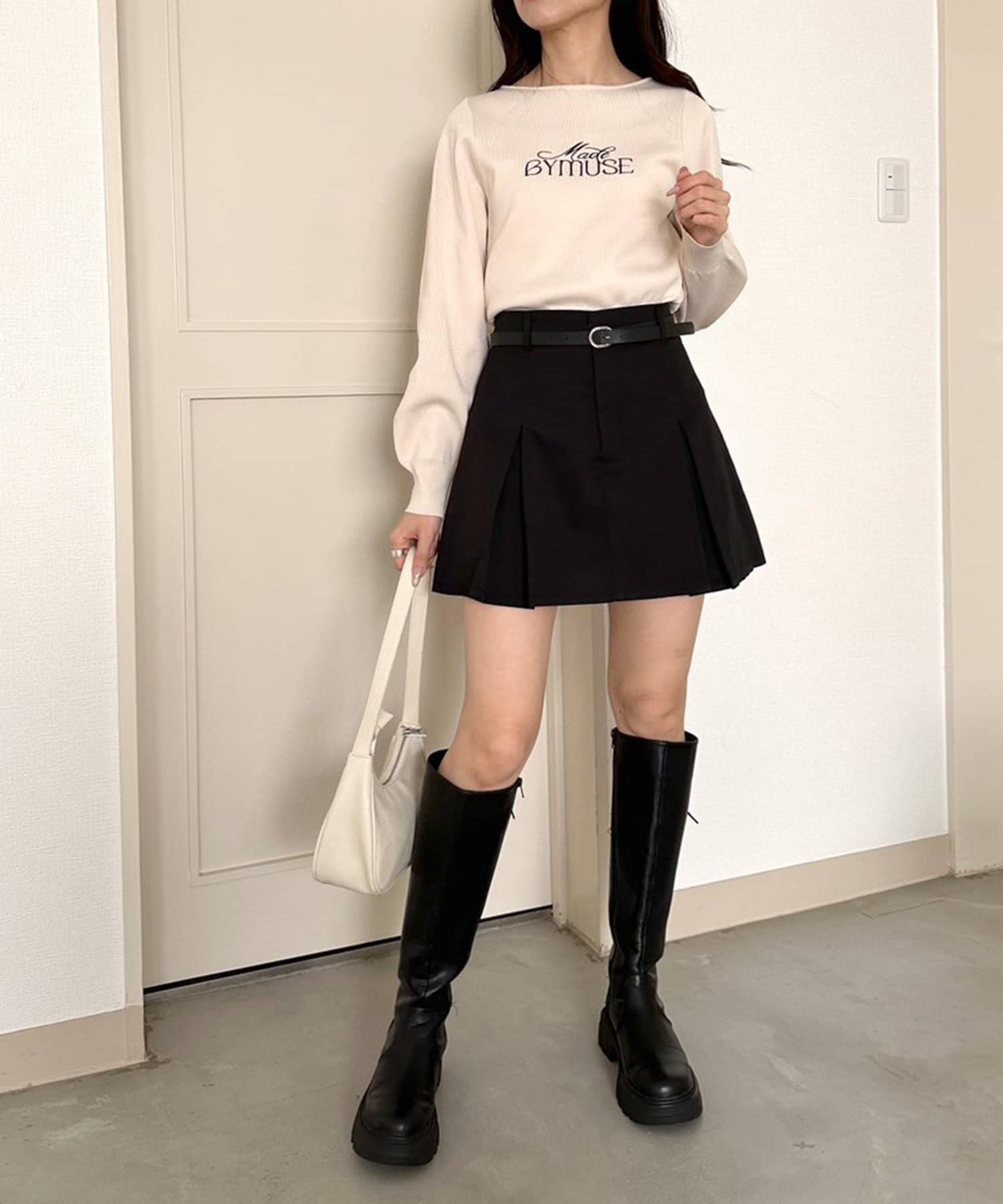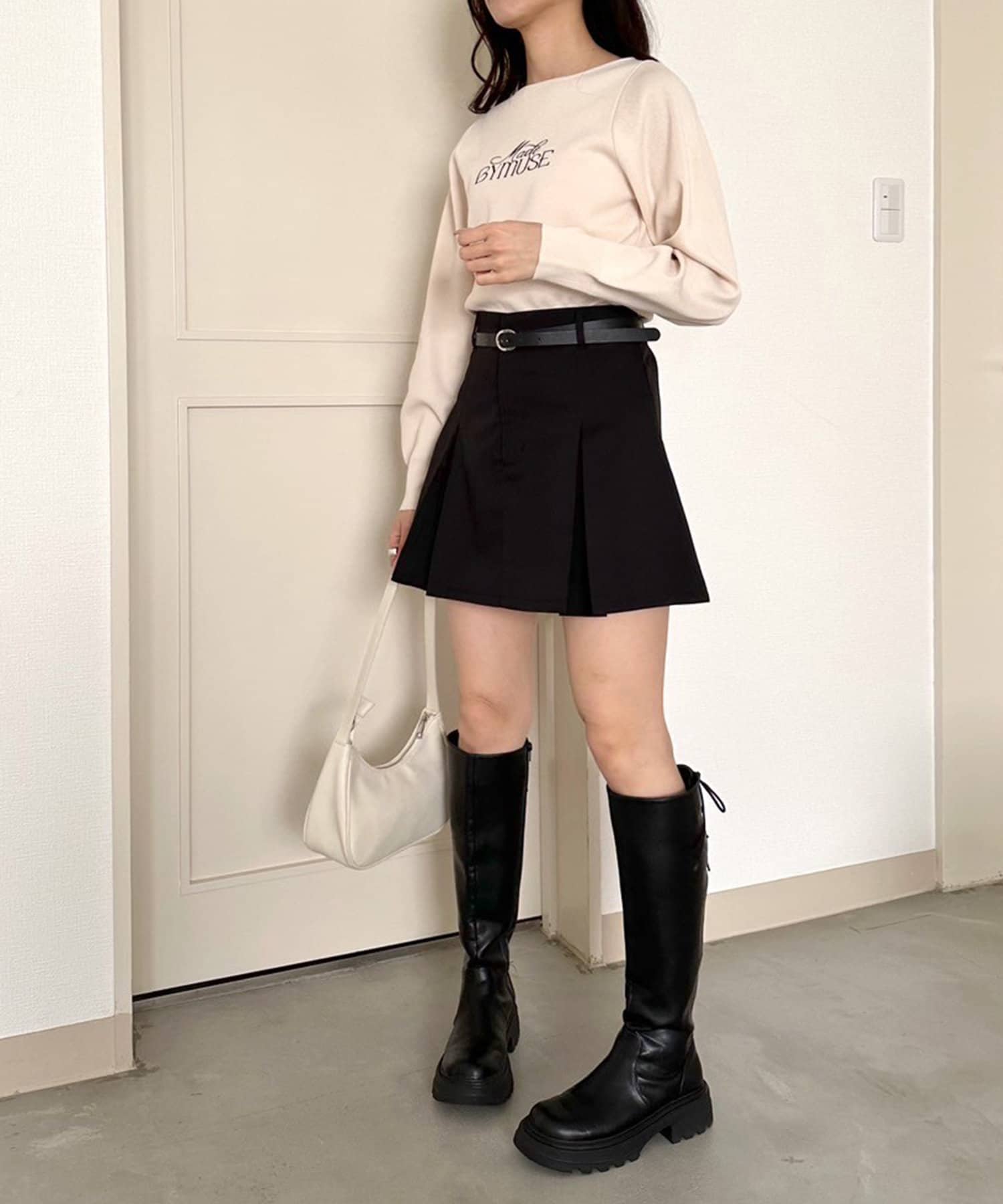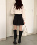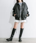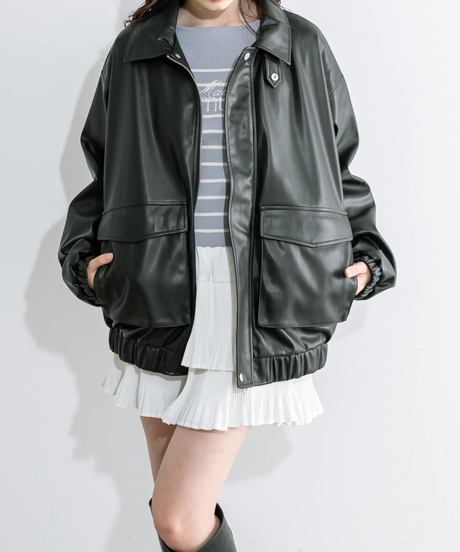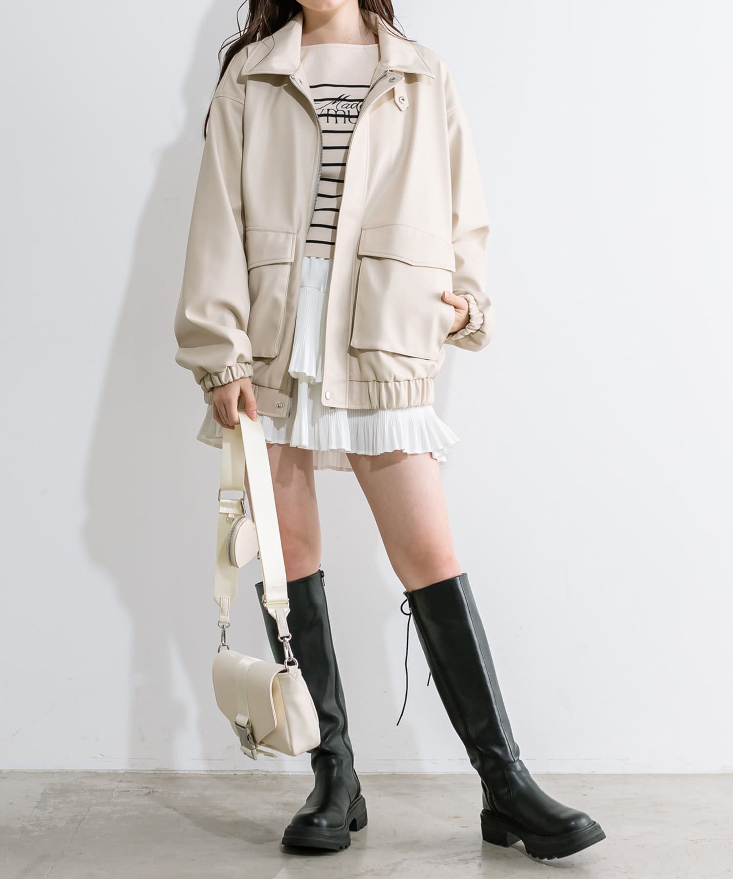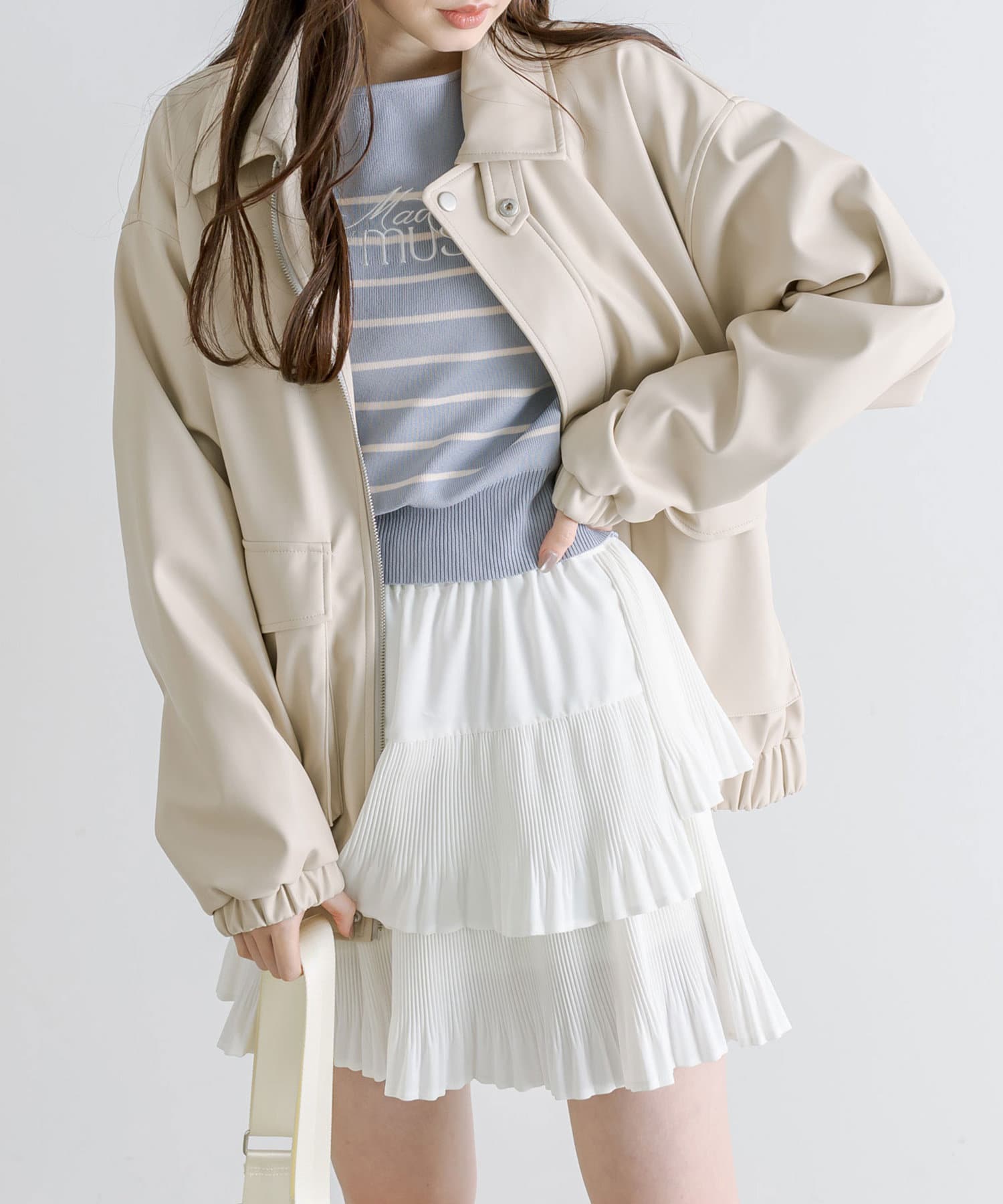 ・トレンドのプリーツミニスカートに合皮ブルゾンの異素材ミックスコーデが一押し。