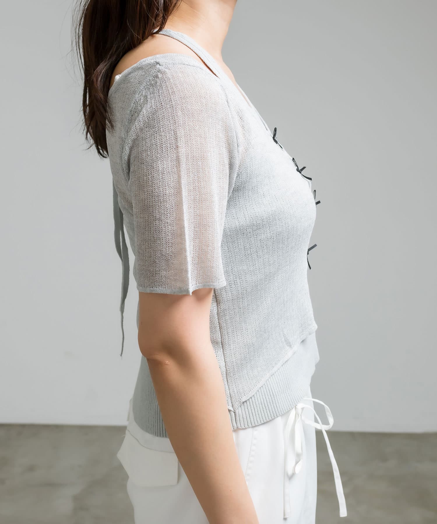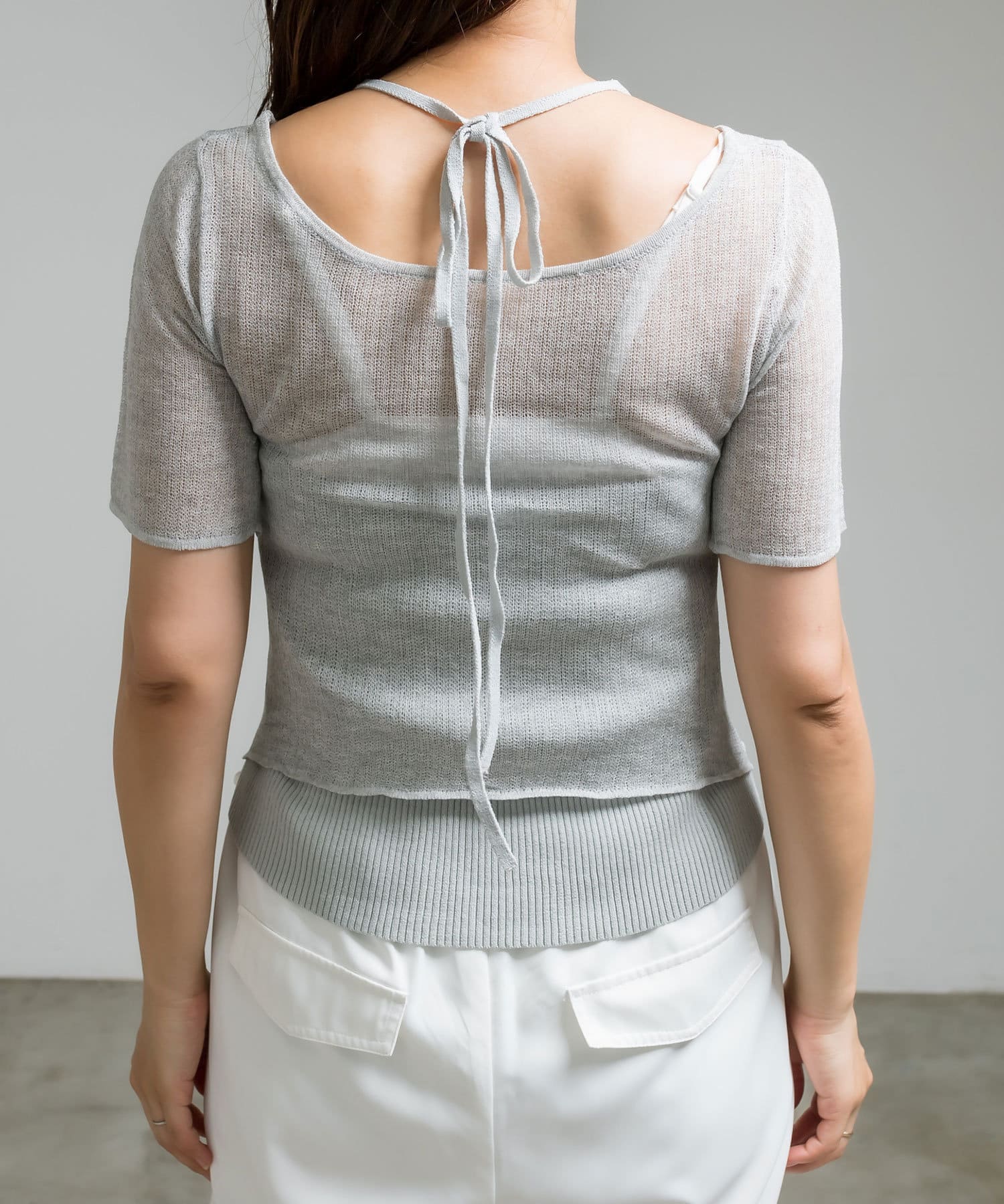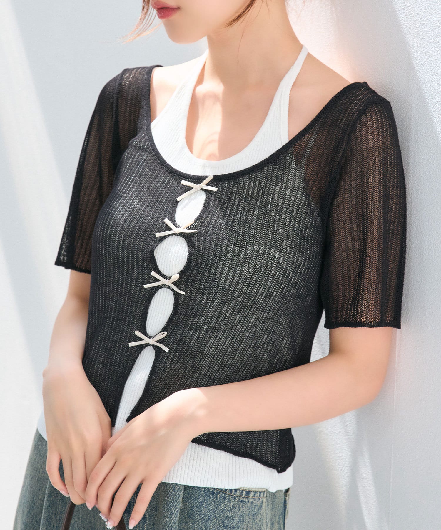 ・ホルターネックが新鮮なデザインで、顔周りを華やかにしてくれます