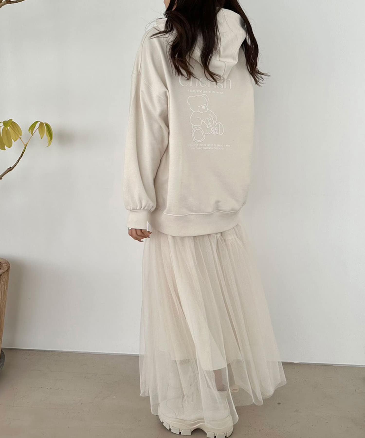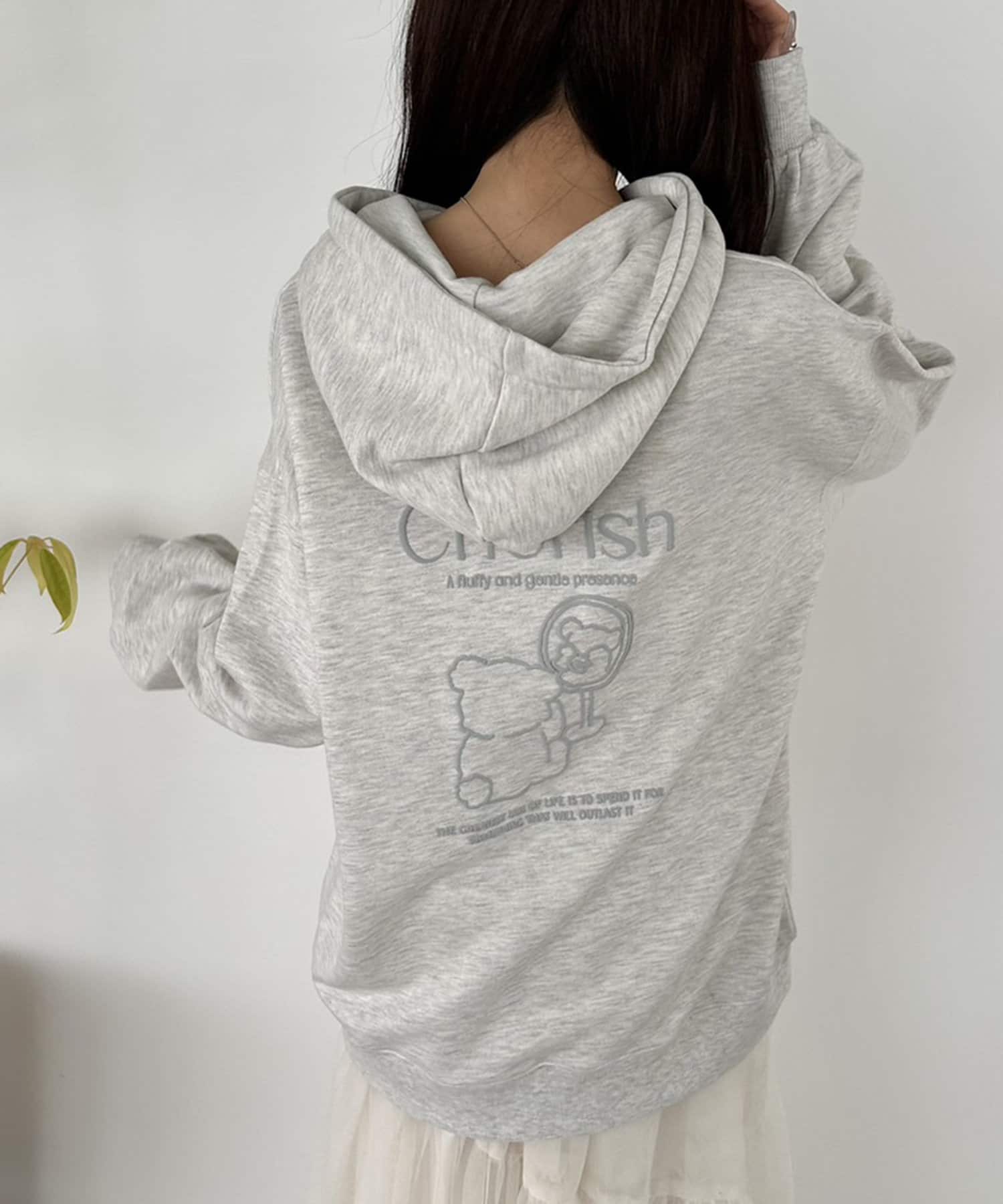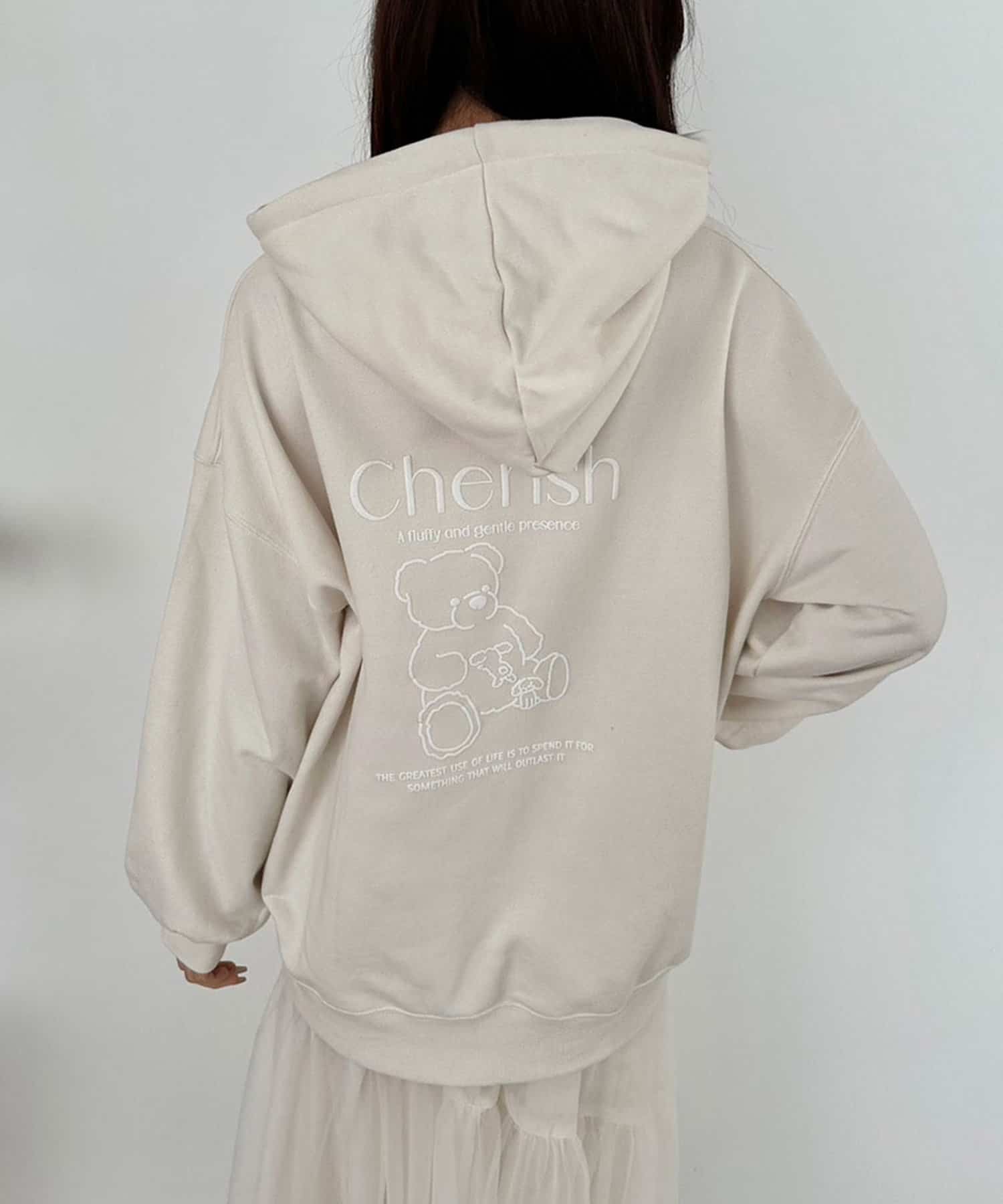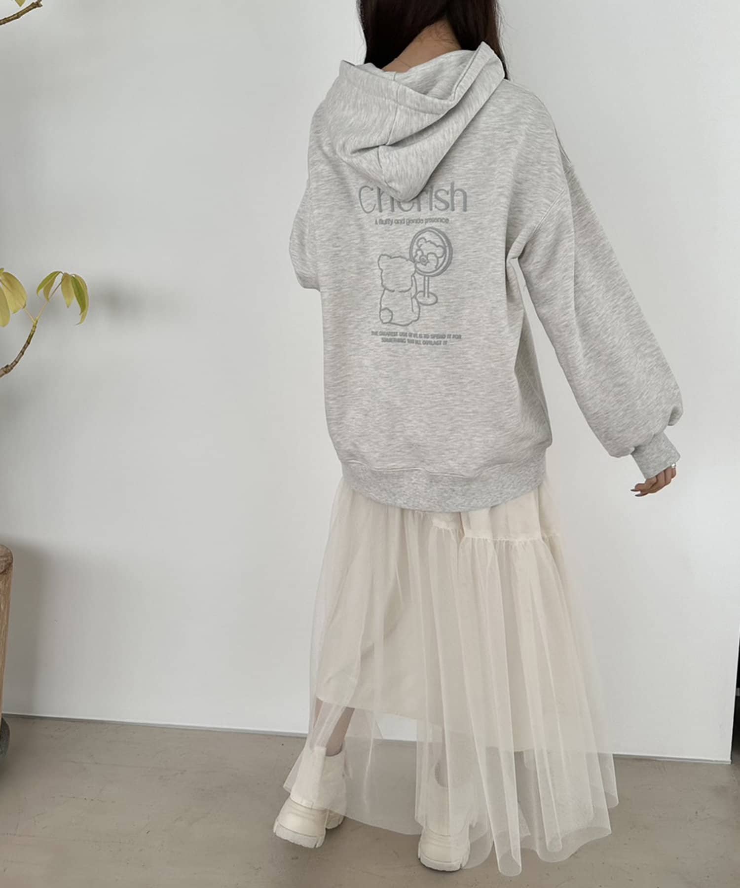 ・バックプリントに可愛らしいクマをプリントしたパーカー。