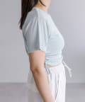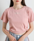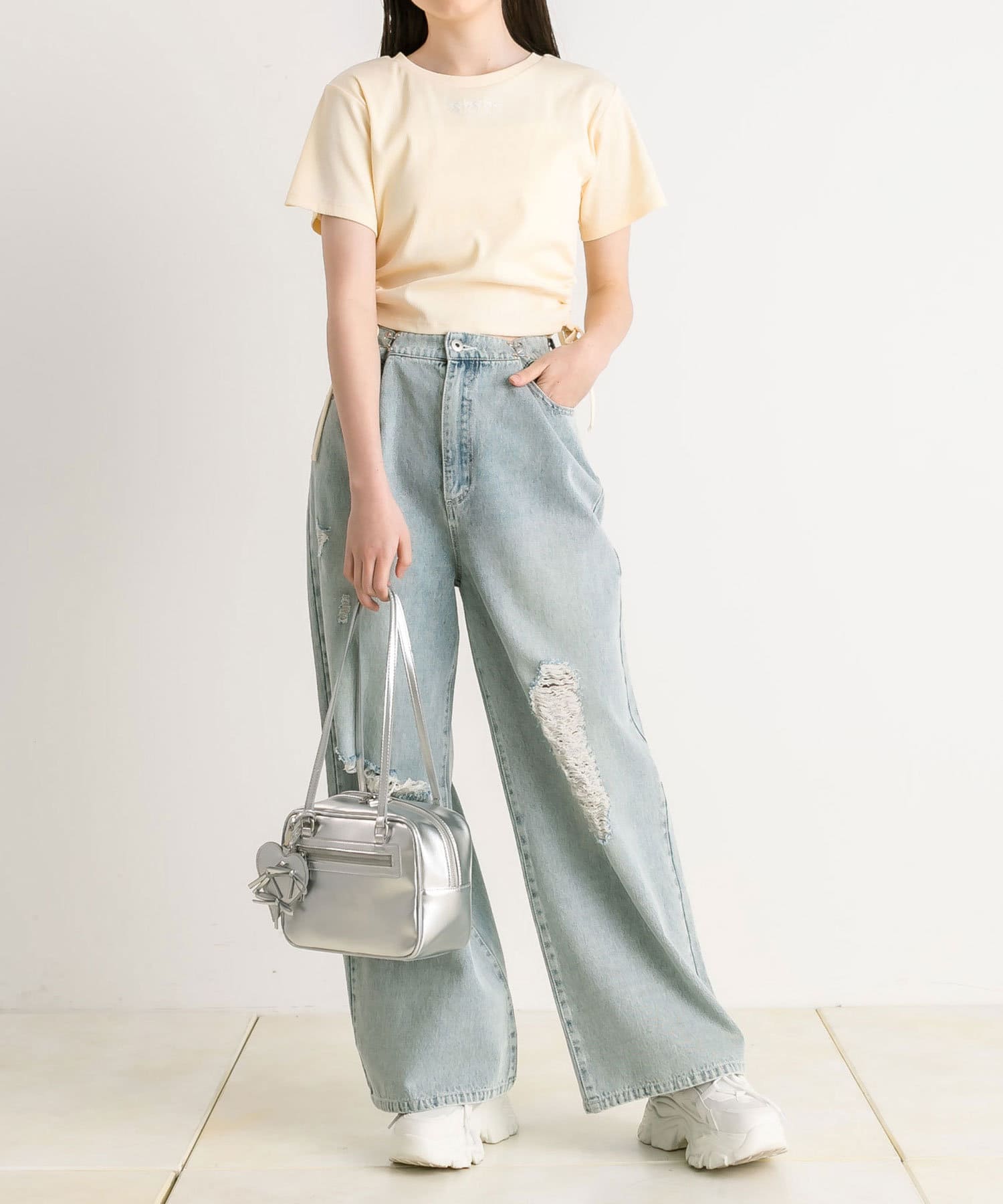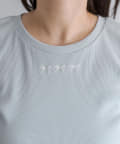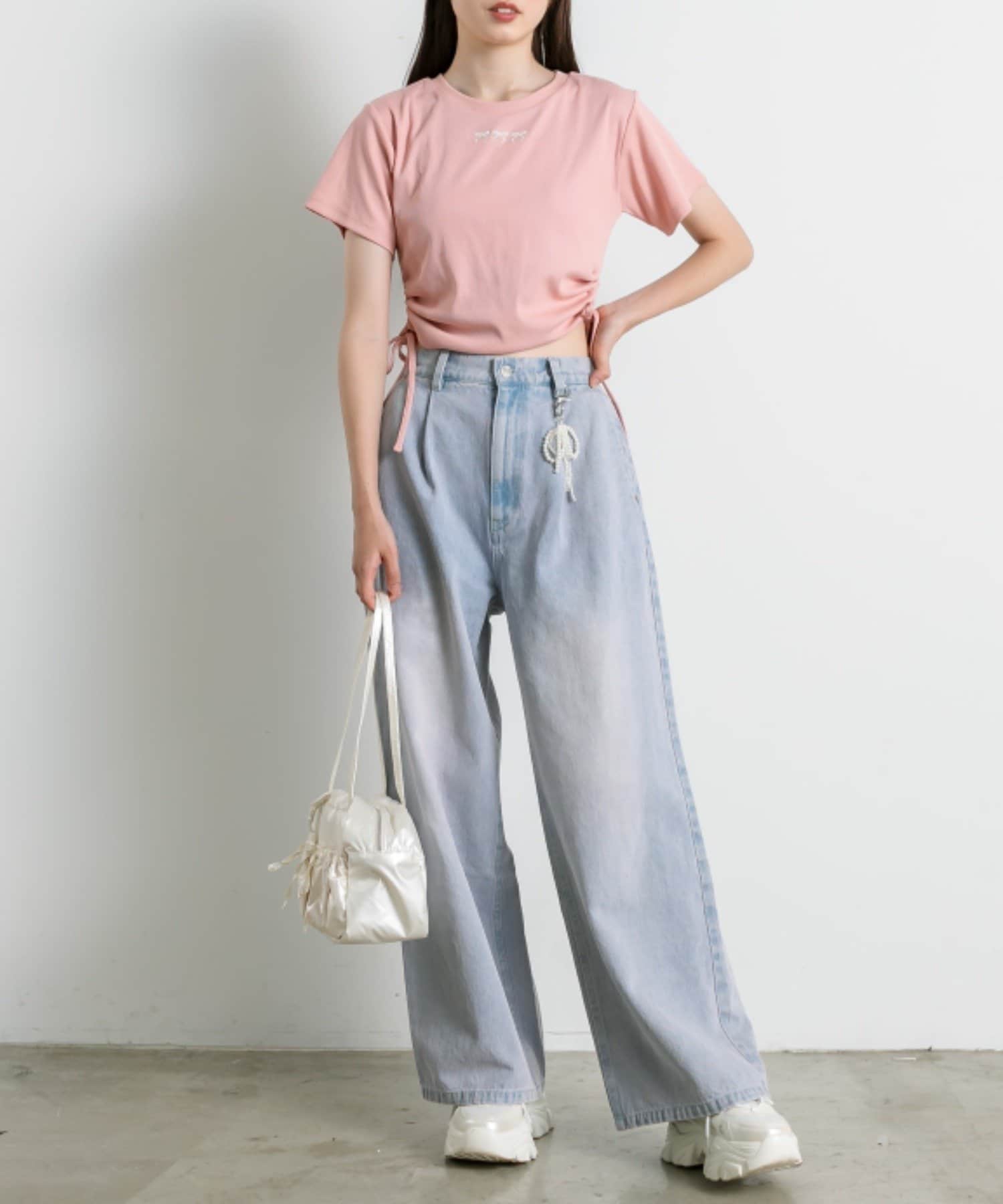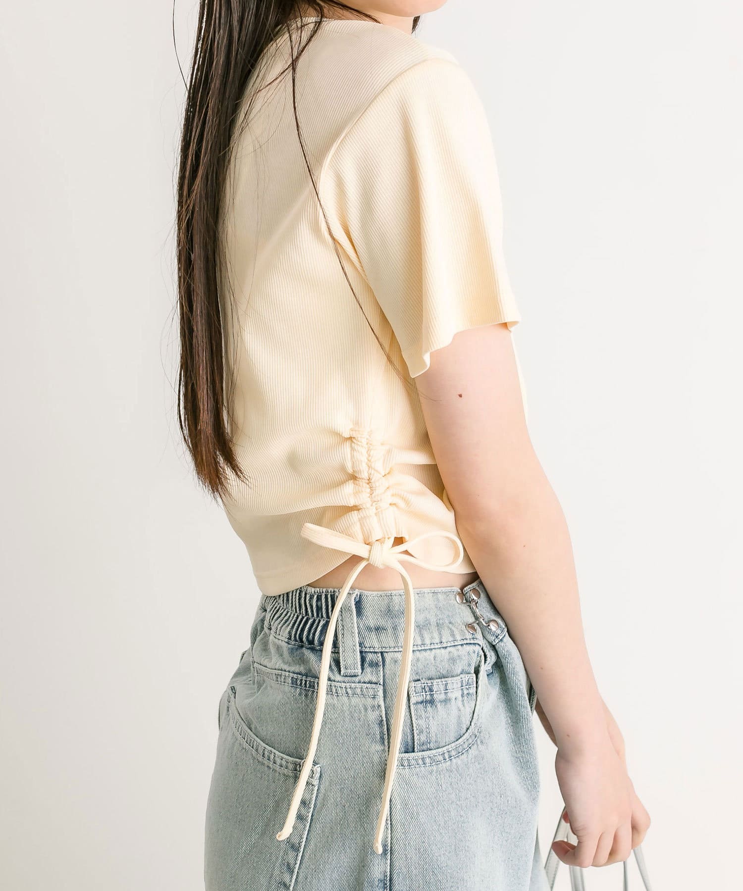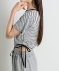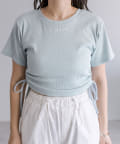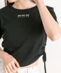 ・リボンが並んだ刺繍がポイントのドロストTシャツ。