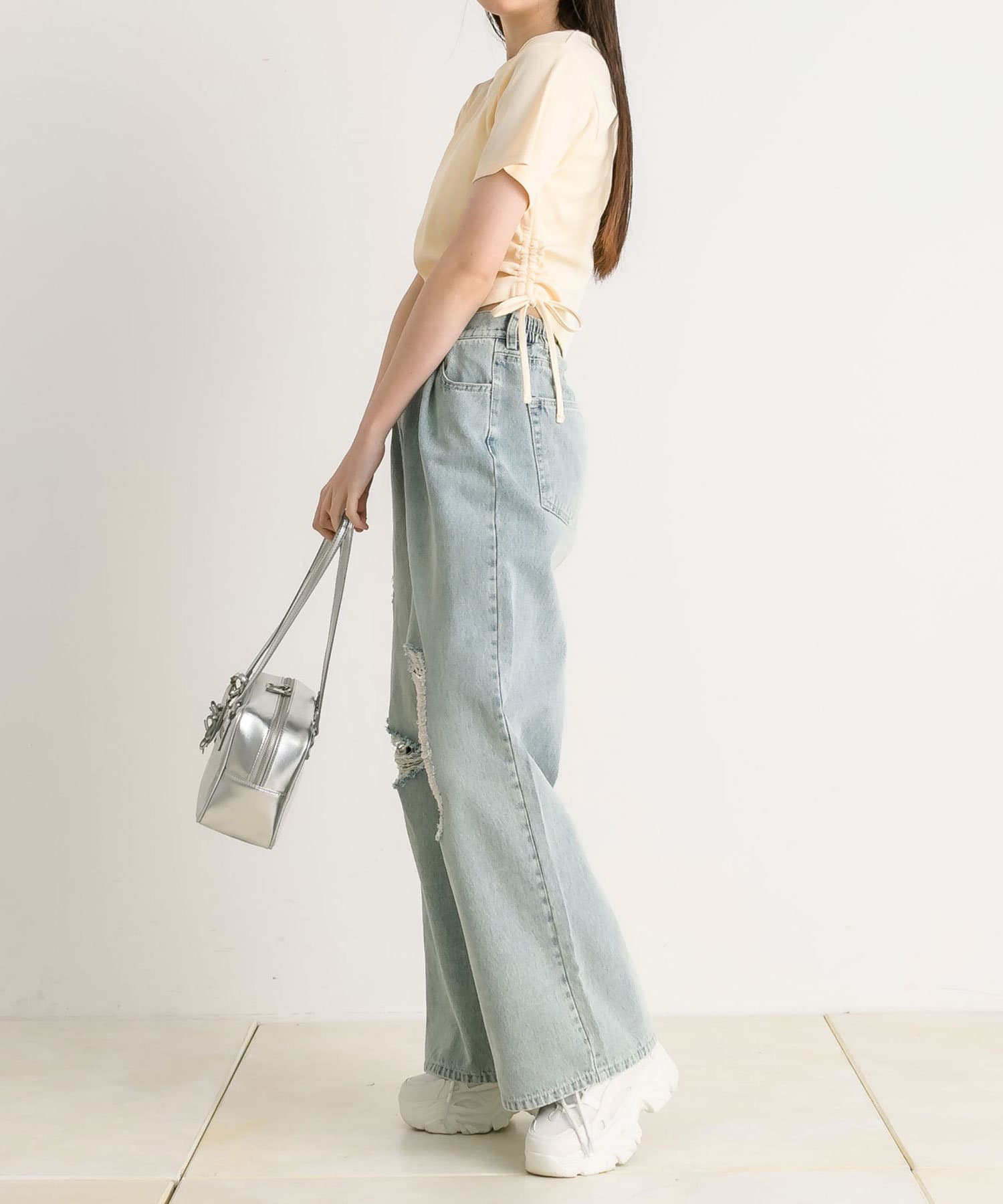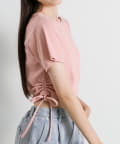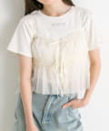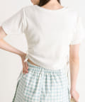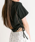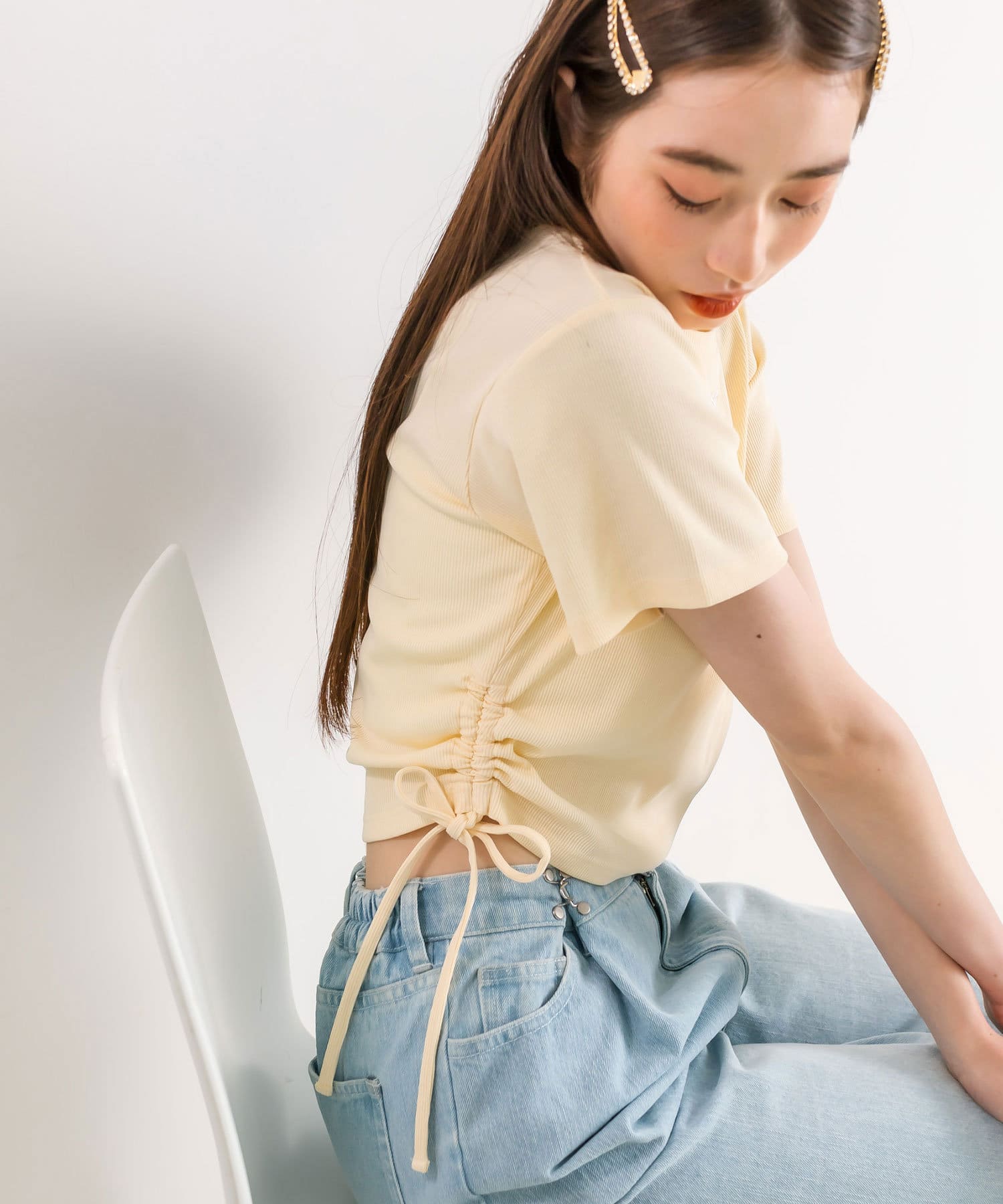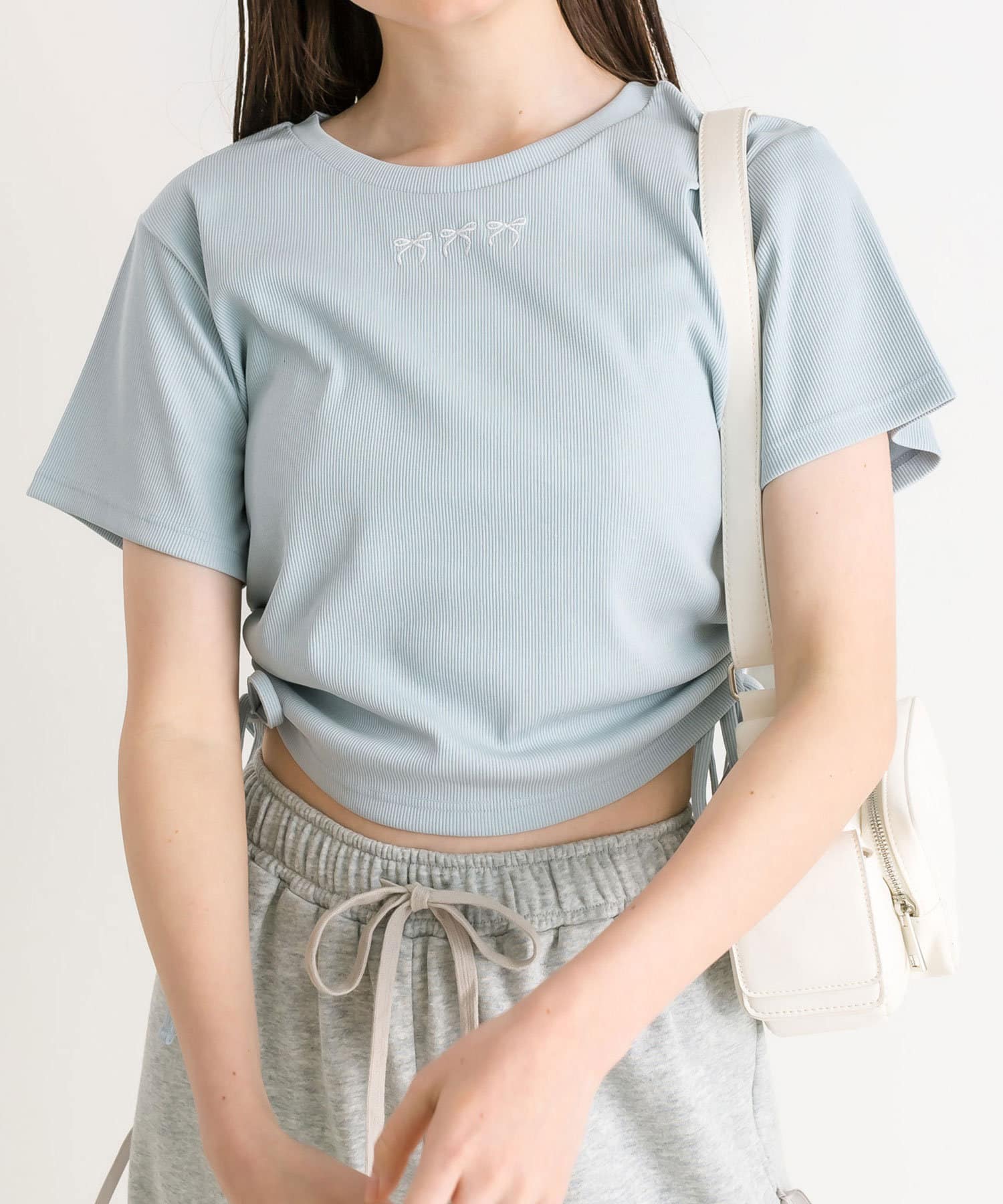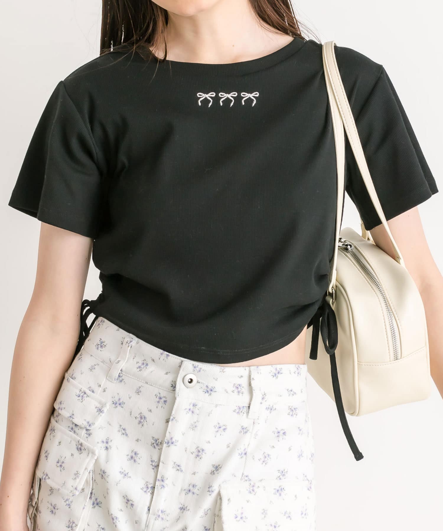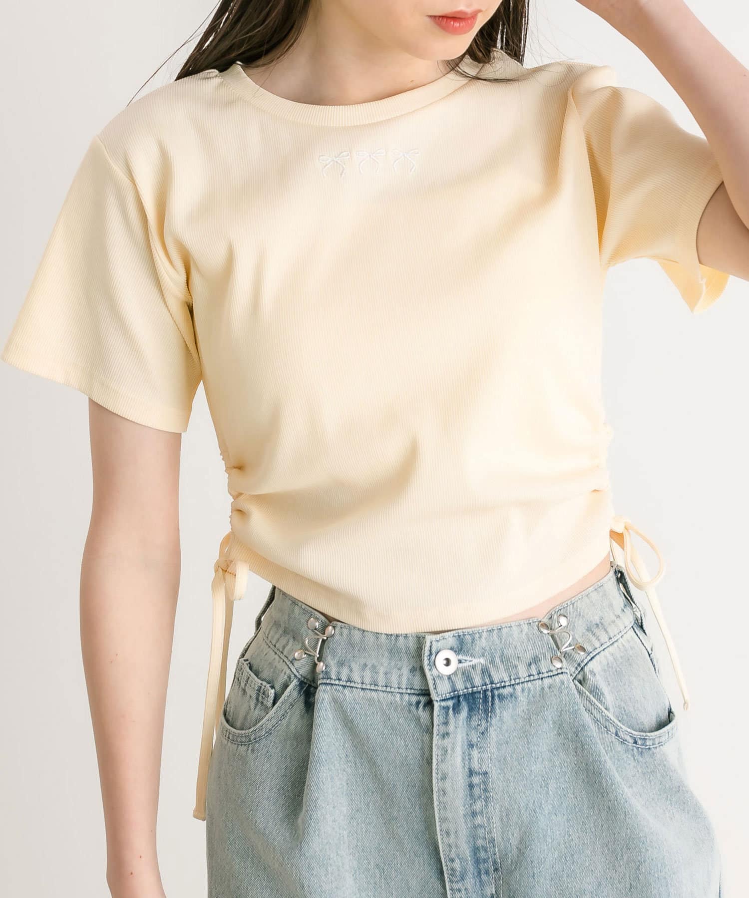 ・リボンが並んだ刺繍がポイントのドロストTシャツ。
