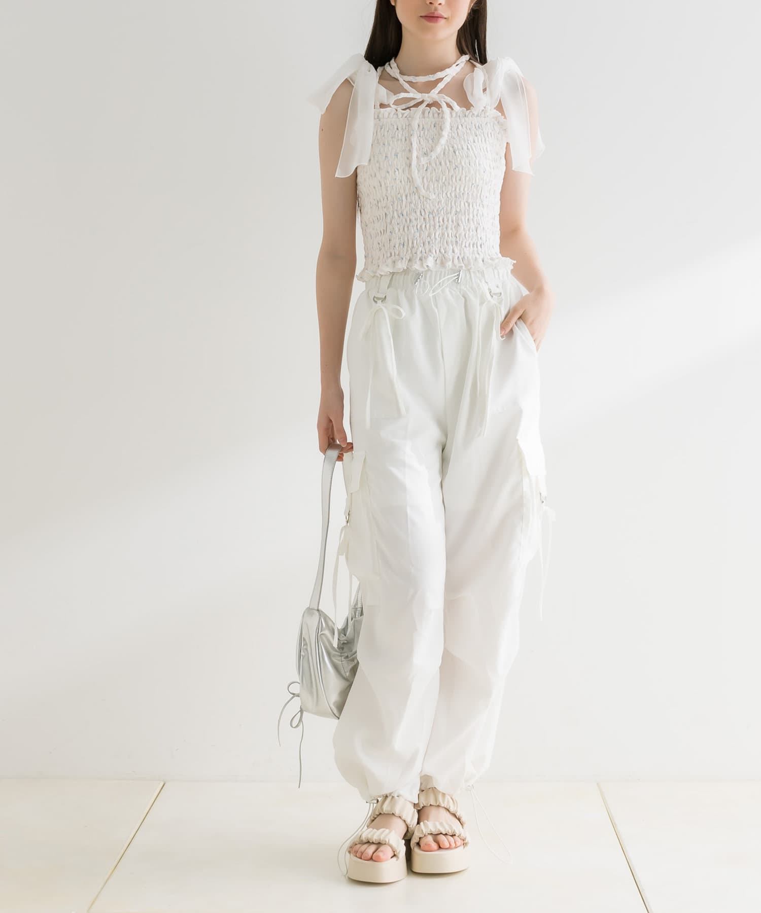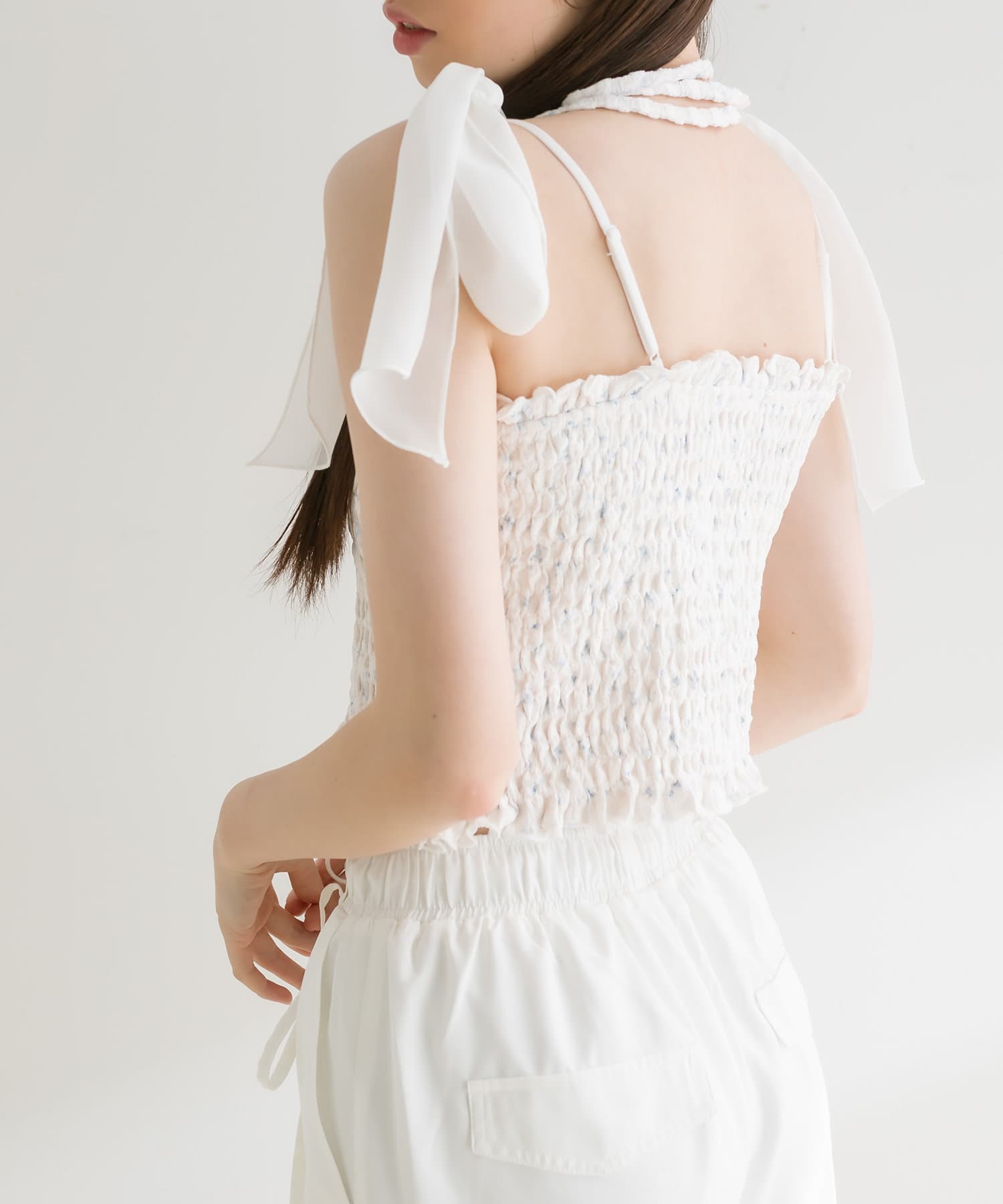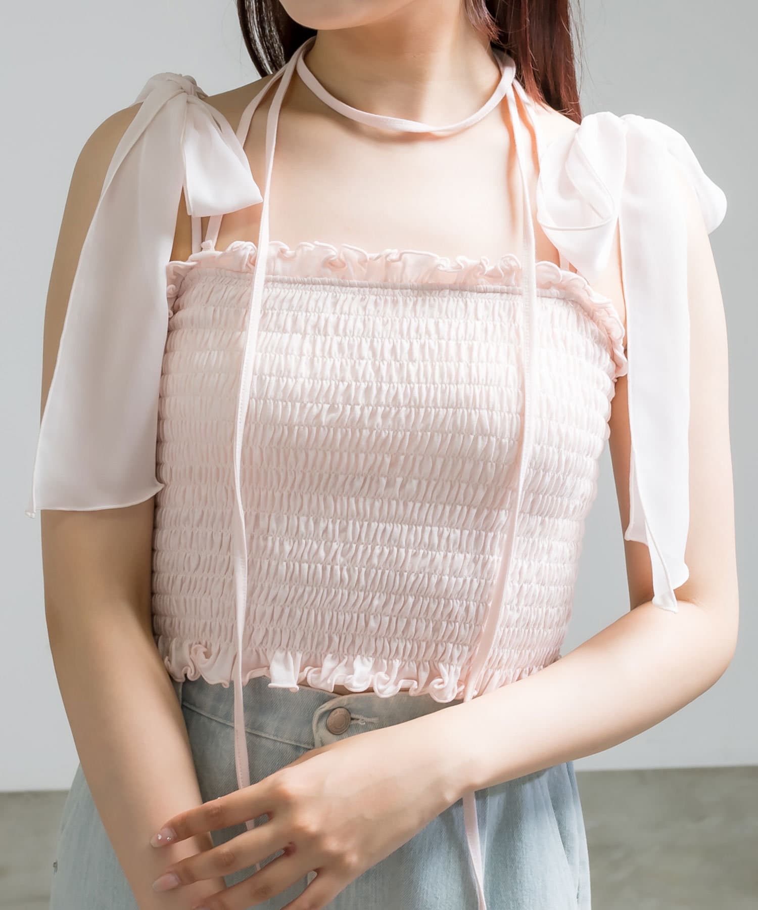 ・肩紐のリボンをつけるとコーデのワンポイントになり、外すとシンプルに着用していただけます。