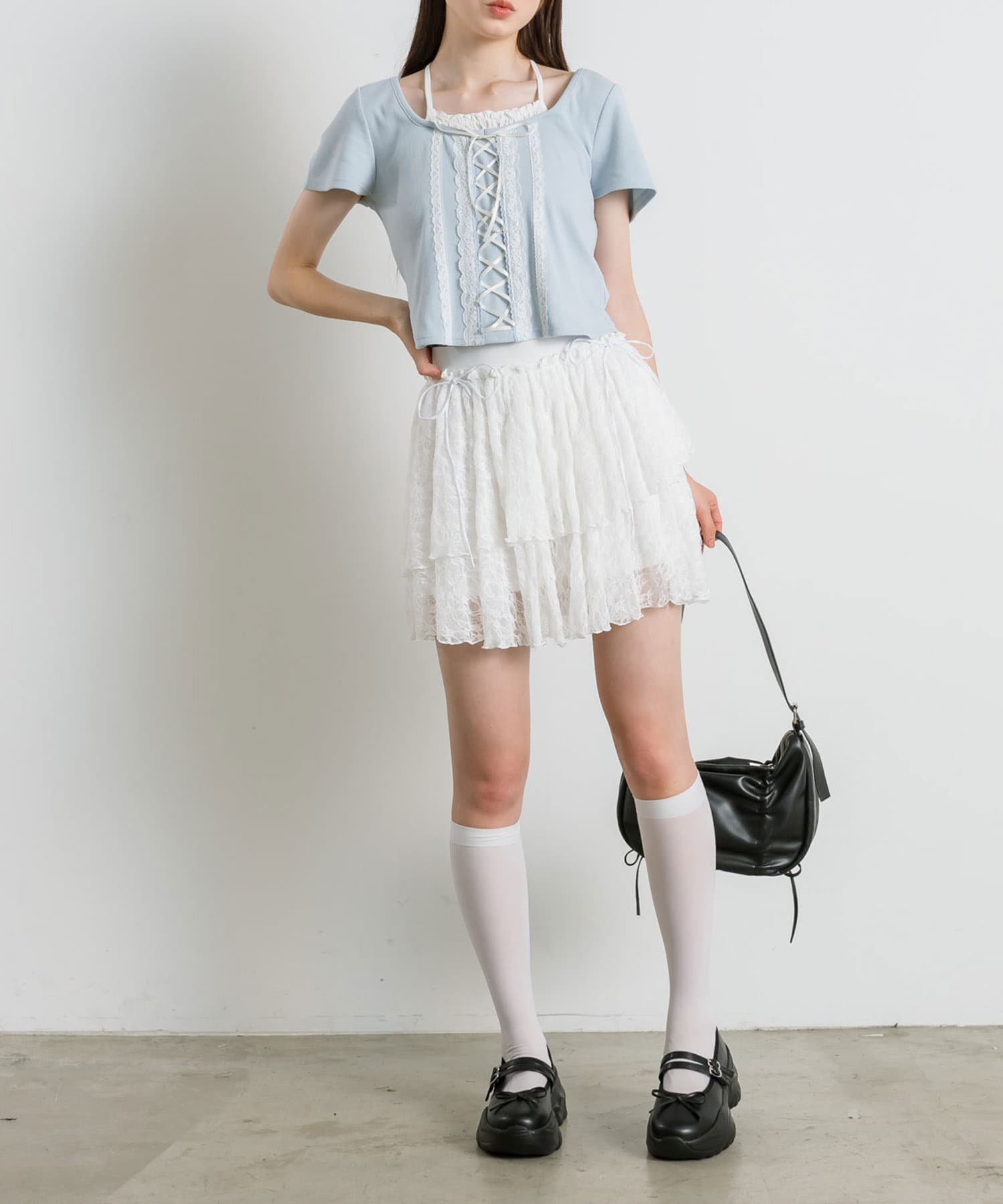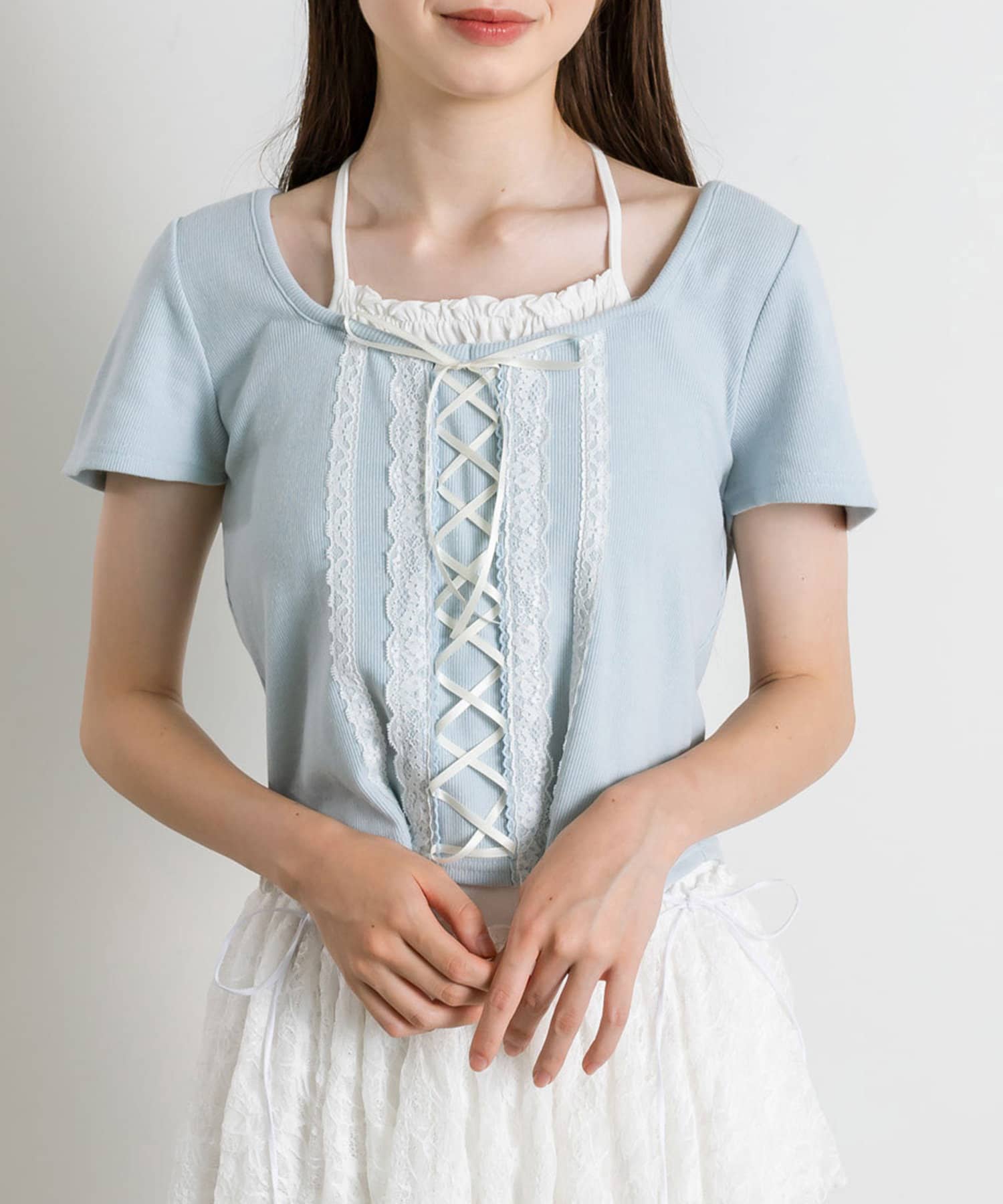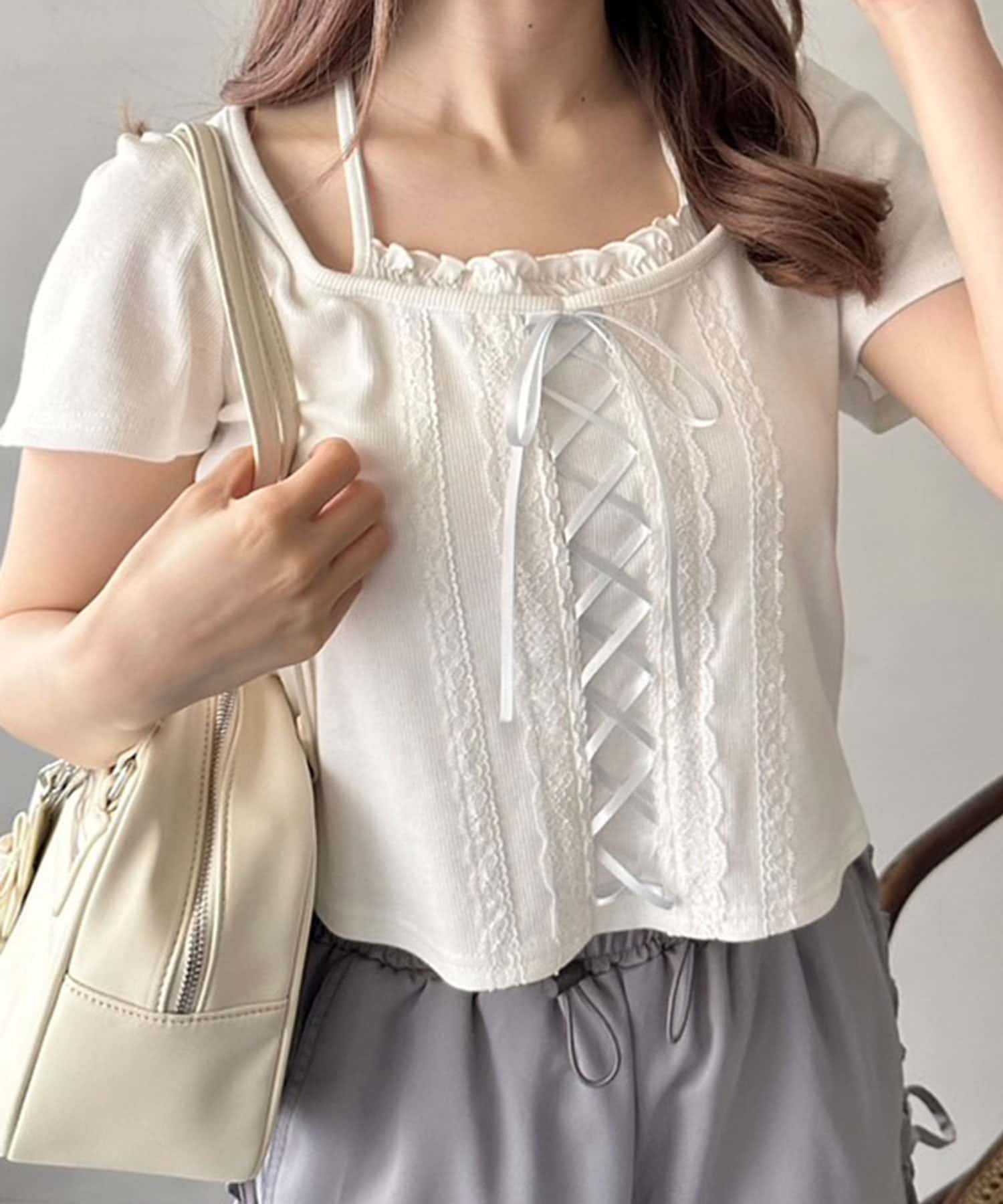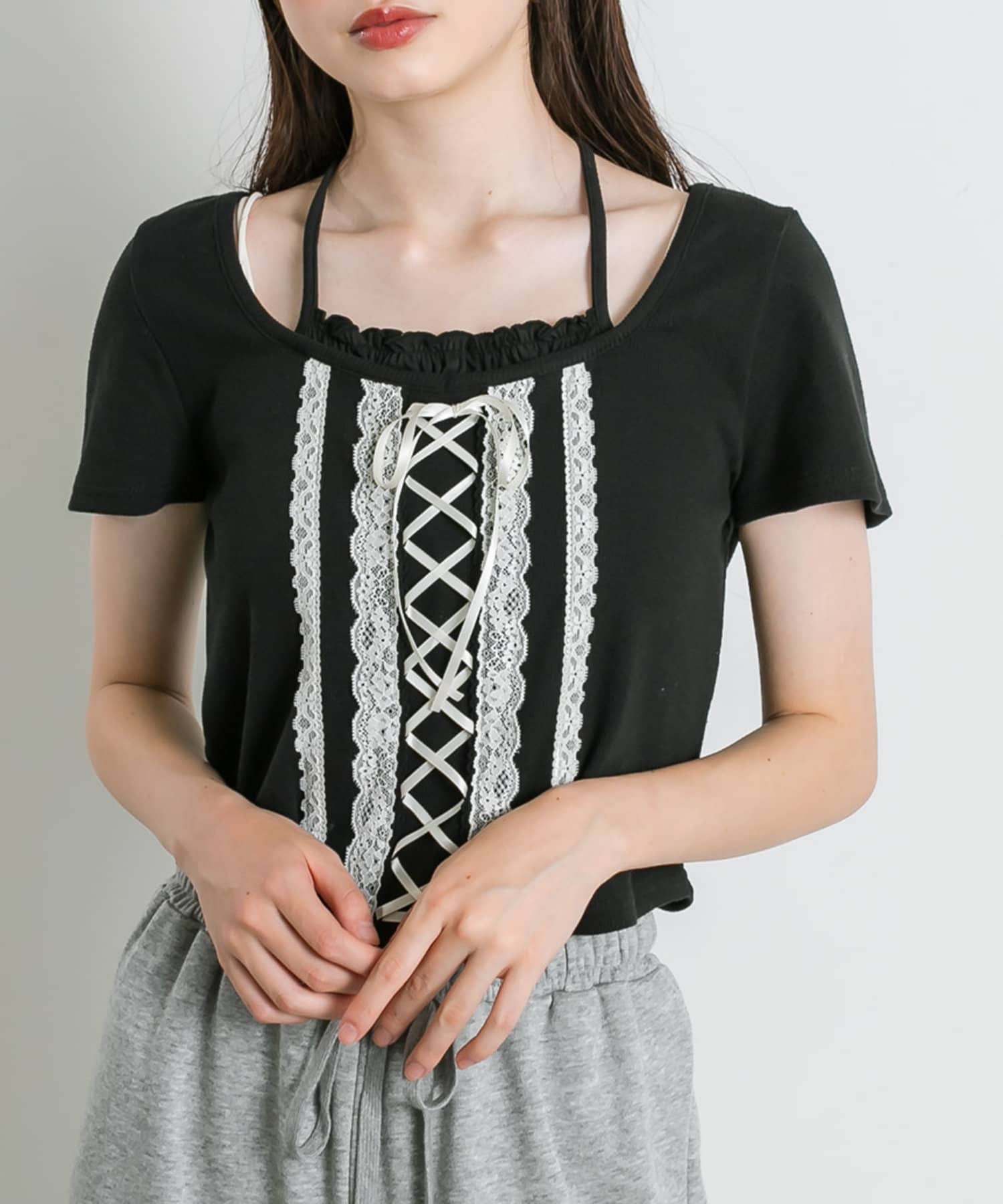 ・フロントの細やかなレースアップデザインがポイントのトップス。