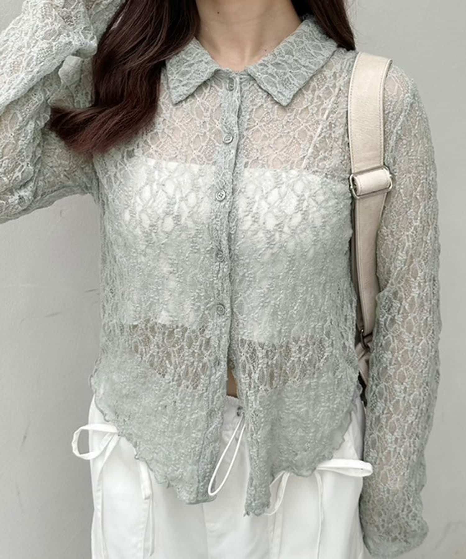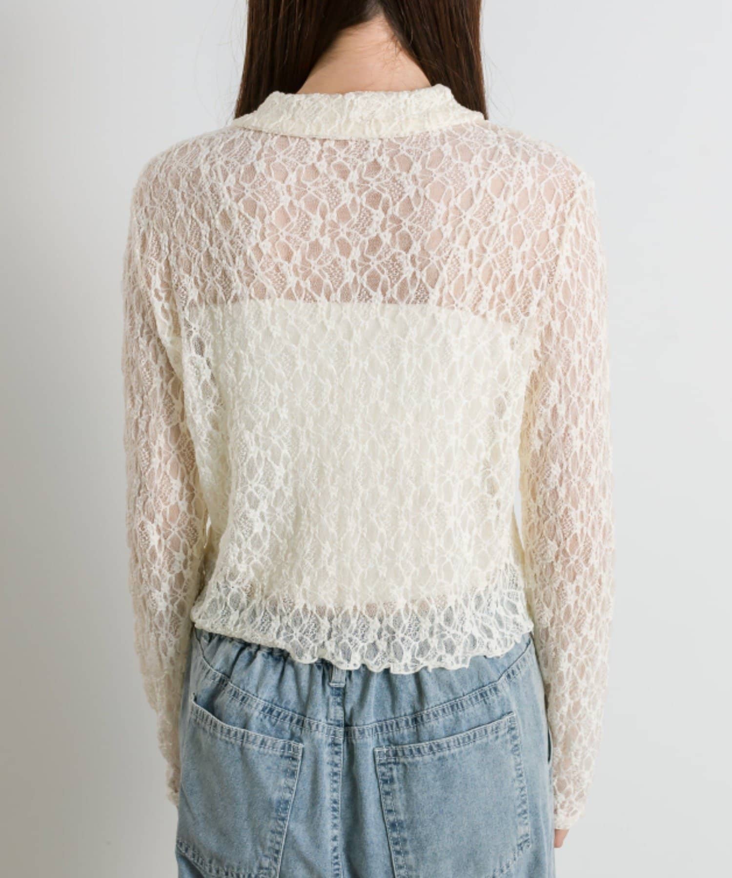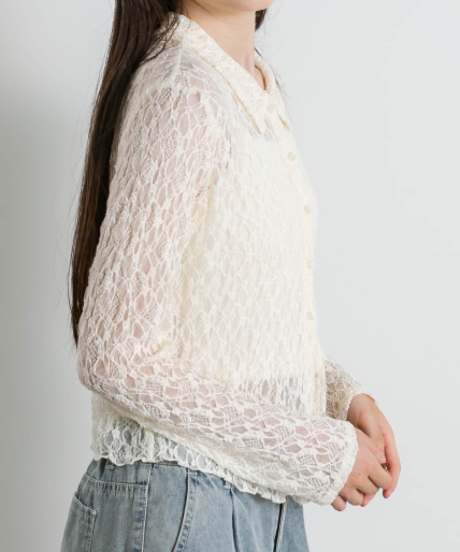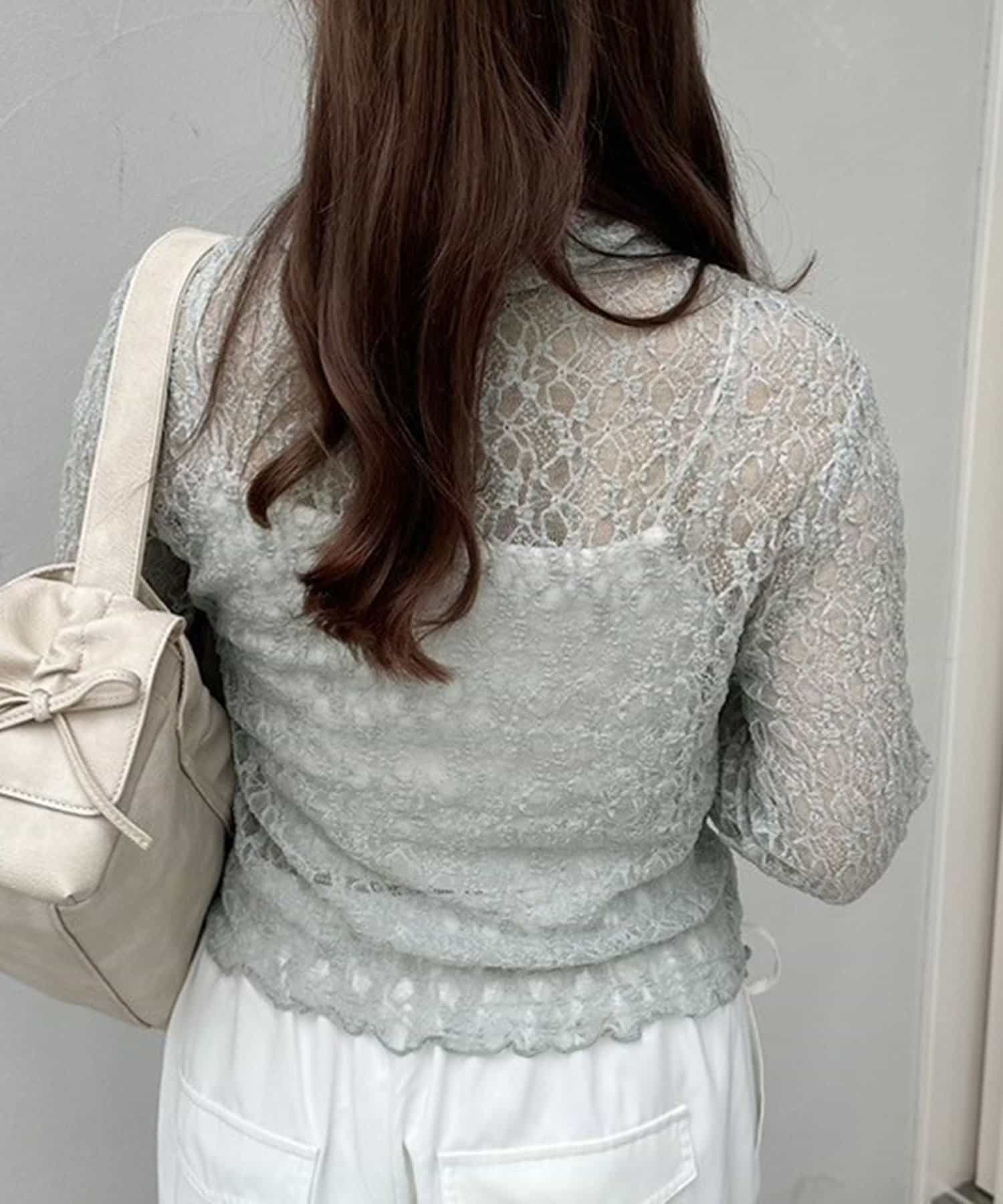 ・透け感のある総レースで程よい肌見せが叶うトップス。