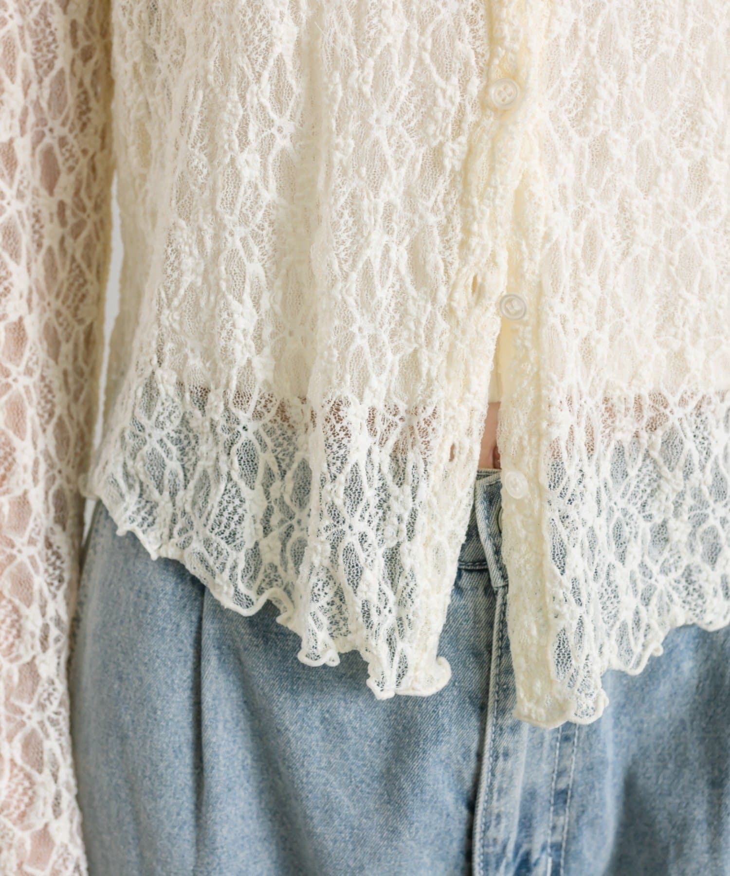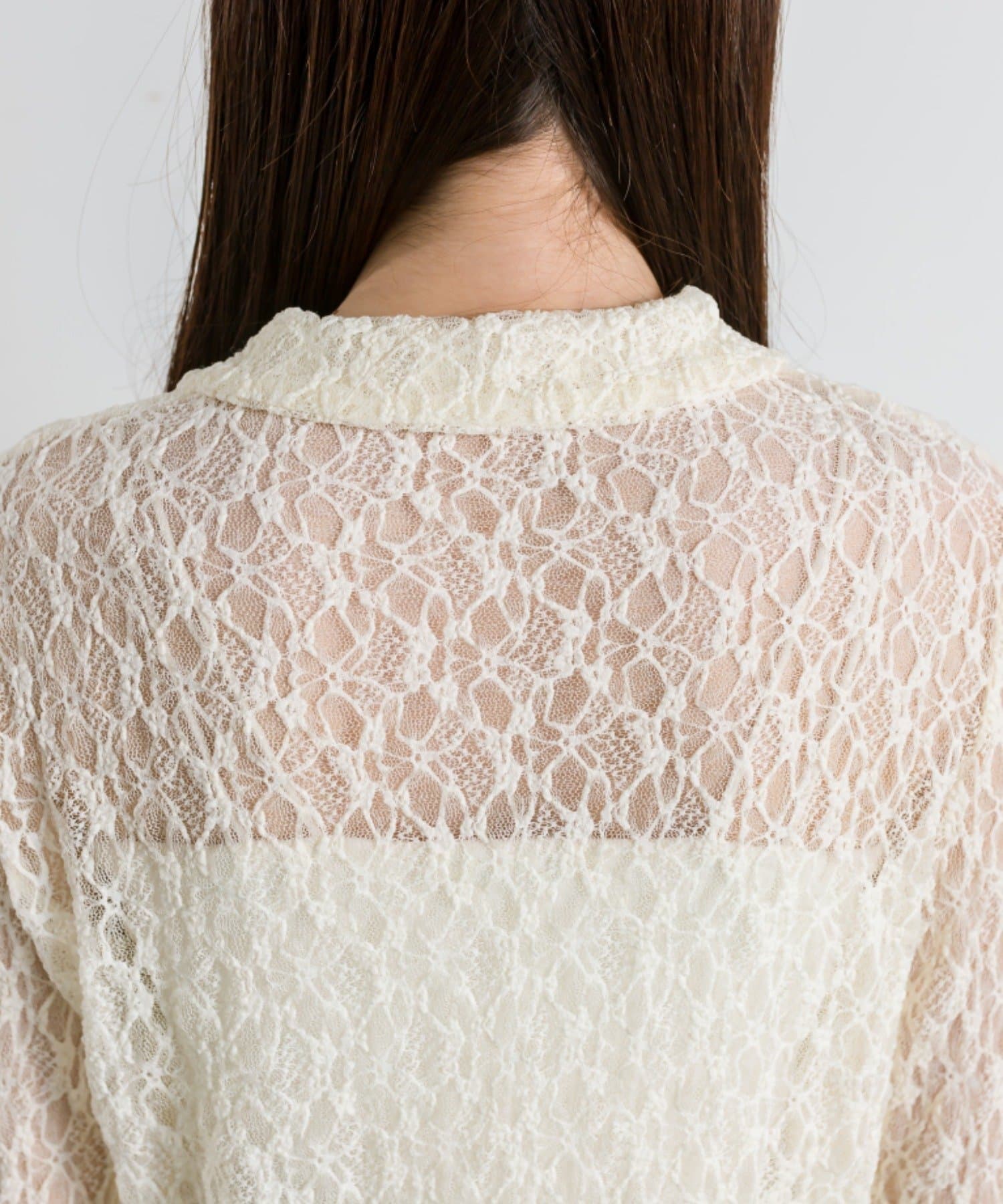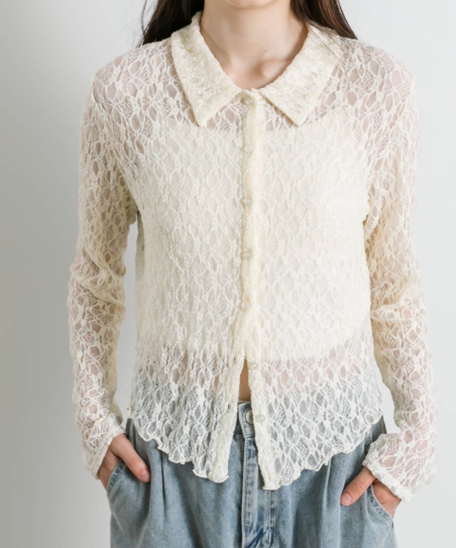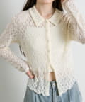 ・透け感のある総レースで程よい肌見せが叶うトップス。