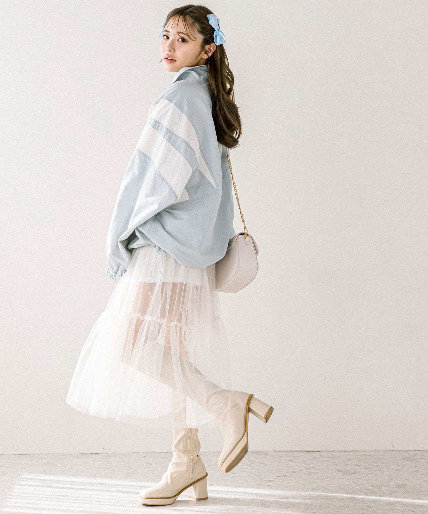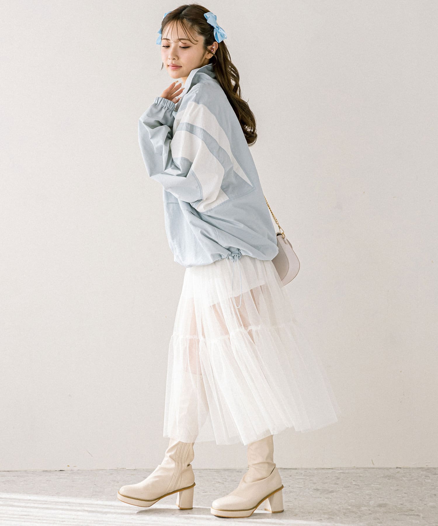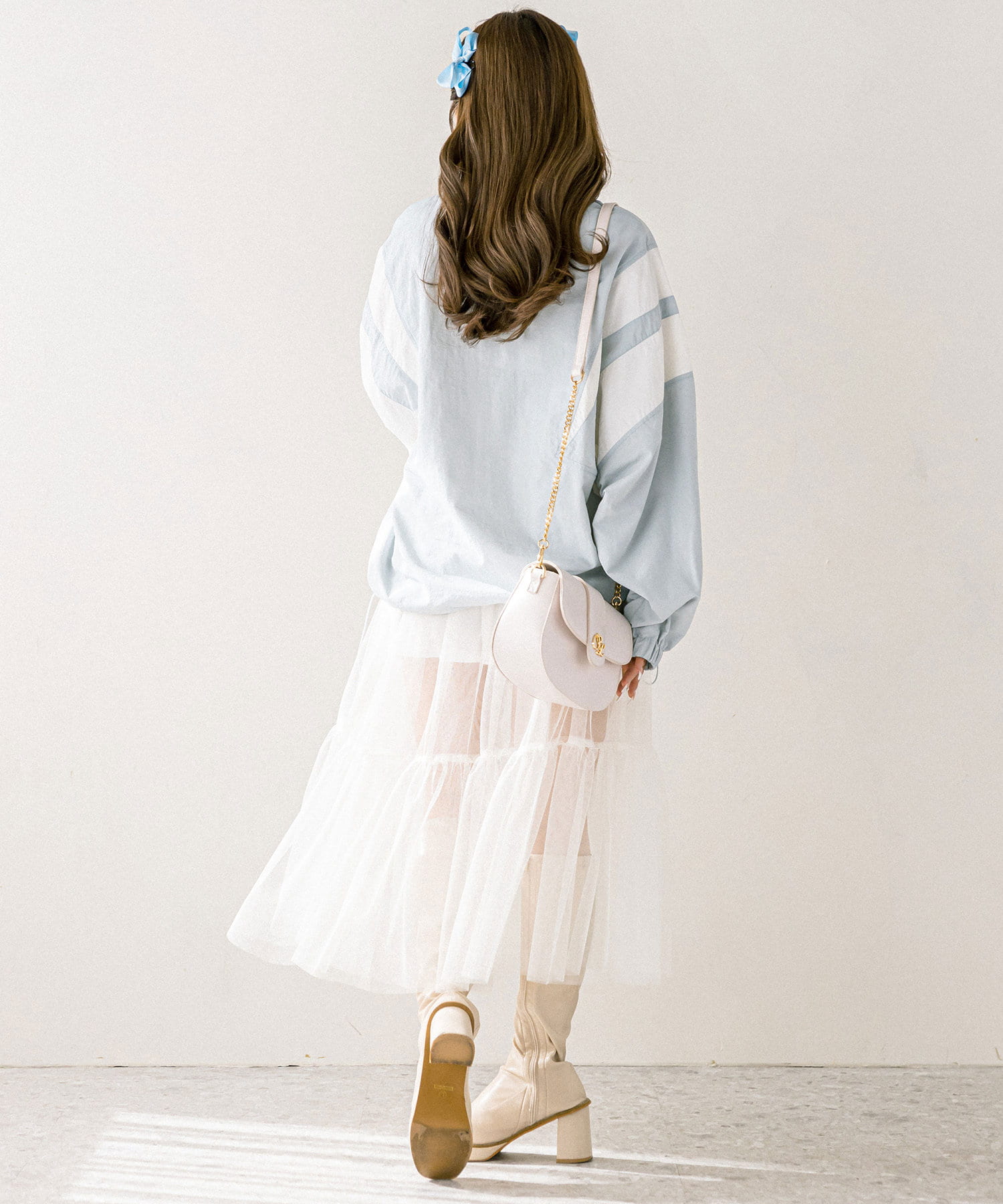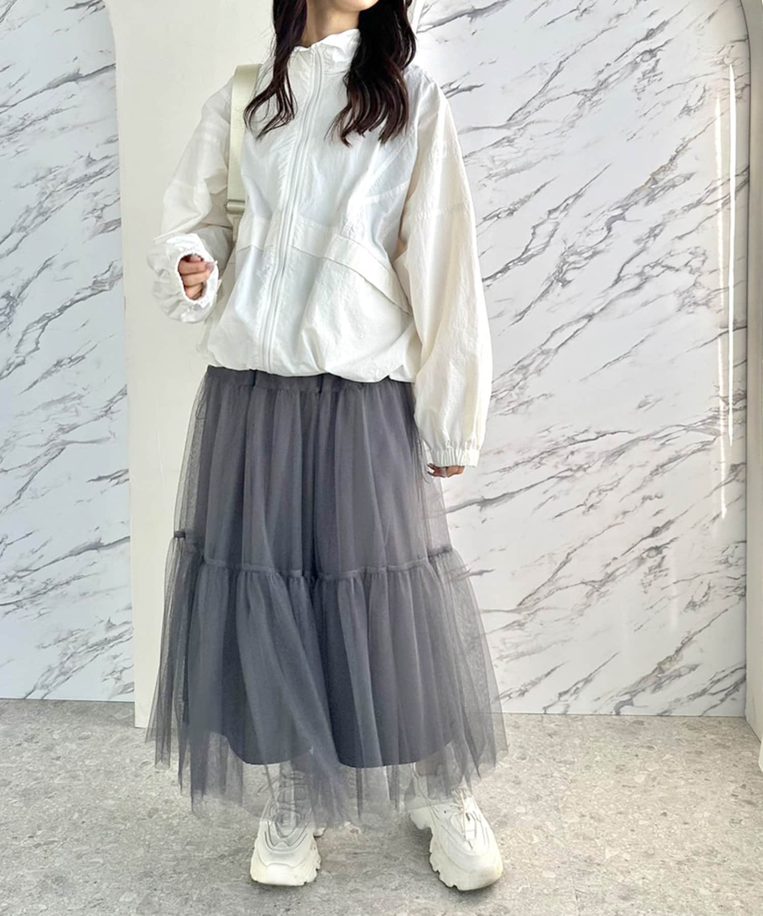 ・ボトムスは透け感のあるチュールスカートで合わせるのが