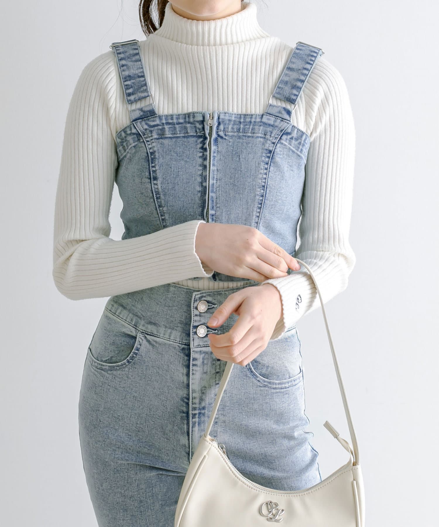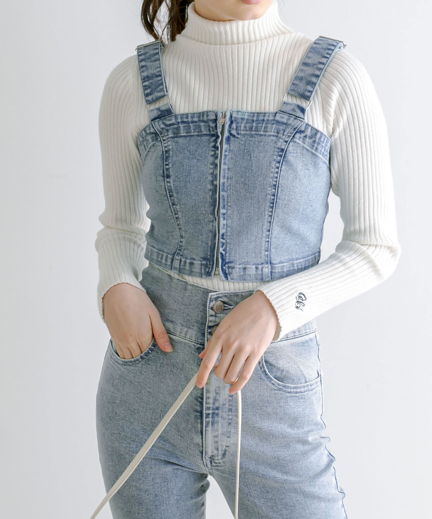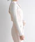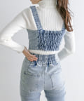 ・肌寒い春先はリブニットのインナーのうえからビスチェを重ねても。