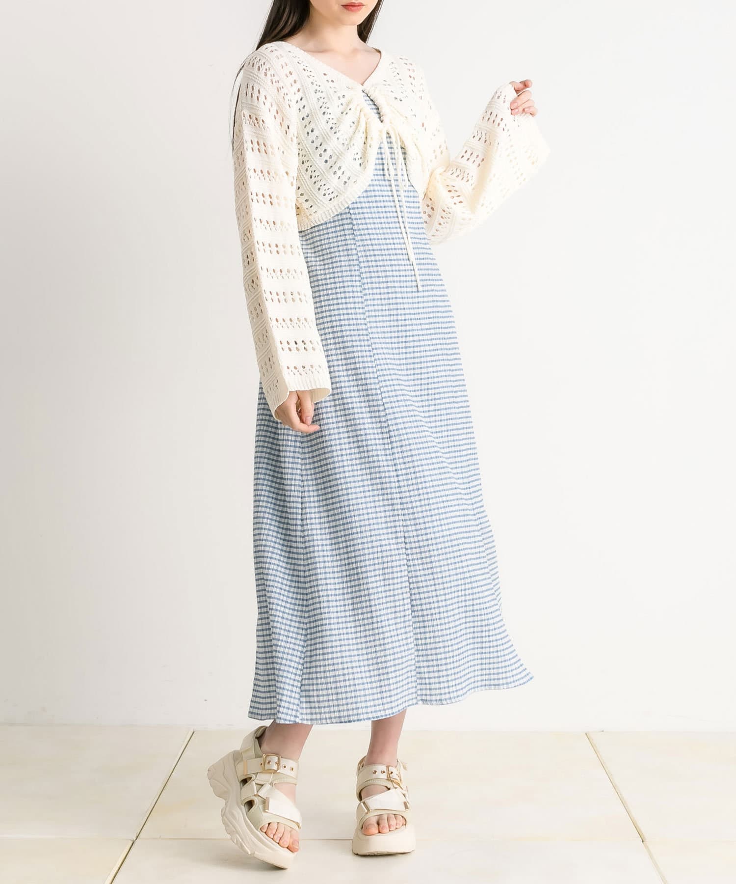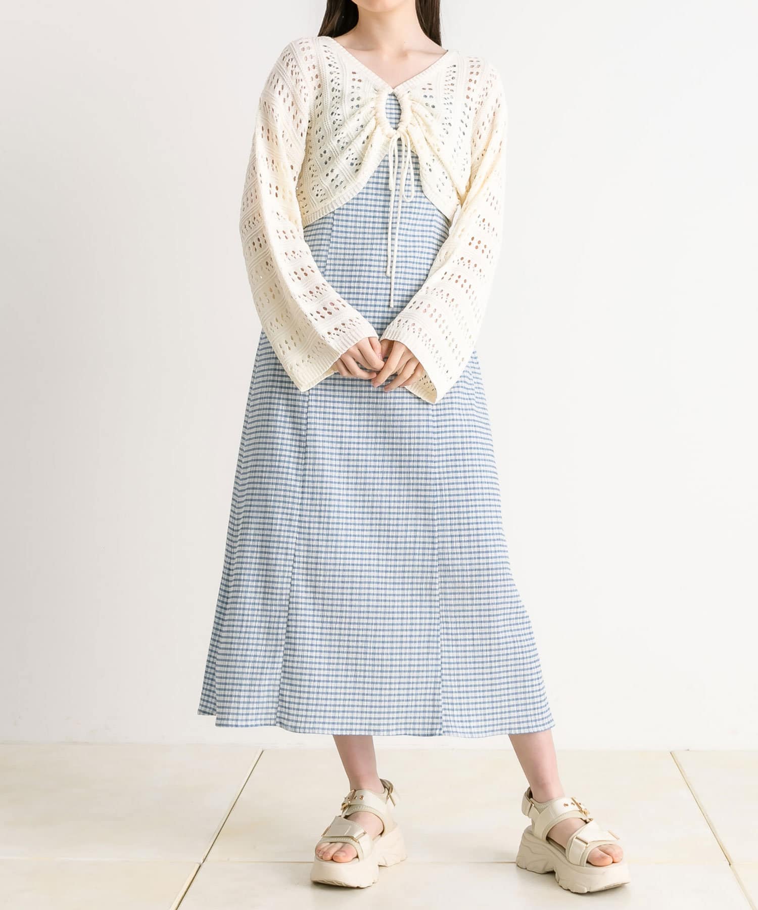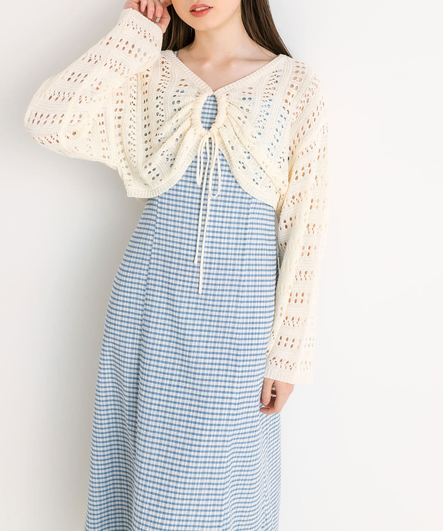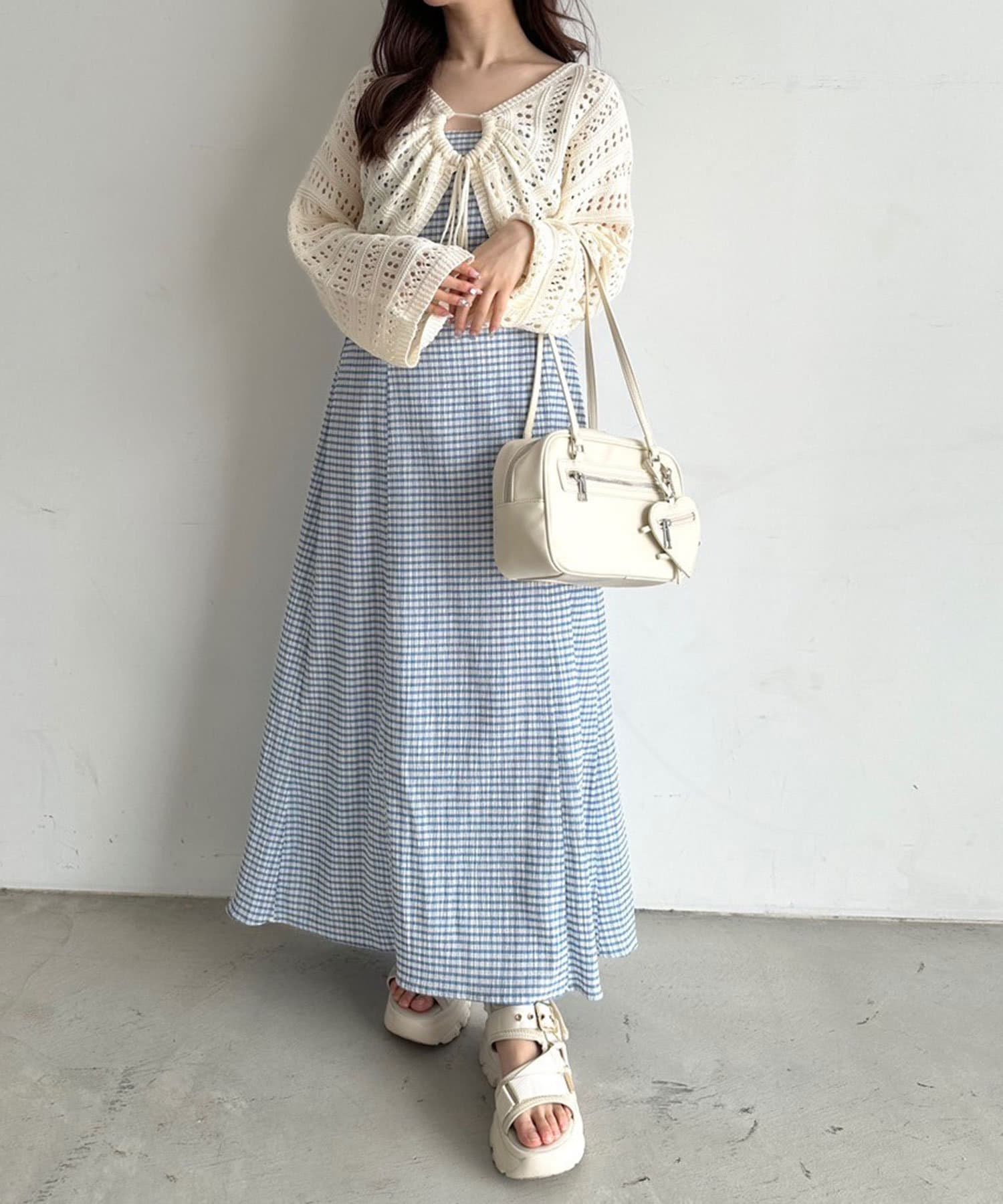・程よい抜け感のメッシュニットと、着まわしが効くキャミワンピのセット。
