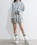 ・キャップやロゴスウェットと合わせたスポーティな着こなしも可愛らしい印象に。
