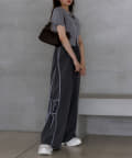 ・キャップやロゴスウェットと合わせたスポーティな着こなしも可愛らしい印象に。