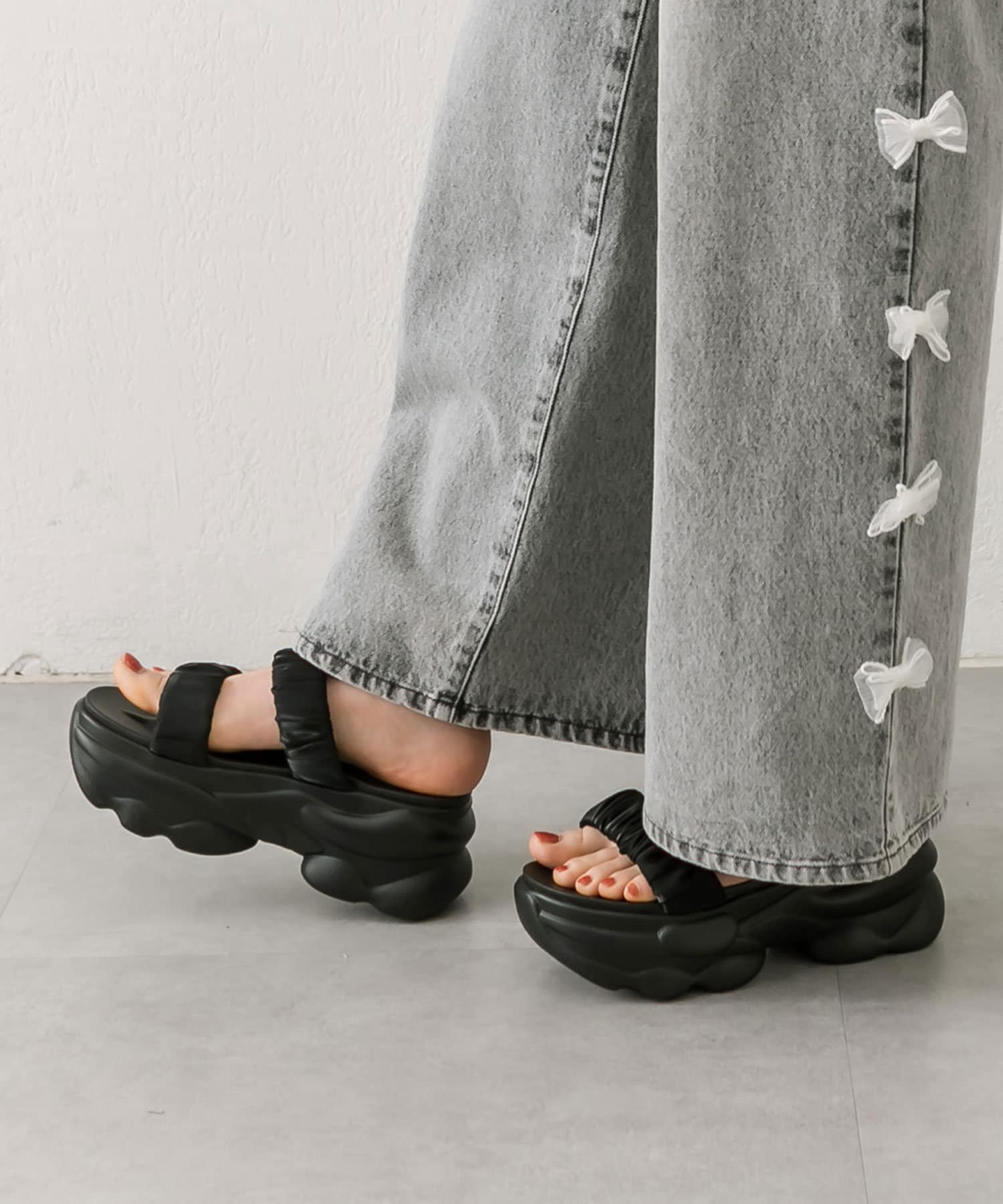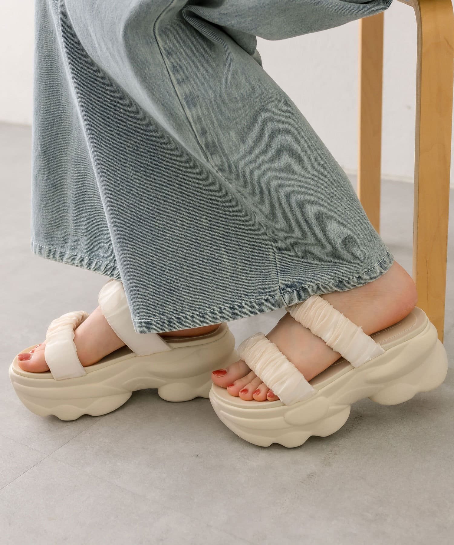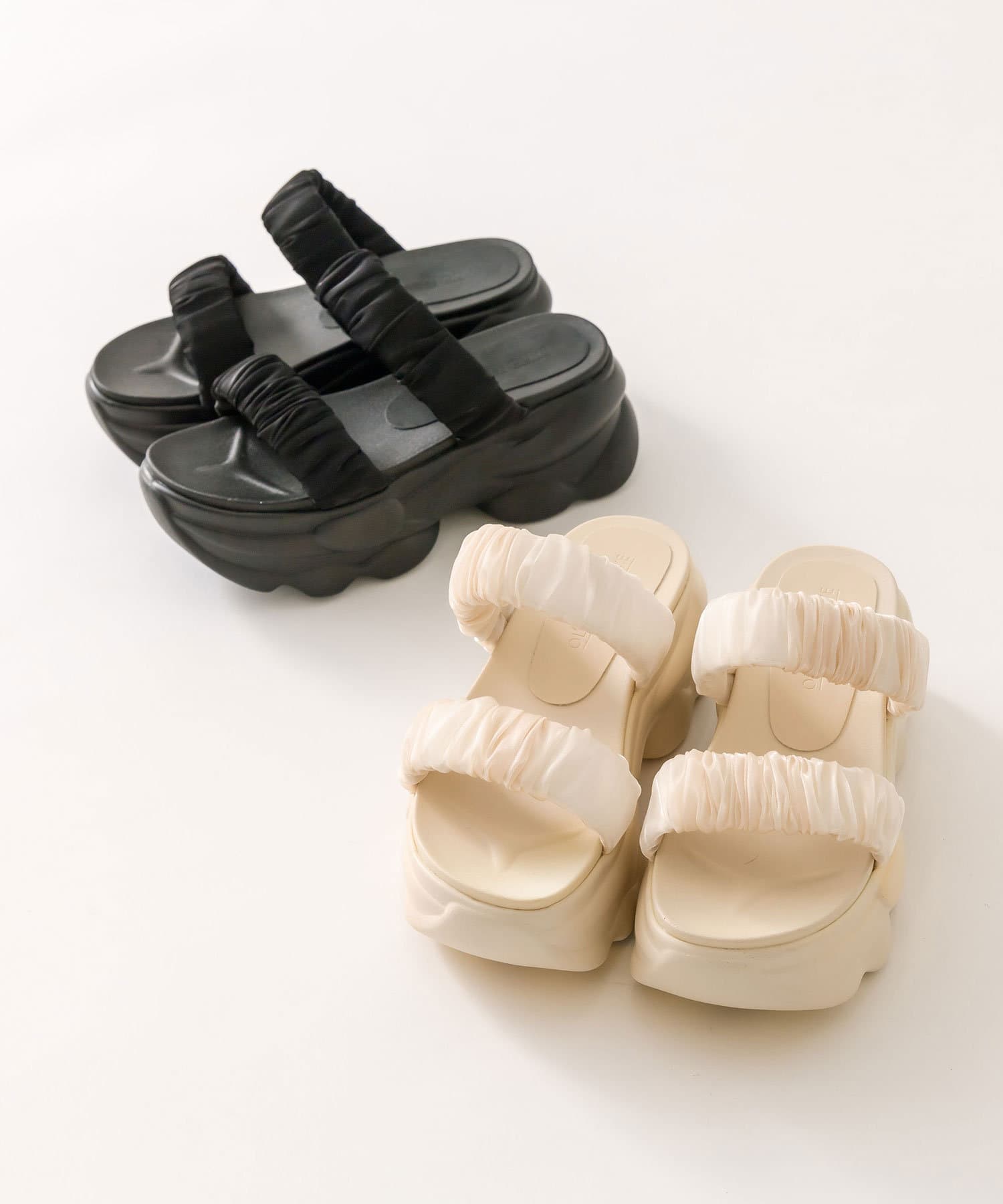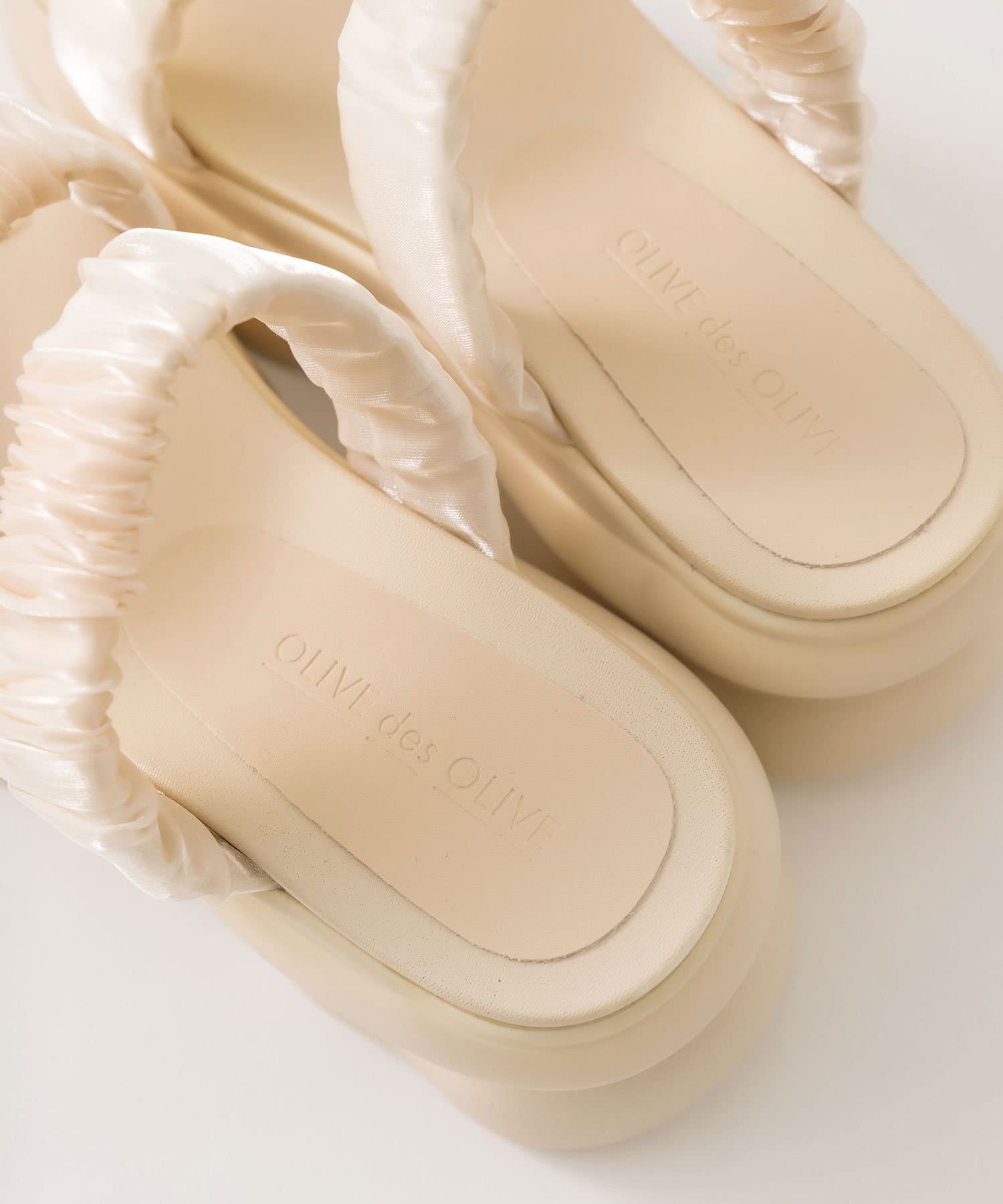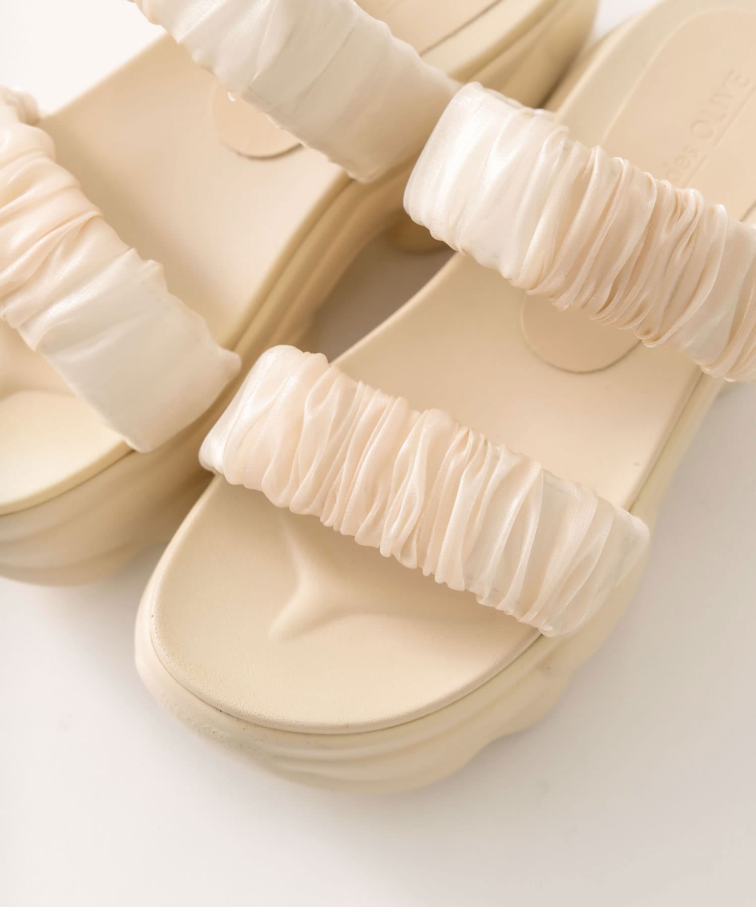 ・ギャザーを寄せたデザインがかわいいサンダル。