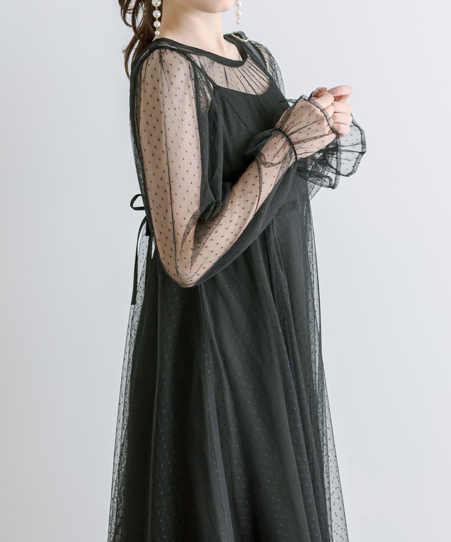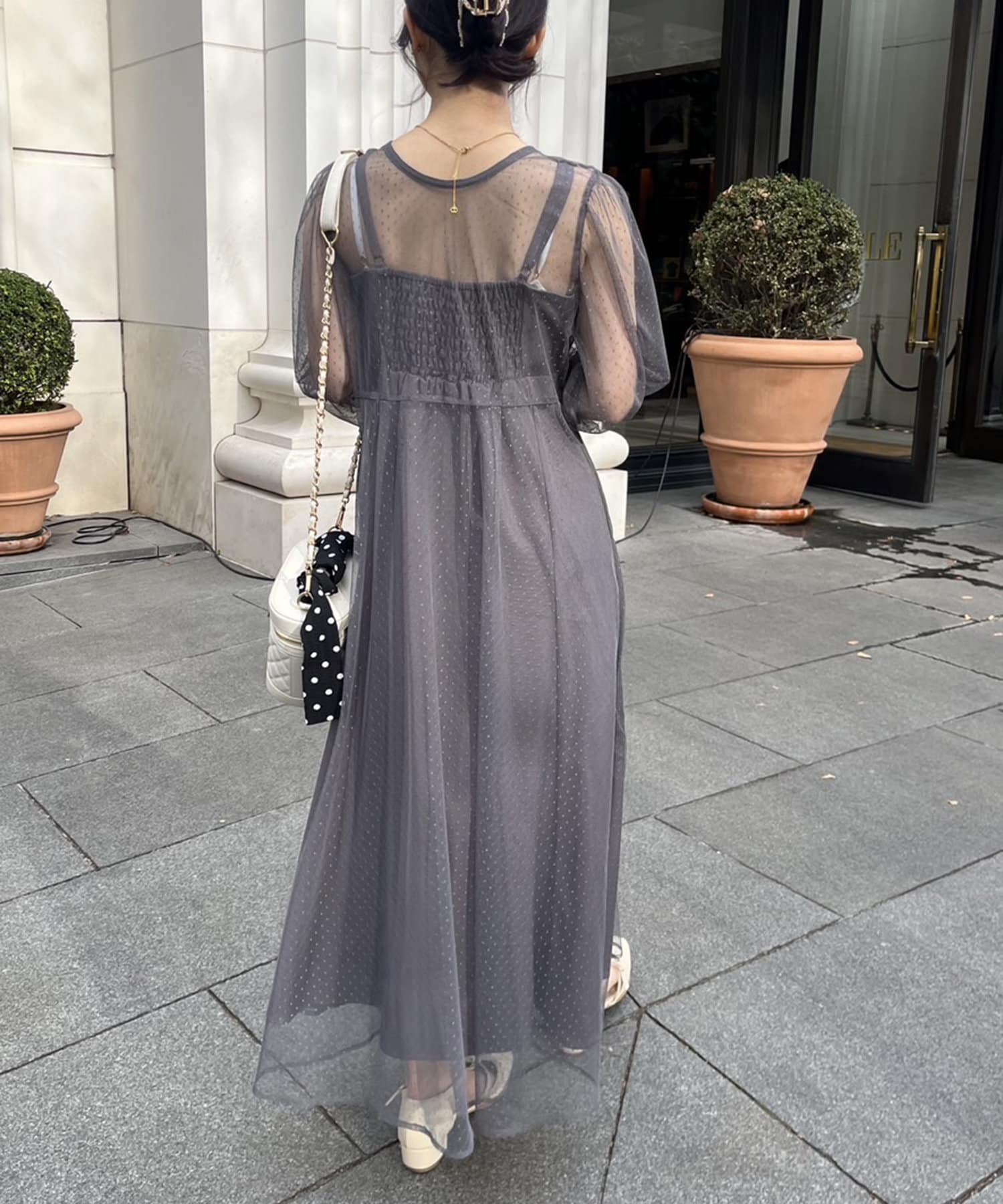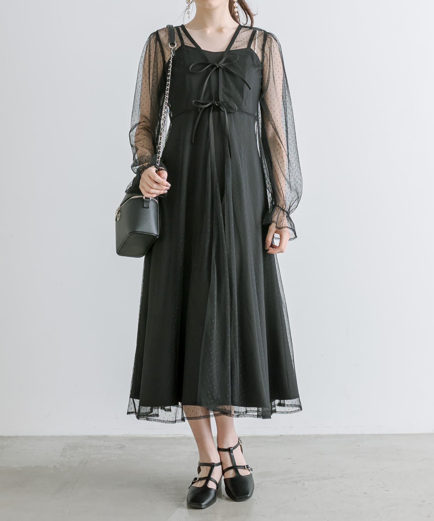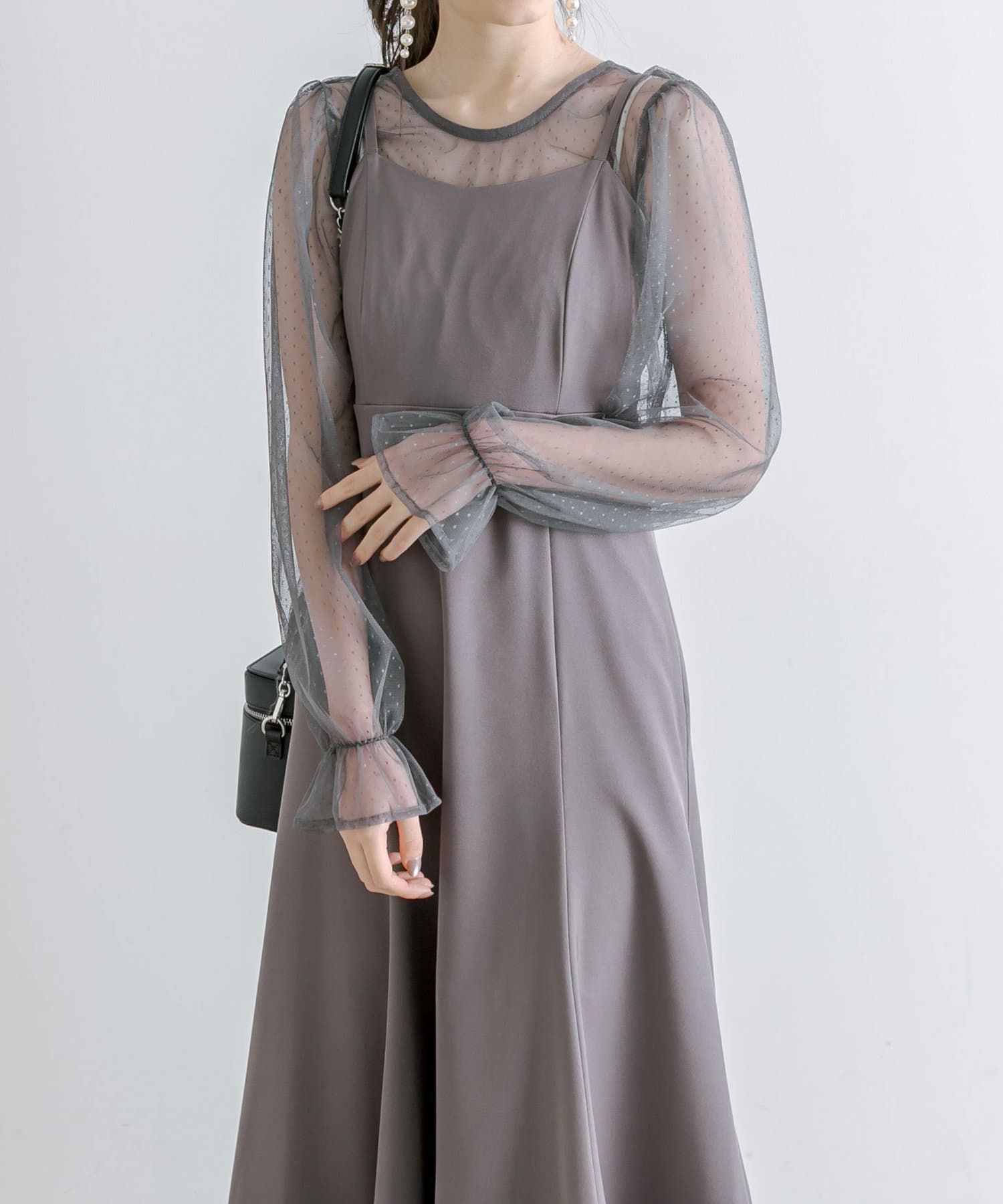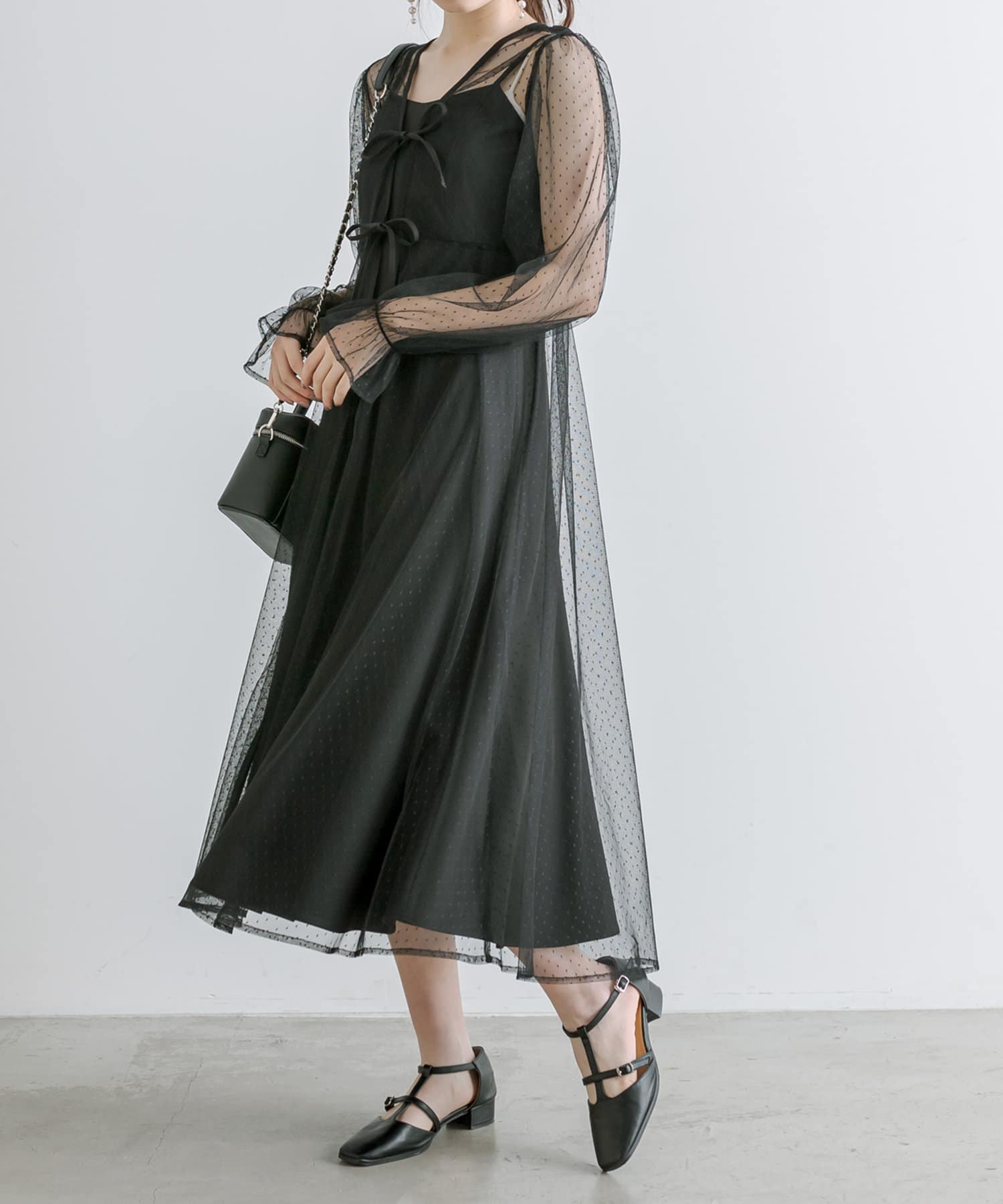 ・透け感のあるドット柄チュールと無地のキャミワンピースがセットに。