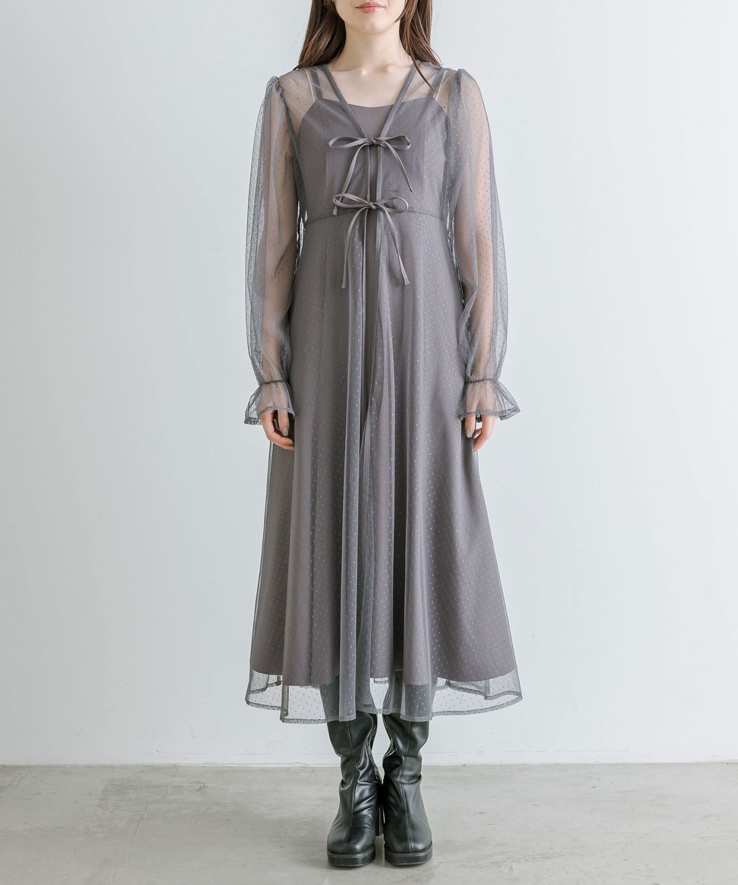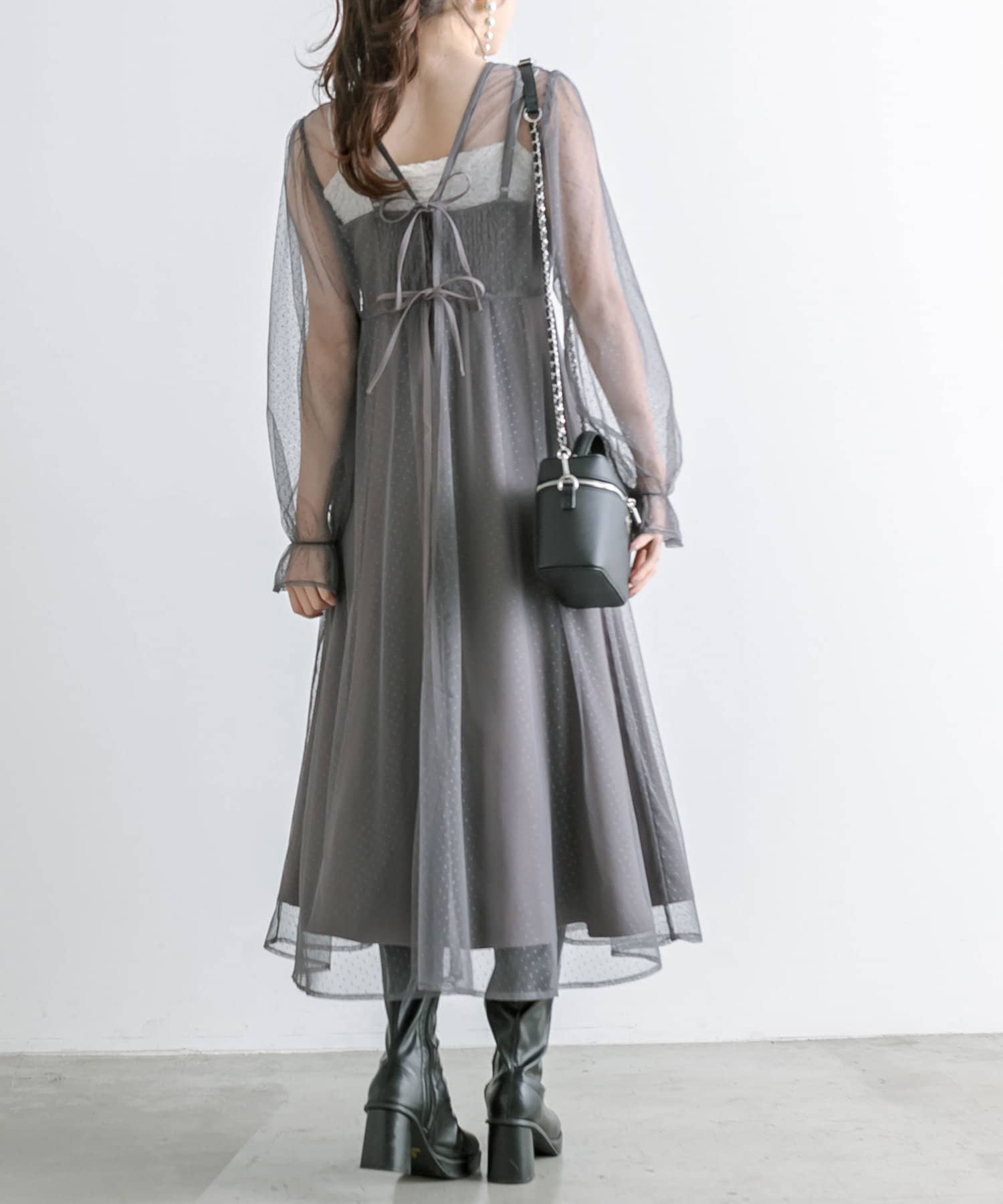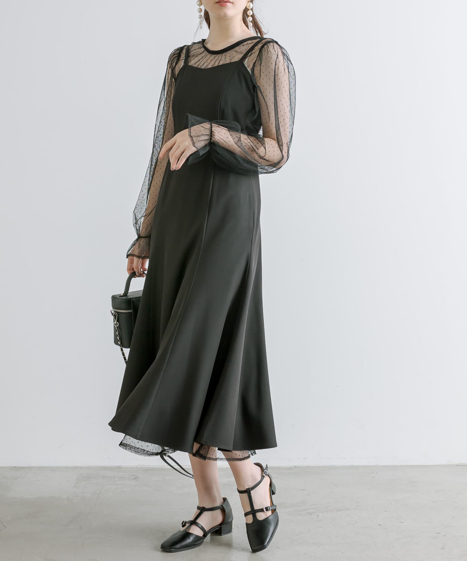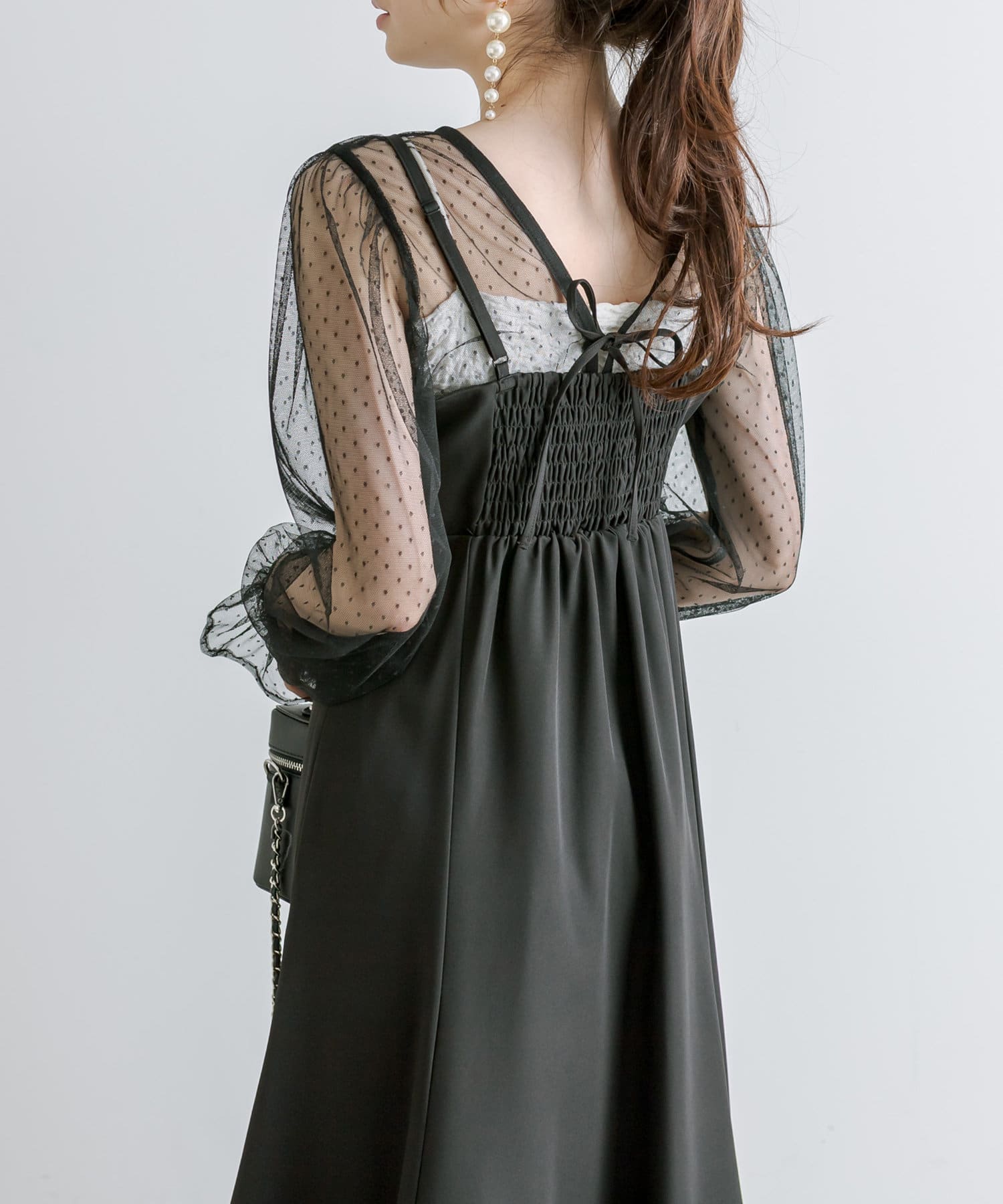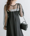 ・透け感のあるドット柄チュールと無地のキャミワンピースがセットに。