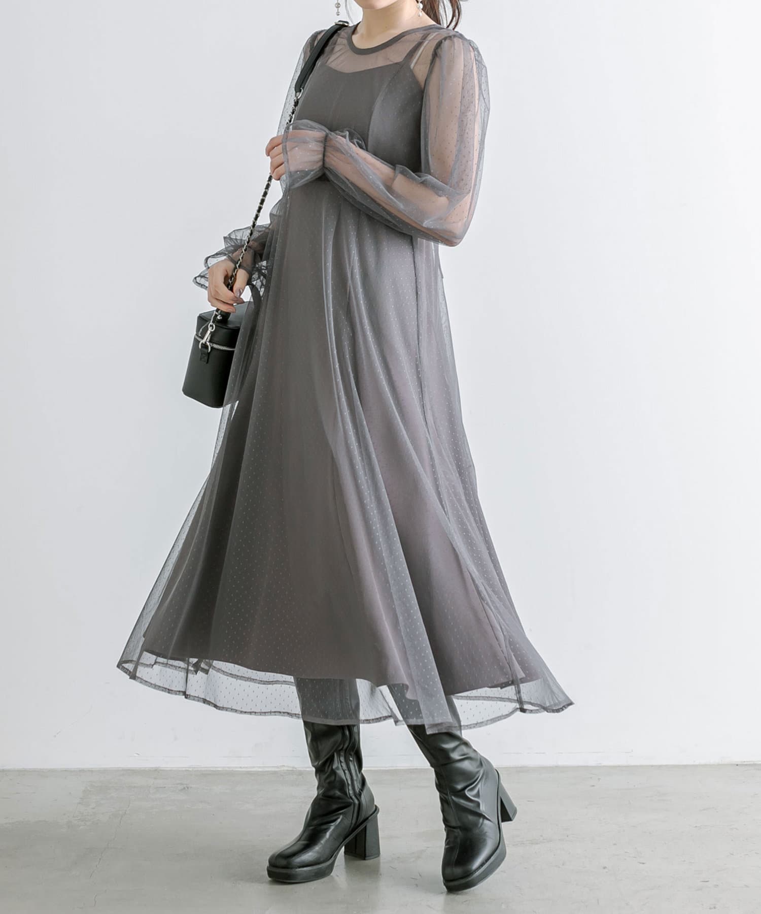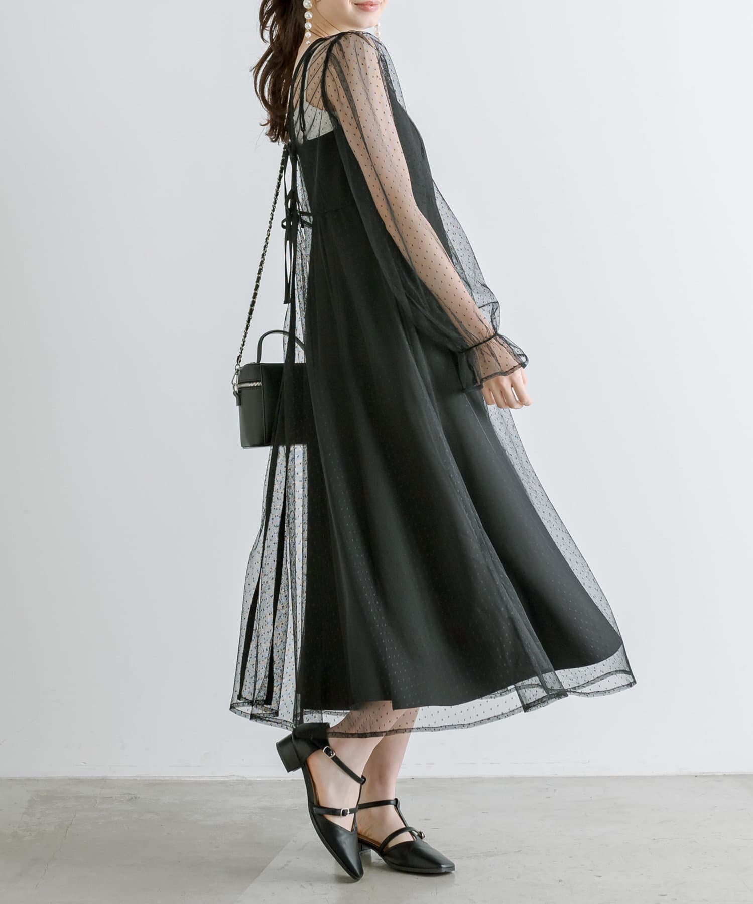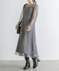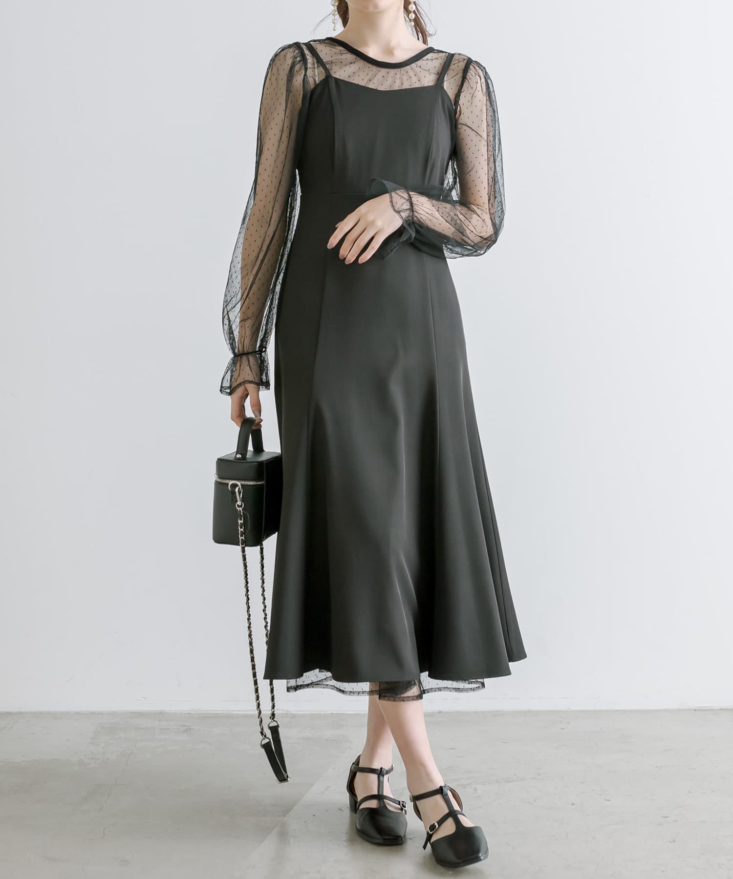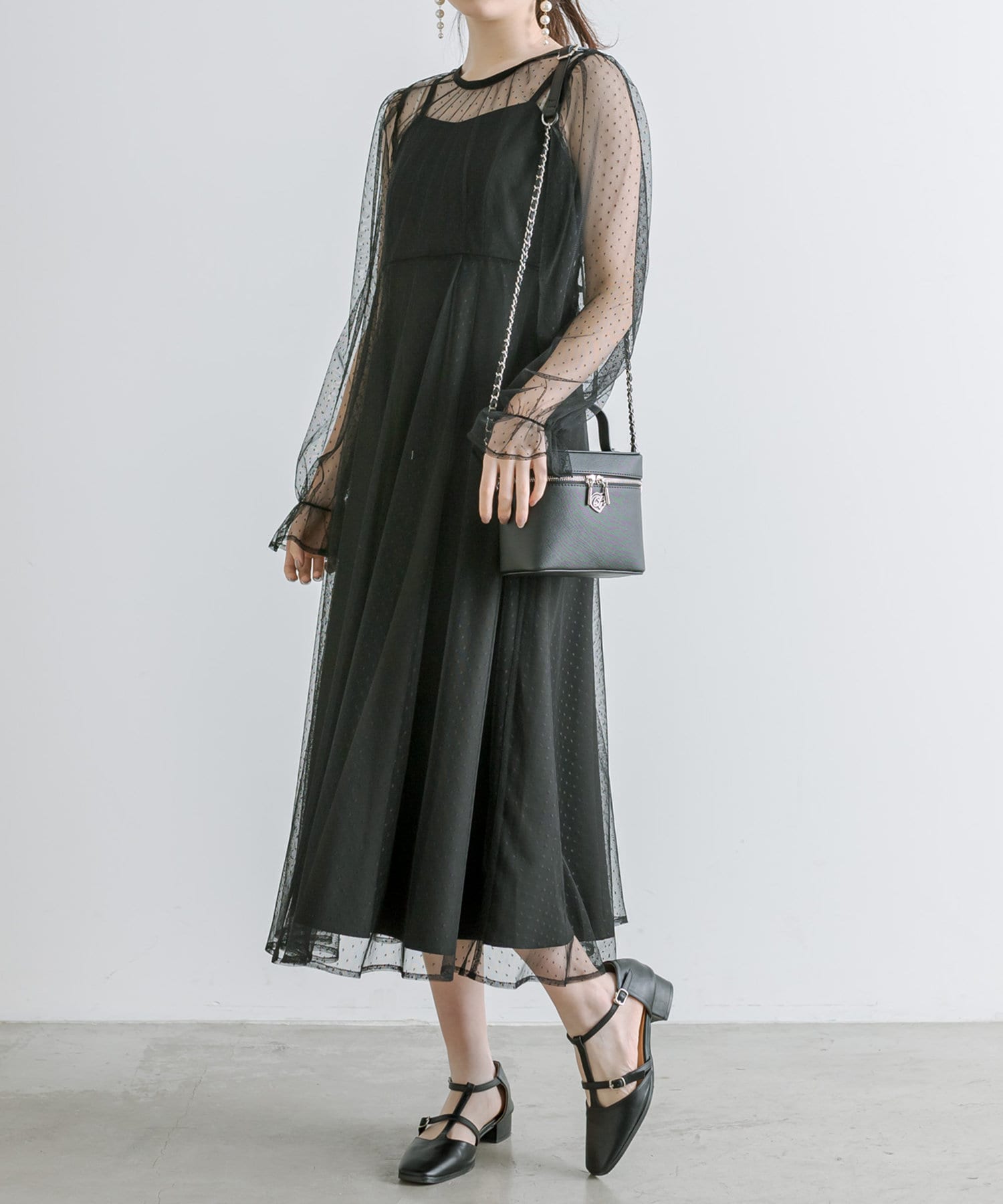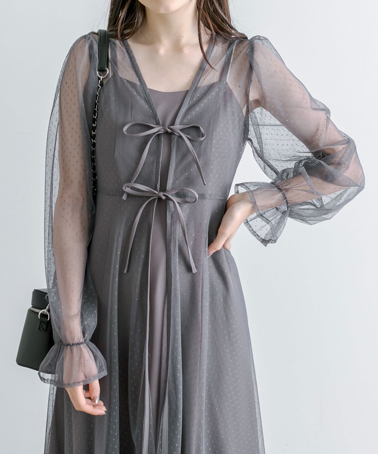 ・透け感のあるドット柄チュールと無地のキャミワンピースがセットに。