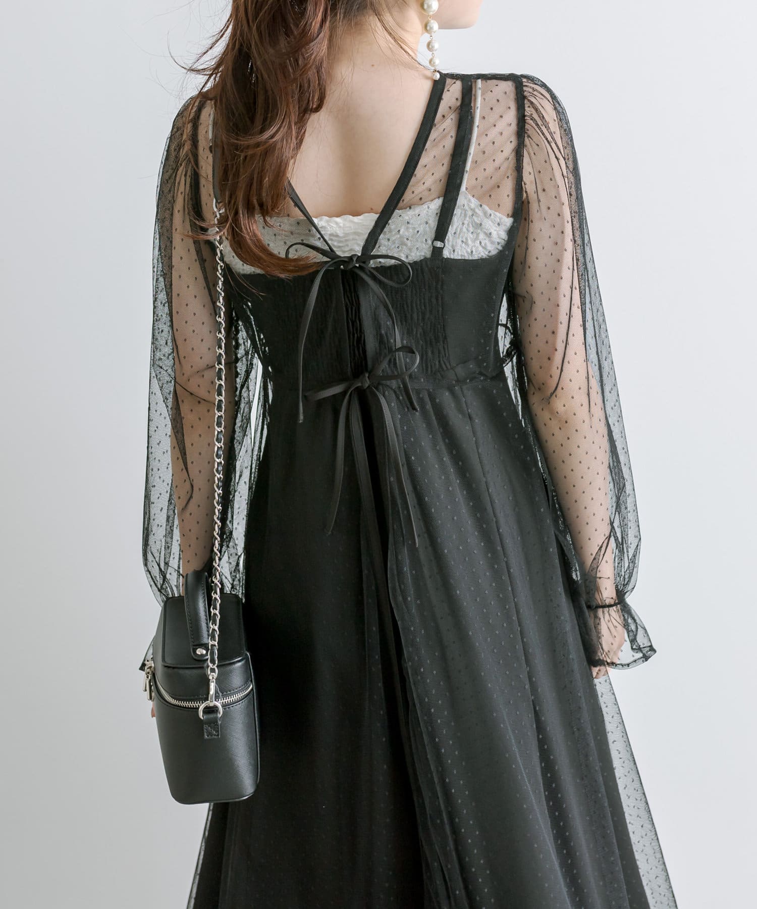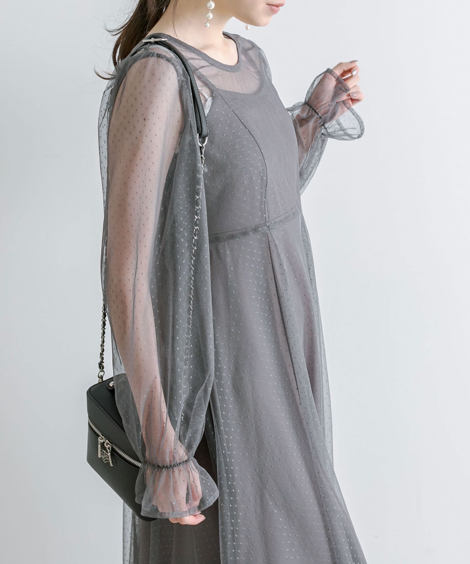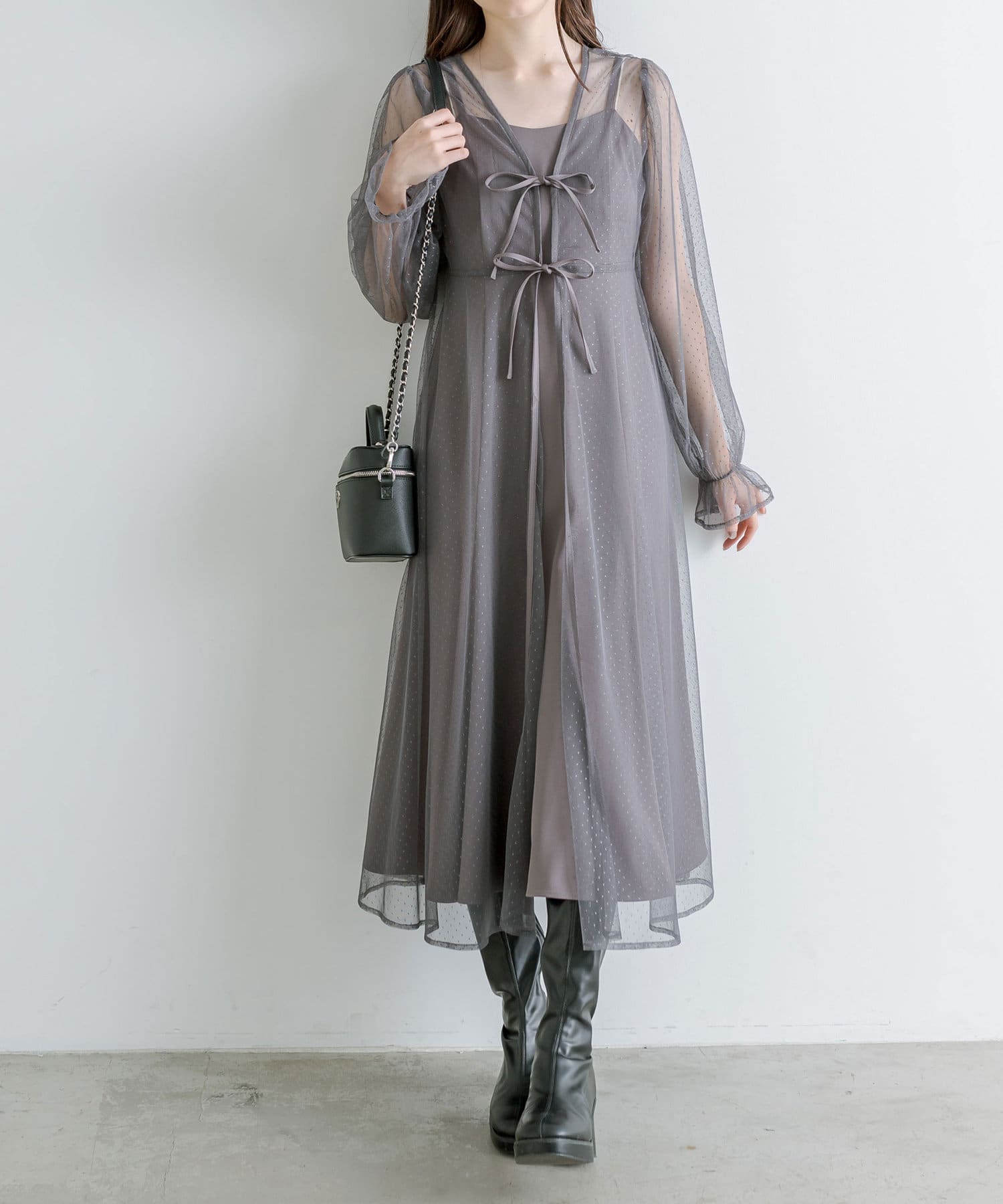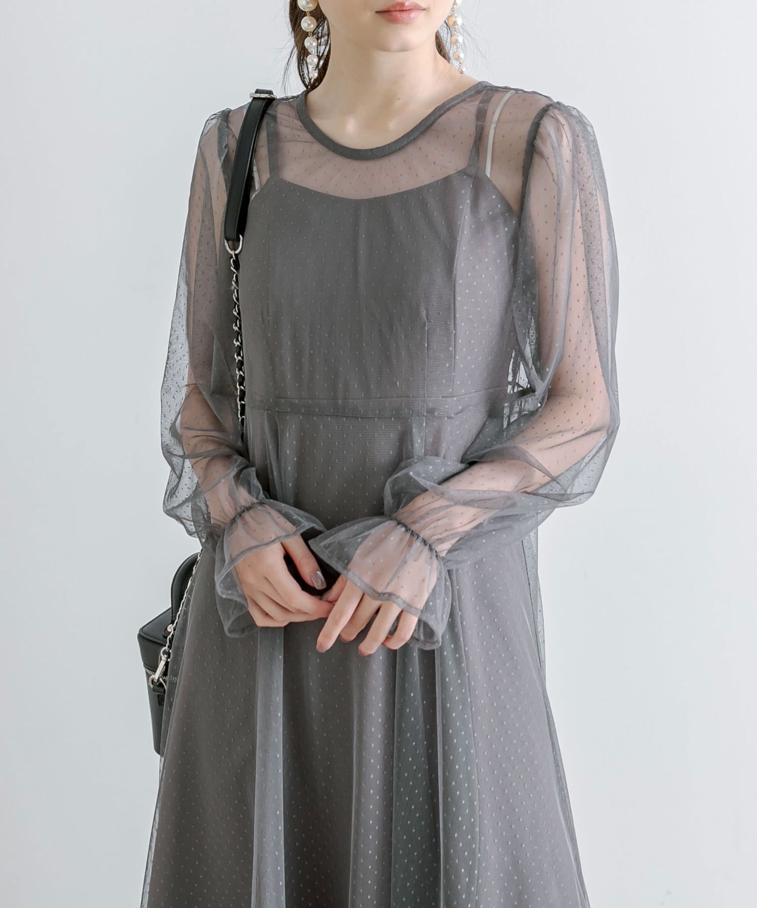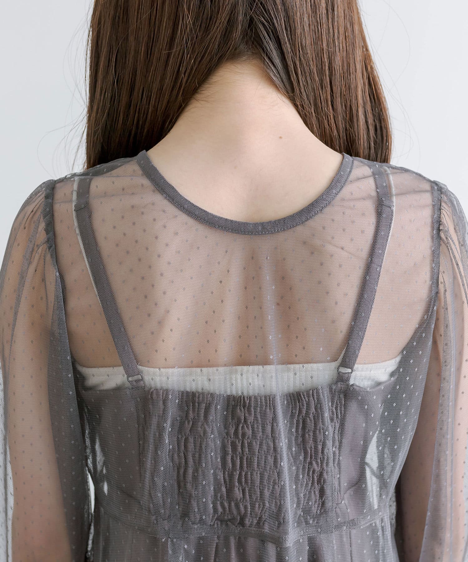 ・透け感のあるドット柄チュールと無地のキャミワンピースがセットに。