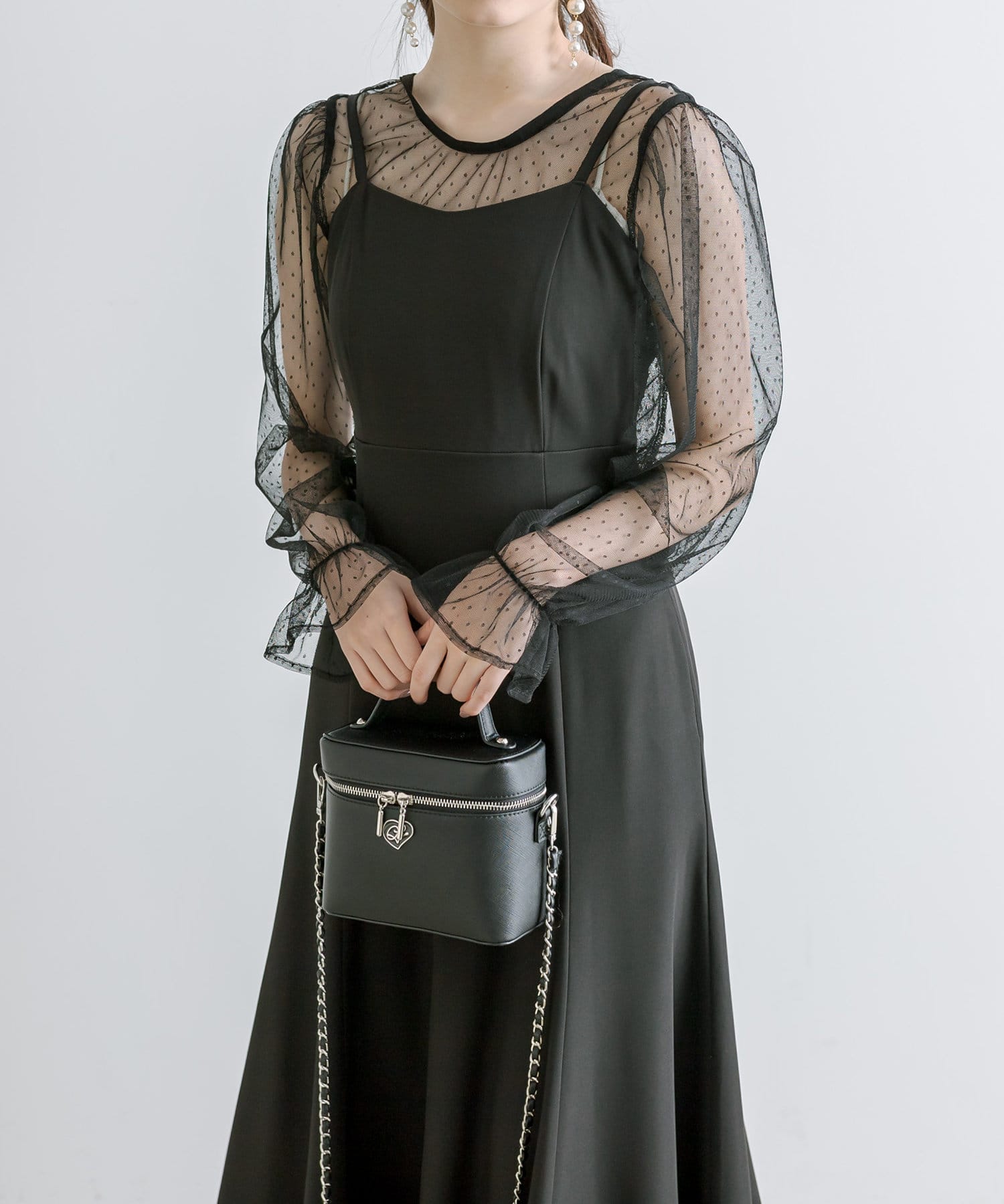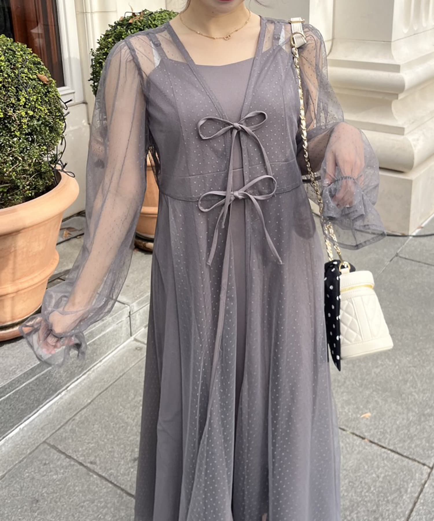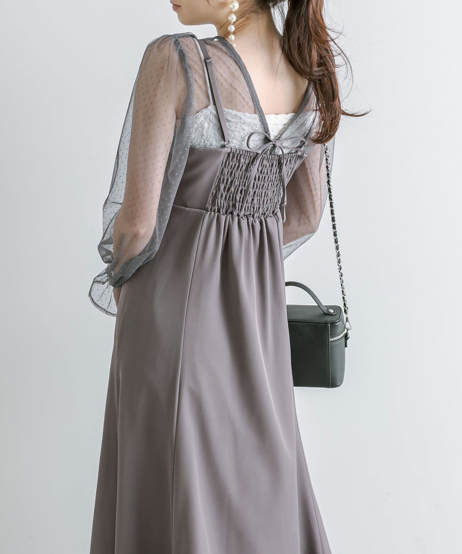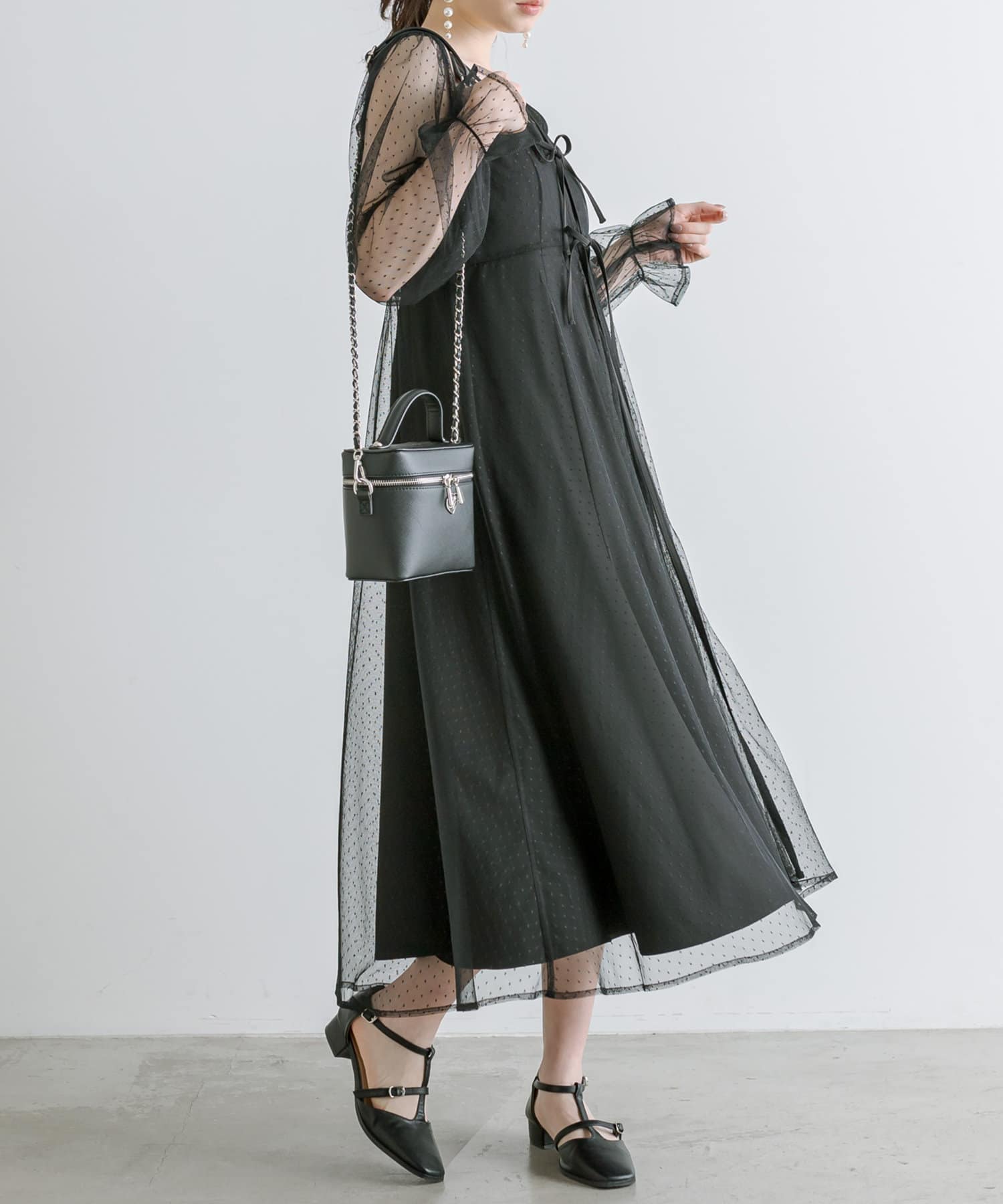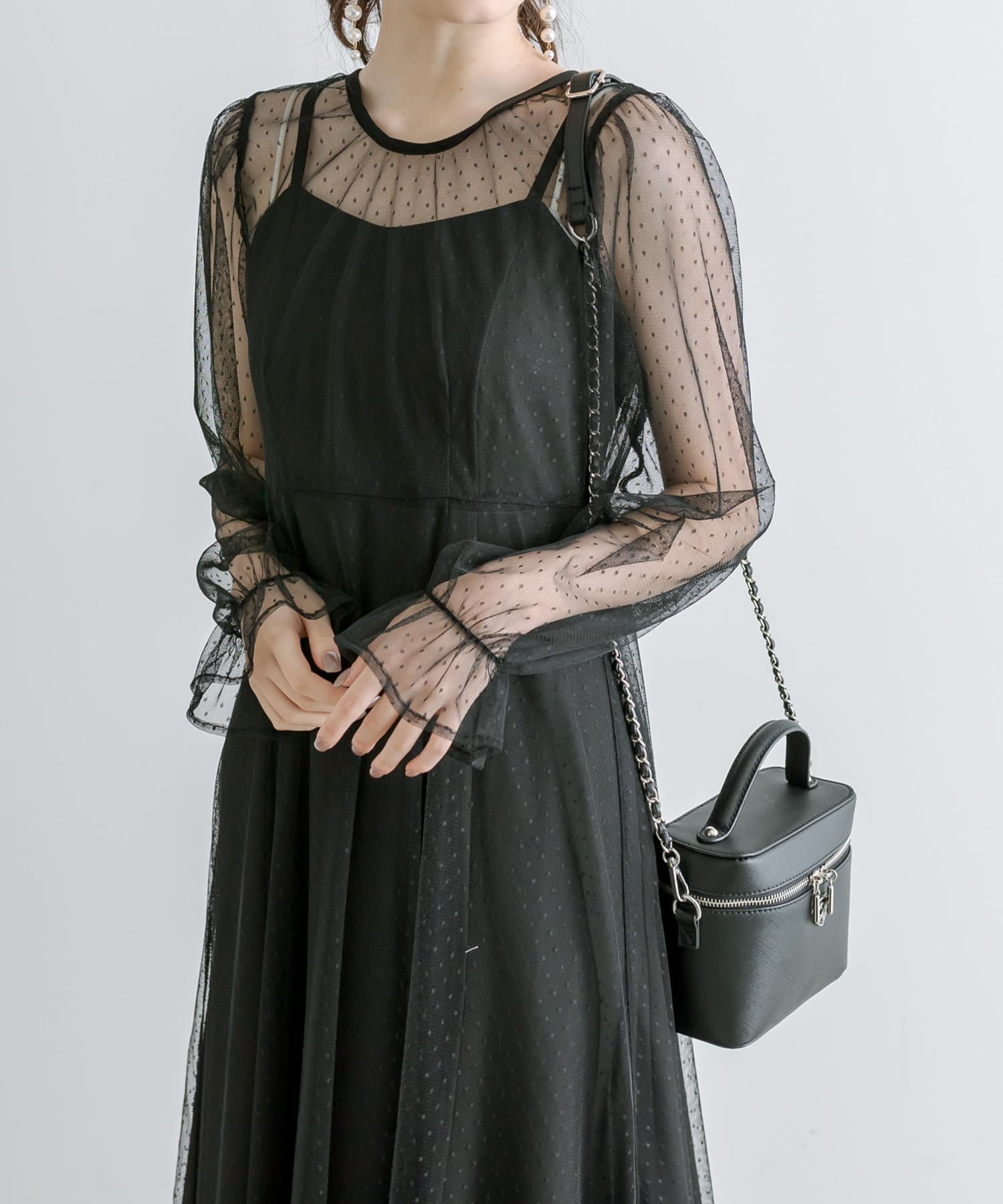 ・透け感のあるドット柄チュールと無地のキャミワンピースがセットに。