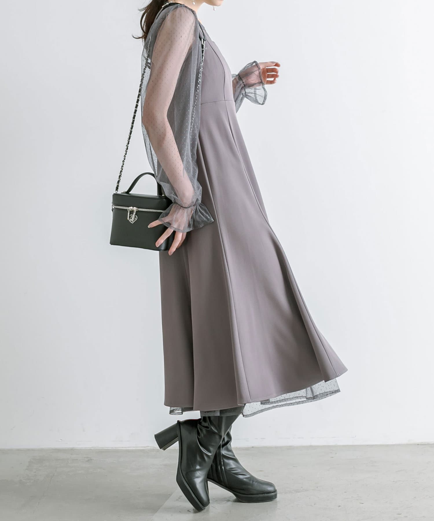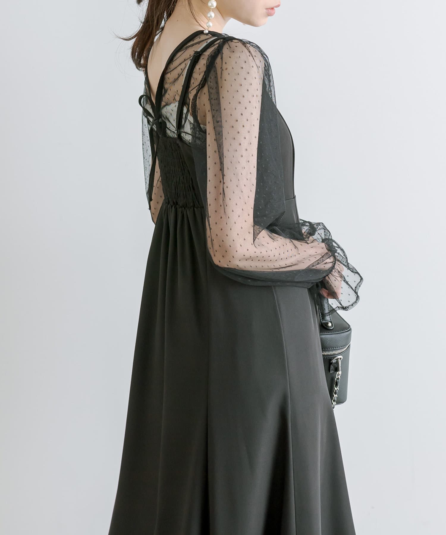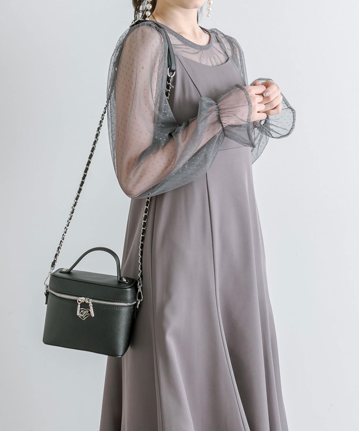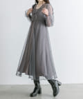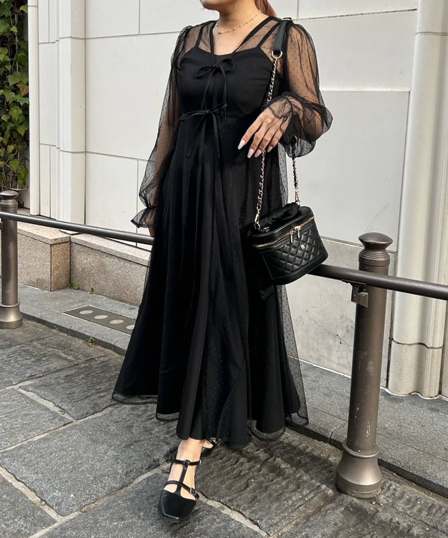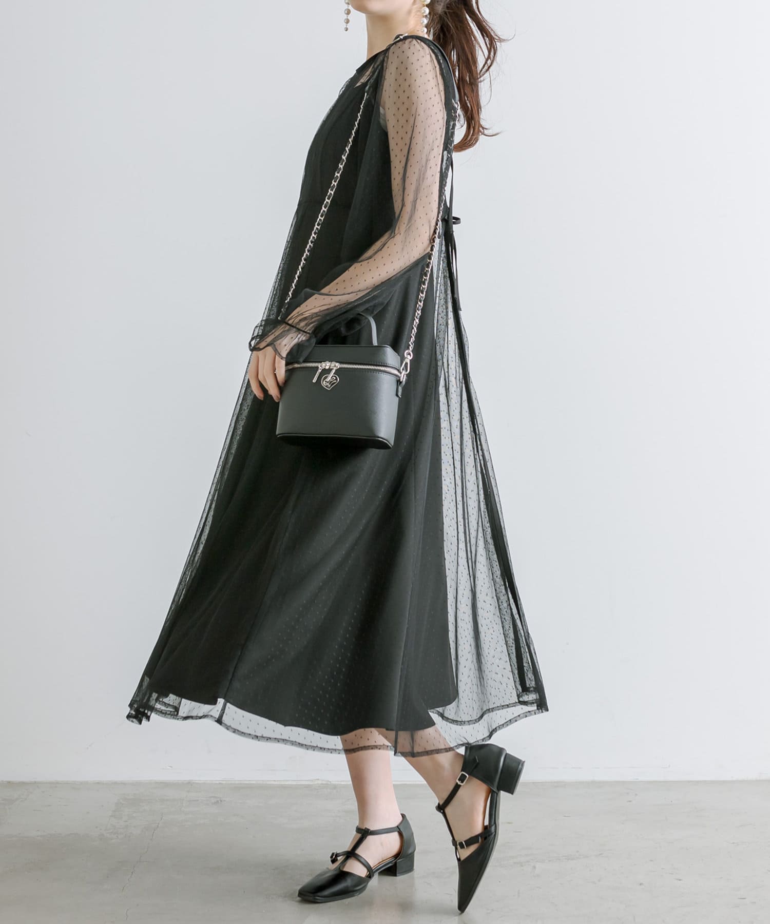 ・透け感のあるドット柄チュールと無地のキャミワンピースがセットに。