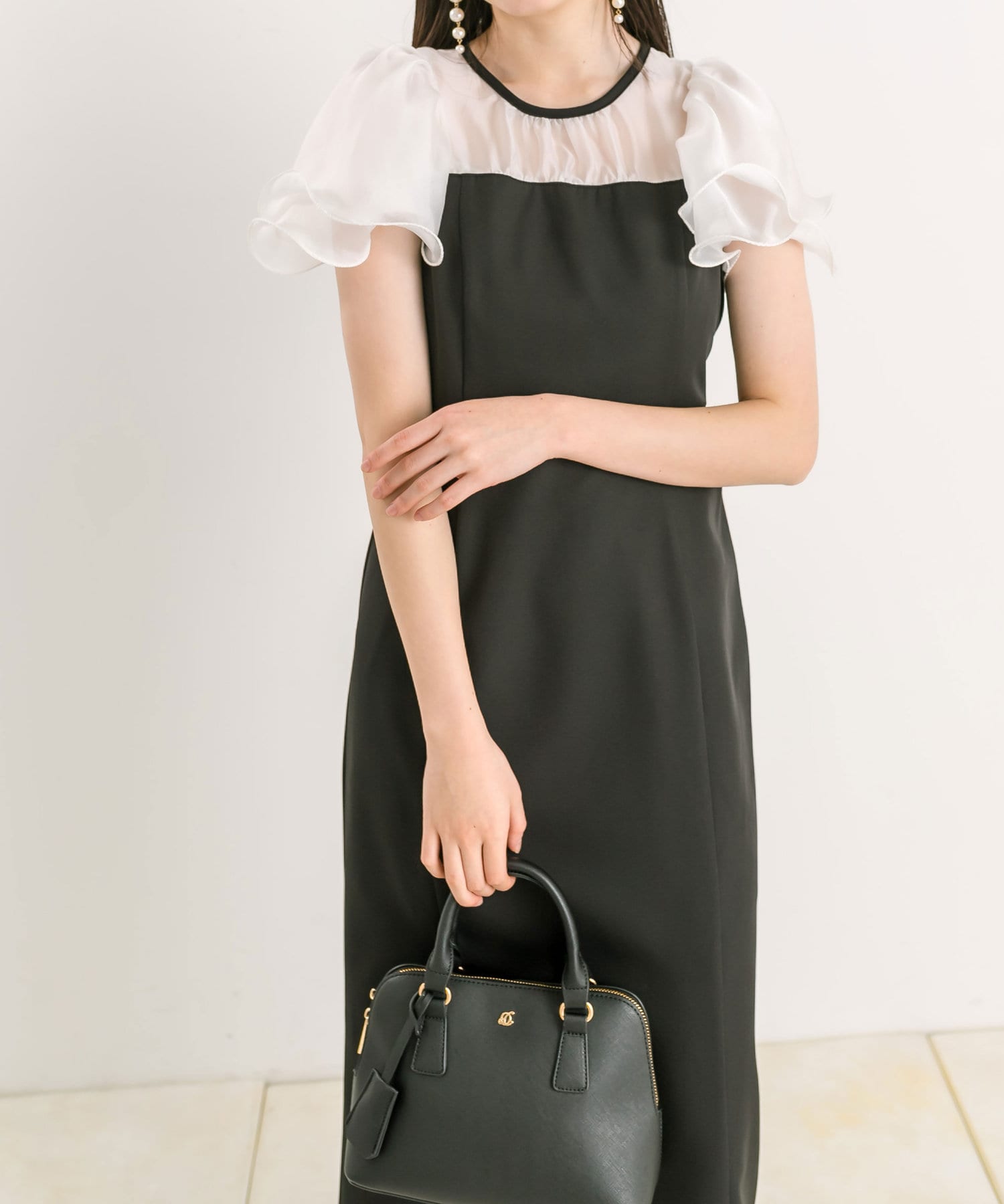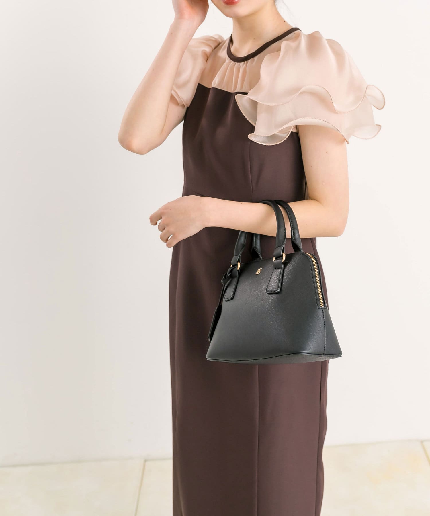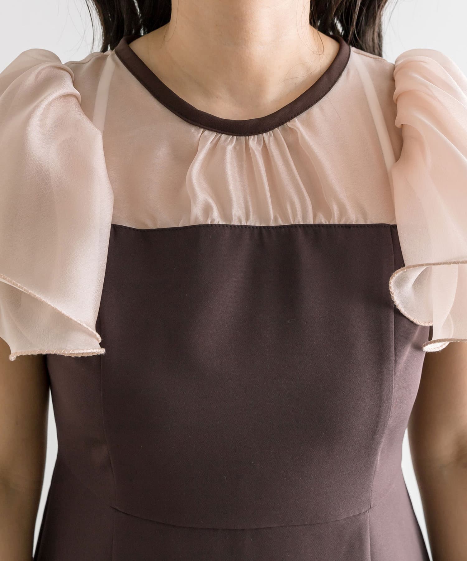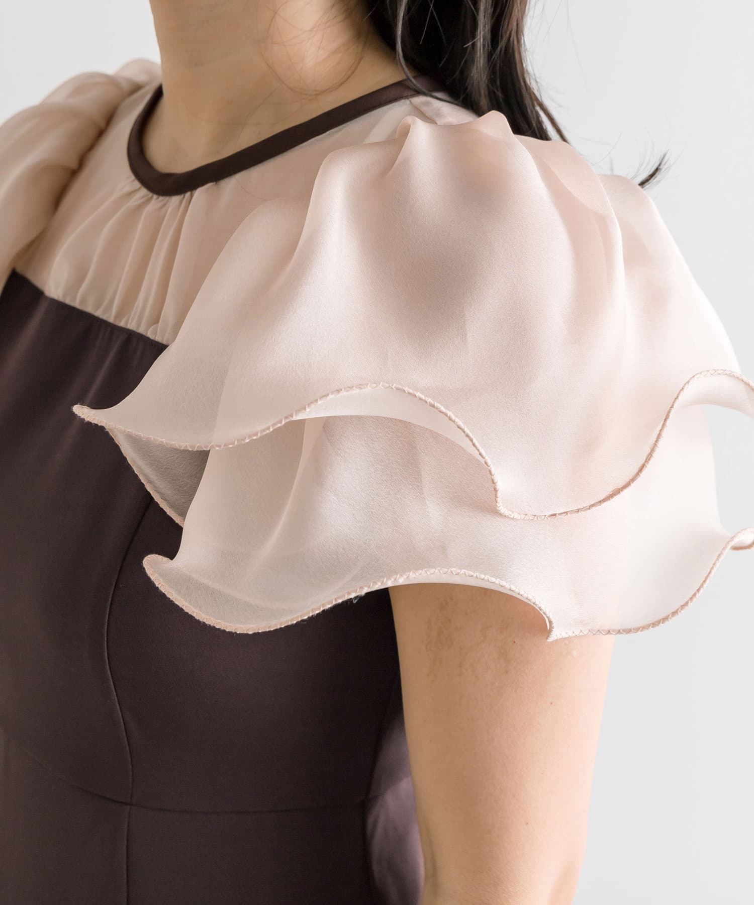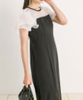 ・2枚に重ねたラッフルスリーブが顔周りを華やかにしてくれるワンピース。