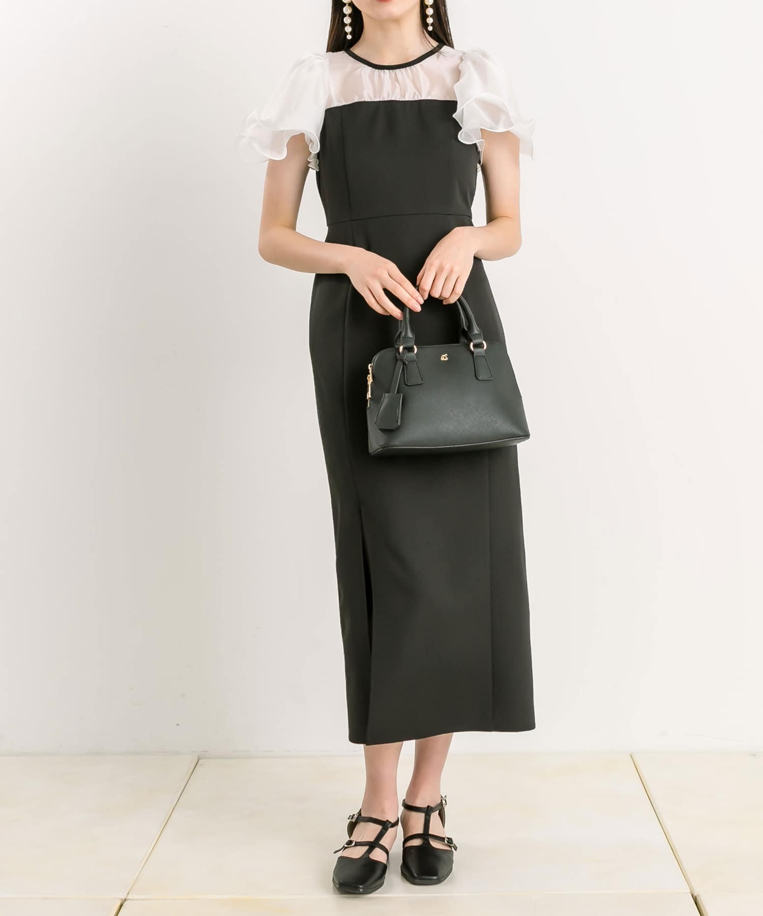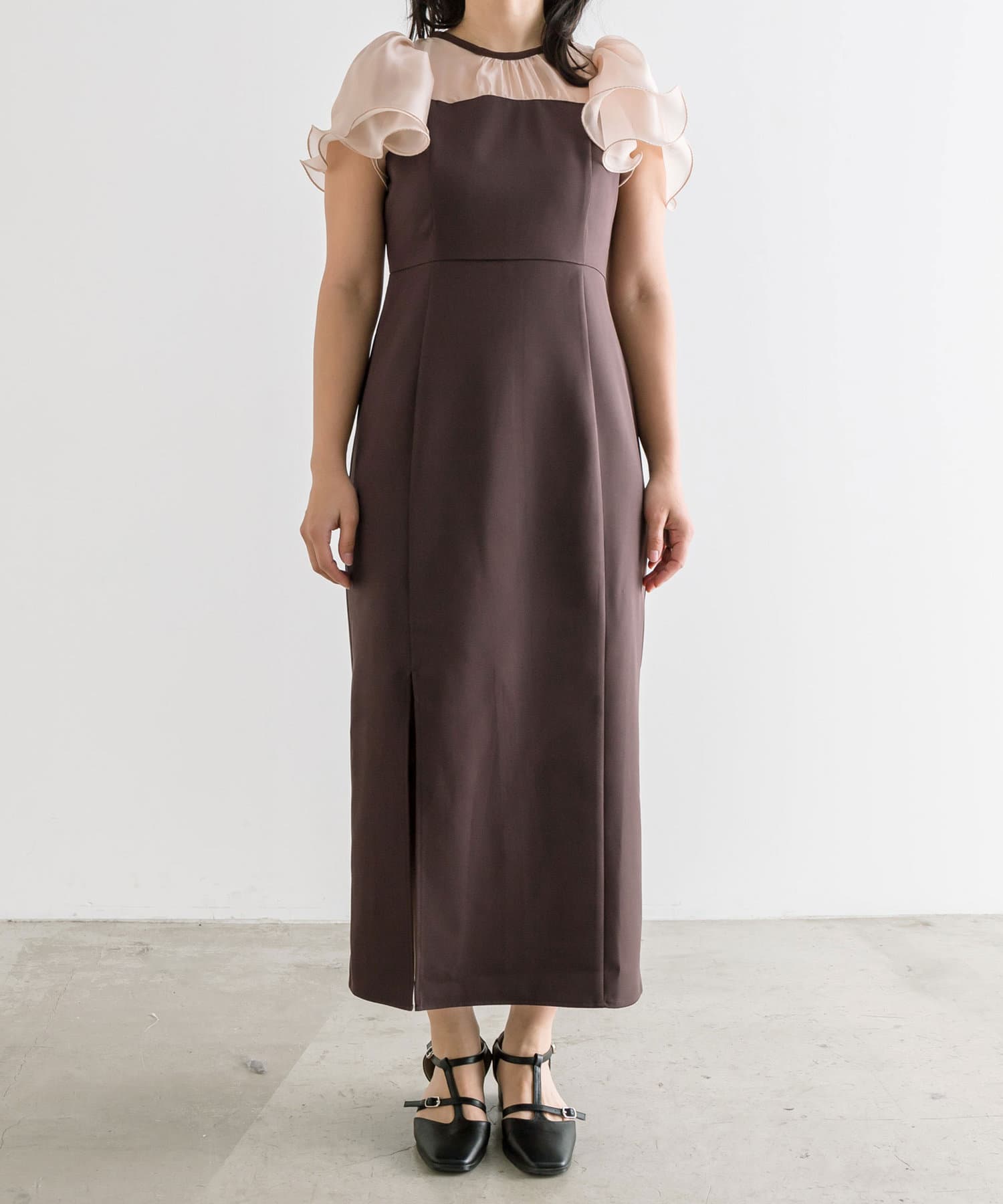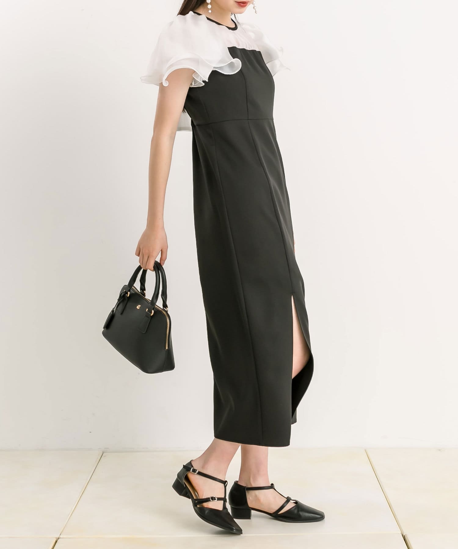 ・透け感のある生地や裾スリットのさりげない肌見せで大人っぽさを演出。