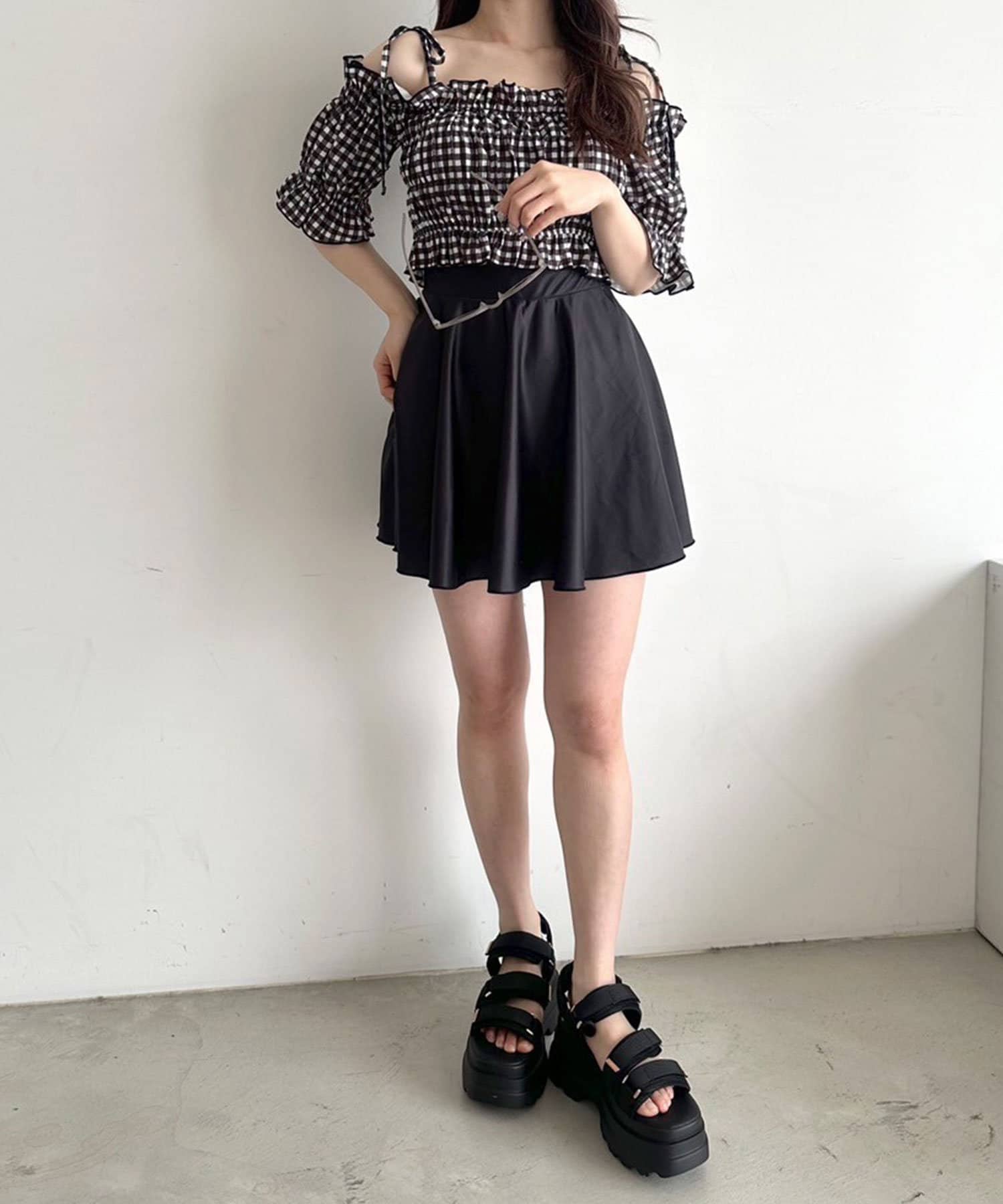・気になるウエストや太もも周りを隠せるスカートタイプでスッキリ着れます。