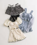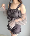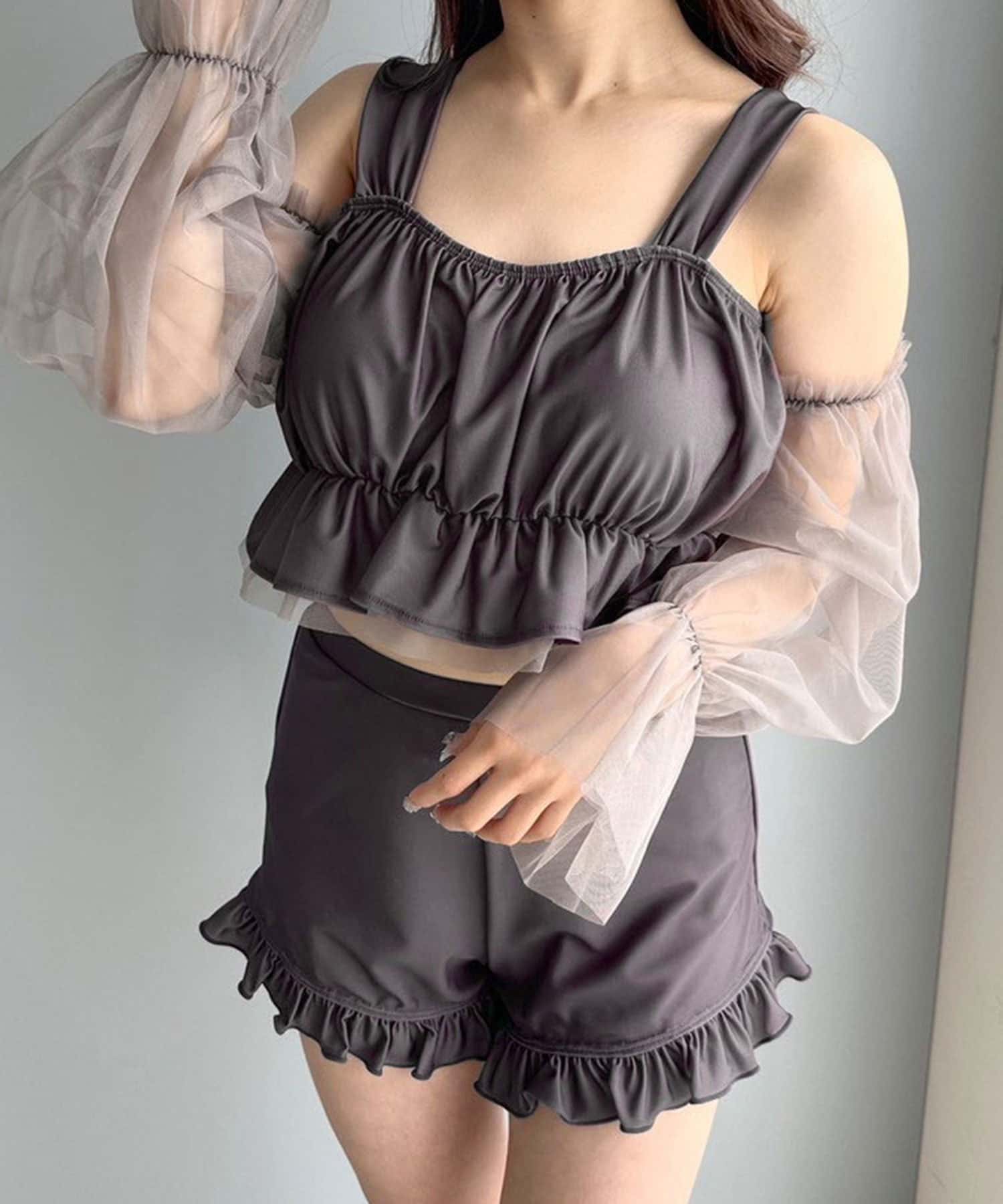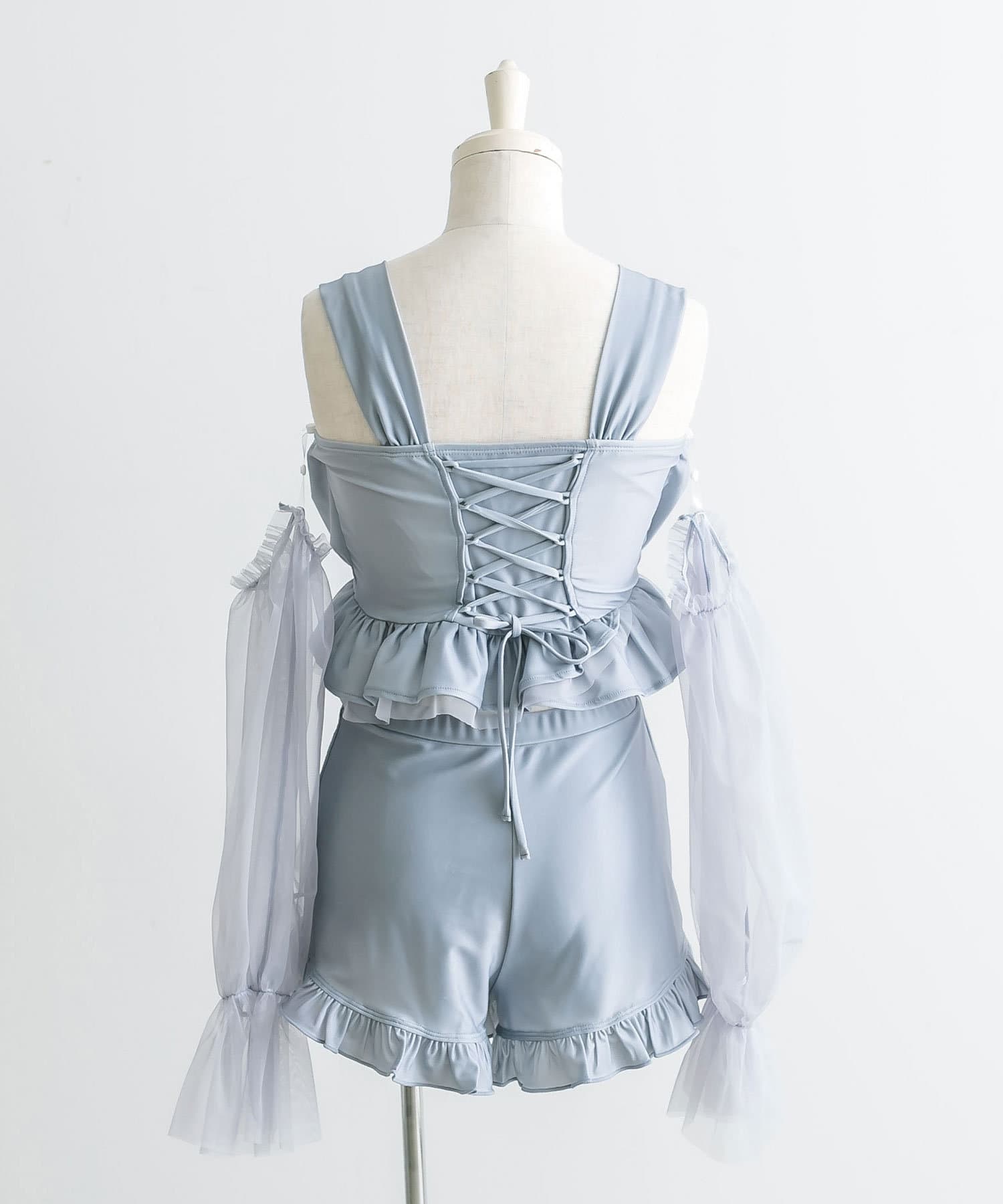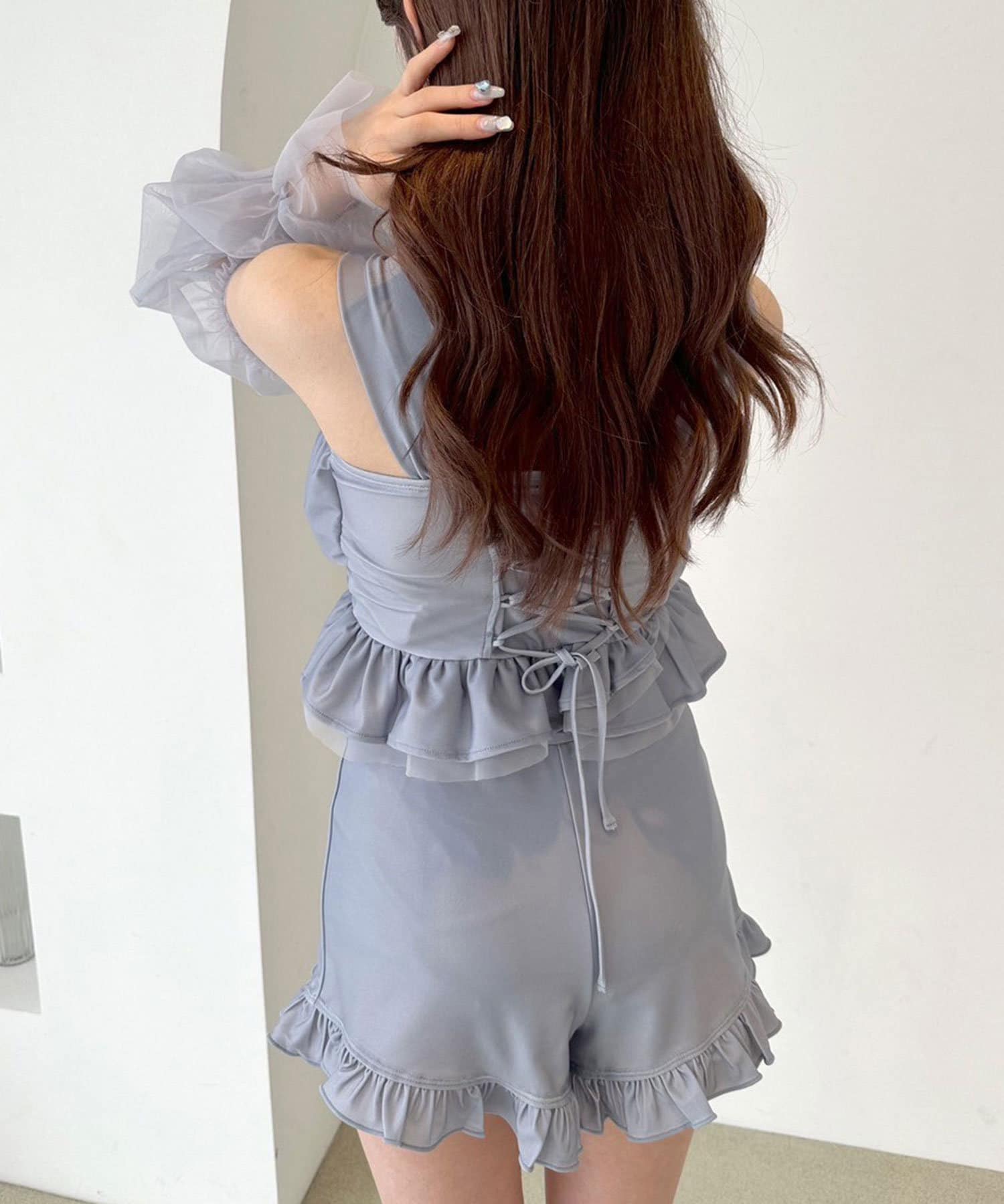 ・チュール袖やフリル、レースアップなどガーリー要素たっぷりな水着。