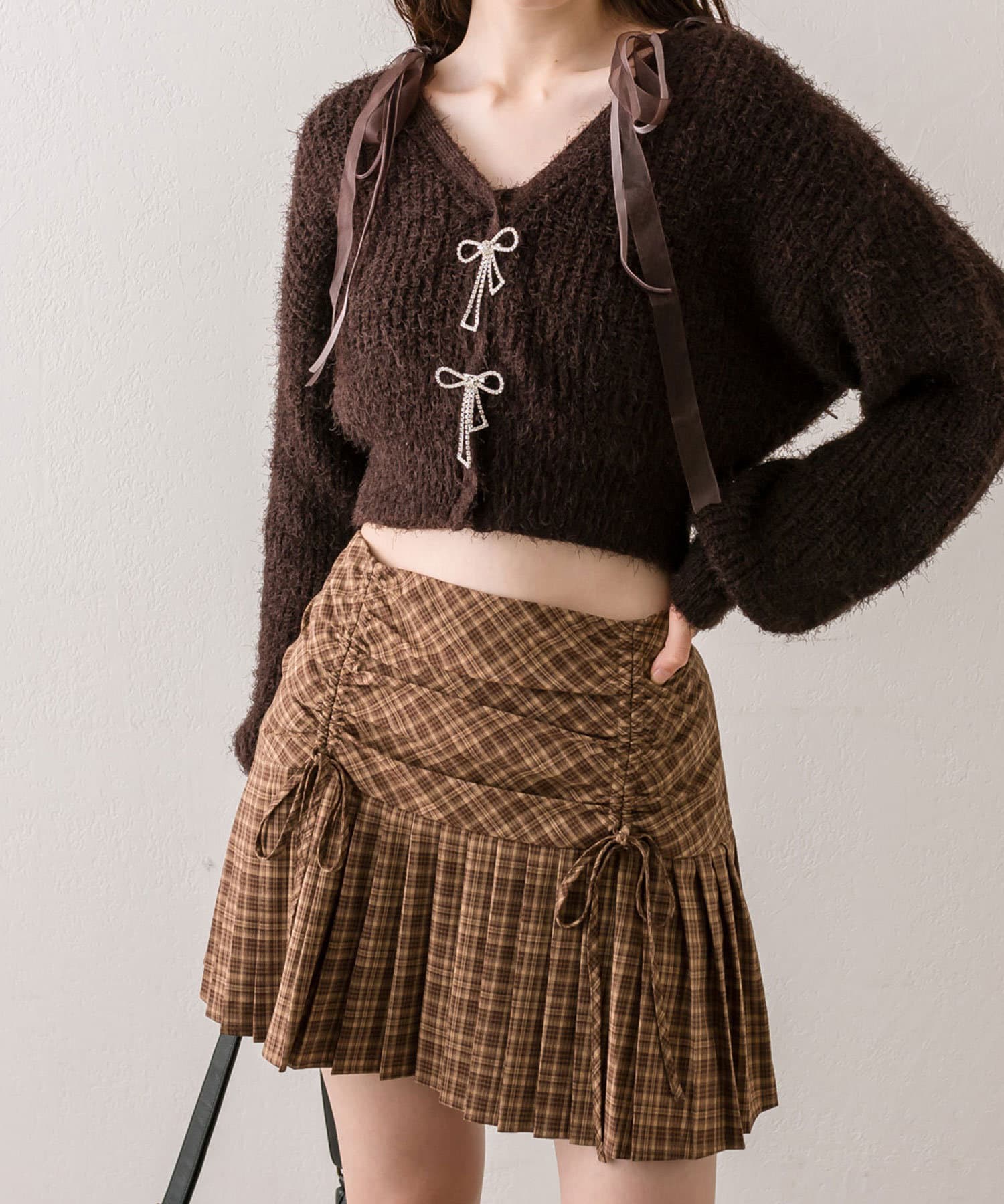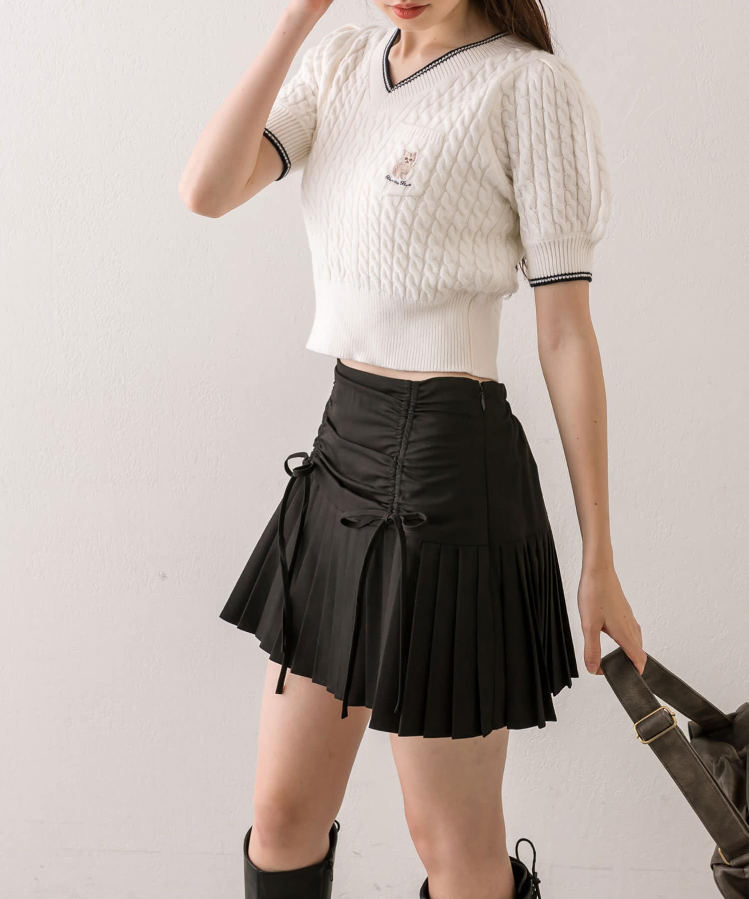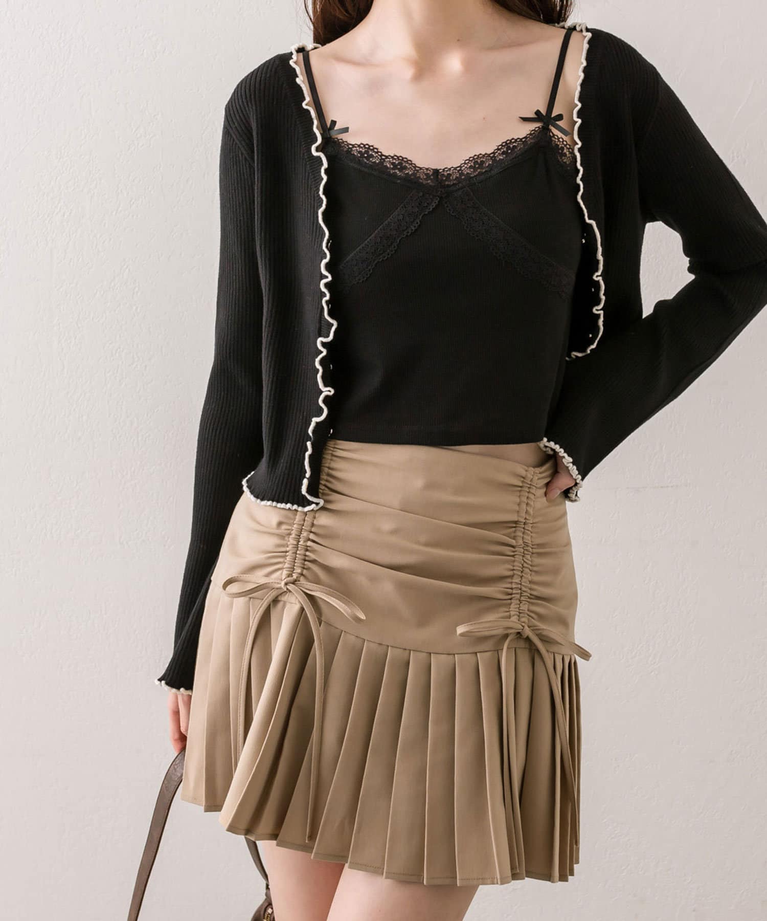 ・ウエスト部分のドロストとリボンがガーリーなミニスカート。