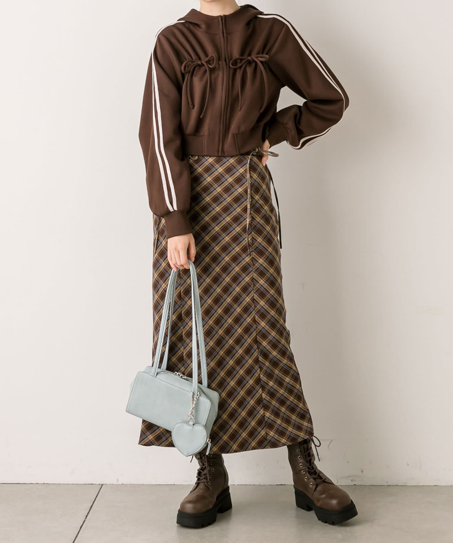 ・足元はブーツで合わせると大人かわいく、スニーカーで合わせるとカジュアルな着こなしになります。