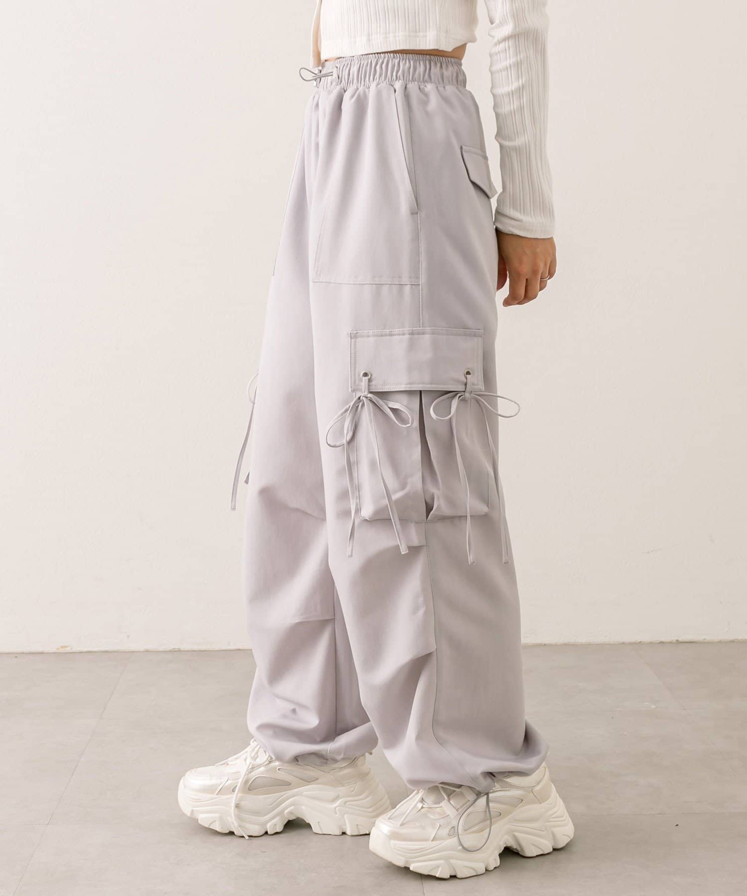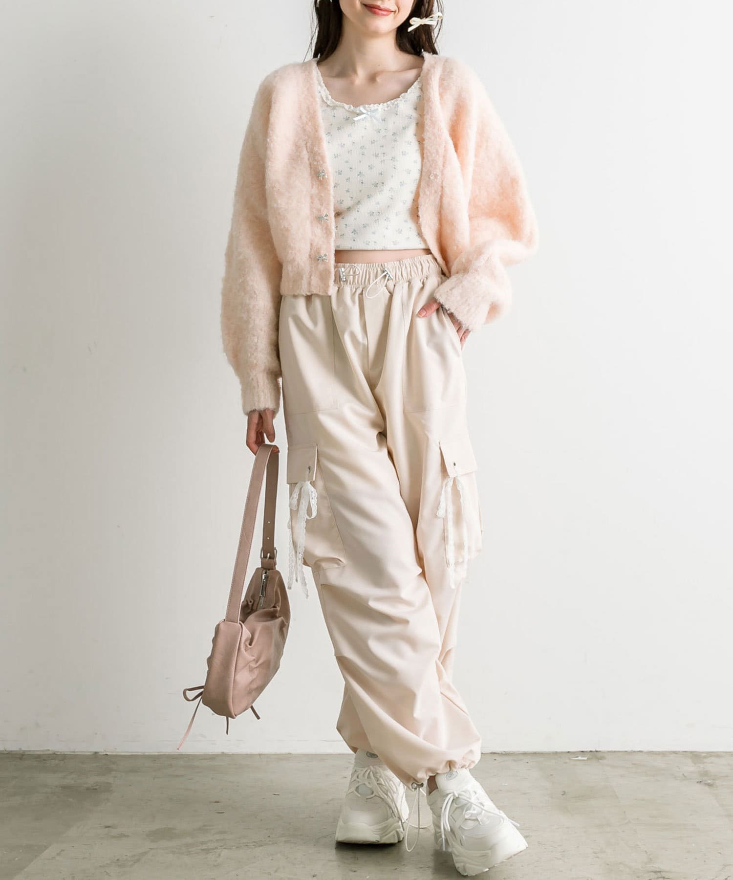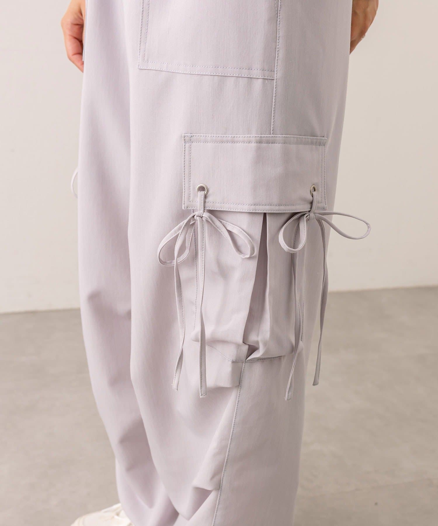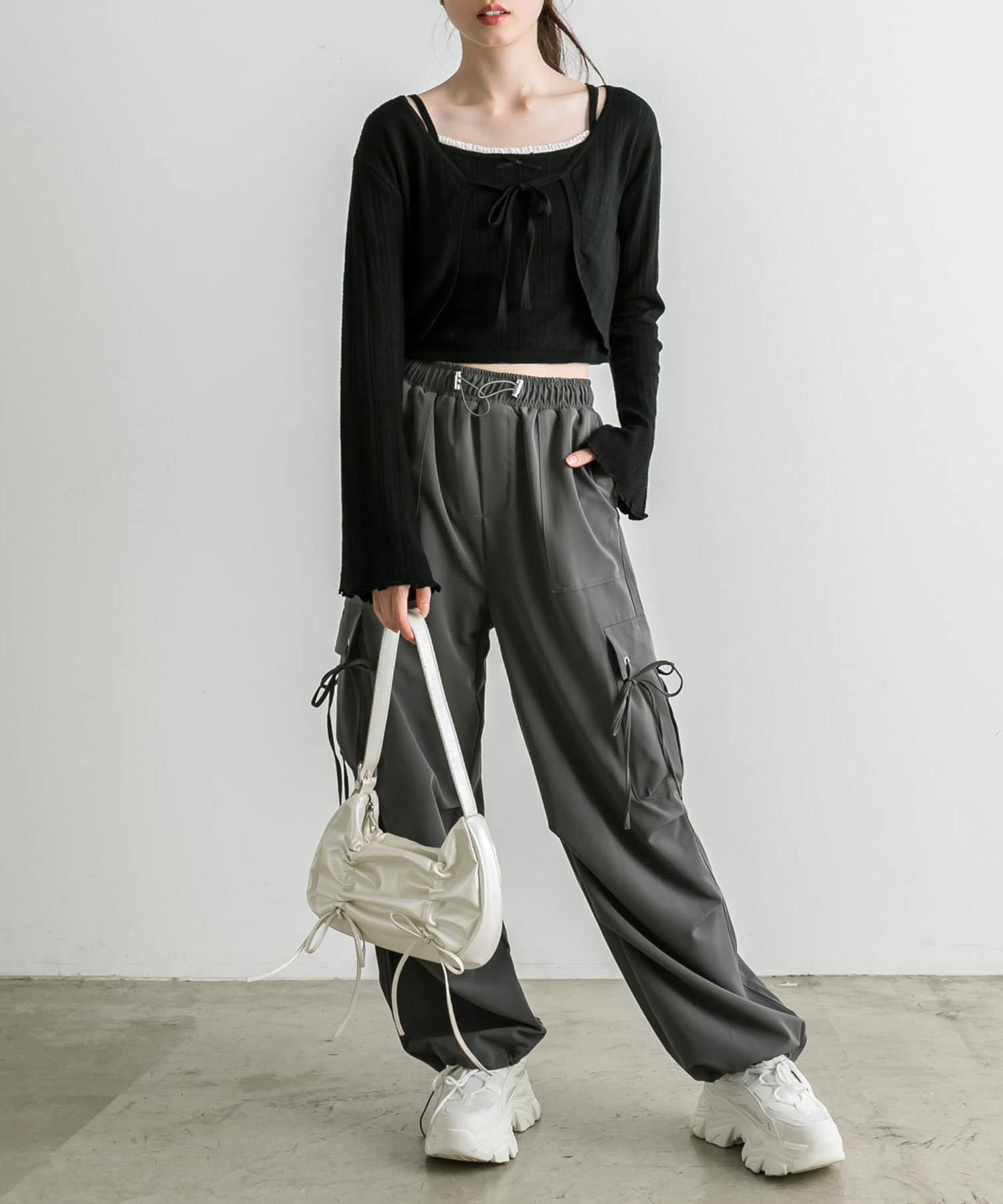 ・カジュアルな印象になりがちなカーゴパンツですが、リボンがあることで女の子らしい印象を与えてくれます。