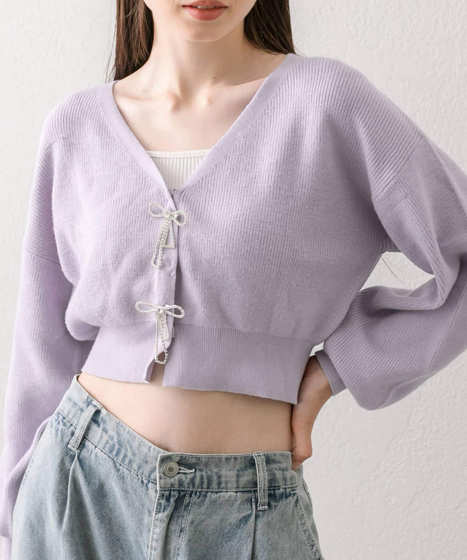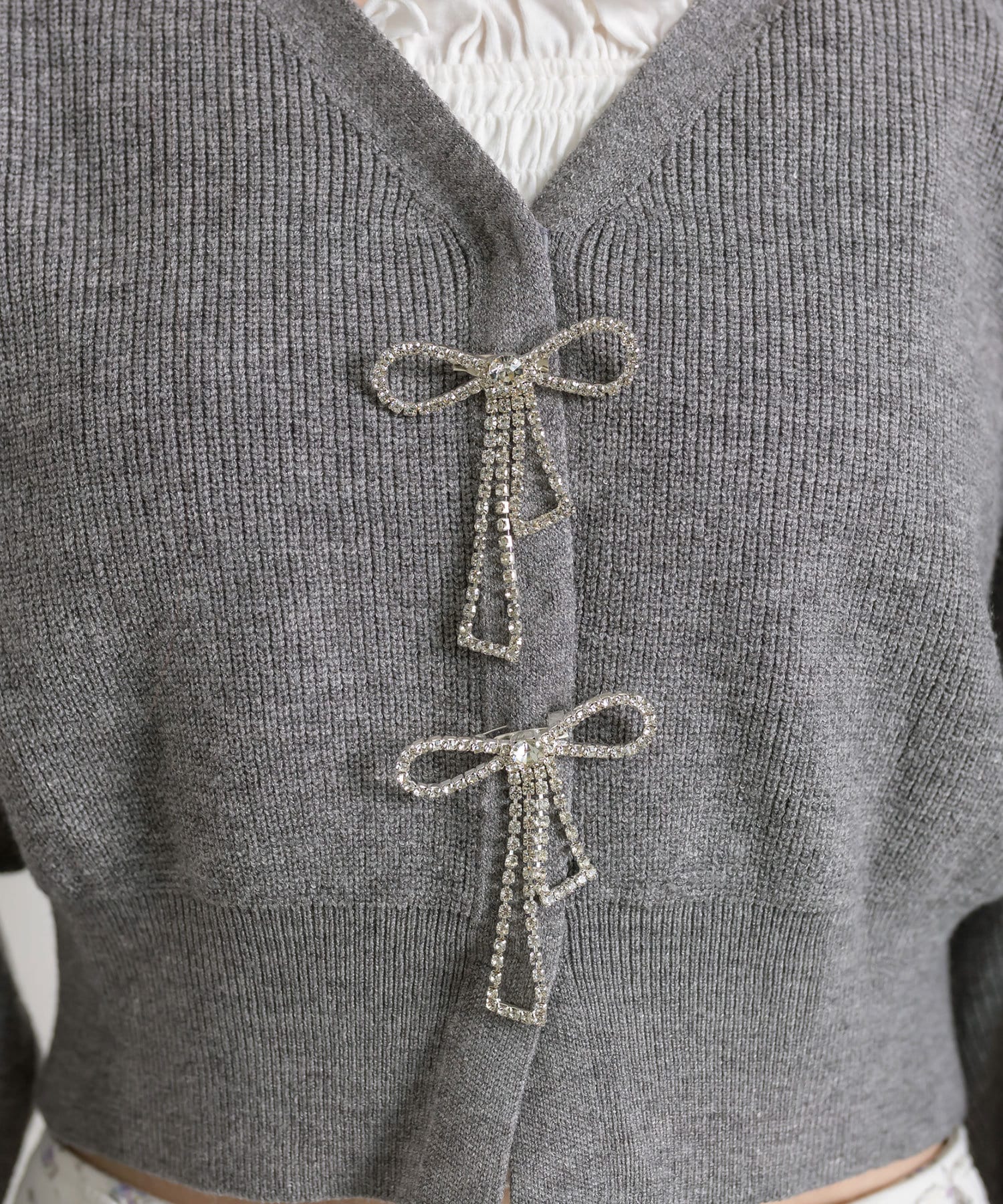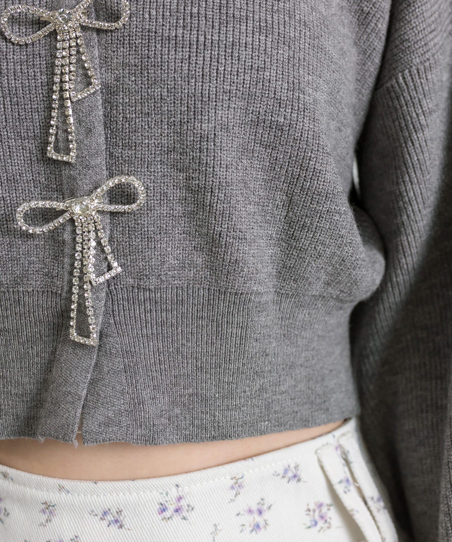 ・トレンドのリボンモチーフのビジューが可愛いカーディガン。