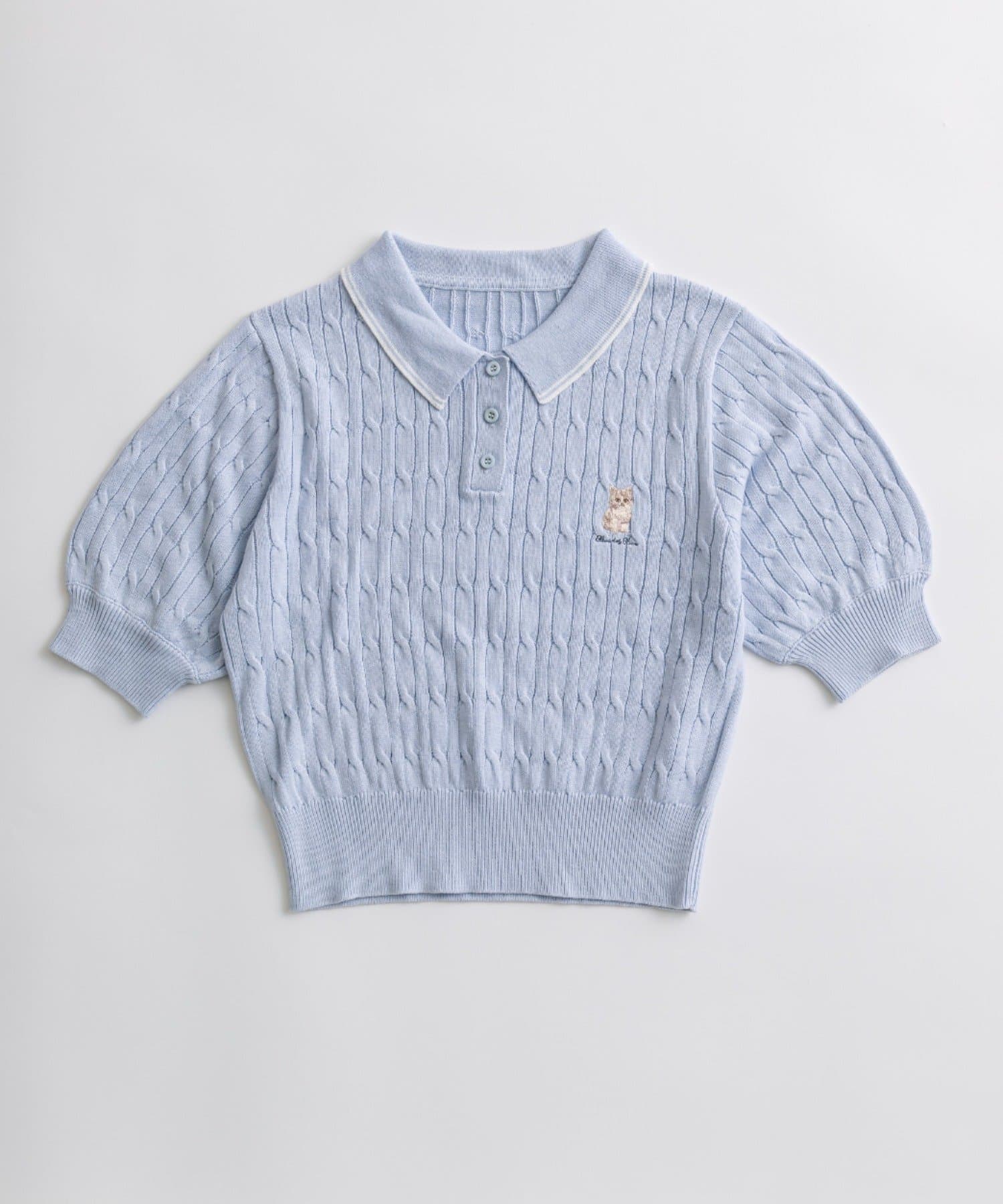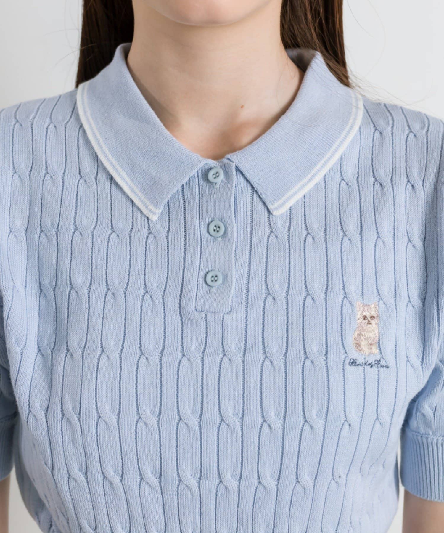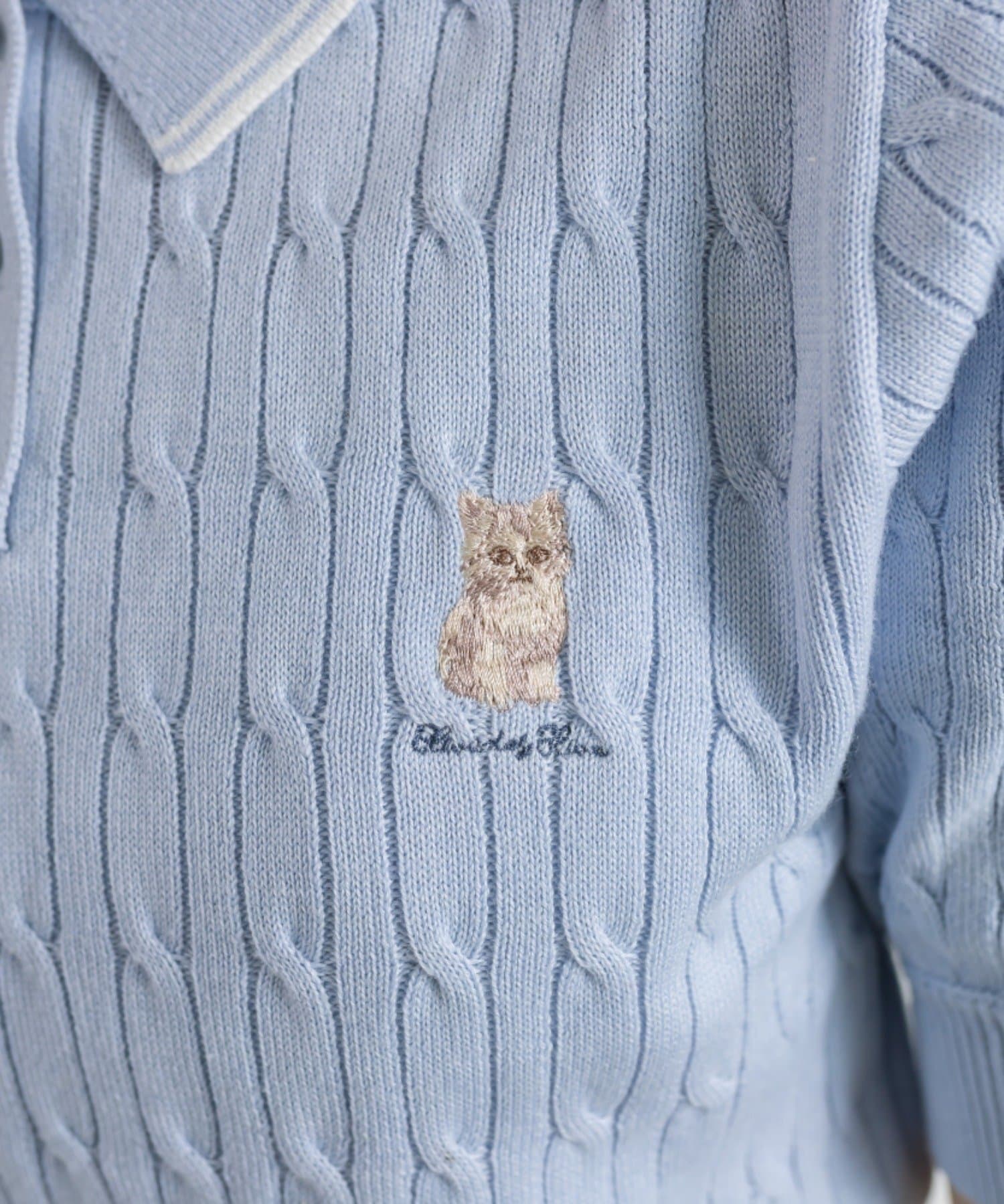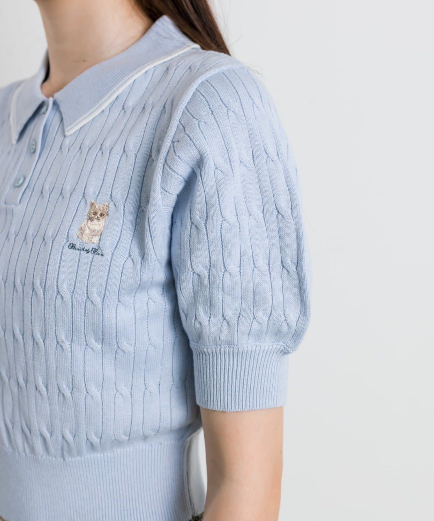 【SNSで話題!】ネコ刺繍ケーブルニットポロ