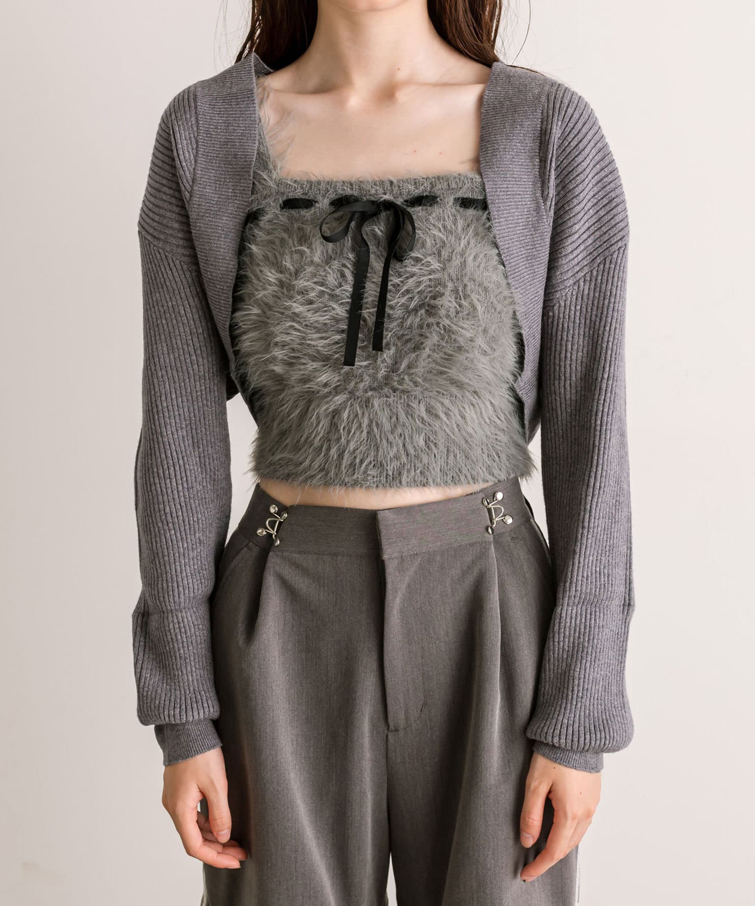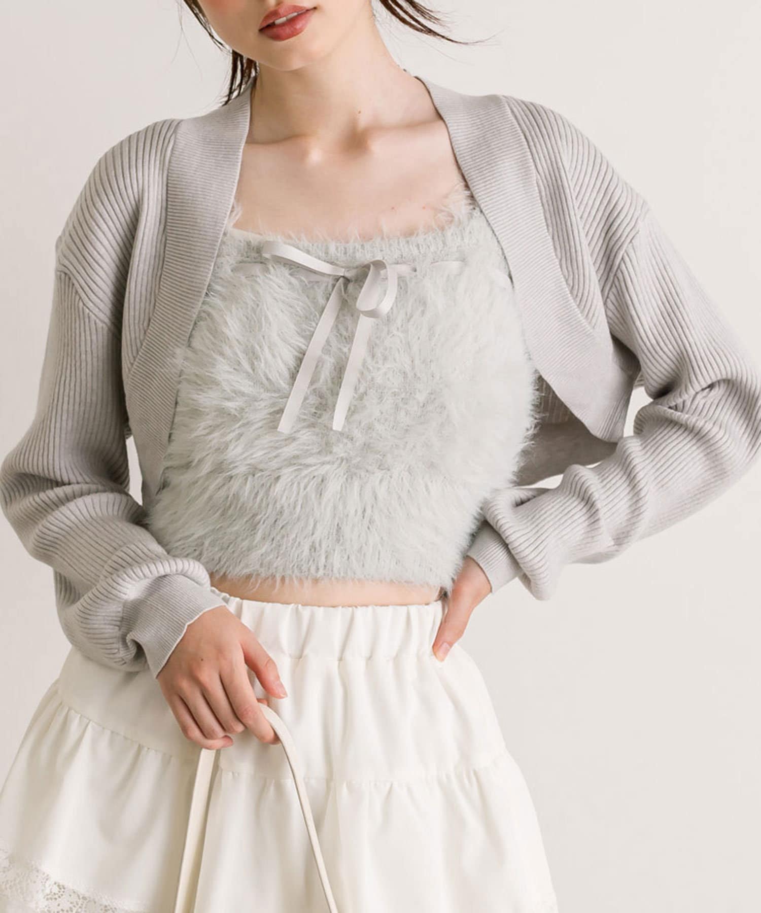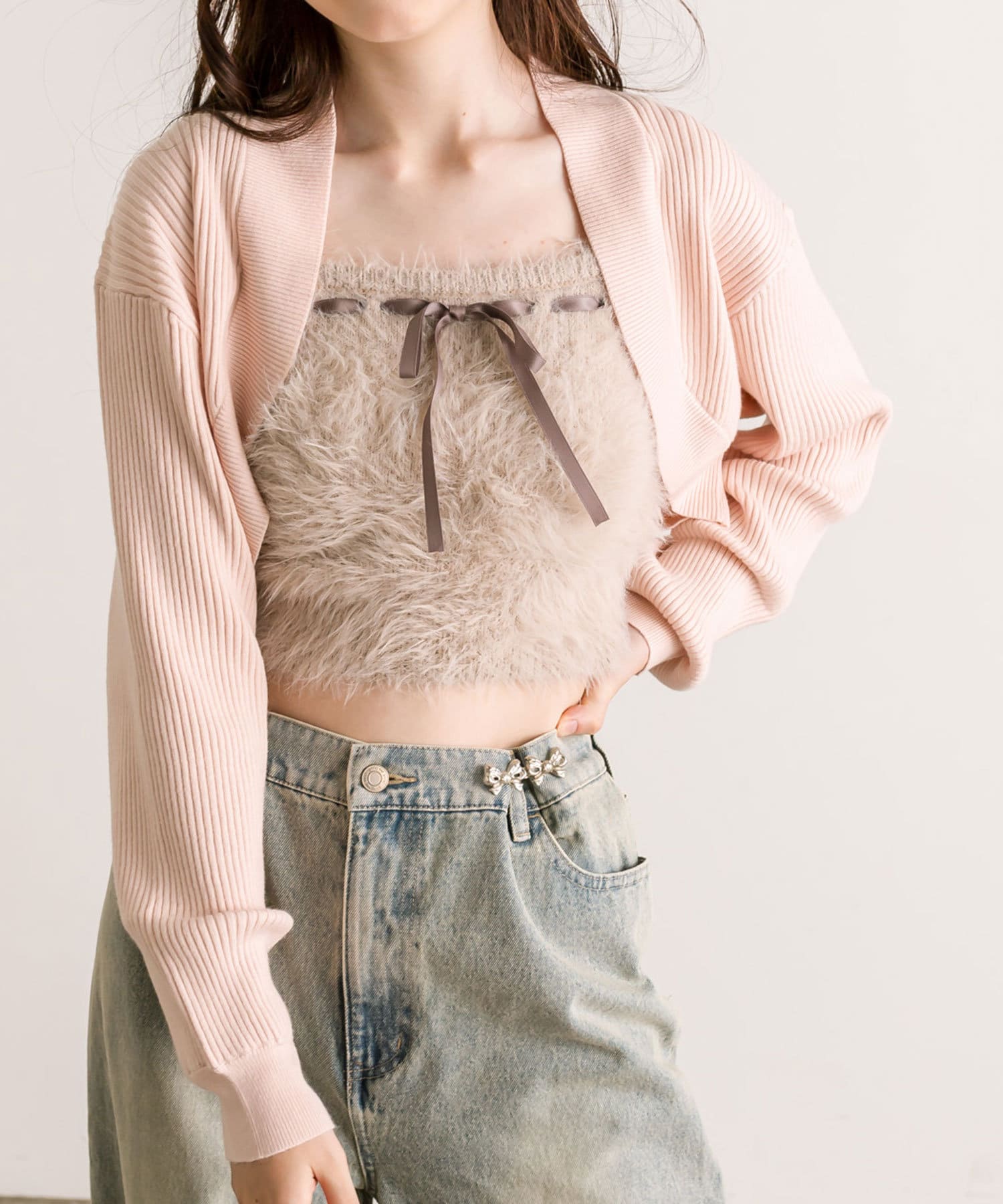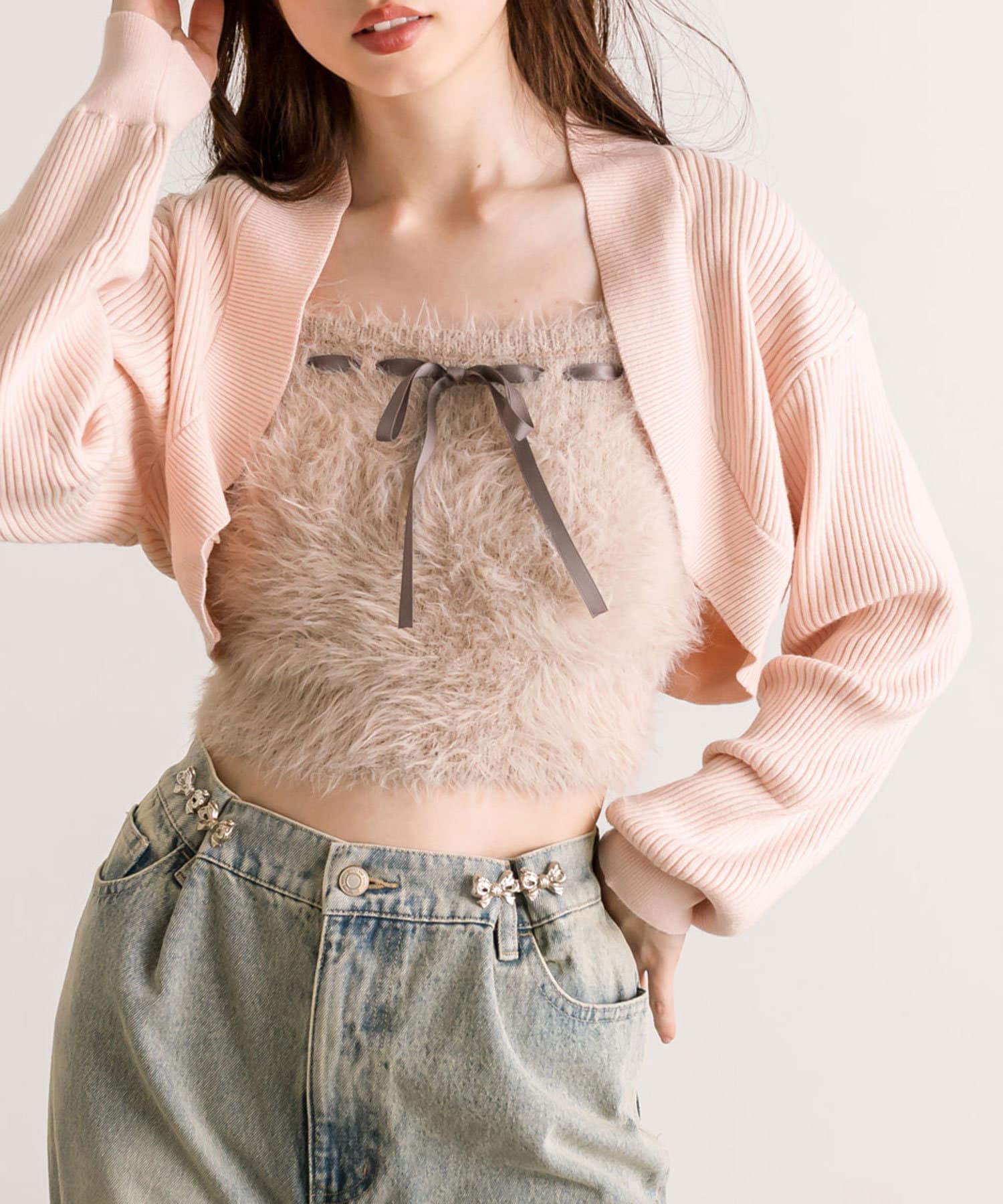 ・リボンがポイントのふわふわビスチェとシンプルで着回ししやすいリブ素材のボレロの異素材セットアイテム。